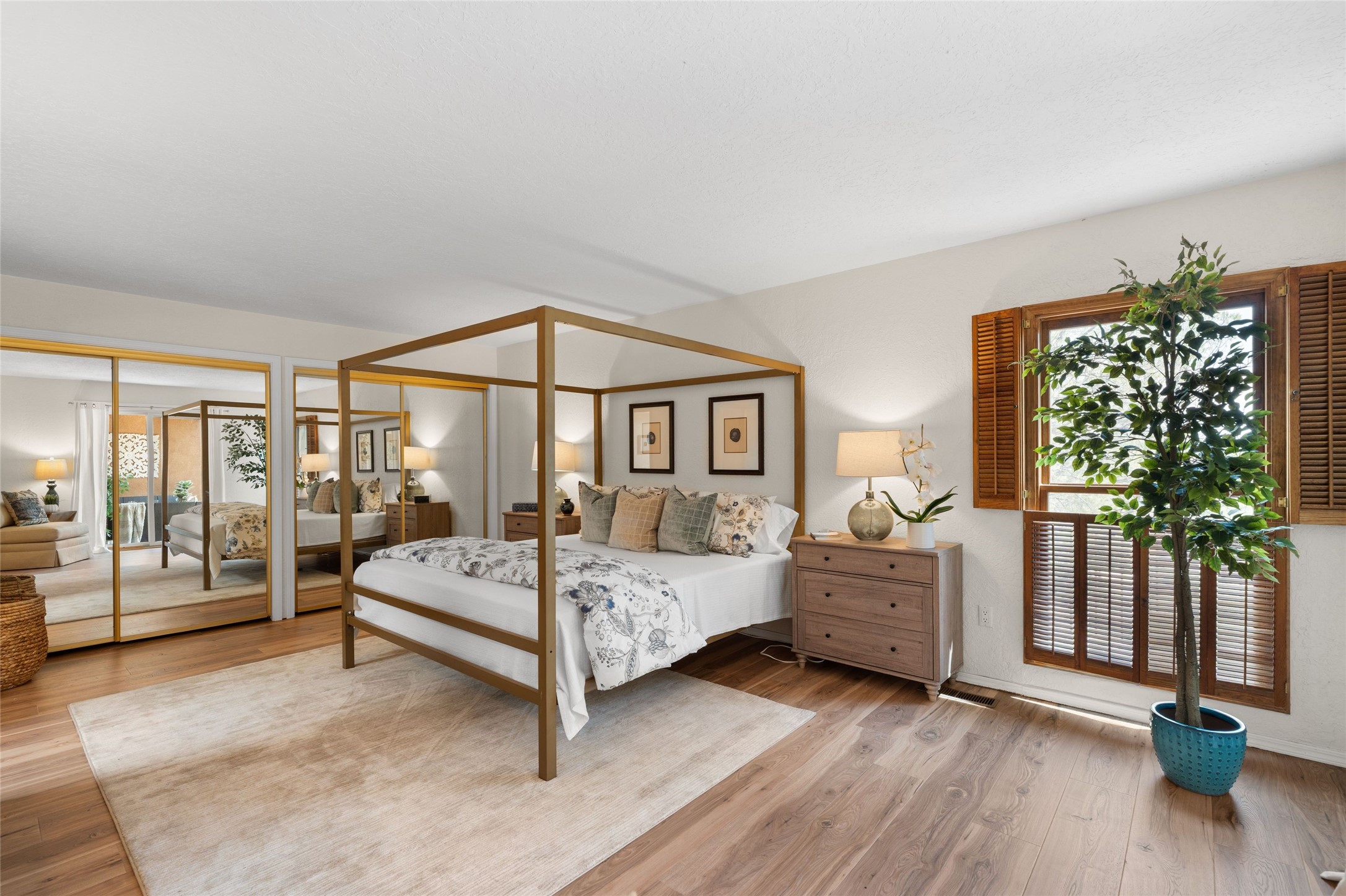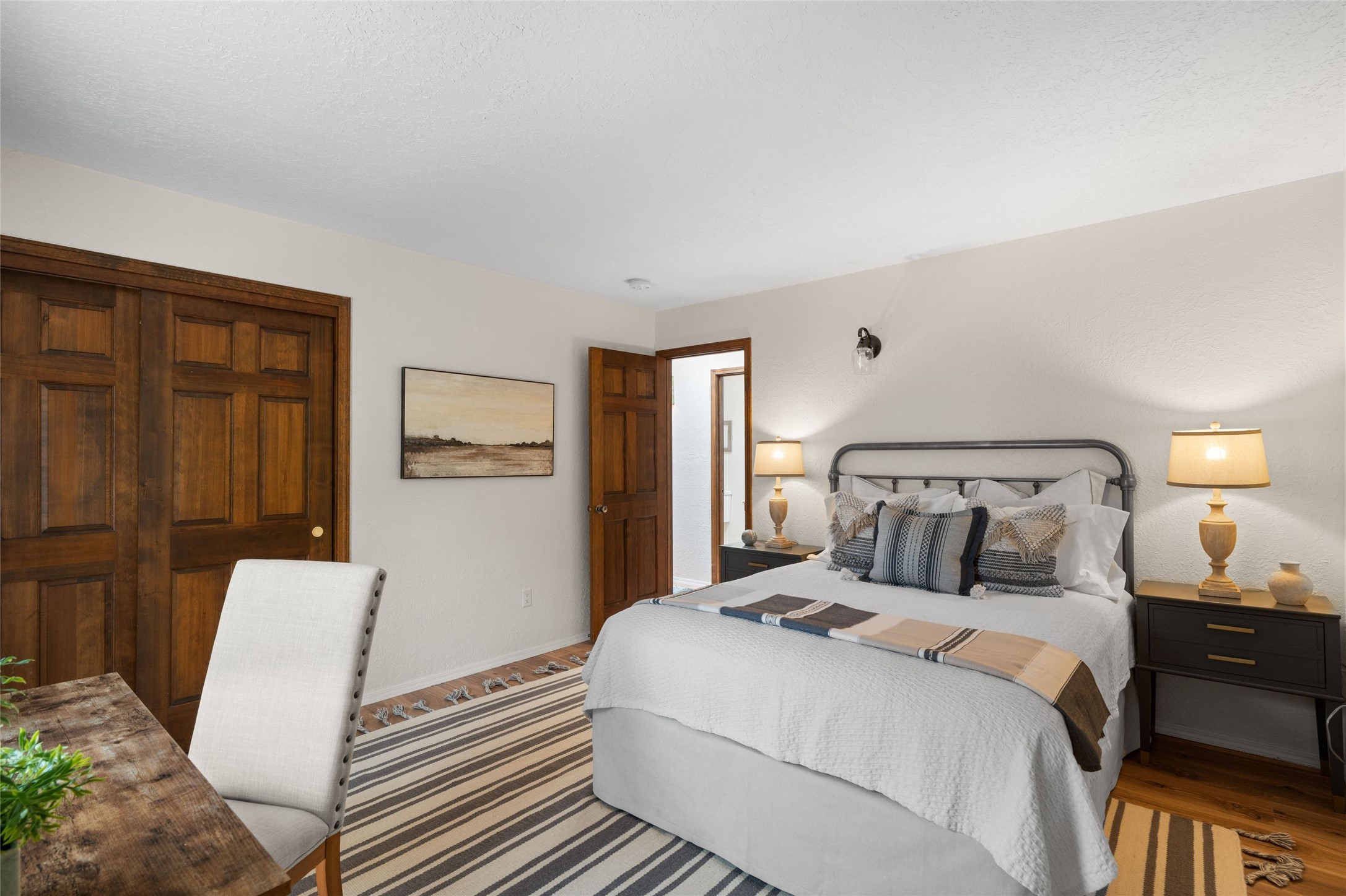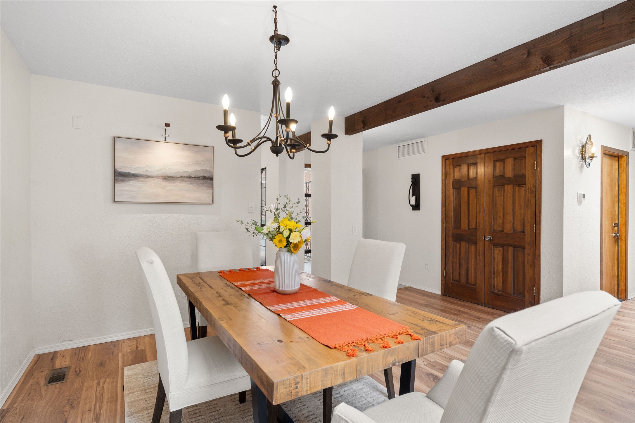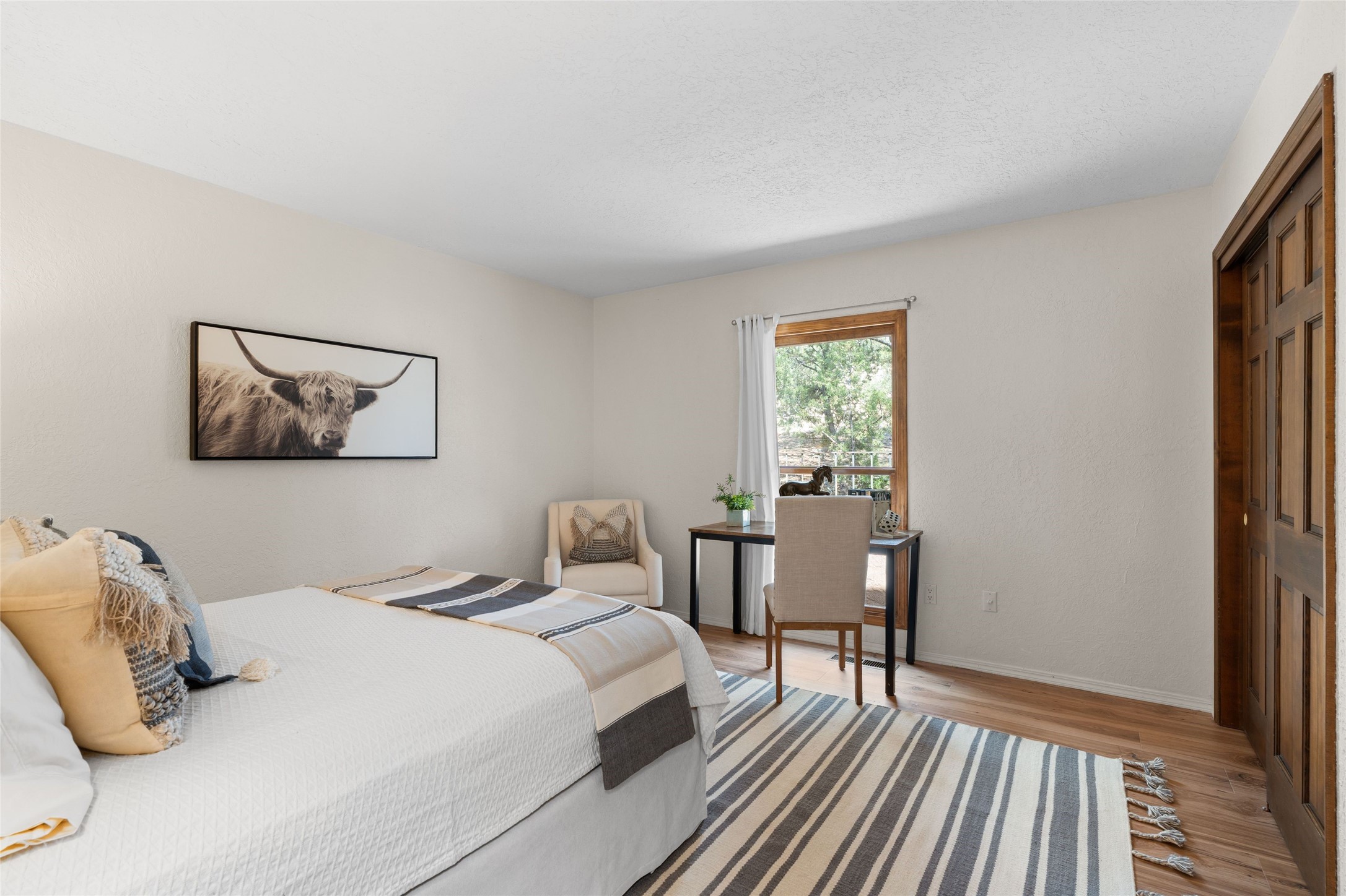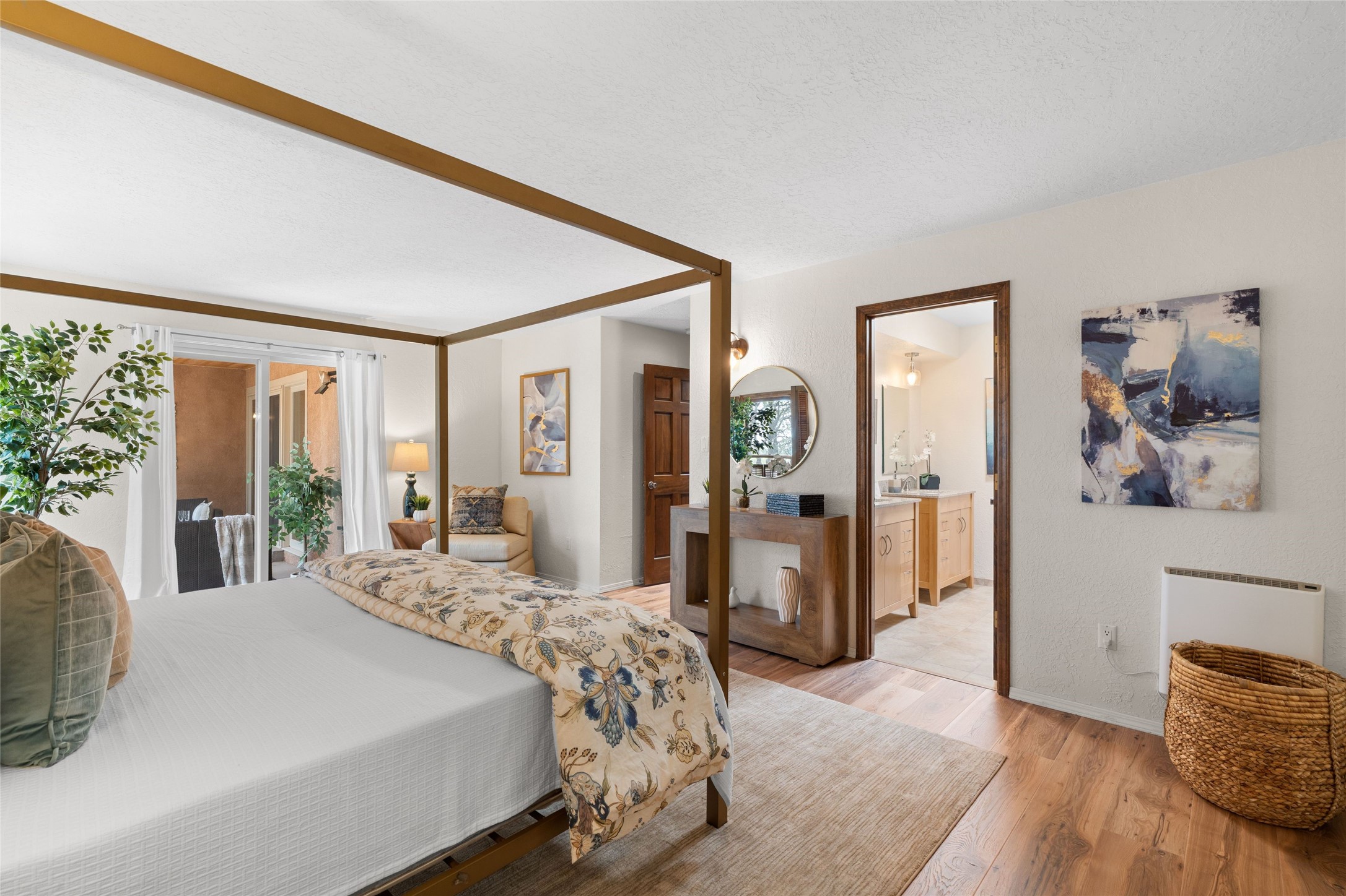 Live the Loma Encantada lifestyle (Enchanted Hill) in this updated & private 2 Bedroom/ 2 Bathroom single-level townhome only minutes to the Plaza, galleries, restaurants, museums, hiking, skiing and new Ft. Marcy pickleball courts! Set in a serene & wooded cul-de-sac, you are tucked away surrounded by Pinon and Juniper trees. This home has an exceptional floor plan with a large Living and Dining, wood beams and corbels and a classic corner kiva fireplace. Walk directly outside from the Living Area to a lovely covered portal and deck area with wooded views and distant southern views of the Sandia Mountains. Adjacent to the entry is an updated Kitchen and breakfast area. The Primary Bedroom and 2nd bedroom are located down a hallway and both are generously sized with ample closets and space for additional lounge seating and/or a desk area. Also the Primary Bedroom allows direct access to the outside portal and deck for morning coffee or nighttime star gazing. Many recent upgrades have been made which include: New engineered wood flooring (no carpeting); new Entry porcelain flooring; new central A/C; a converted kiva fireplace to gas with a custom steel fire screen door, lighting upgrades; Plus there is still one-year left on a membrane roof warranty. Last but not least, this home boasts an oversized 2-car garage with storage closets which is a hard-to-find amenity this close to downtown. Take advantage of this great opportunity to live the sweet Santa Fe lifestyle and call it your new home.