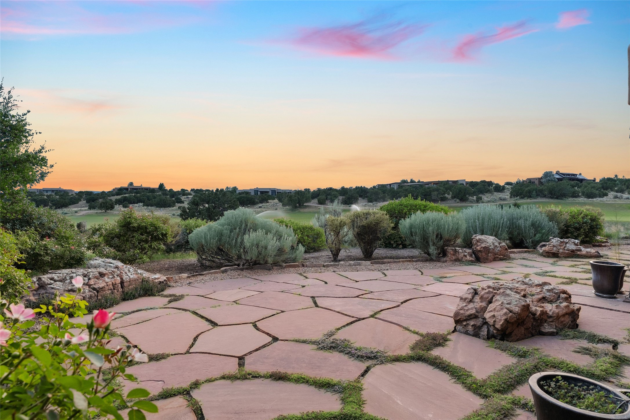 This home is the epitome of Refined Santa Fe Elegance, with 4 Bedrooms, 4.5 baths, 4 Fireplaces, No Steps and panoramic views of Sandia Mountain & the Fourth Fairway of the Sunset Golf Course, at the end of a cul-de-sac in Gated Las Campanas. An expansive hallway for artwork features 2 sets of French doors that open to the wrap-around portal for dining & relaxing which extends to the Living Room, also showcases the golf course view. The Gourmet Kitchen includes Viking appliances, an over-size island with prep sink, menu-planning desk & Butler's Pantry with wine cooler. The Main Bedroom suite offers a luxurious Spa Bath with large shower & whirlpool tub plus a walk-in closet worthy of a designer retail store. Bedroom Two is sequestered from the Main and has an en-suite bath. Bedroom Three with en-suite bath is adjacent to the Main and currently used as an office. Bedroom Four offers total privacy, as an attached Casita with en-suite bath & mini-kitchenette. The expansive brick Portal off the gallery hall includes a built-in BBQ & impressive fireplace, providing the perfect venue for entertaining, dining, relaxing or savoring the panoramic golf course & Sandia Mountain views. The Two-car Garage has eliminated garage clutter, with 29 feet of handsome cabinets plus a power wall to store bicycles, skis & other outdoor equipment. Come see why this 4-Bedroom home with Golf & Mountain views is the perfect embodiment of elegant Santa Fe resort living.