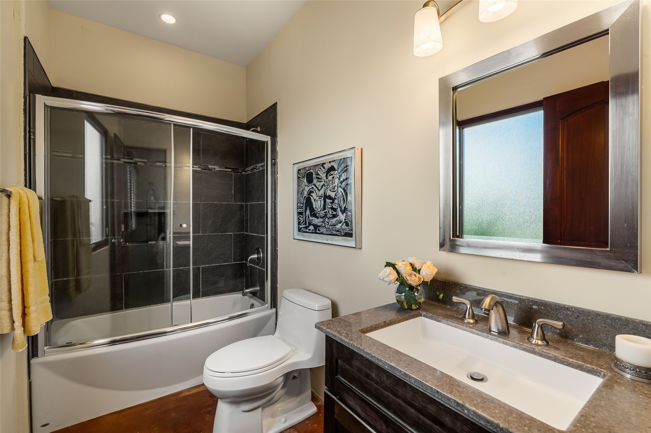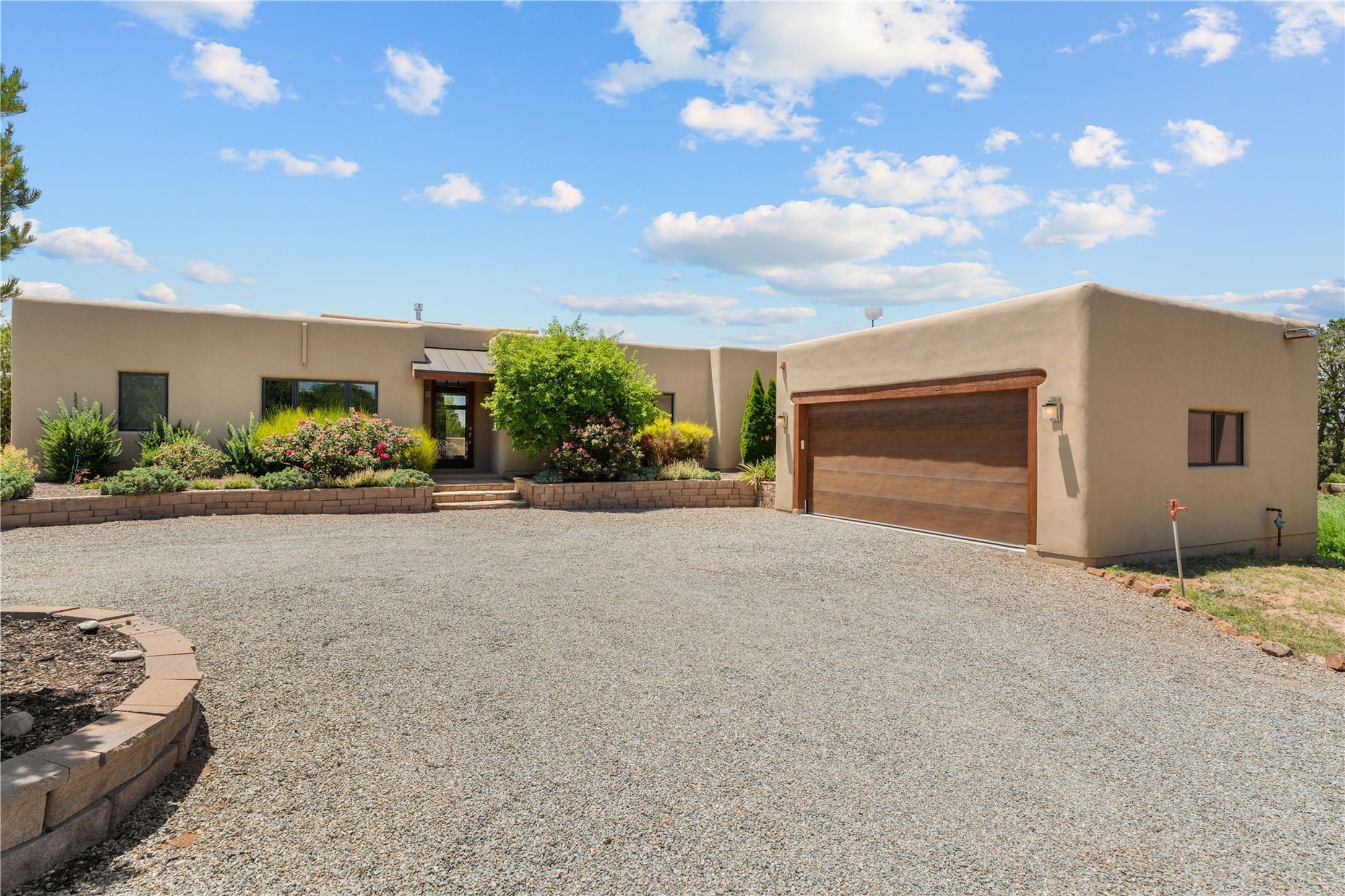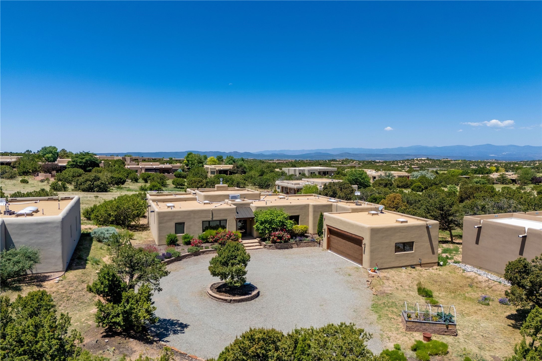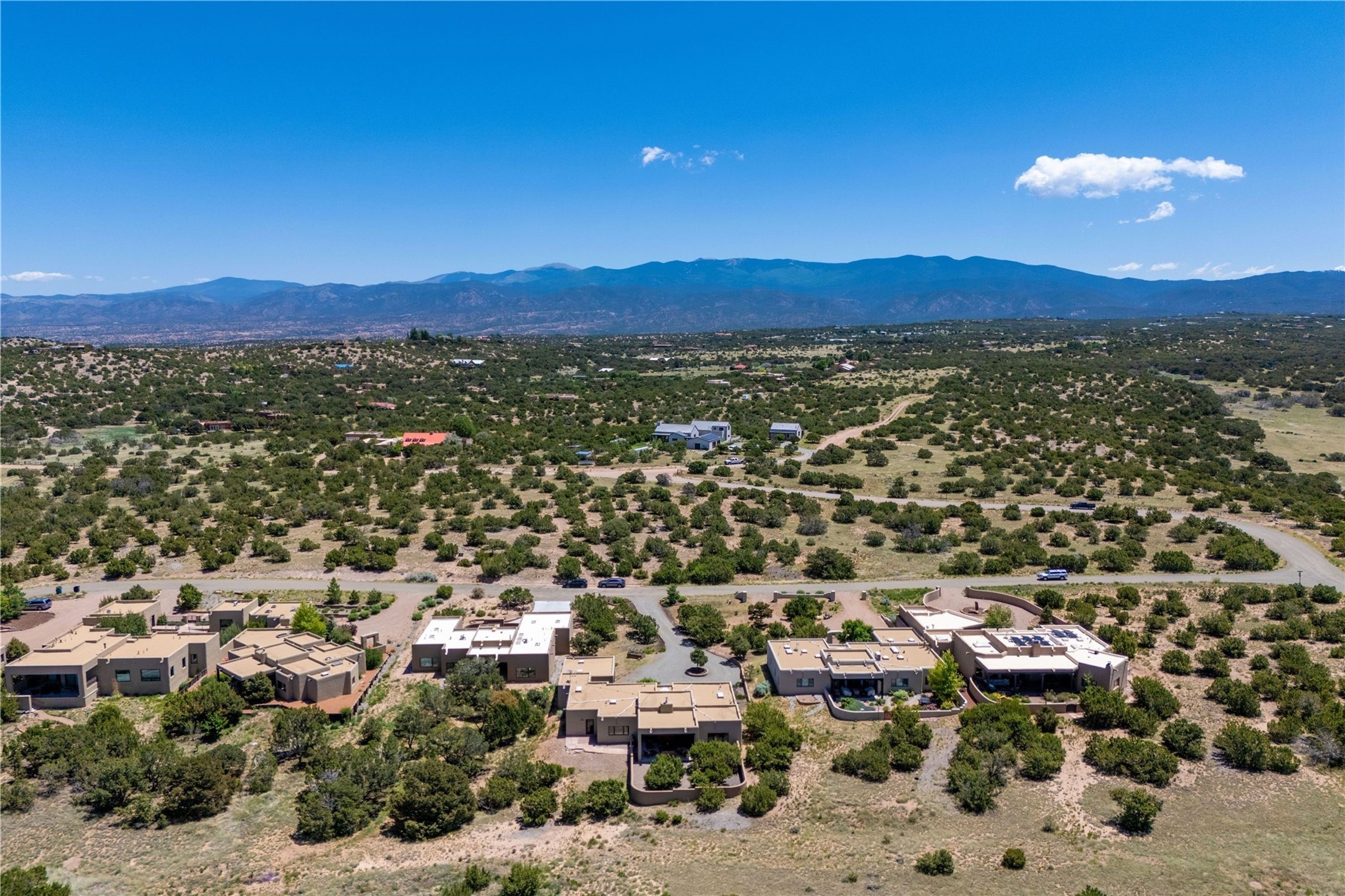 Heartstone community 3-bedroom, 3.5-bath soft contemporary home featuring sleek concrete floors, harmoniously paired with traditional Santa Fe elements, including iconic vigas and beams. Designed for convenience, this single-level property offers a spacious layout with no interior steps, making it accessible and easy to navigate. Enjoy the luxury of two living areas, ideal for relaxation and entertaining friends and family. The large kitchen and dining area provide the perfect backdrop for memorable gatherings. Step outside to the back portal, where a generous backyard awaits, offering sweeping views of the Jemez mountains that elevate outdoor living. In addition, enjoy Sangre de Cristo views from the front. Heartstone is characterized by half-acre lots, thoughtfully arranged around a shared meadow and many acres of permanently dedicated open space, fostering a connection to nature and tranquility. For those who enjoy an active lifestyle, the community is surrounded by a network of trails, granting access to the La Tierra Trails--a multi-use system featuring 25 miles of paths designed for hikers, cyclists, and equestrians alike. The community house serves as a venue for social gatherings and activities, complemented by exercise areas and a media room. Located in the desirable Tano Road area, this residence provides easy access to the vibrant Santa Fe Plaza, the artistic charm of Canyon Road, the Santa Fe's Farmer's Market, and the renowned Santa Fe Opera.
