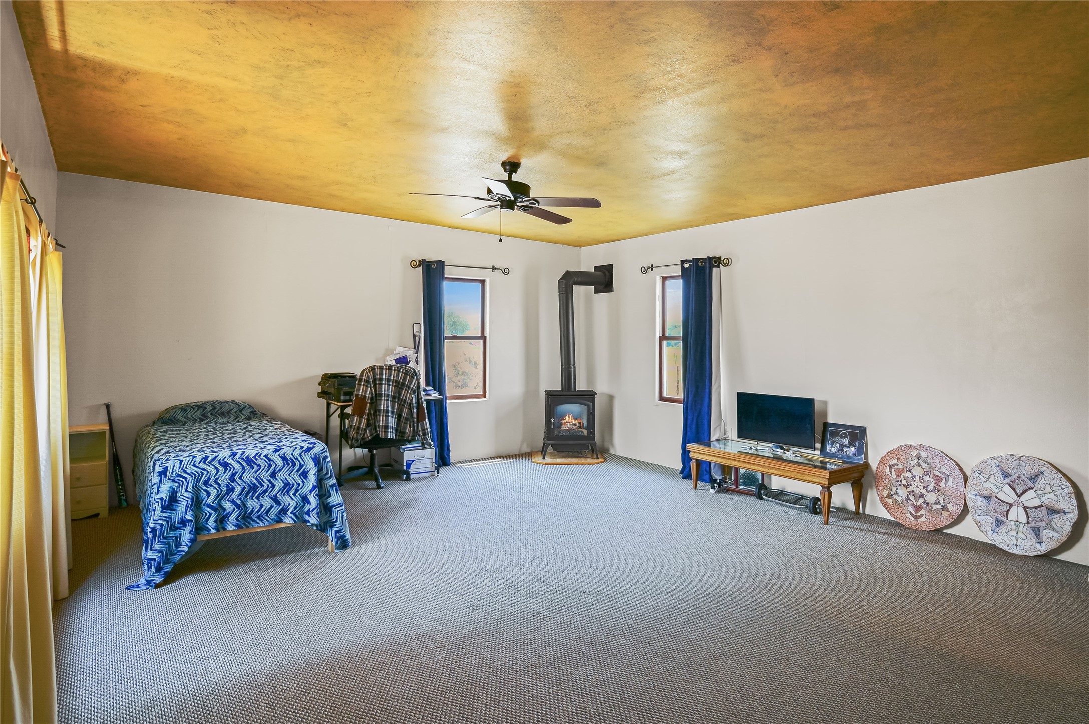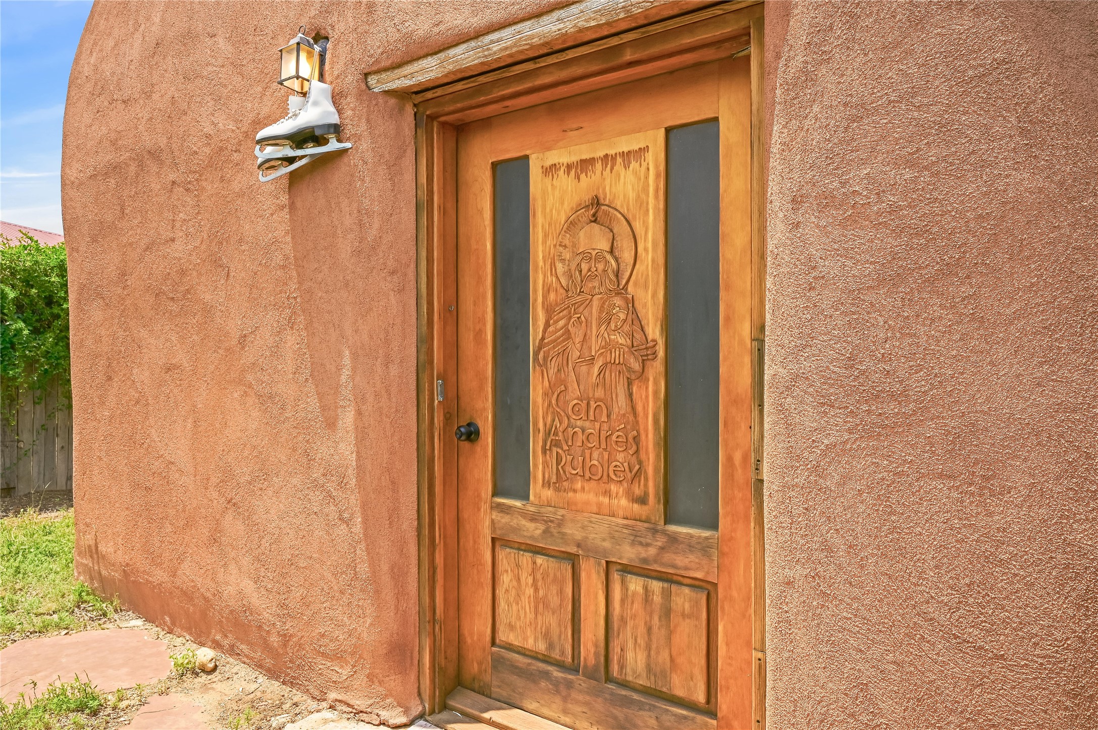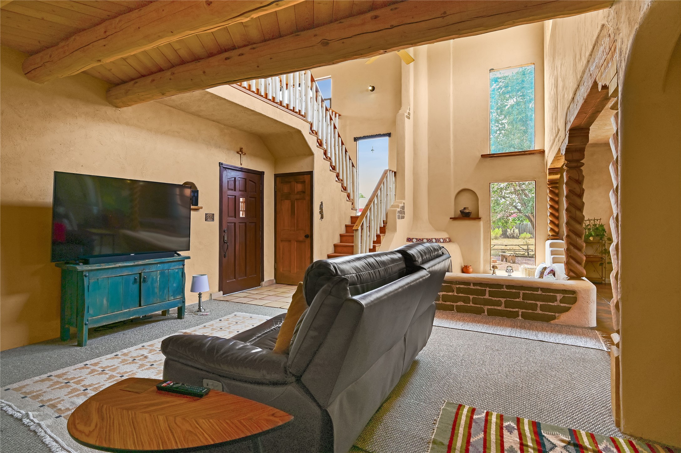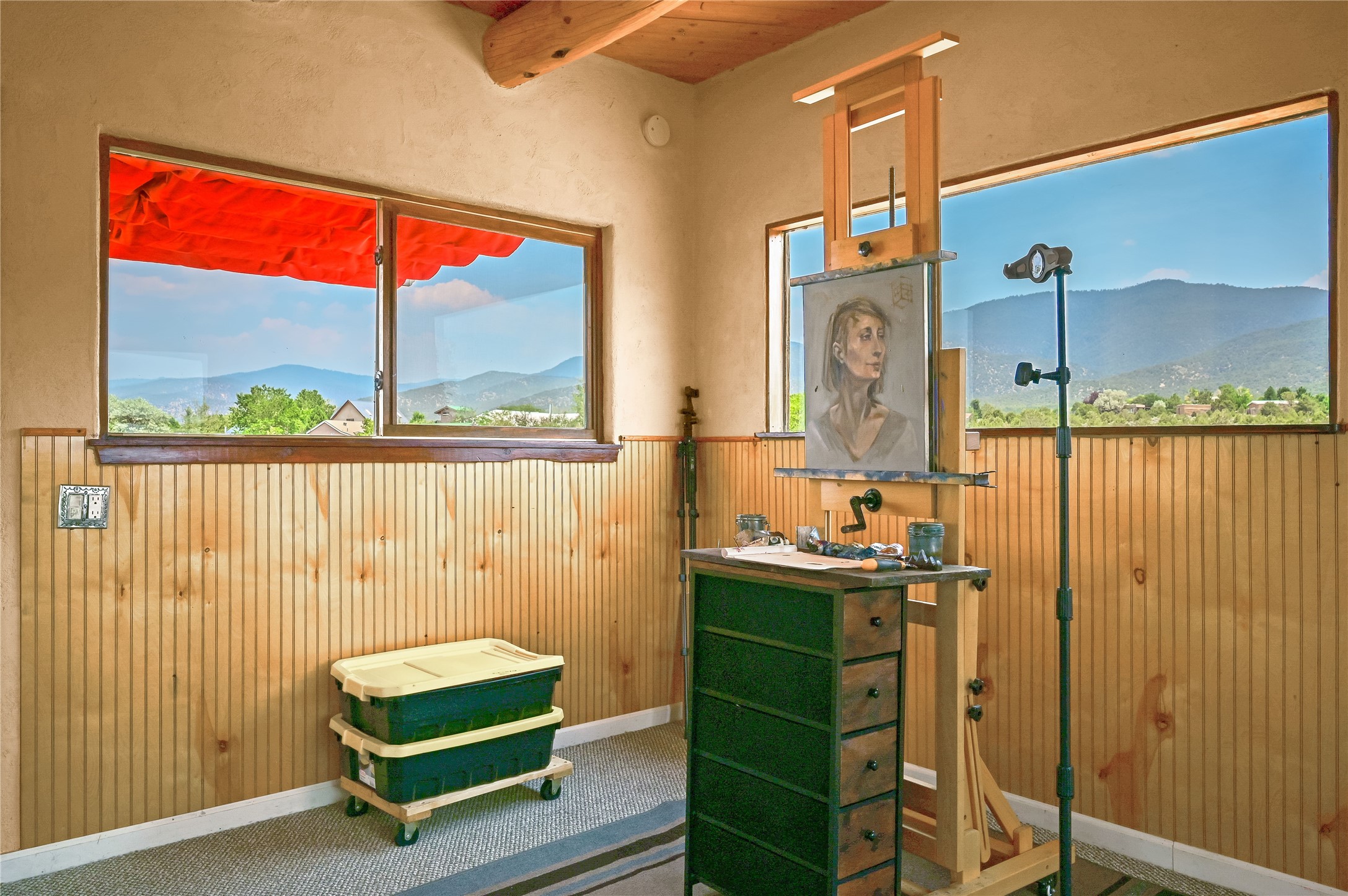 Discover a Unique Taos Living and Investment Opportunity! Nestled in Ranchos de Taos, just outside town limits, this exceptional property offers a serene lifestyle combined with a positive, steady rental income. You'll be living in a peaceful neighborhood, yet just 4 miles from Taos Plaza, a half-mile from Holy Cross Hospital, and moments from the Weimer Foothills trails. This unique offering includes four total units. The owner-occupied main home features an open living, dining, and kitchen area with clerestory windows and a loft. The cozy kiva fireplace, a two-story chimney before a sunken living area, was crafted by renowned artisan Carmen Velarde and inspired by the iconic Taos Inn. Enjoy abundant natural light and an upstairs loft/studio with a large second-story viewing deck offering breathtaking mountain views, including Taos Mountain, and stretching all the way to Colorado - perfect for watching spectacular sunsets and stargazing. The main home was beautifully remodeled in 2018 , with upgraded bathroom, kitchen flooring, and cabinets, and the outdoor area was enhanced in 2023. Beyond the main residence, you'll find an extended owner's suite that has been partitioned as a studio rental, a separate 1-bedroom, 1 bath-room guest house, and a truly special adobe studio/chapel. This studio, a replica of a church chancel, was originally built for artist Fr. William Hart McNichols by master adobe builder Trini Velarde. Constructed with traditional adobes, mud floors, and vigas painted with natural plant dyes, this studio remains cool in summer and remarkably warm in winter. This is more than just a home; it's an incredible investment opportunity to own a piece of Taos's rich artistic and building heritage with established rental income.