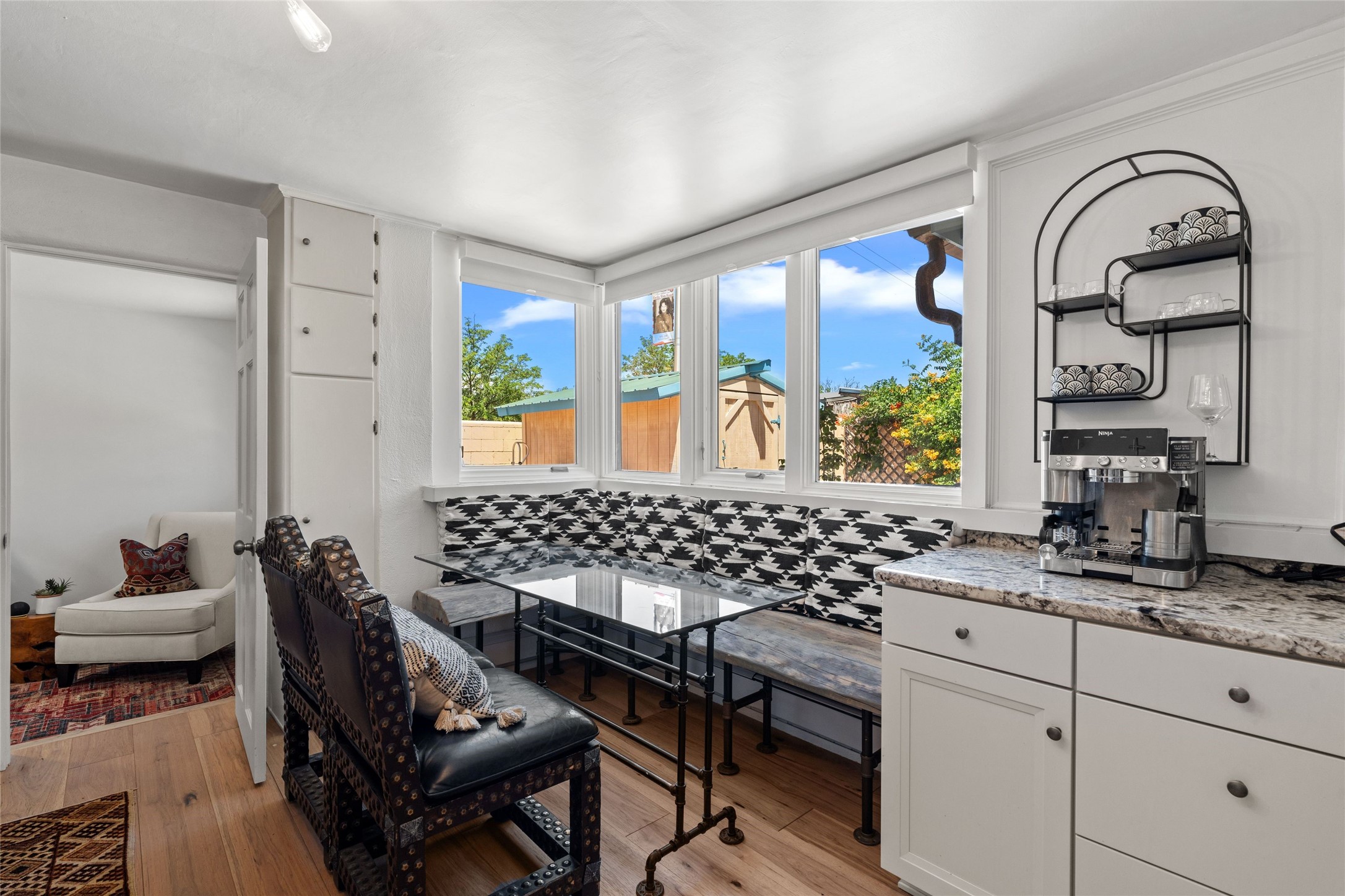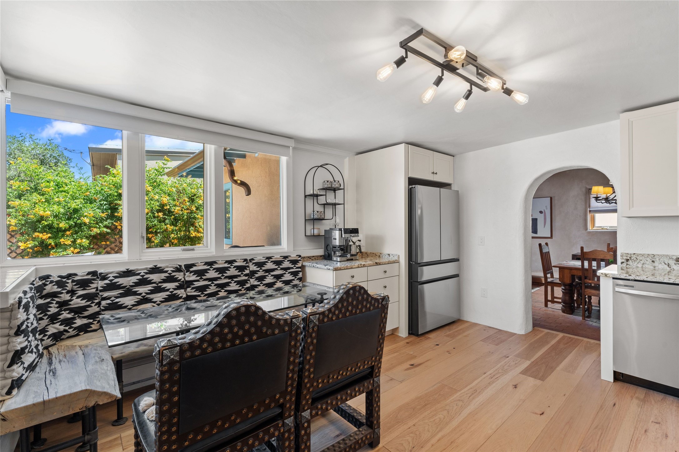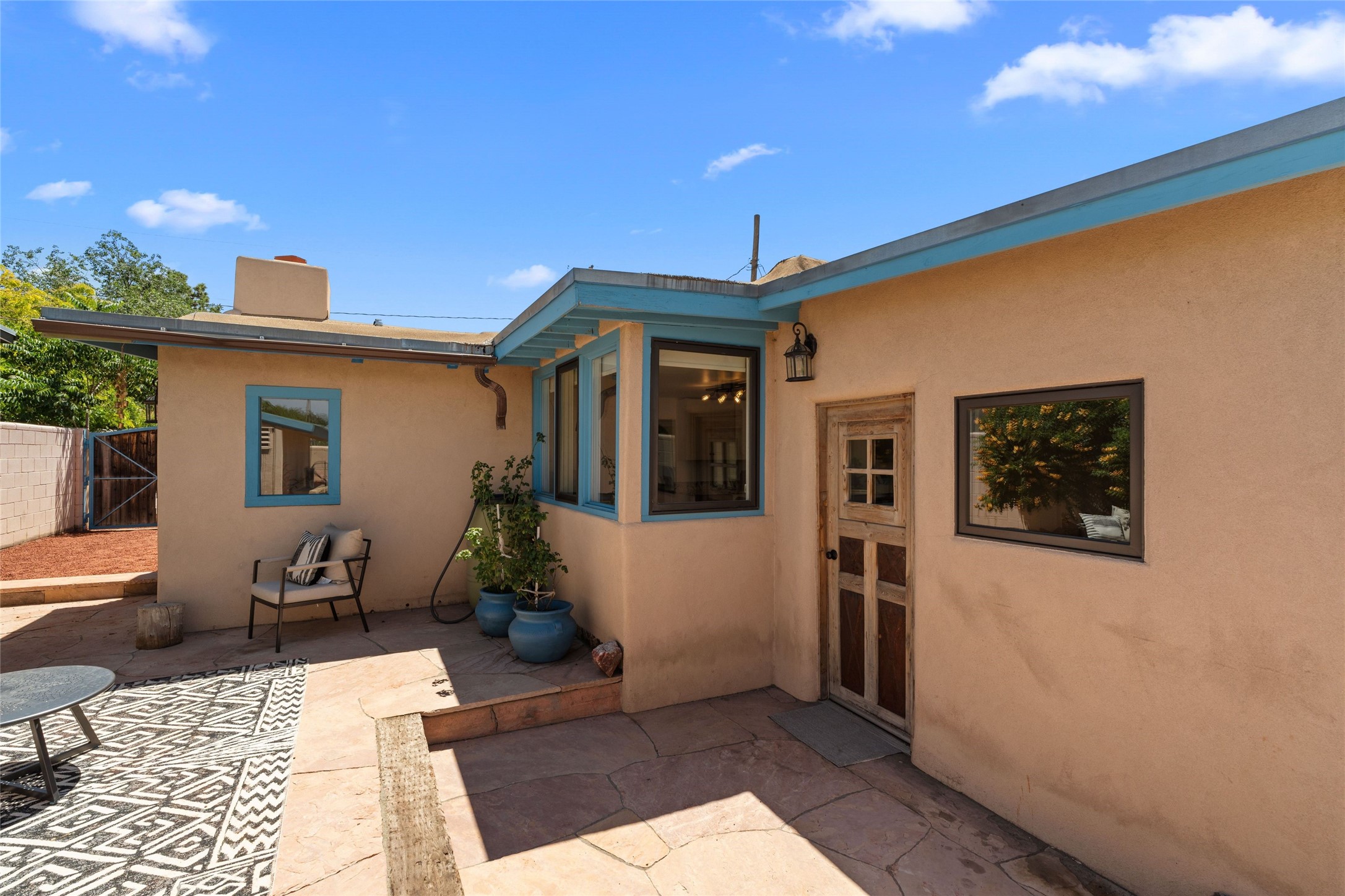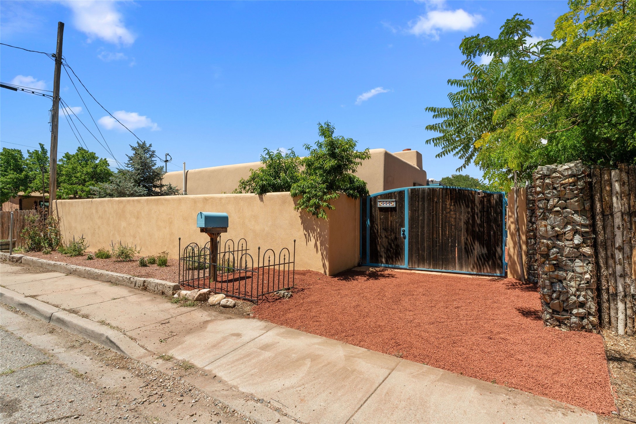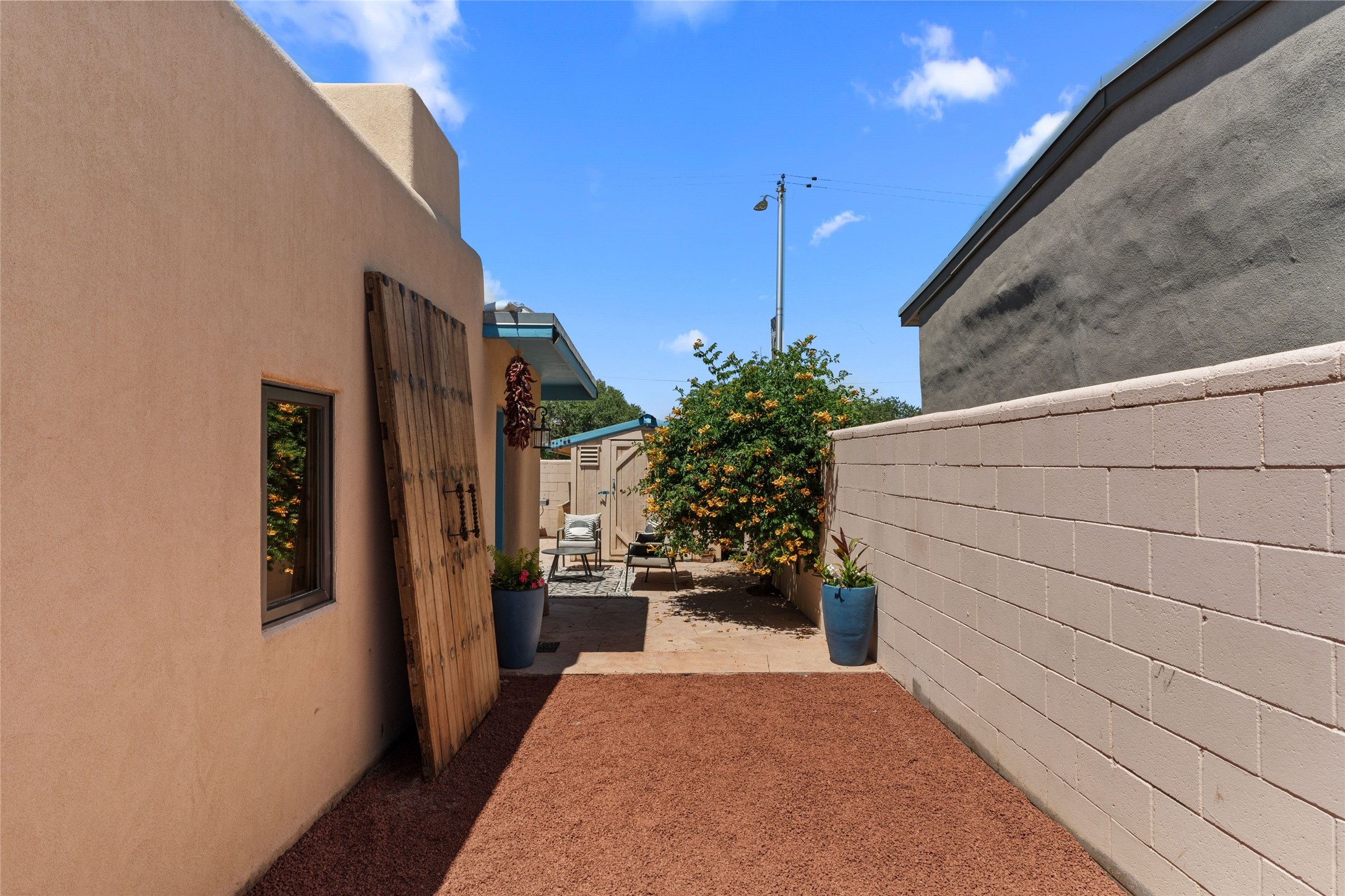 A Rare Gem in the Heart of the Railyard District. Nestled in one of Santa Fe's most coveted locations, this charming adobe home places you just steps from the vibrant Santa Fe Farmers Market and all the cultural delights of the Railyard and downtown. This beautifully maintained two-bedroom, two-bathroom residence exudes authentic Santa Fe character, featuring classic brick floors, a wood-burning kiva fireplace, and traditional vigas in the light-filled living room. Behind a private gate, a lush courtyard welcomes you with a thriving nectarine tree and two inviting sitting areas--an ideal retreat for morning coffee or evening relaxation. Step inside to discover a thoughtfully upgraded interior that blends timeless design with modern comforts. Originally built circa 1946, this adobe treasure has been lovingly enhanced to reflect beauty, warmth, and elegance throughout. Additional features include off-street parking and a versatile storage shed. Don't miss this enchanting property in an unbeatable location--schedule your private showing today.