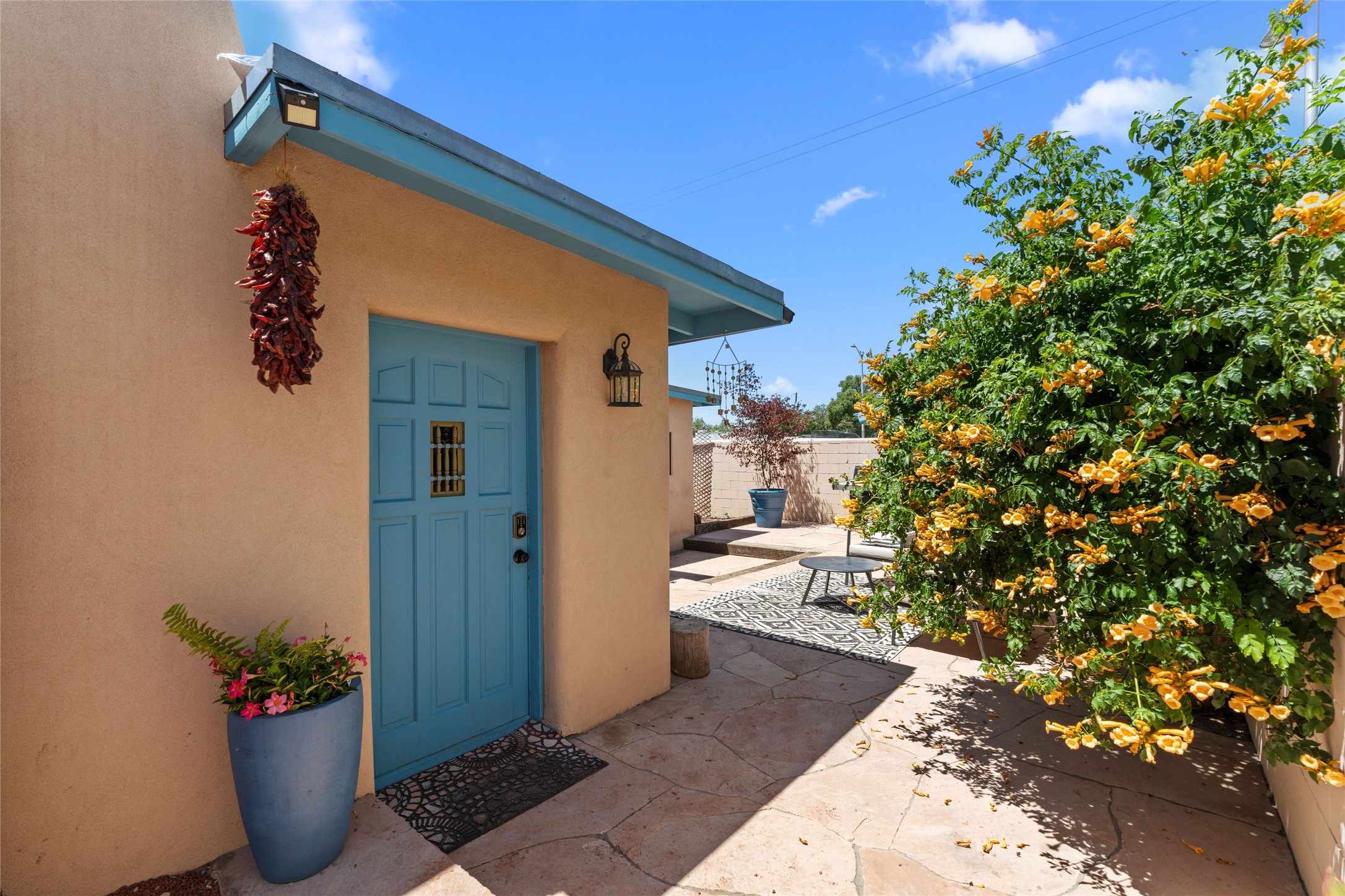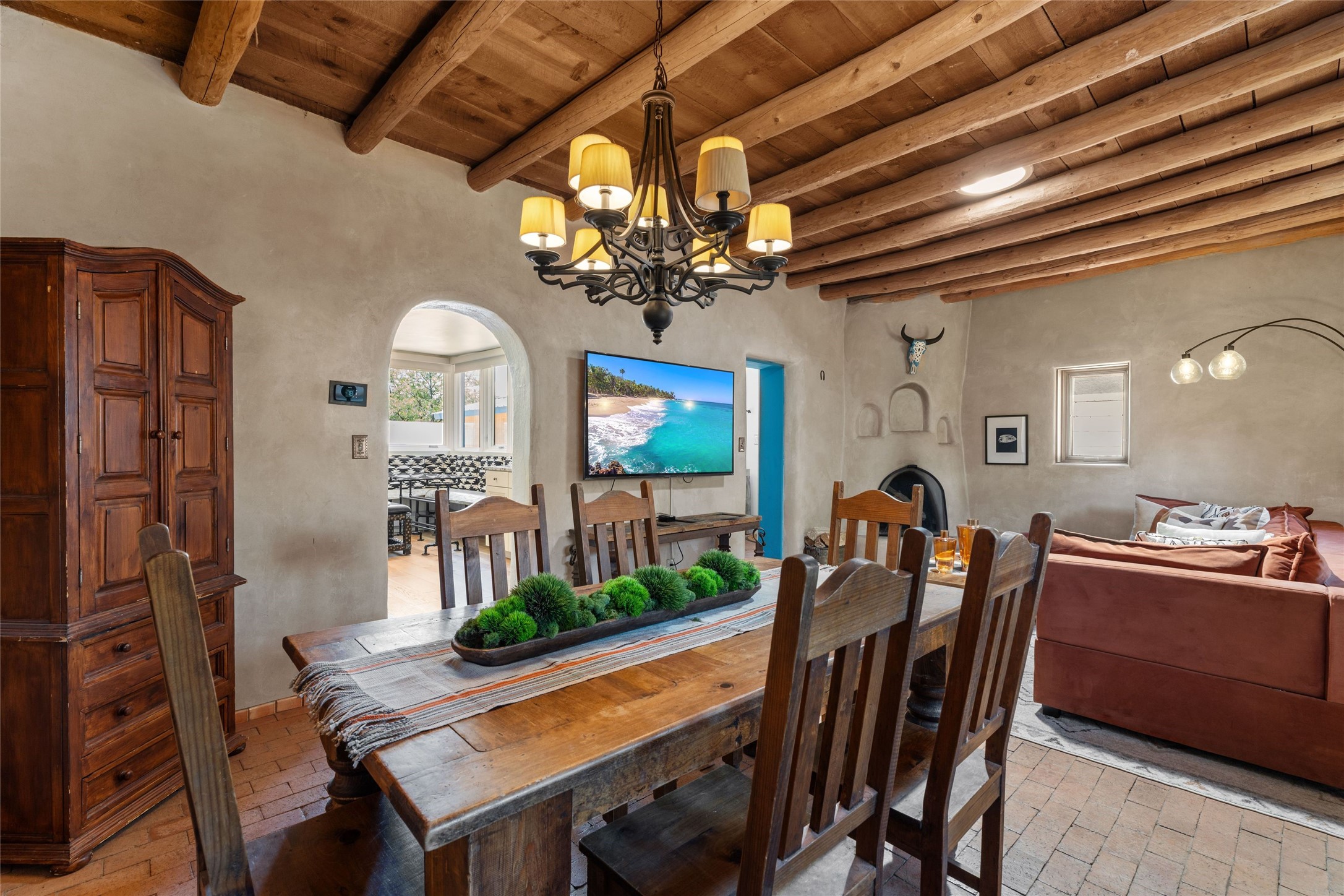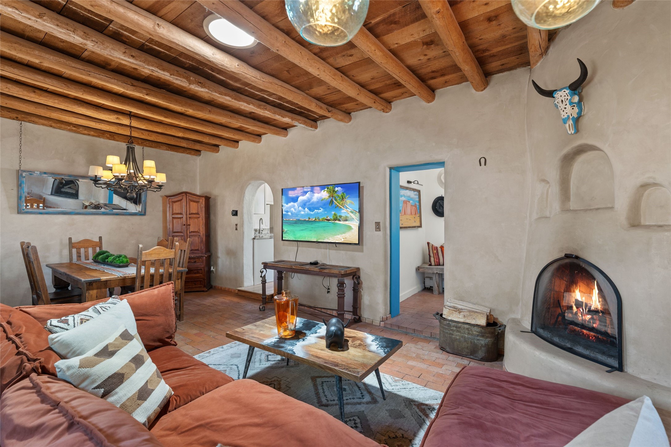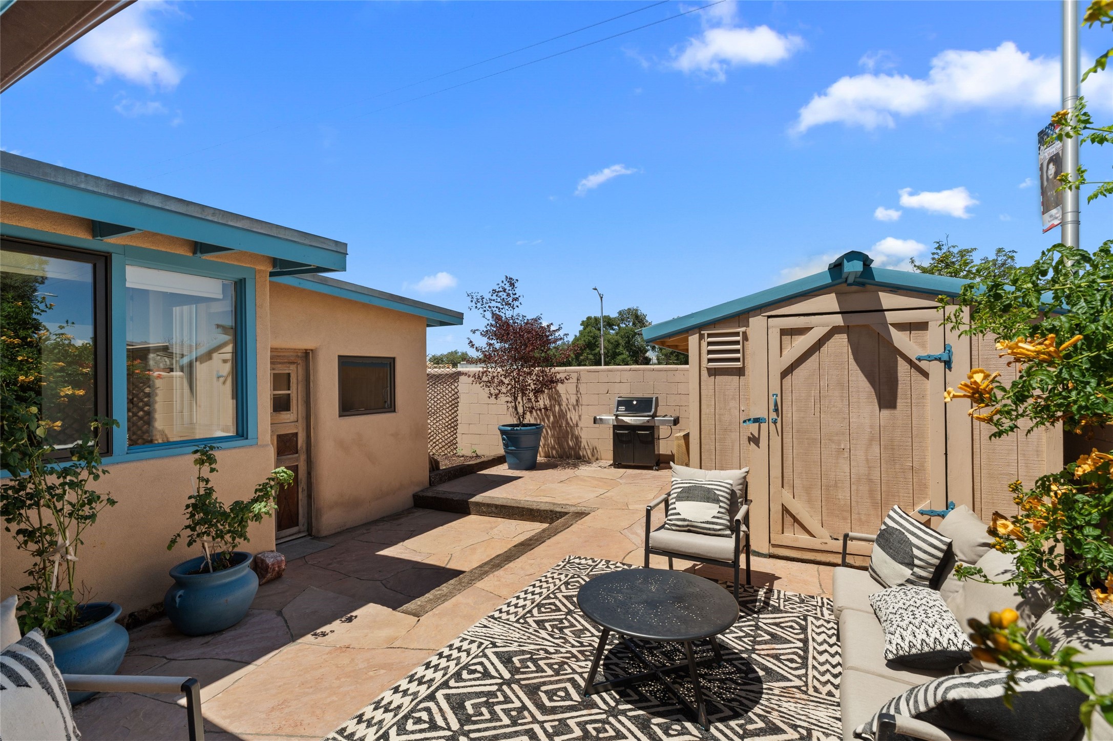 A Rare Gem in the Heart of the Railyard District. Nestled in one of Santa Fe's most coveted locations, this charming adobe home places you just steps from the vibrant Santa Fe Farmers Market and all the cultural delights of the Railyard and downtown. This beautifully maintained two-bedroom, two-bathroom residence exudes authentic Santa Fe character, featuring classic brick floors, a wood-burning kiva fireplace, and traditional vigas in the light-filled living room. Behind a private gate, a lush courtyard welcomes you with a thriving nectarine tree and two inviting sitting areas--an ideal retreat for morning coffee or evening relaxation. Step inside to discover a thoughtfully upgraded interior that blends timeless design with modern comforts. Originally built circa 1946, this adobe treasure has been lovingly enhanced to reflect beauty, warmth, and elegance throughout. Additional features include off-street parking and a versatile storage shed. Don't miss this enchanting property in an unbeatable location--schedule your private showing today.
