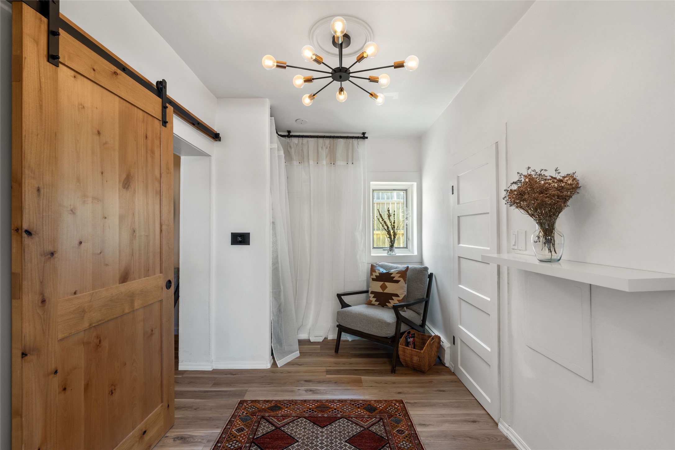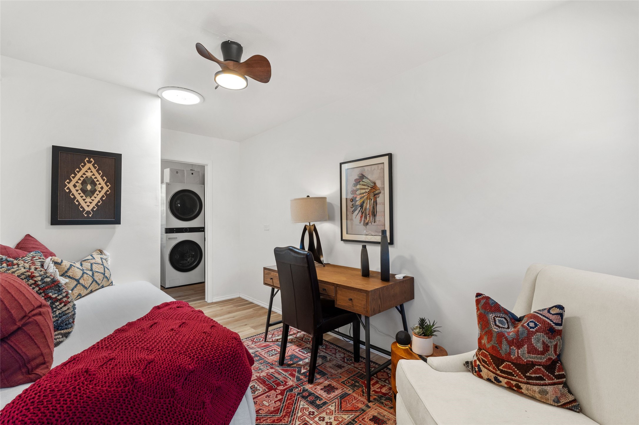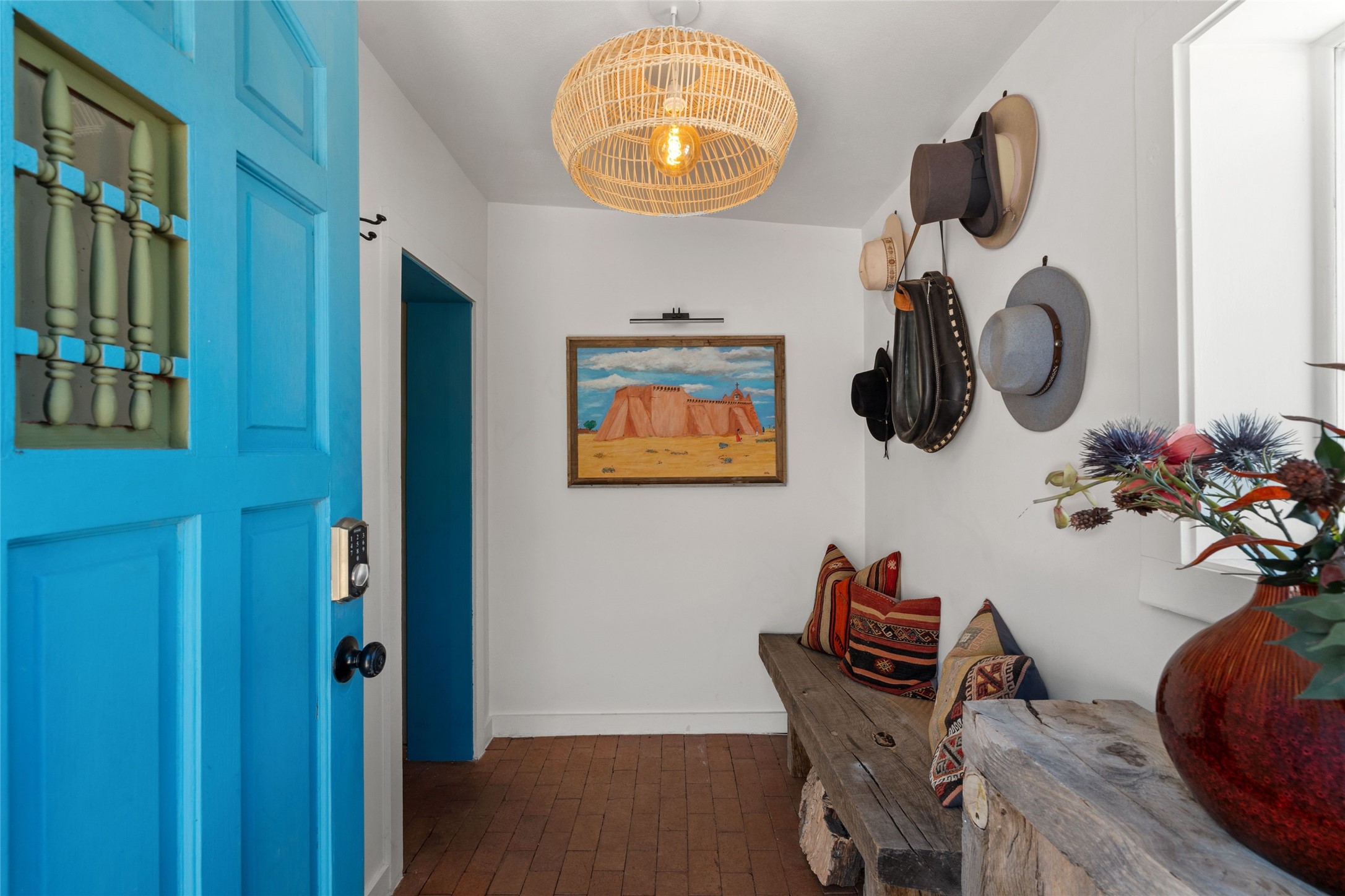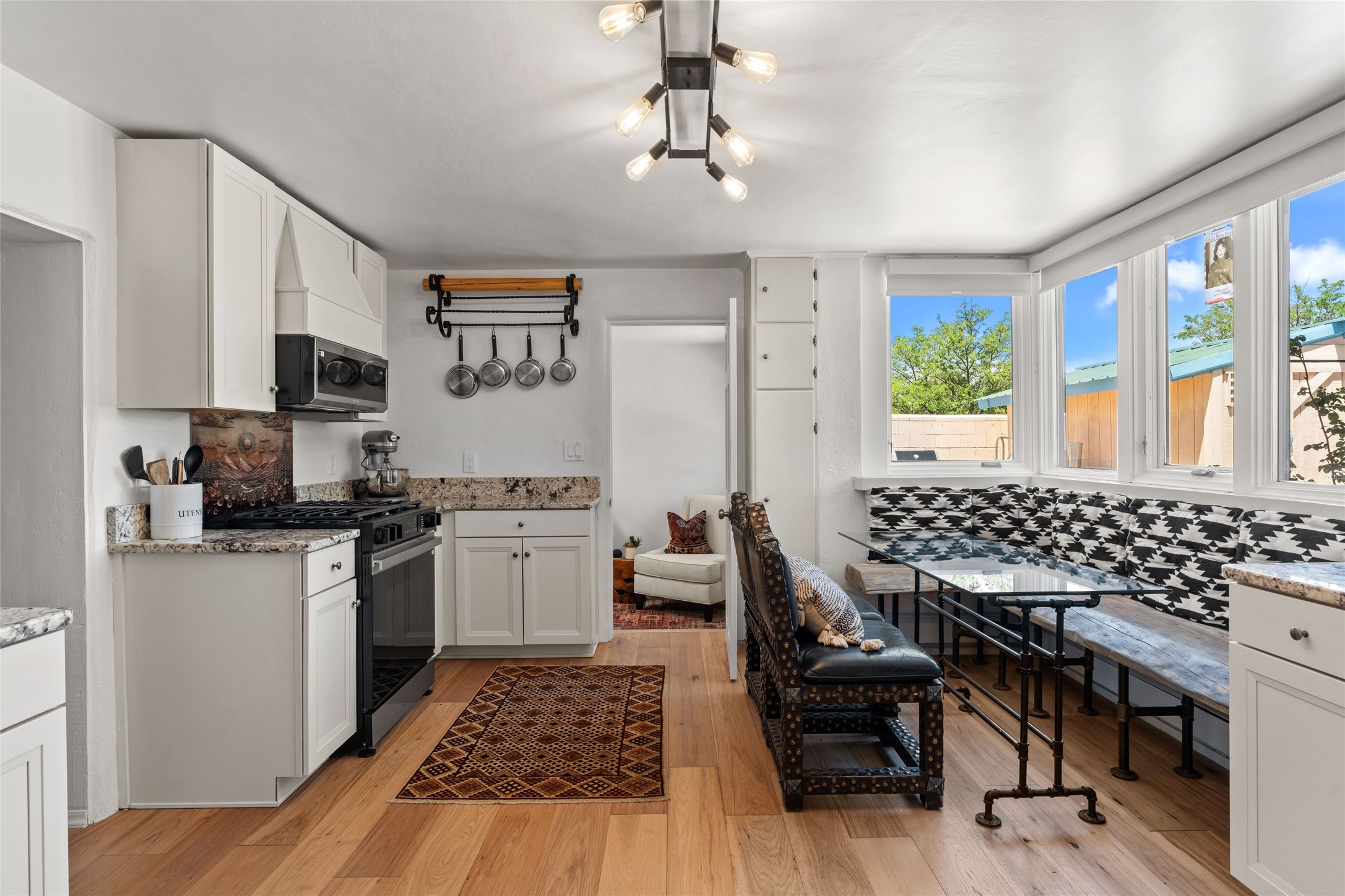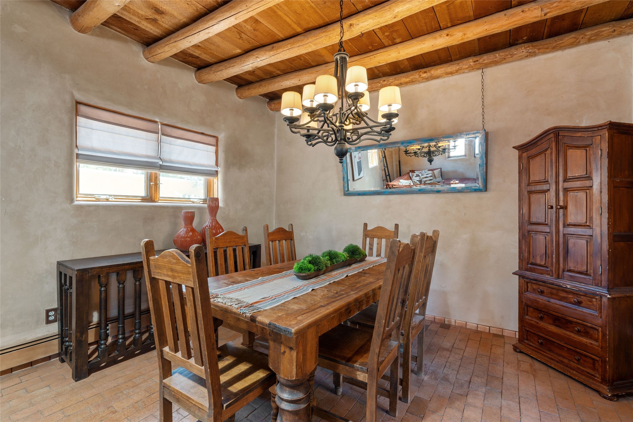 A Rare Gem in the Heart of the Railyard District. Nestled in one of Santa Fe's most coveted locations, this charming adobe home places you just steps from the vibrant Santa Fe Farmers Market and all the cultural delights of the Railyard and downtown. This beautifully maintained two-bedroom, two-bathroom residence exudes authentic Santa Fe character, featuring classic brick floors, a wood-burning kiva fireplace, and traditional vigas in the light-filled living room. Behind a private gate, a lush courtyard welcomes you with a thriving nectarine tree and two inviting sitting areas--an ideal retreat for morning coffee or evening relaxation. Step inside to discover a thoughtfully upgraded interior that blends timeless design with modern comforts. Originally built circa 1946, this adobe treasure has been lovingly enhanced to reflect beauty, warmth, and elegance throughout. Additional features include off-street parking and a versatile storage shed. Don't miss this enchanting property in an unbeatable location--schedule your private showing today.