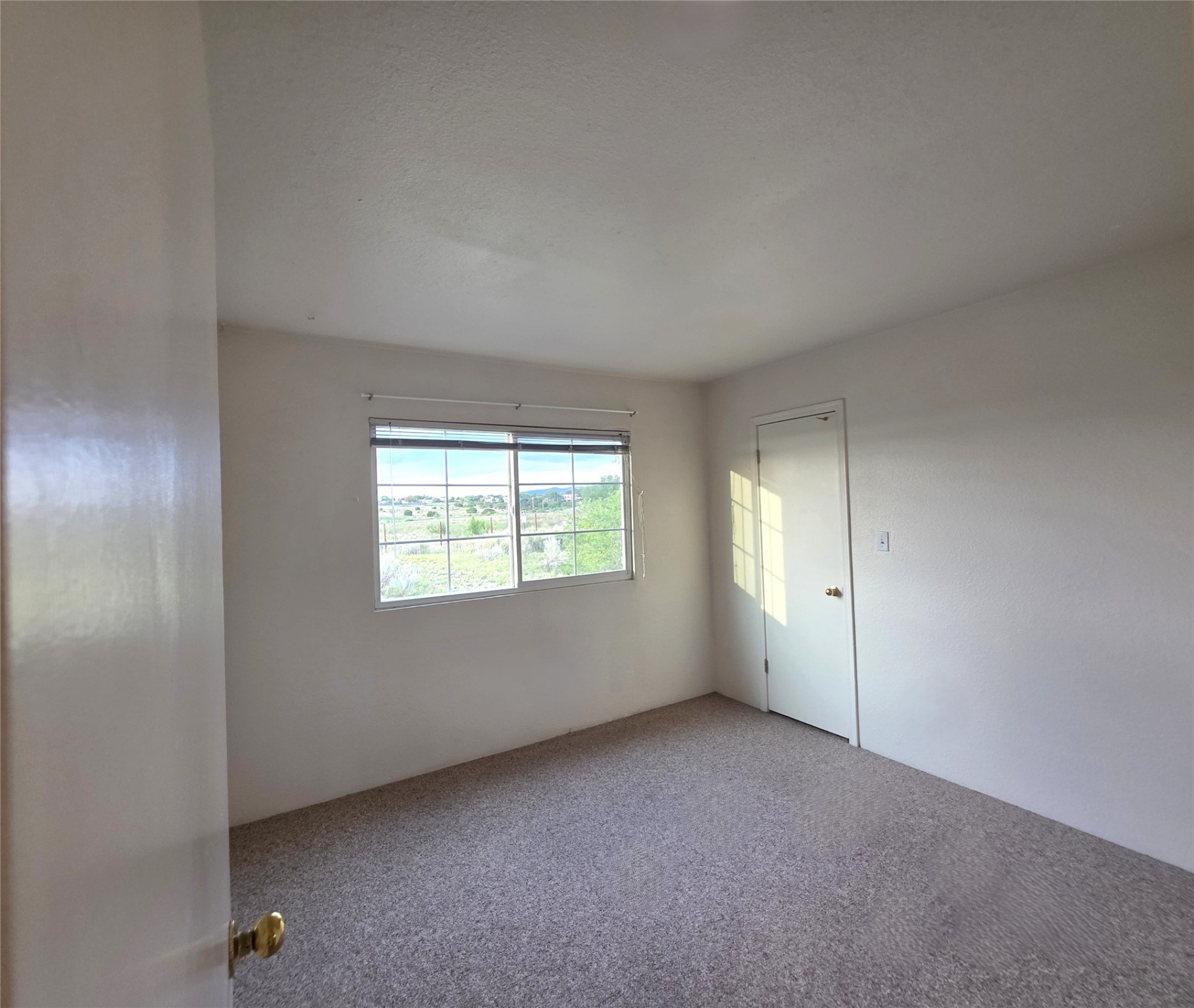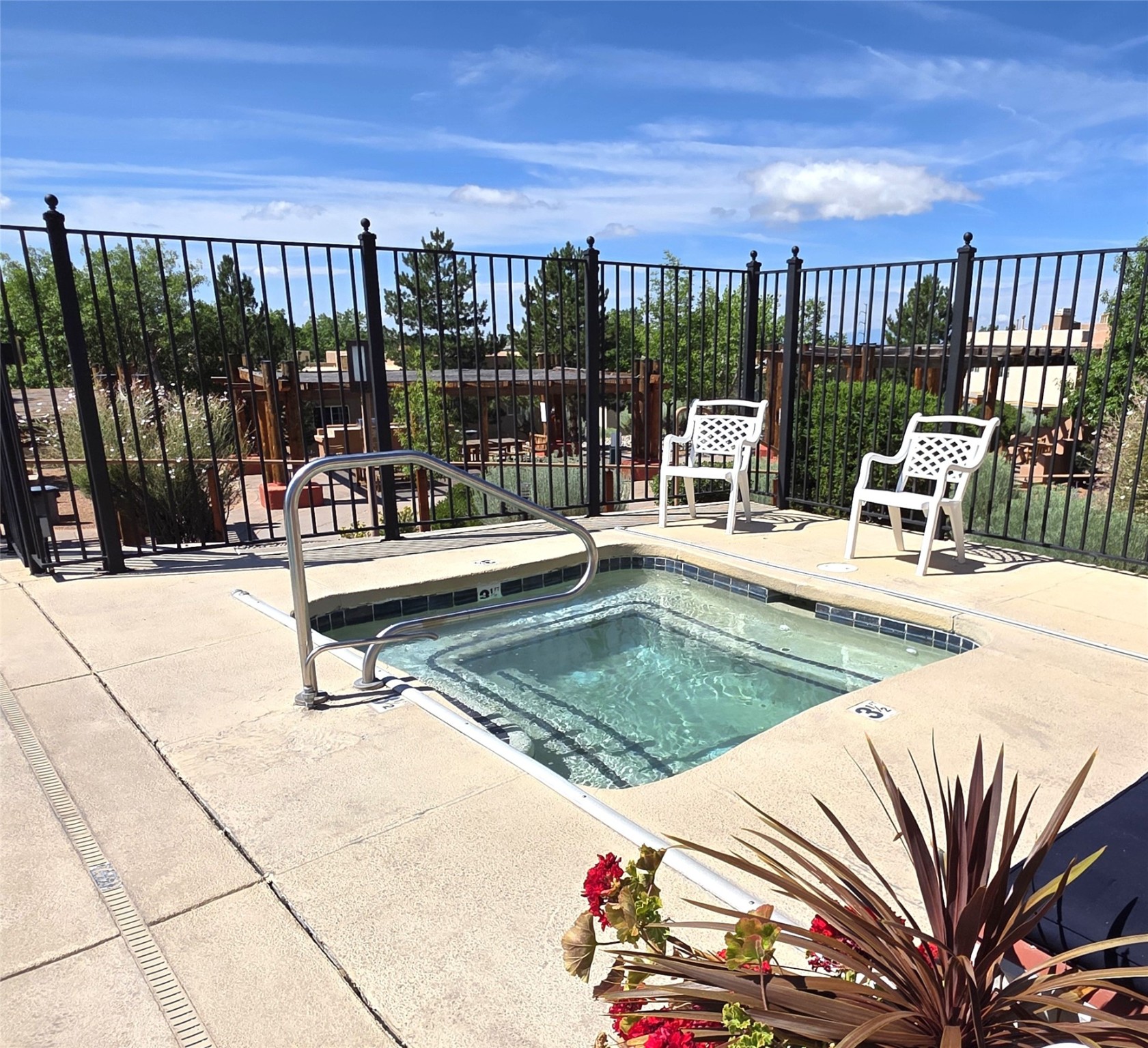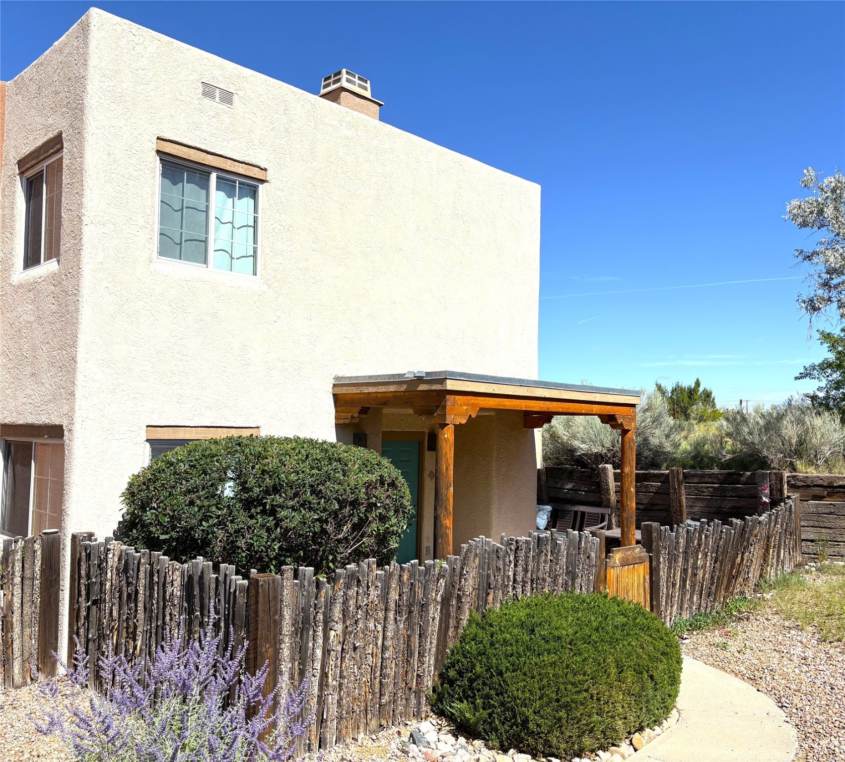 Welcome to the Dos Santos community a lovely town home end unit offering enhanced privacy and beautiful views of the mountains to the east and west. Located next to a greenbelt, this two-bedroom, two-bath home features approximately 950 square feet of well-designed living space, including an open-concept living and dining area with Saltillo tile floors, a wood-burning fireplace, and a kitchen ideal for entertaining. The upstairs includes a primary suite with an en suite bath, a walk-in closet, and attractive window treatments. Outside, the home offers a covered front patio and a fenced yard, with patio furniture included. Residents of Dos Santos enjoy access to a range of amenities, including a heated saltwater pool, hot tub, clubhouse, fitness center with exercise equipment, outdoor entertainment gazebos with gas grills, walking paths, and an expansive dog park. Located just minutes from downtown Santa Fe, close to shopping, St Vincent Hospital and direct access to Santa Fe's 'Rail Trail' for commuting, hiking and biking. The property also offers an easy commute throughout Santa Fe and to Los Alamos. Association fees cover community area maintenance, exterior building and roof maintenance, parking upkeep, recreational facilities, security, as well as water, sewer, and refuse services. E-Z to show.