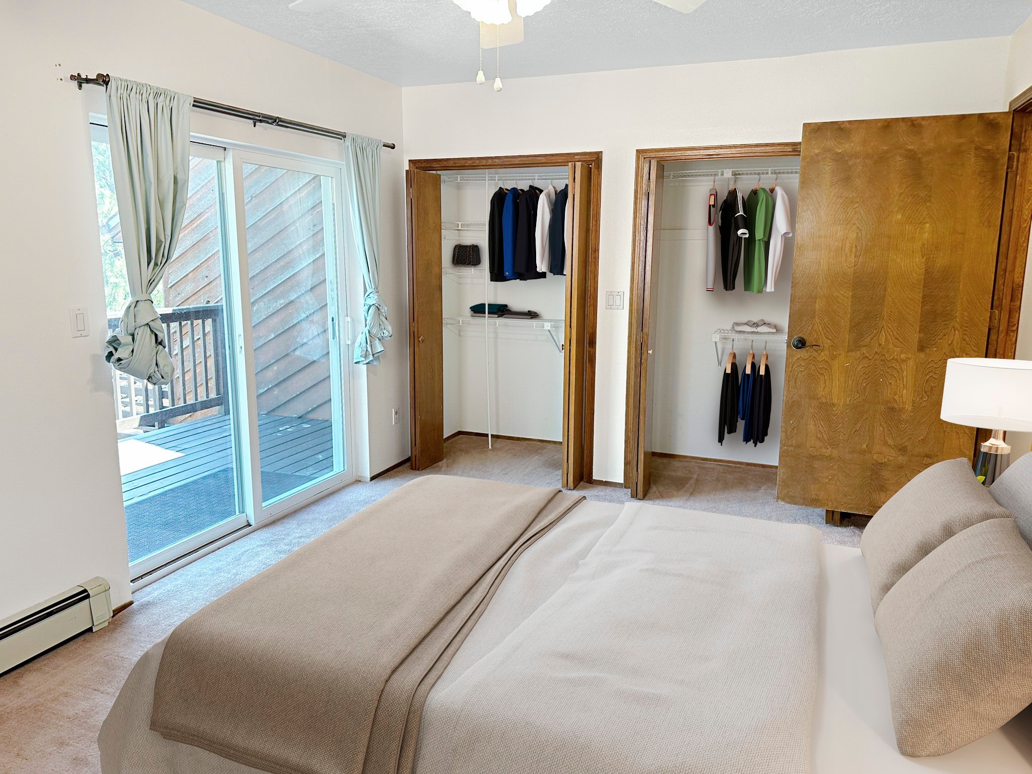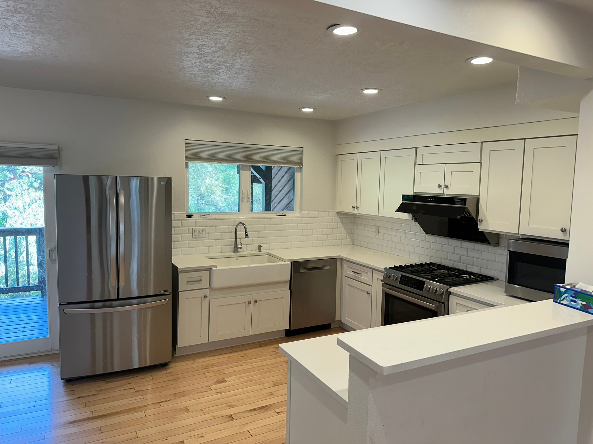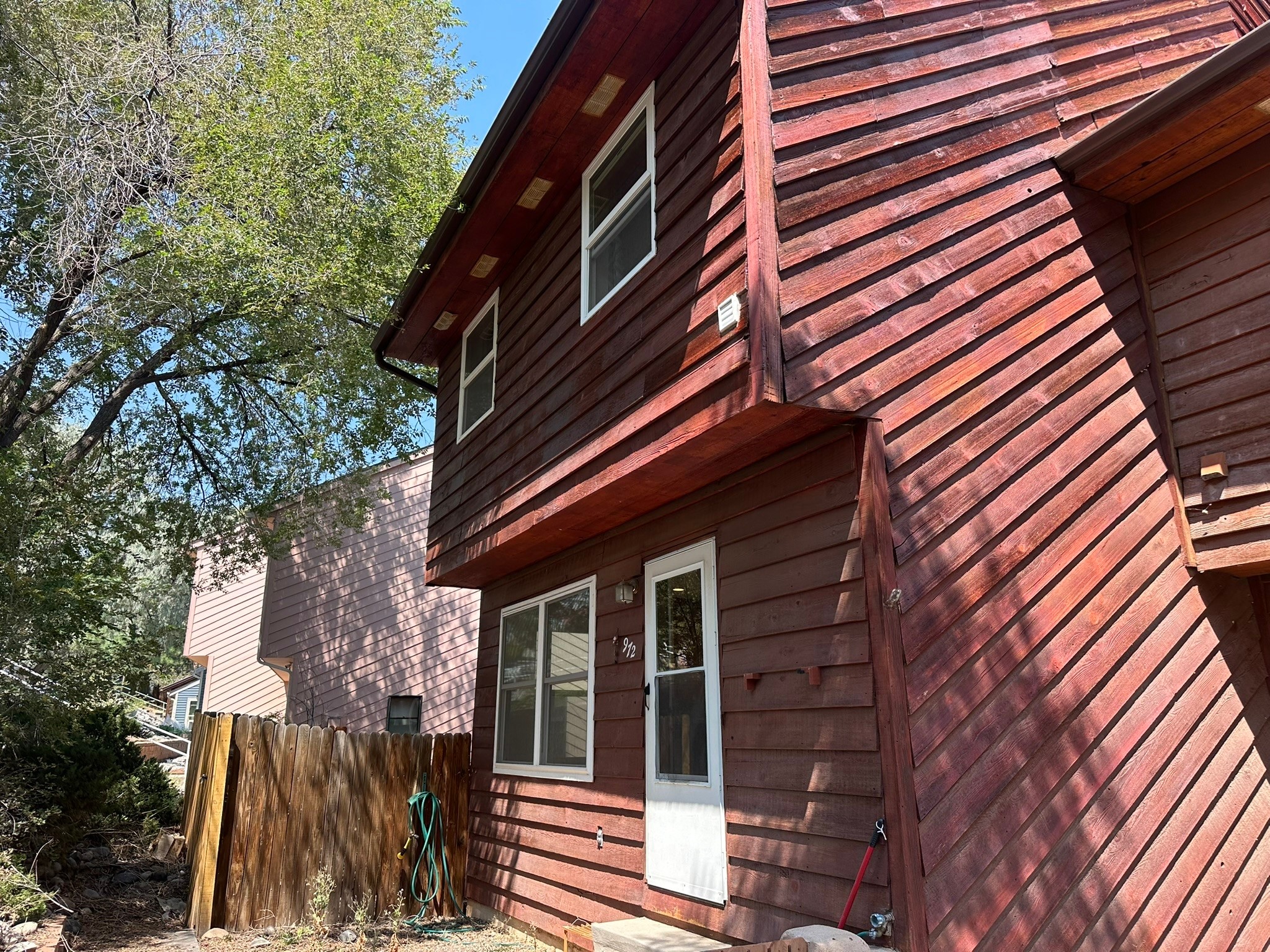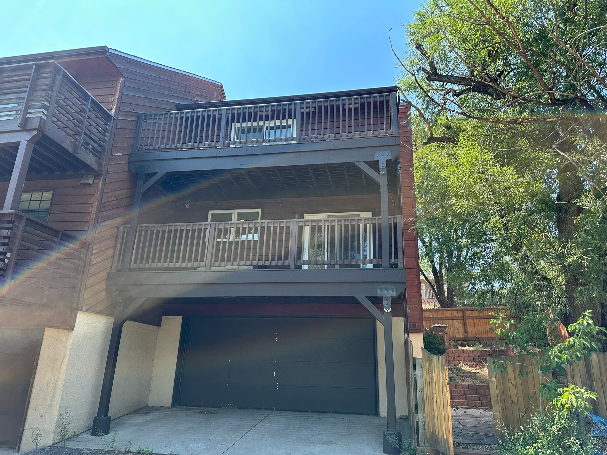 Tucked into a quiet pocket of ponderosa pines, this sweet end-unit townhome is full of personality and thoughtful updates. Inside, sunshine fills the main level, highlighting the beautiful maple hardwood floors! The kitchen is the star of the show, featuring quartz countertops, custom cabinets, a farmhouse-style sink, solid wood pantry, subway tile backsplash, sleek Bosch appliances and a modern, powerful new vent hood, the kitchen is built for functionality.. You'll also find a cozy fireplace with a tile border (freshly cleaned), plus stylish European-style Bosch-Buderus radiators for comfy heat. The main level includes a high-efficiency boiler, water heater and fresh paint throughout. The second level has one inviting bedroom along with a primary bedroom with en suite. Both bedrooms offer soft carpeting, generous closets, and great natural light. A full bathroom services the guest bedroom on this floor. The third level has another bedroom that could be used as an office, craft room, or additional storage. The lowest level offers a handy mudroom right off the two-car garage--complete with a utility sink, extra lighting, and direct access to the backyard. Step outside and enjoy the terraced yard--complete with sandstone patio. It's a lovely spot for a morning coffee, perfect for a little gardening, playing, or just enjoying nature. The exterior is in great shape too, with a newer roof, updated decks, aluminum gutters, and insulated glass doors and windows to keep things cozy year-round. With plenty of storage, and a great layout, this cheerful townhome offers an easygoing lifestyle in a lovely natural setting.