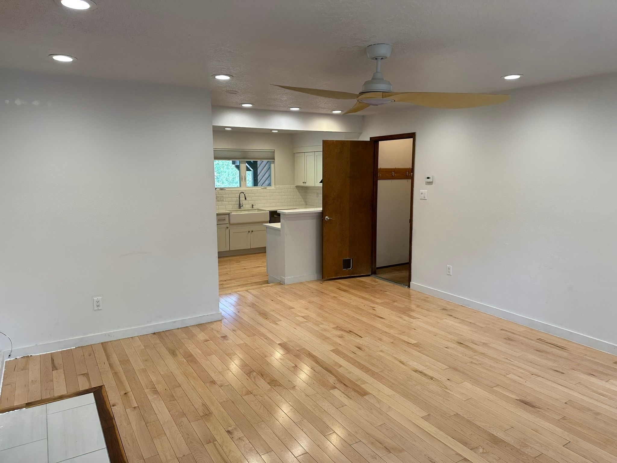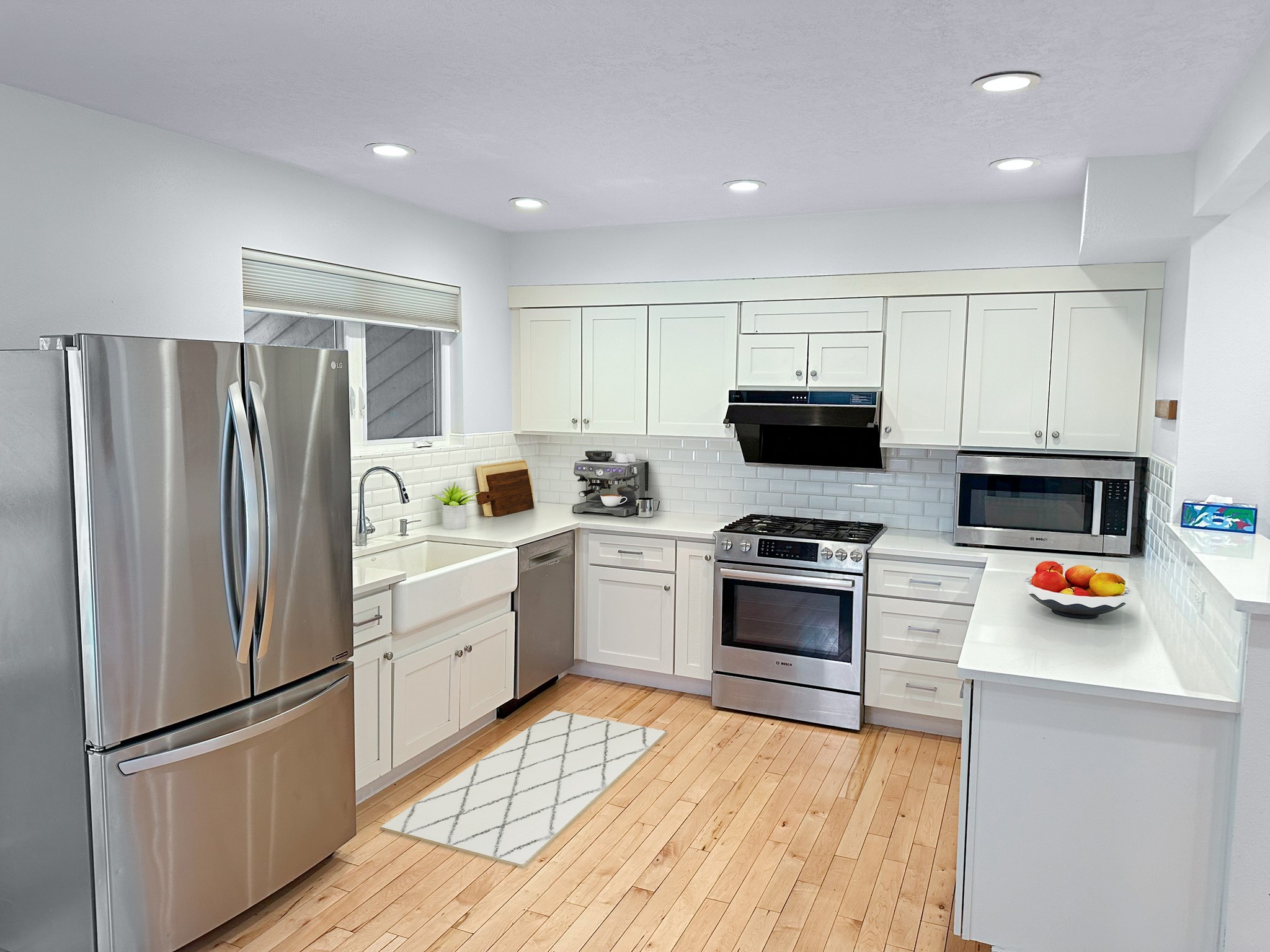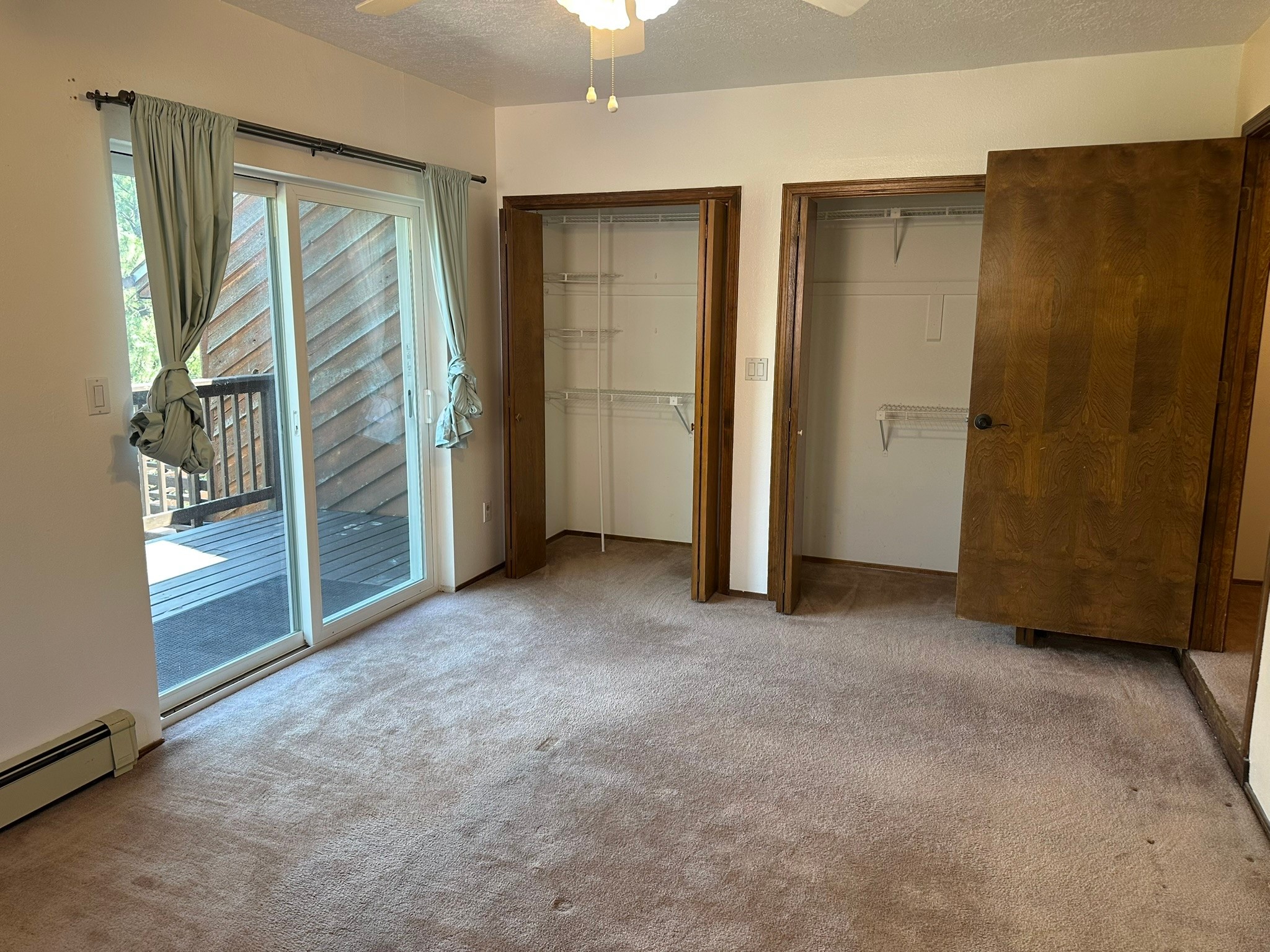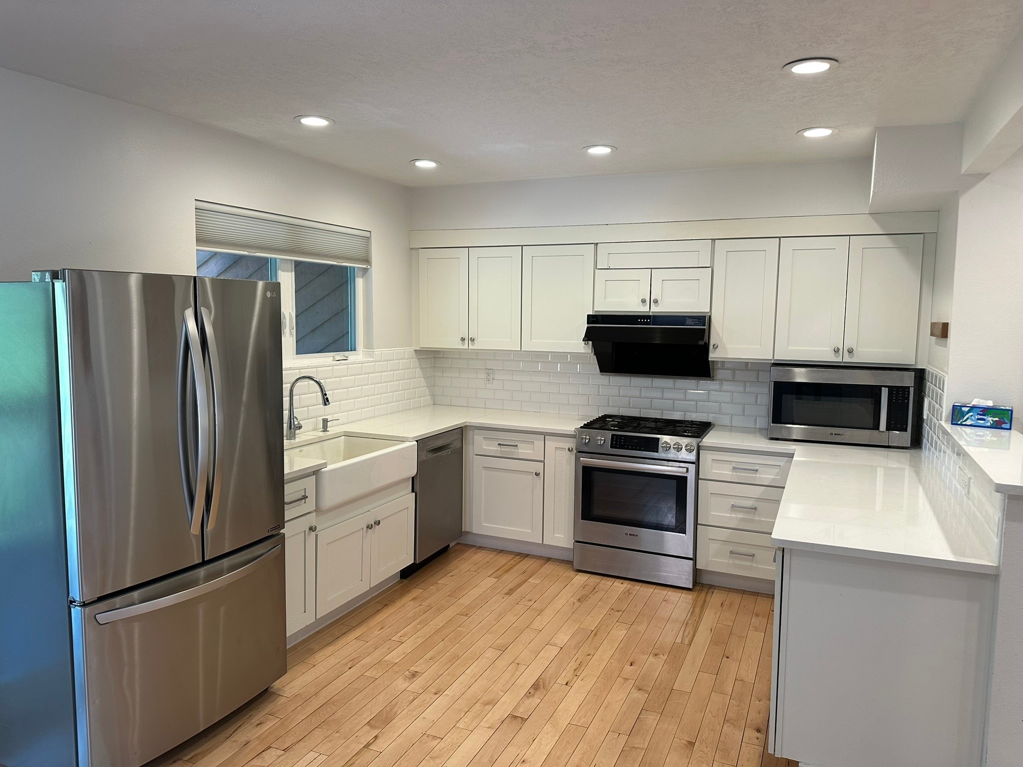 Tucked into a quiet pocket of ponderosa pines, this sweet end-unit townhome is full of personality and thoughtful updates. Inside, sunshine fills the main level, highlighting the beautiful maple hardwood floors! The kitchen is the star of the show, featuring quartz countertops, custom cabinets, a farmhouse-style sink, solid wood pantry, subway tile backsplash, sleek Bosch appliances and a modern, powerful new vent hood, the kitchen is built for functionality.. You'll also find a cozy fireplace with a tile border (freshly cleaned), plus stylish European-style Bosch-Buderus radiators for comfy heat. The main level includes a high-efficiency boiler, water heater and fresh paint throughout. The second level has one inviting bedroom along with a primary bedroom with en suite. Both bedrooms offer soft carpeting, generous closets, and great natural light. A full bathroom services the guest bedroom on this floor. The third level has another bedroom that could be used as an office, craft room, or additional storage. The lowest level offers a handy mudroom right off the two-car garage--complete with a utility sink, extra lighting, and direct access to the backyard. Step outside and enjoy the terraced yard--complete with sandstone patio. It's a lovely spot for a morning coffee, perfect for a little gardening, playing, or just enjoying nature. The exterior is in great shape too, with a newer roof, updated decks, aluminum gutters, and insulated glass doors and windows to keep things cozy year-round. With plenty of storage, and a great layout, this cheerful townhome offers an easygoing lifestyle in a lovely natural setting.