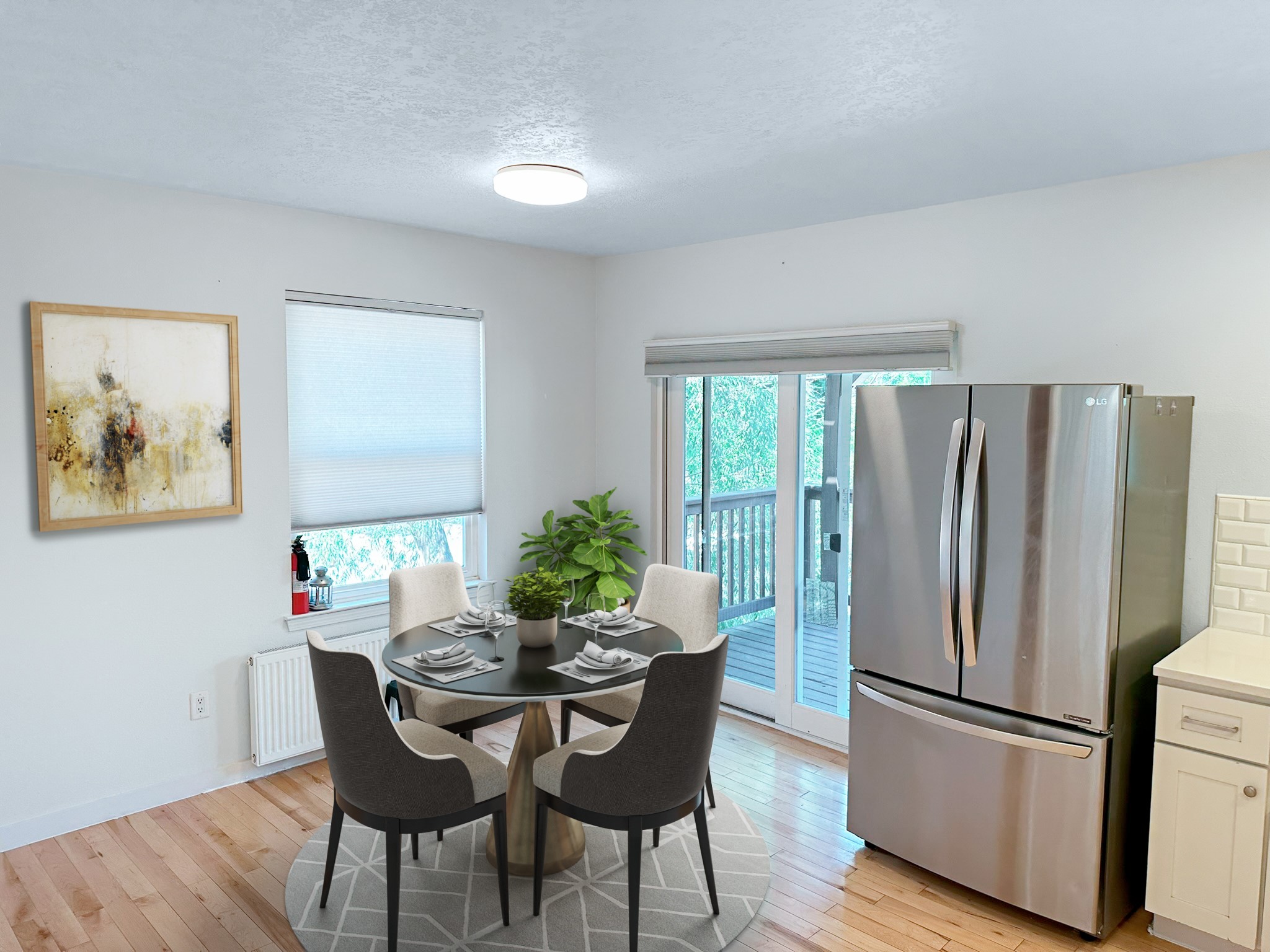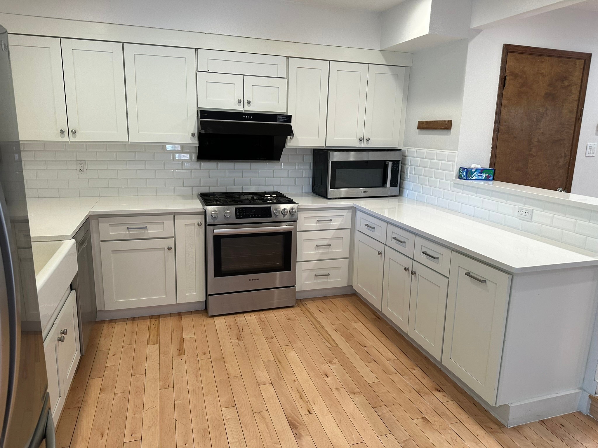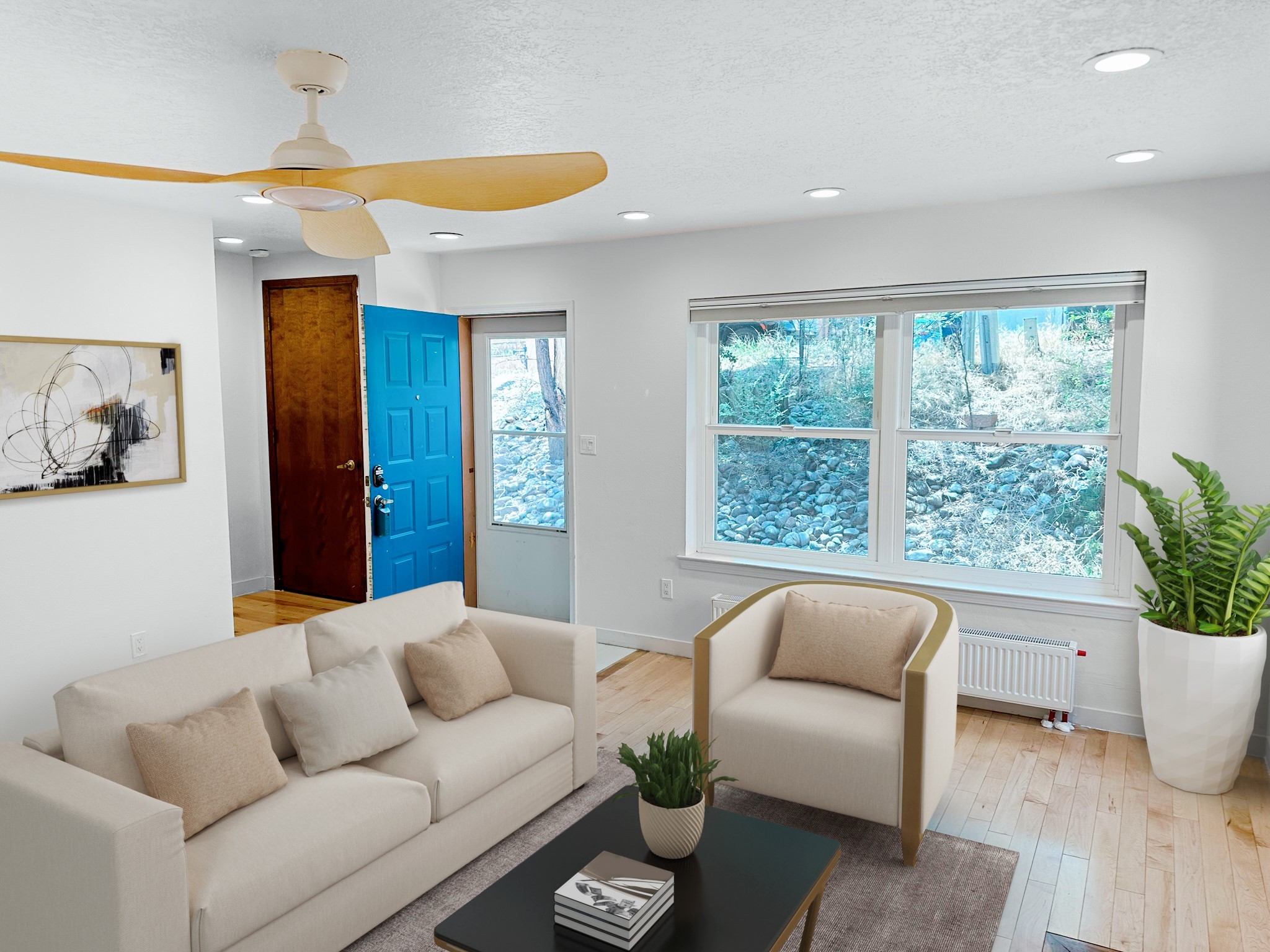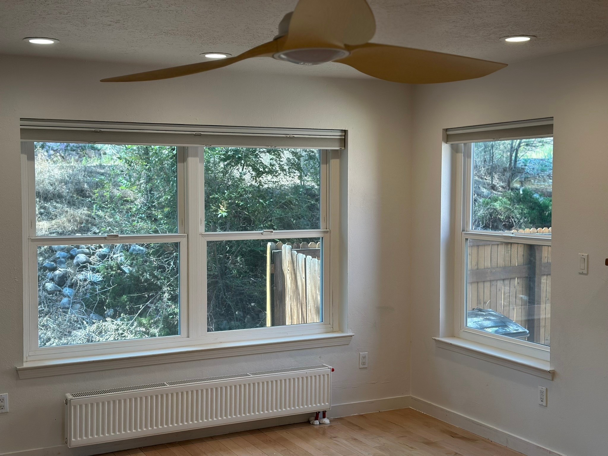 Tucked into a quiet pocket of ponderosa pines, this sweet end-unit townhome is full of personality and thoughtful updates. Inside, sunshine fills the main level, highlighting the beautiful maple hardwood floors! The kitchen is the star of the show, featuring quartz countertops, custom cabinets, a farmhouse-style sink, solid wood pantry, subway tile backsplash, sleek Bosch appliances and a modern, powerful new vent hood, the kitchen is built for functionality.. You'll also find a cozy fireplace with a tile border (freshly cleaned), plus stylish European-style Bosch-Buderus radiators for comfy heat. The main level includes a high-efficiency boiler, water heater and fresh paint throughout. The second level has one inviting bedroom along with a primary bedroom with en suite. Both bedrooms offer soft carpeting, generous closets, and great natural light. A full bathroom services the guest bedroom on this floor. The third level has another bedroom that could be used as an office, craft room, or additional storage. The lowest level offers a handy mudroom right off the two-car garage--complete with a utility sink, extra lighting, and direct access to the backyard. Step outside and enjoy the terraced yard--complete with sandstone patio. It's a lovely spot for a morning coffee, perfect for a little gardening, playing, or just enjoying nature. The exterior is in great shape too, with a newer roof, updated decks, aluminum gutters, and insulated glass doors and windows to keep things cozy year-round. With plenty of storage, and a great layout, this cheerful townhome offers an easygoing lifestyle in a lovely natural setting.