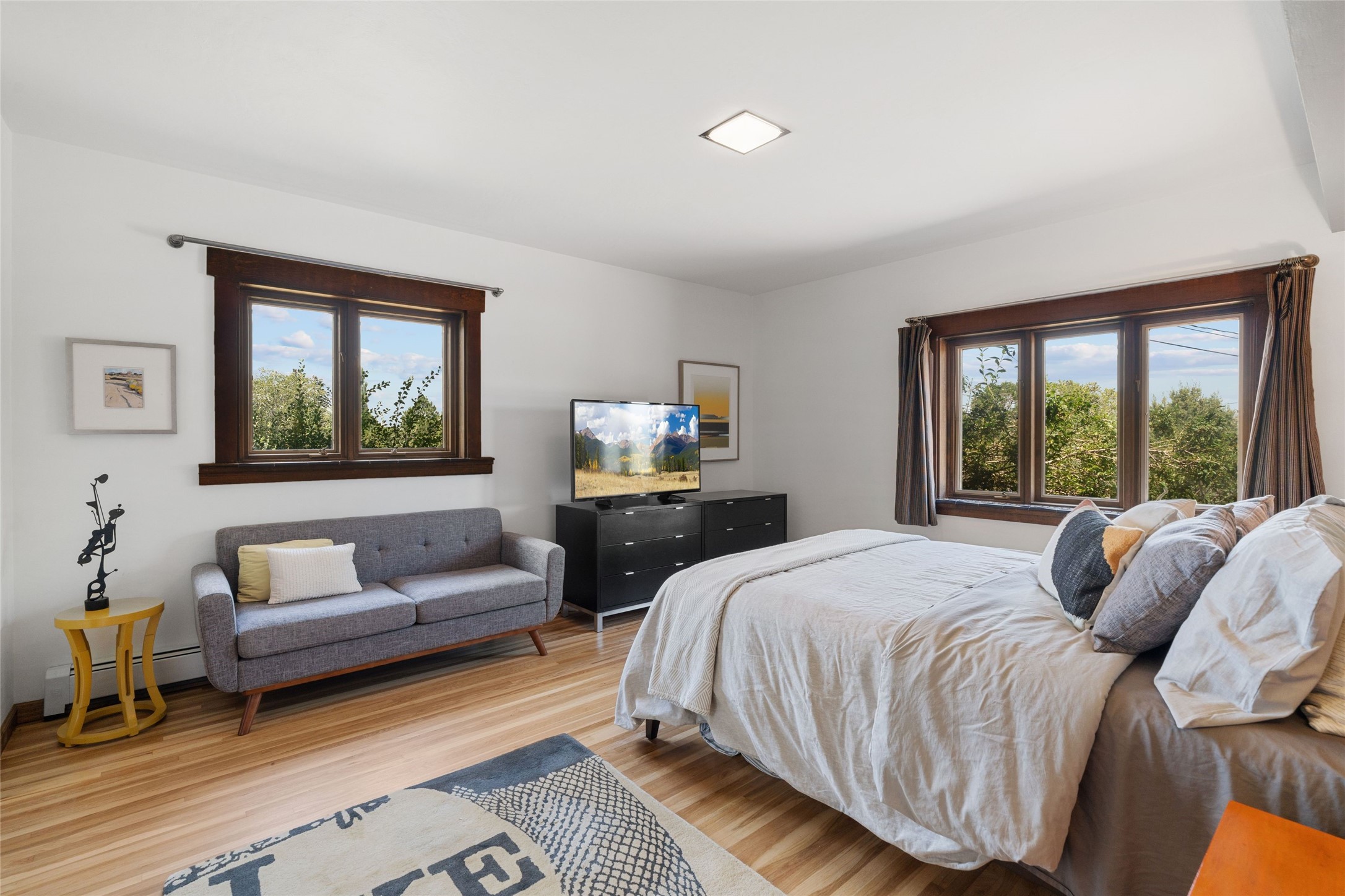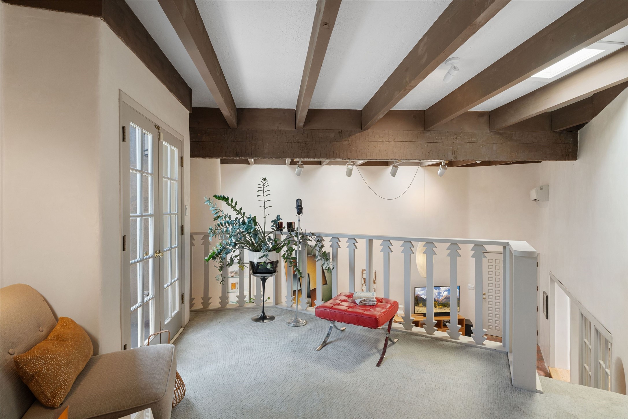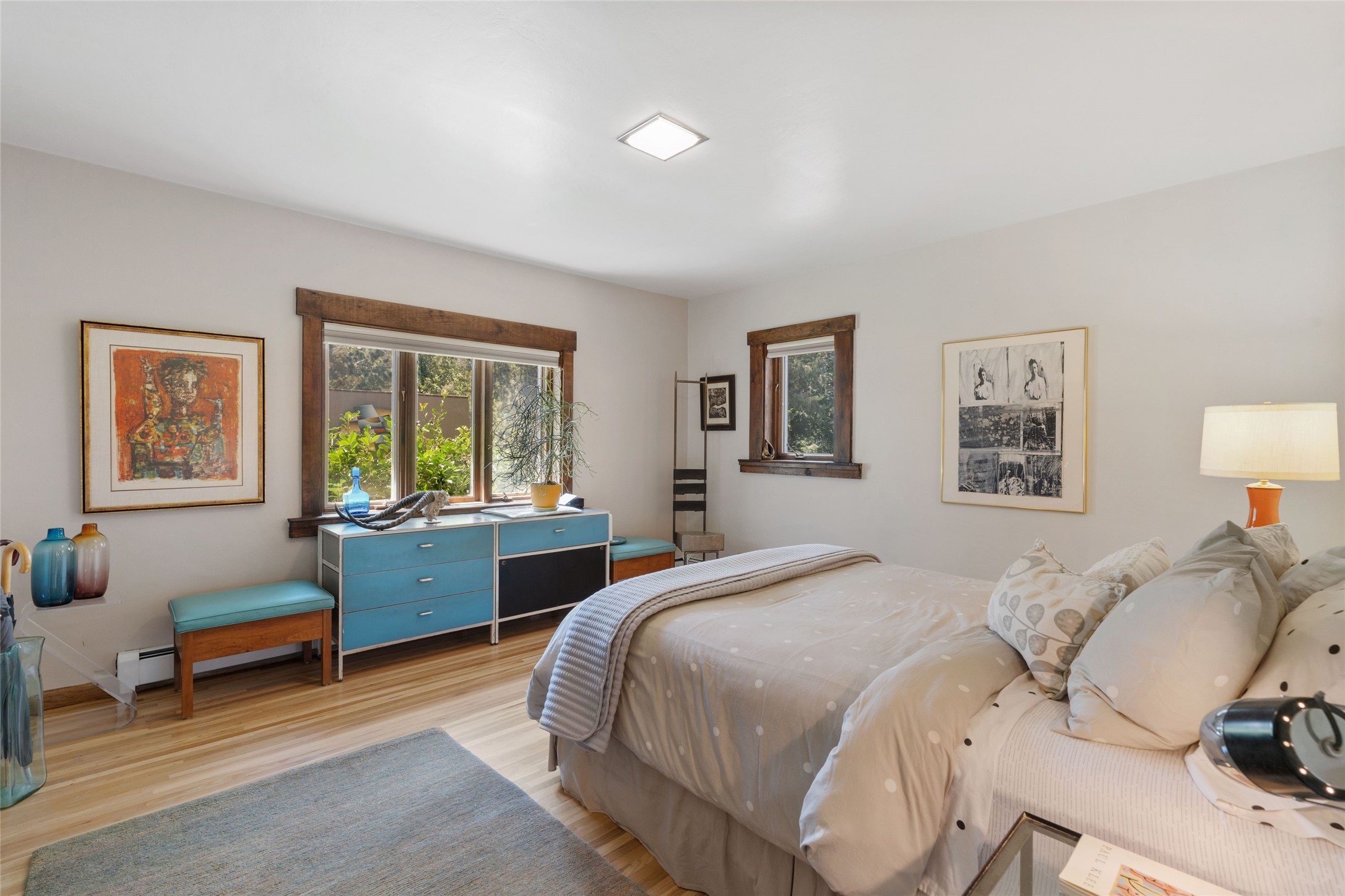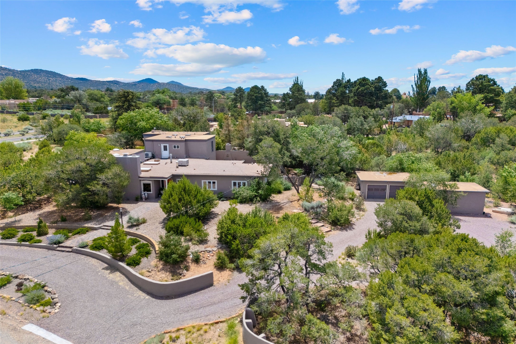 A truly inspired mid-century home like this cannot be found anywhere but Santa Fe and is ideally located where South Capitol meets Museum Hill. Designed & built in 1955, with a dramatic expansion in 1975, this home has evolved into unique & stunning! The mid-century conversation pit, large rooms & soaring ceilings are invigorated with elements of Santa Fe style: an iconic Kiva fireplace, double arrow carved details, customized latilla ceilings, nichos & vigas. Bespoke in so many ways by teams of craftsmen, you will appreciate hand plastered walls, narrow oak flooring that harks back to the 50s but looks brand new, other floors are brick, flagstone, & tile. The full acre property offers 3 distinctive outdoor areas: one is shady, tree-filled and comes alive at dusk with cool vintage lights. Off the studio is a sunny fenced yard with pear tree. Third & largest is a grand gathering space for parties, sit-down dinners, fireplace chats - surrounded by lush gardens. Sprawling across the main floor you will find entertainment-ready public spaces like a lofted great room, sitting, media, dining rooms plus eat-in kitchen. The bedroom wing is set apart with the primary bedroom en-suite plus 2 large bedrooms that share the main bath. The public 1/2 bath & laundry are part of the large media room area. The bonus is upstairs: an attached guest suite with private entrance, OR, second en-suite primary bedroom. Unexpected highlights: a 17' tall glass-walled art studio/gym, a "treasure room" or library, heated 2 car garage wired for 240 + separate workshop OR storage room. This property is flush with flexibility: if you seek a home office retreat there are many options. You will love the practicalty of this "Santa Fe Central" location where the 2 closest grocery stores are Trader Joe's & Whole Foods, the 2 closest restaurants are Museum Hill & Clafoutis. This is a rare opportunity to experience "design magazine modern" with Santa Fe spirit! Virtual tour + Video Link online