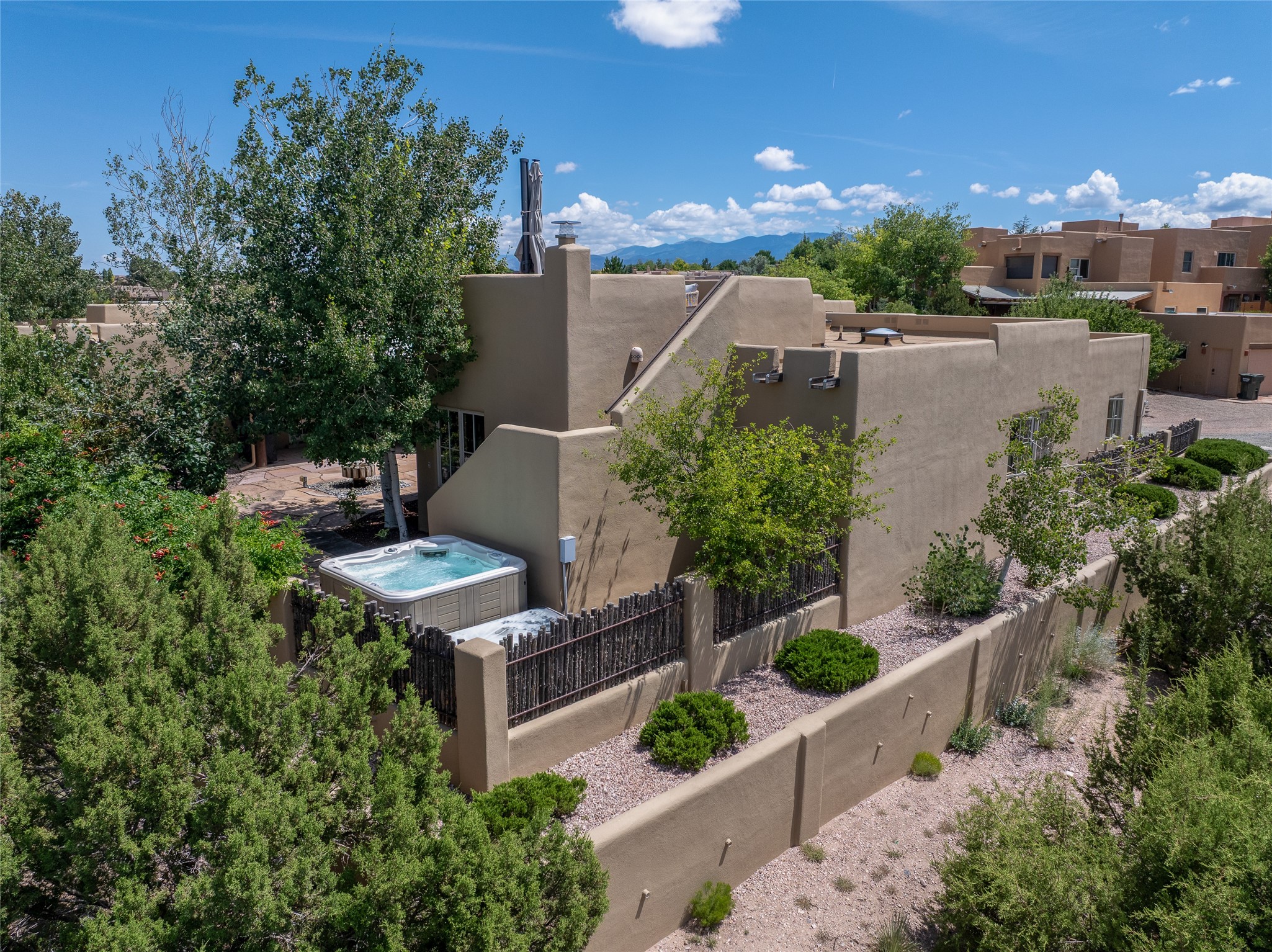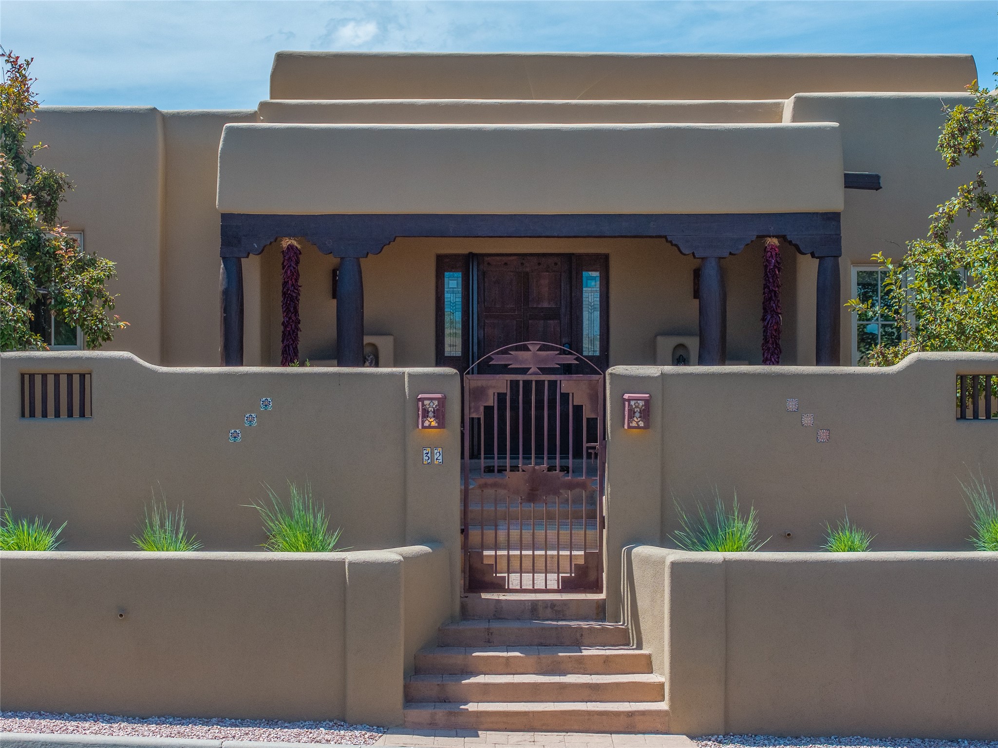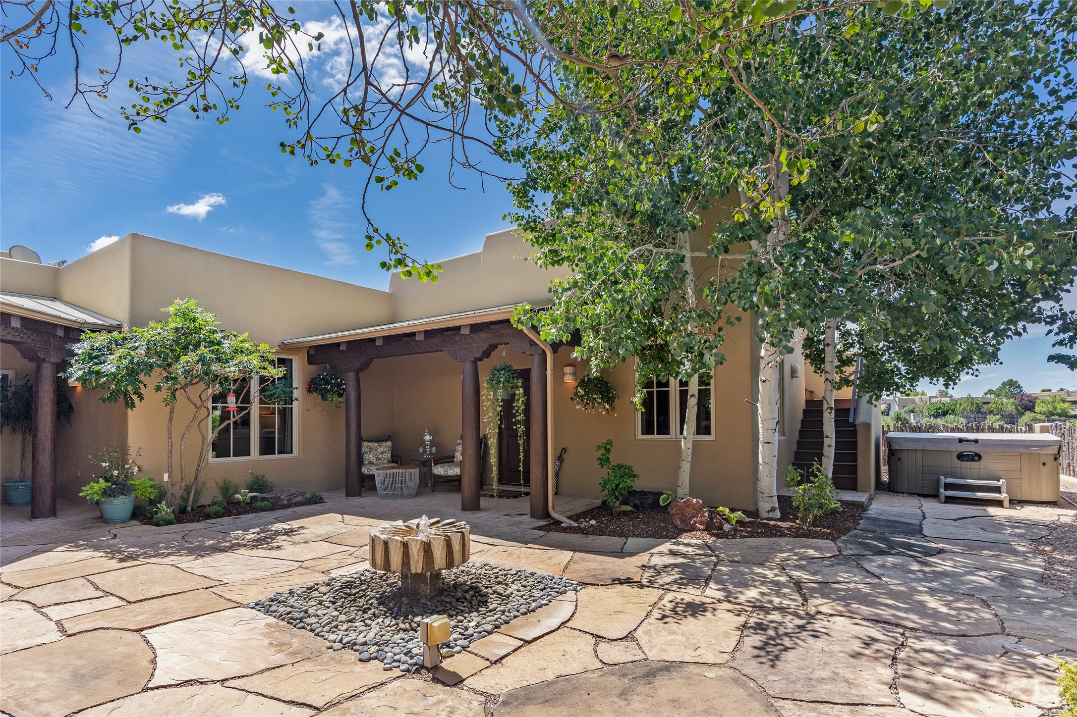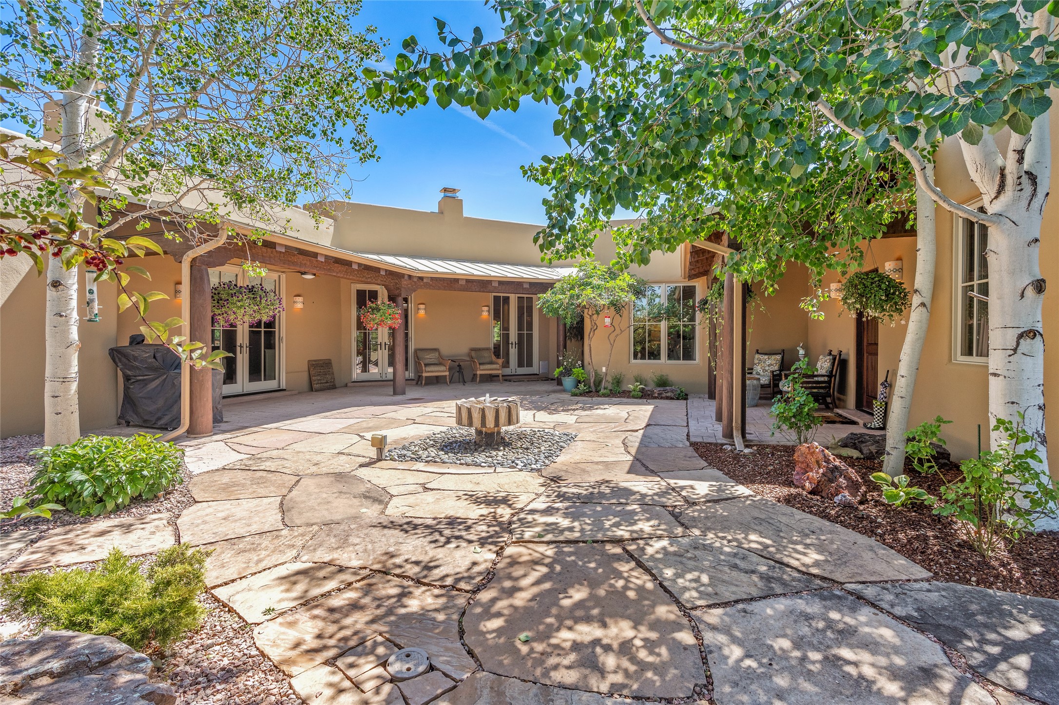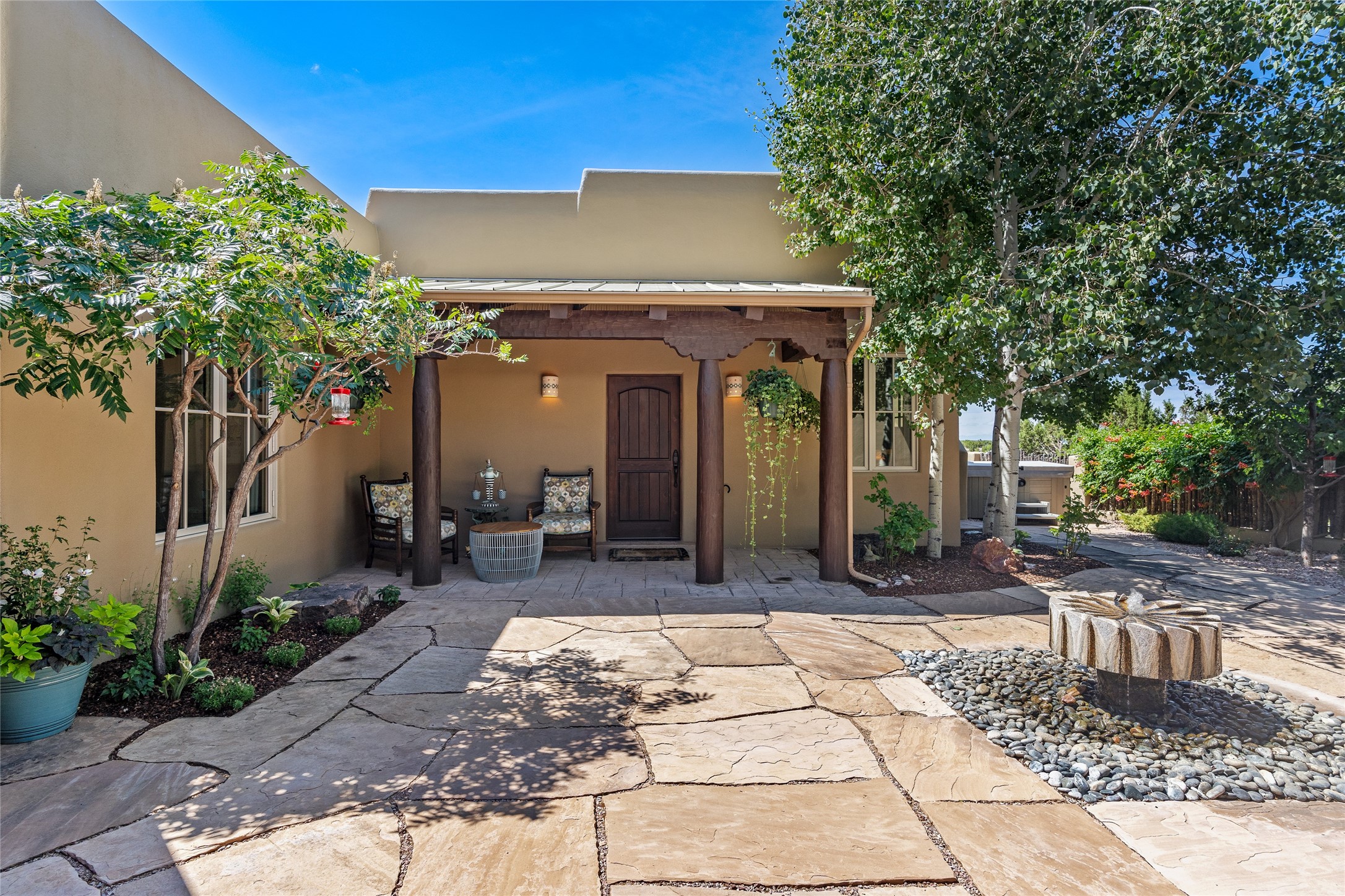 Elegance meets versatility in Santa Fe's much desired Aldea community. This refined, single-level home with a guest-ready casita truly delivers. Traditional Santa Fe-style architecture perfectly complements the artfully designed interior, offering a seamless fusion of style, comfort, and flexibility. The main house feature 3,284 +/- sqft of living space and includes three bedrooms plus a bonus media room or den, perfect for entertainment, lounging, studio or work from home needs. The chef's kitchen is polished and offers incredible functionality with recently installed Thermador appliances, a spacious informal dining nook and pantry storage. The primary suite is luxurious and only one of several tasteful retreats offered by this thoughtful floorplan. Two guest bedrooms, a large laundry/mudroom, and oversized two-car garage balance form with function. The one bedroom casita is accessed from the central courtyard and is equipped with a comfortable living space, gas burning fireplace and private kitchen area-the perfect space to host friends and family. Up an exterior flight of stairs is the rooftop deck which features 360-degree views of the Sangre de Cristo, Jemez, and Sandia mountain ranges. Outside living areas are well manicured, yet low-maintenance, and are watered by a 4-zone irrigation system. Aldea is a vibrant, active community with miles of walking trails, a community center, and other amenities-all just 15 minutes from downtown Santa Fe. ***A comprehensive list of recent improvements and complete furniture package is available upon request. ***