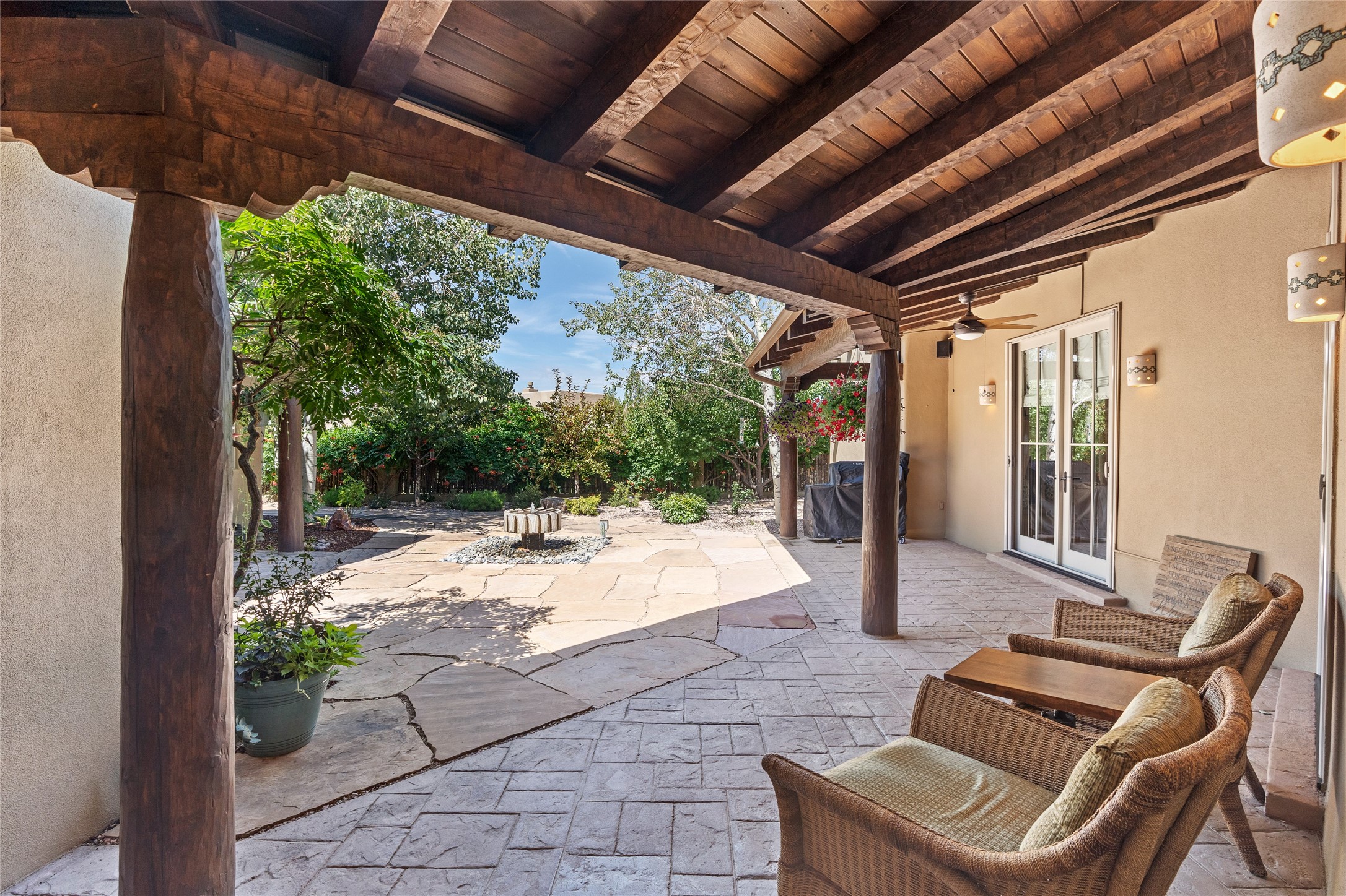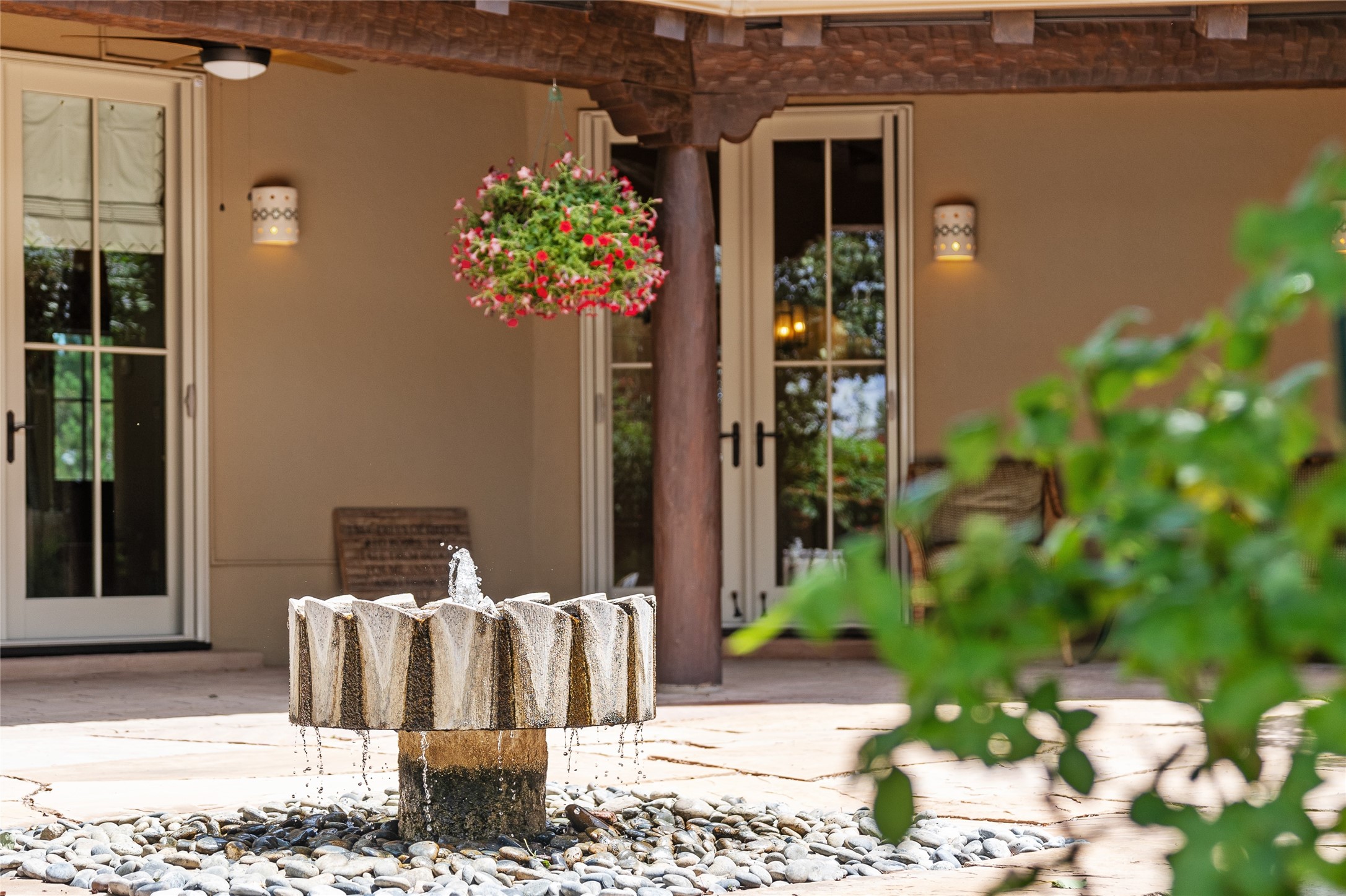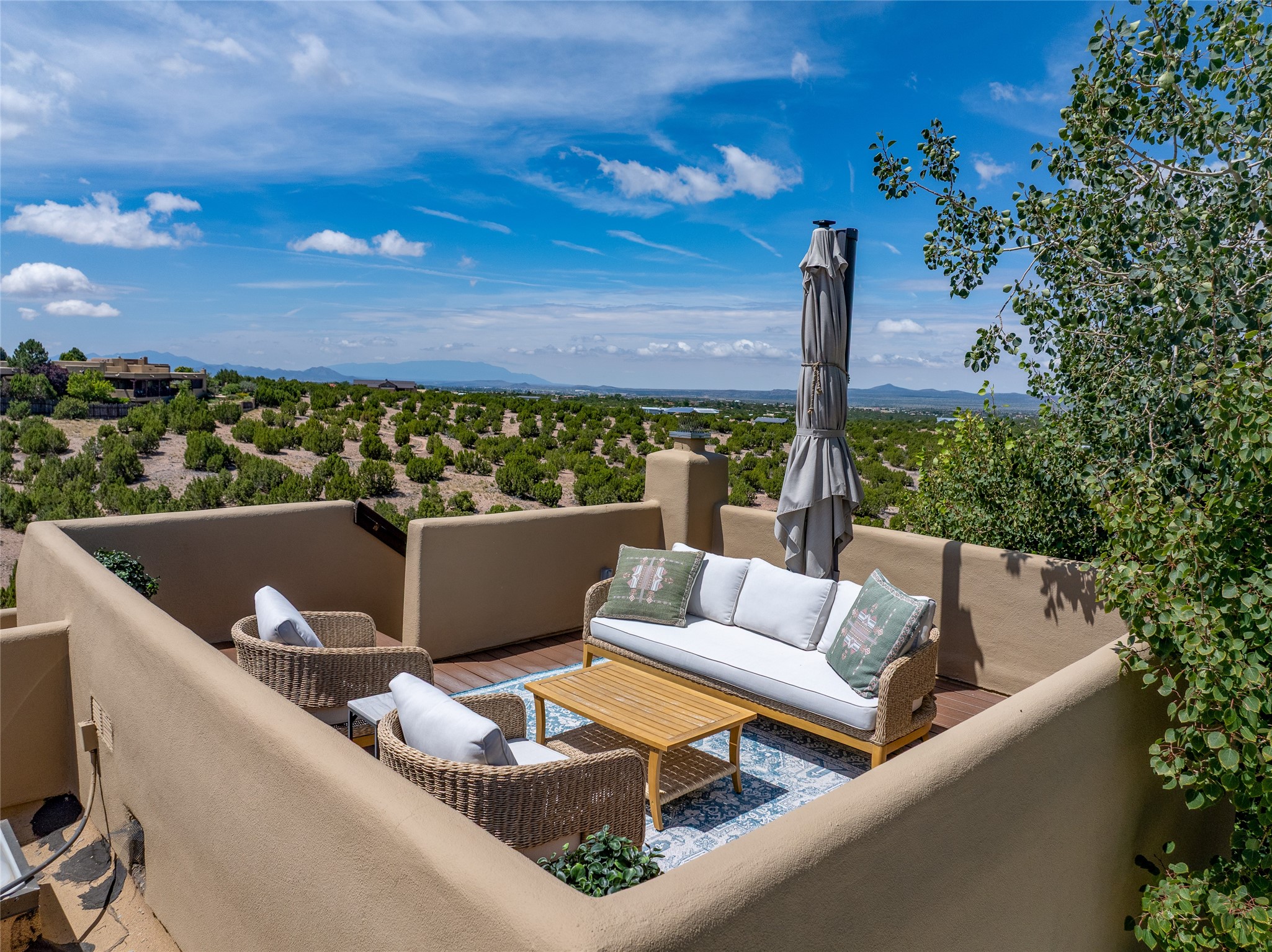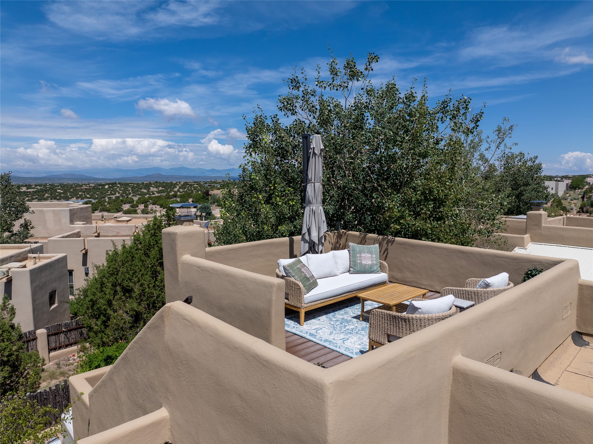 Elegance meets versatility in Santa Fe's much desired Aldea community. This refined, single-level home with a guest-ready casita truly delivers. Traditional Santa Fe-style architecture perfectly complements the artfully designed interior, offering a seamless fusion of style, comfort, and flexibility. The main house feature 3,284 +/- sqft of living space and includes three bedrooms plus a bonus media room or den, perfect for entertainment, lounging, studio or work from home needs. The chef's kitchen is polished and offers incredible functionality with recently installed Thermador appliances, a spacious informal dining nook and pantry storage. The primary suite is luxurious and only one of several tasteful retreats offered by this thoughtful floorplan. Two guest bedrooms, a large laundry/mudroom, and oversized two-car garage balance form with function. The one bedroom casita is accessed from the central courtyard and is equipped with a comfortable living space, gas burning fireplace and private kitchen area-the perfect space to host friends and family. Up an exterior flight of stairs is the rooftop deck which features 360-degree views of the Sangre de Cristo, Jemez, and Sandia mountain ranges. Outside living areas are well manicured, yet low-maintenance, and are watered by a 4-zone irrigation system. Aldea is a vibrant, active community with miles of walking trails, a community center, and other amenities-all just 15 minutes from downtown Santa Fe. ***A comprehensive list of recent improvements and complete furniture package is available upon request. ***
