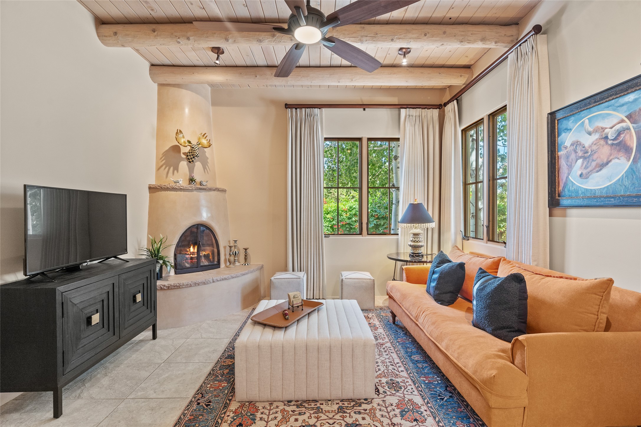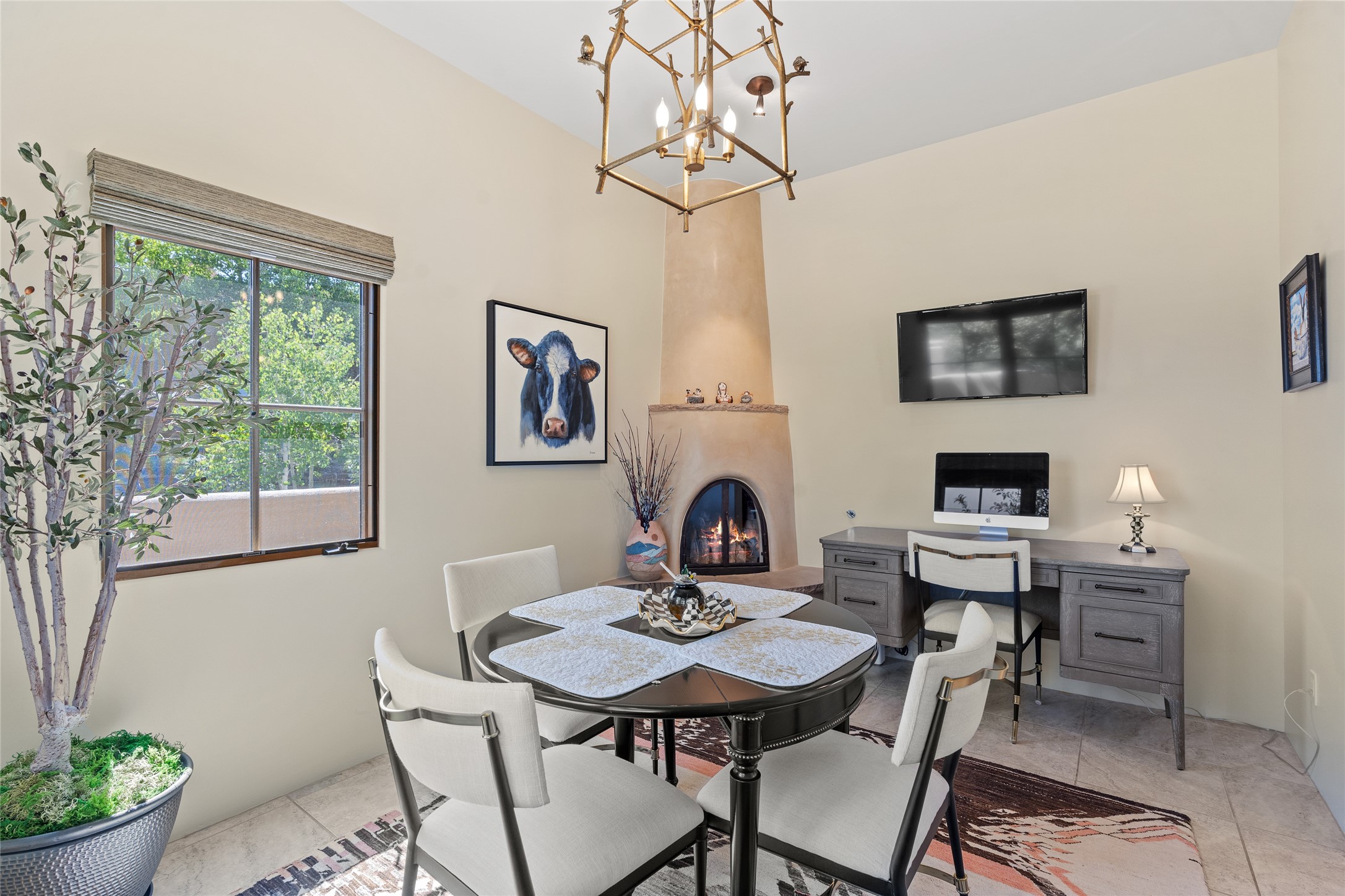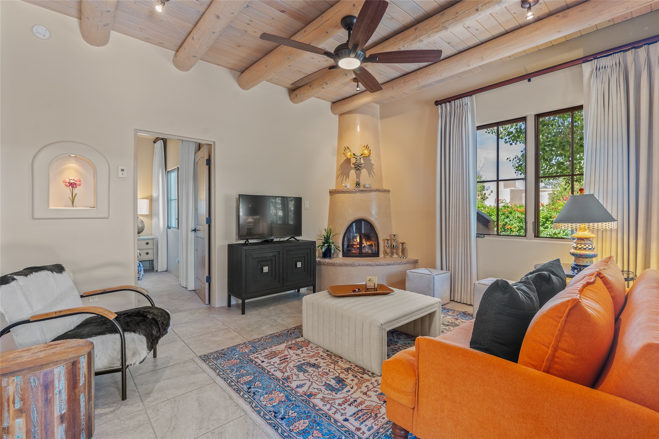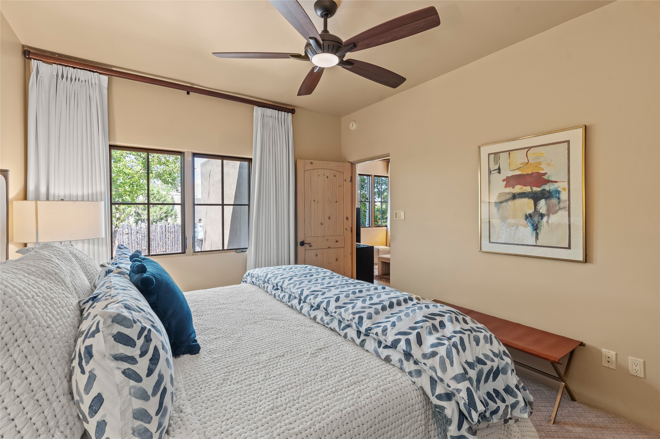 Elegance meets versatility in Santa Fe's much desired Aldea community. This refined, single-level home with a guest-ready casita truly delivers. Traditional Santa Fe-style architecture perfectly complements the artfully designed interior, offering a seamless fusion of style, comfort, and flexibility. The main house feature 3,284 +/- sqft of living space and includes three bedrooms plus a bonus media room or den, perfect for entertainment, lounging, studio or work from home needs. The chef's kitchen is polished and offers incredible functionality with recently installed Thermador appliances, a spacious informal dining nook and pantry storage. The primary suite is luxurious and only one of several tasteful retreats offered by this thoughtful floorplan. Two guest bedrooms, a large laundry/mudroom, and oversized two-car garage balance form with function. The one bedroom casita is accessed from the central courtyard and is equipped with a comfortable living space, gas burning fireplace and private kitchen area-the perfect space to host friends and family. Up an exterior flight of stairs is the rooftop deck which features 360-degree views of the Sangre de Cristo, Jemez, and Sandia mountain ranges. Outside living areas are well manicured, yet low-maintenance, and are watered by a 4-zone irrigation system. Aldea is a vibrant, active community with miles of walking trails, a community center, and other amenities-all just 15 minutes from downtown Santa Fe. ***A comprehensive list of recent improvements and complete furniture package is available upon request. ***
