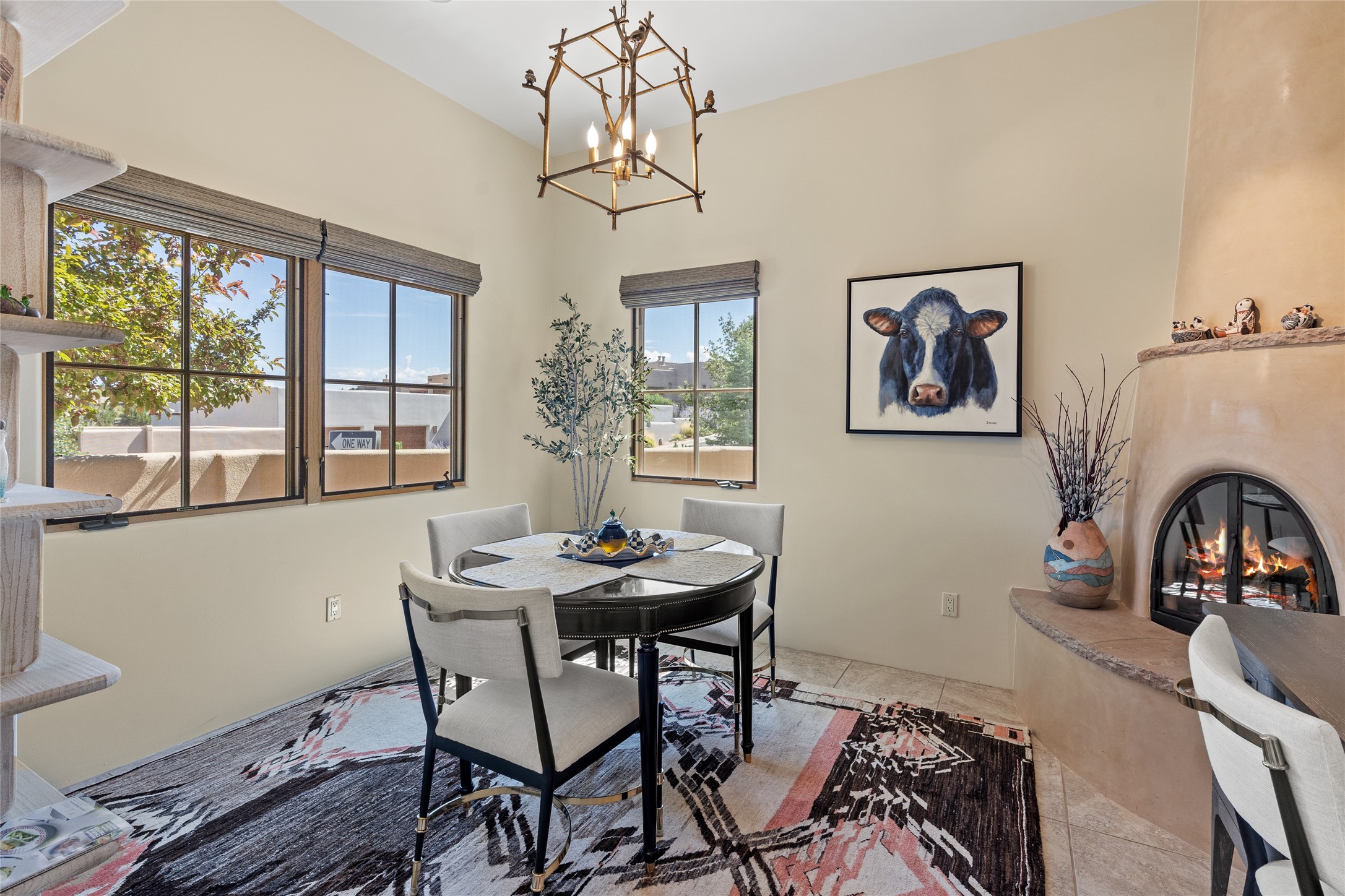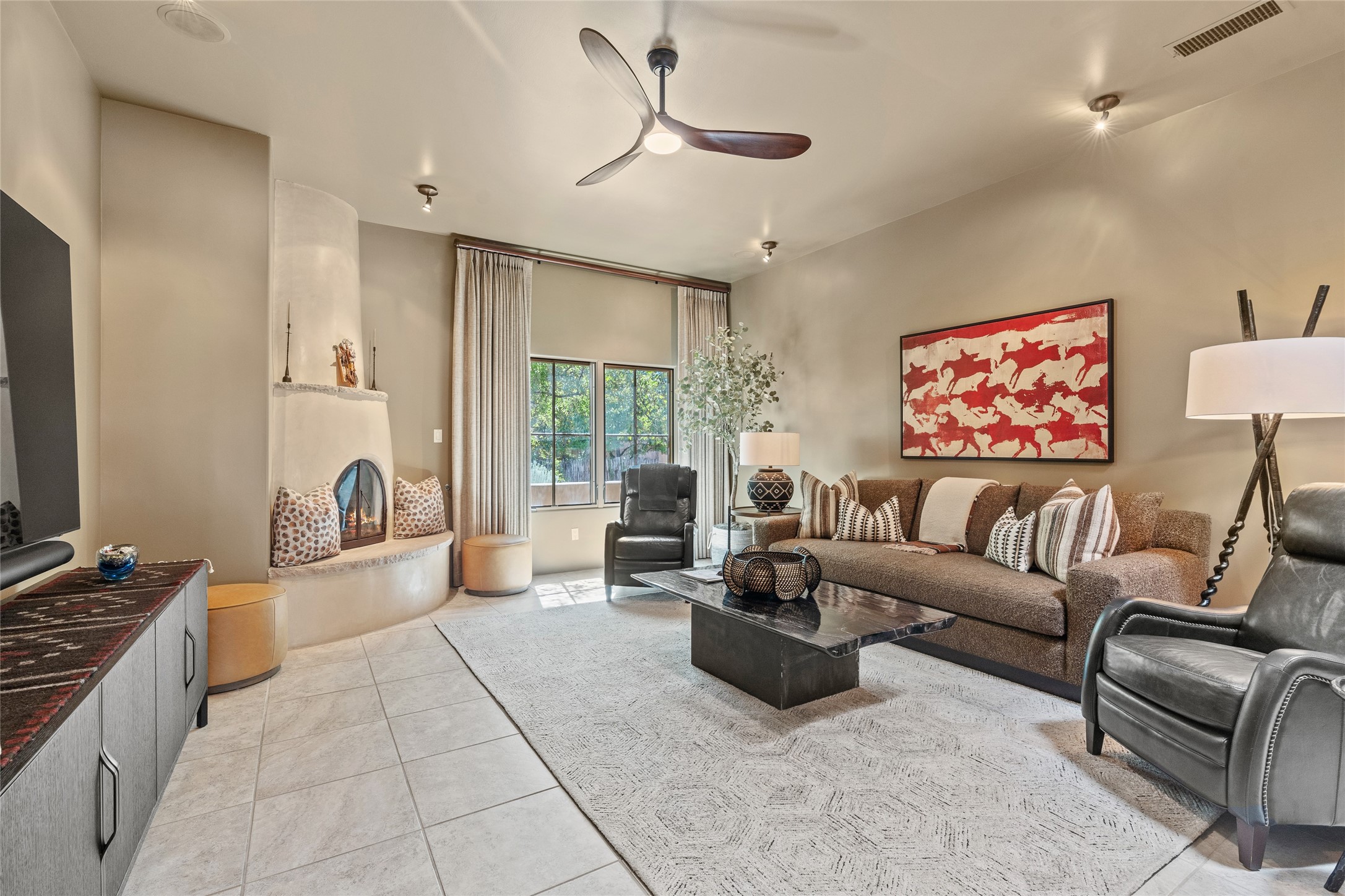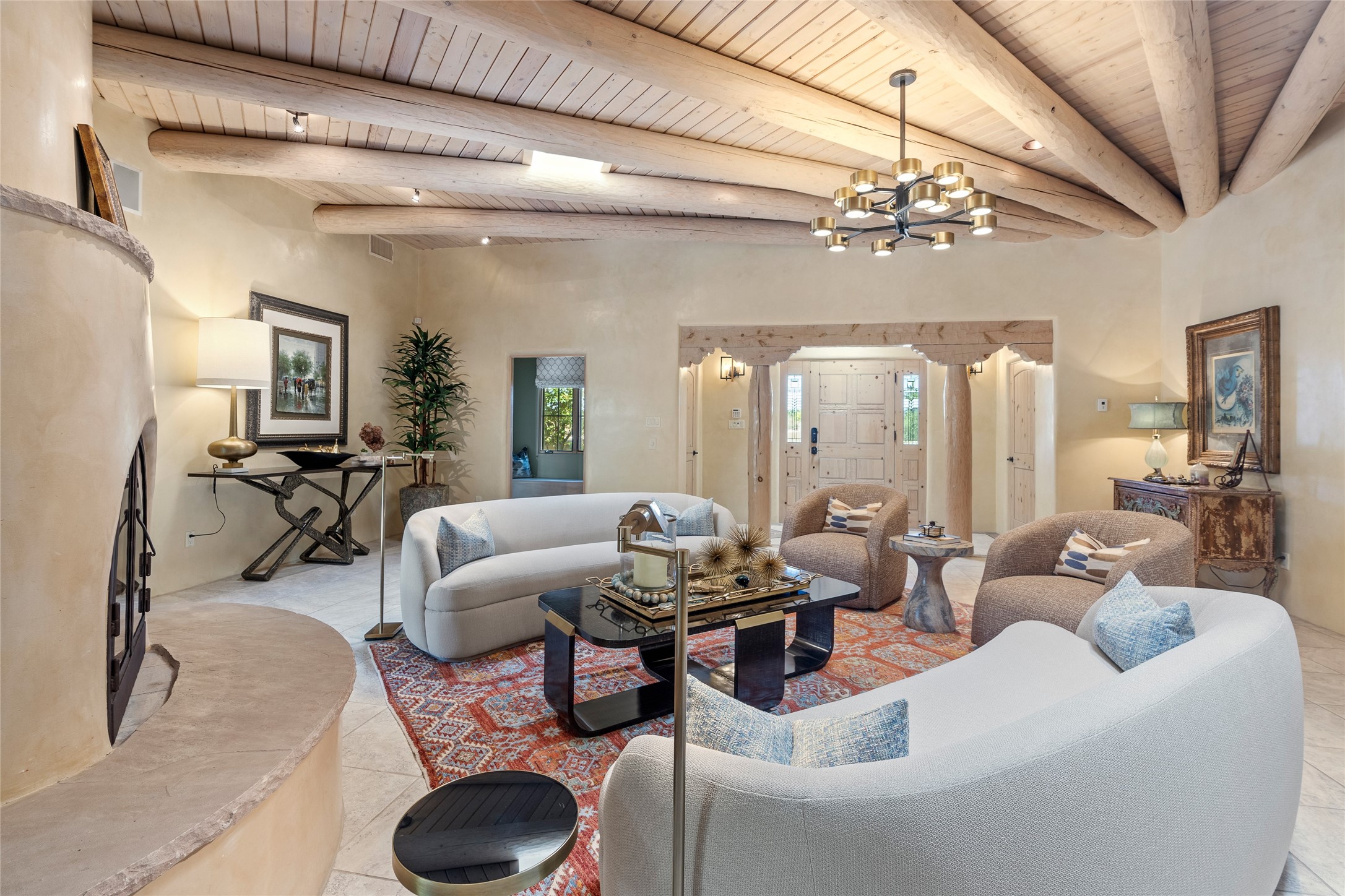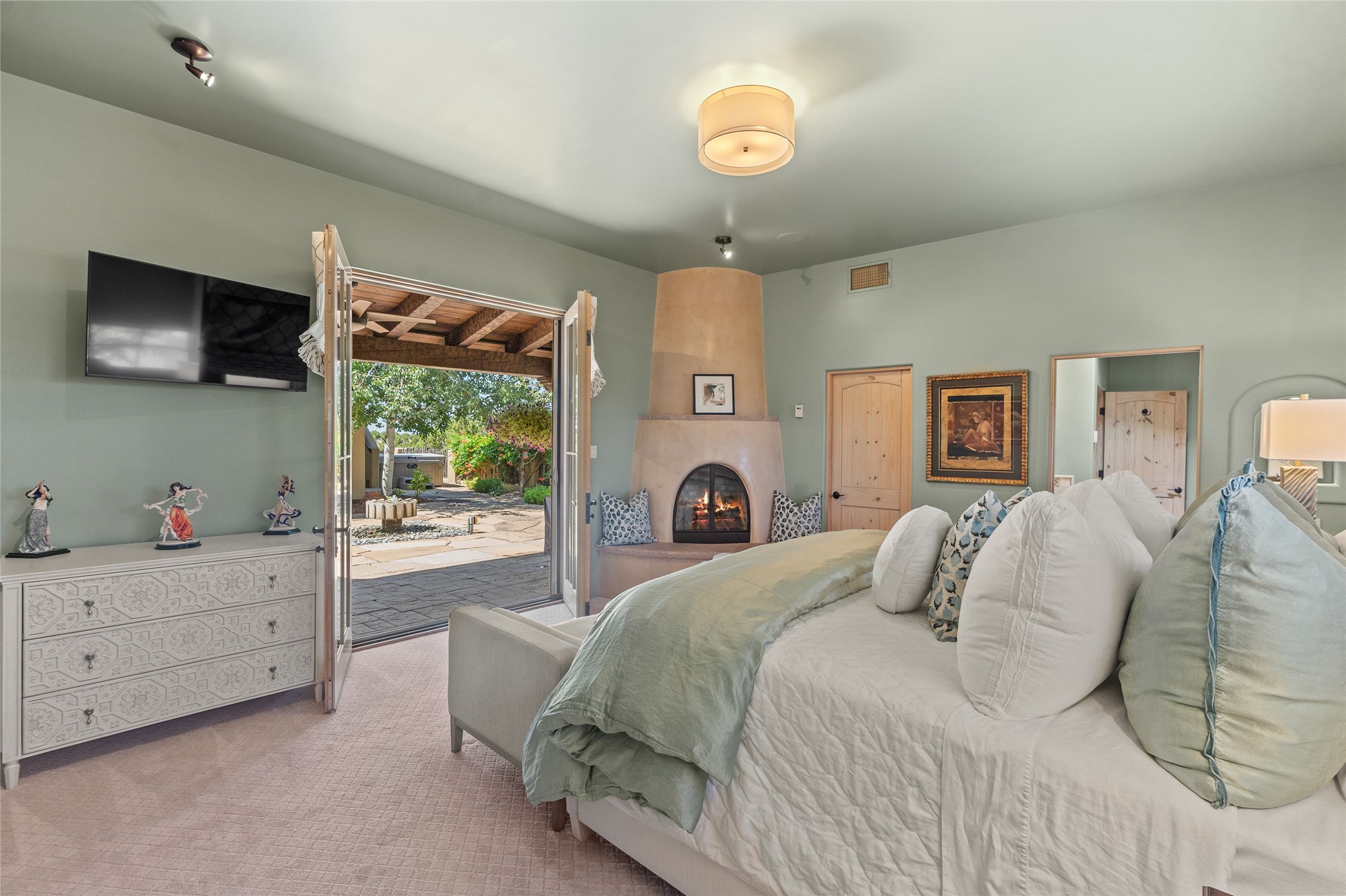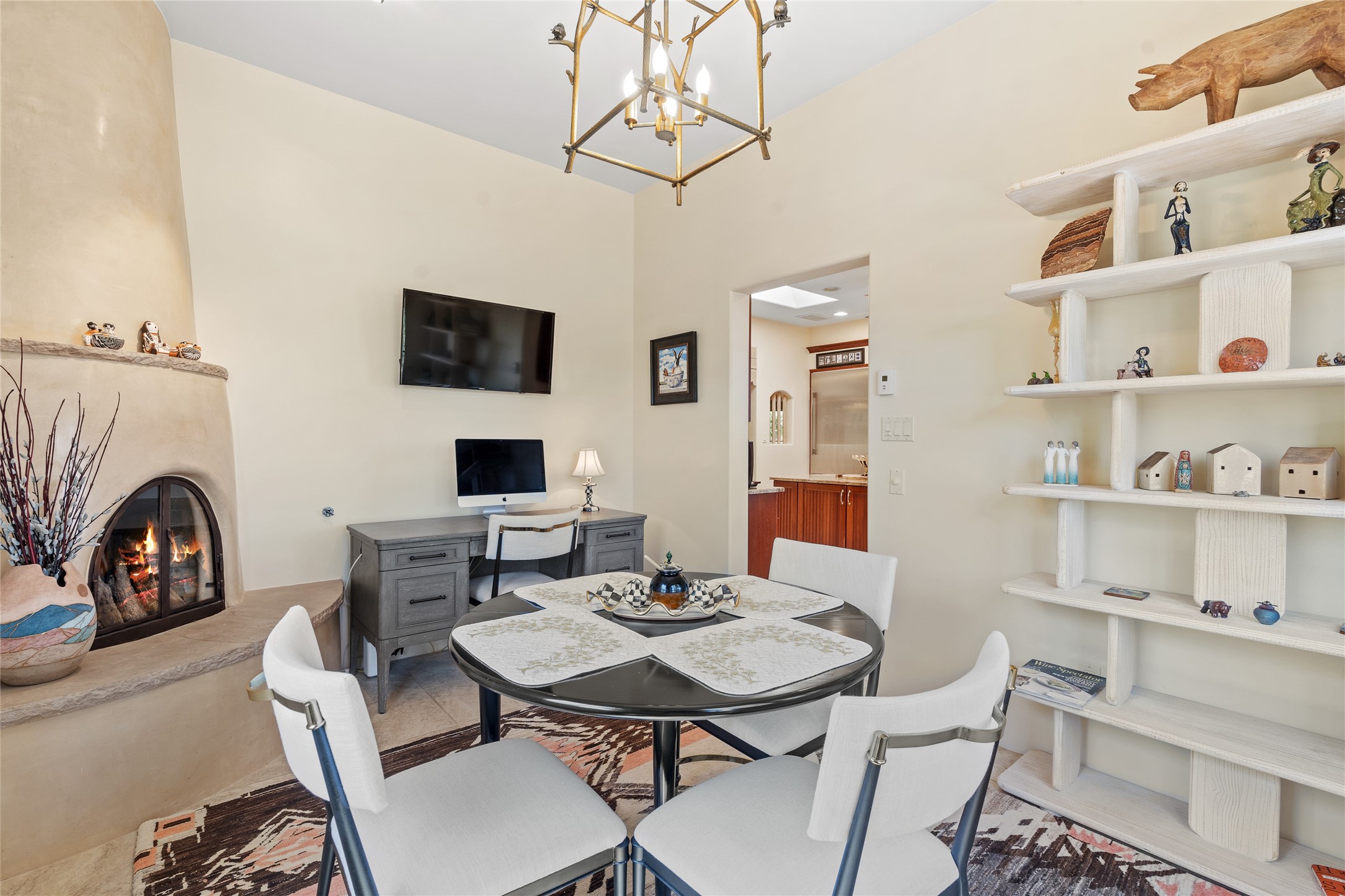 Elegance meets versatility in Santa Fe's much desired Aldea community. This refined, single-level home with a guest-ready casita truly delivers. Traditional Santa Fe-style architecture perfectly complements the artfully designed interior, offering a seamless fusion of style, comfort, and flexibility. The main house feature 3,284 +/- sqft of living space and includes three bedrooms plus a bonus media room or den, perfect for entertainment, lounging, studio or work from home needs. The chef's kitchen is polished and offers incredible functionality with recently installed Thermador appliances, a spacious informal dining nook and pantry storage. The primary suite is luxurious and only one of several tasteful retreats offered by this thoughtful floorplan. Two guest bedrooms, a large laundry/mudroom, and oversized two-car garage balance form with function. The one bedroom casita is accessed from the central courtyard and is equipped with a comfortable living space, gas burning fireplace and private kitchen area-the perfect space to host friends and family. Up an exterior flight of stairs is the rooftop deck which features 360-degree views of the Sangre de Cristo, Jemez, and Sandia mountain ranges. Outside living areas are well manicured, yet low-maintenance, and are watered by a 4-zone irrigation system. Aldea is a vibrant, active community with miles of walking trails, a community center, and other amenities-all just 15 minutes from downtown Santa Fe. ***A comprehensive list of recent improvements and complete furniture package is available upon request. ***