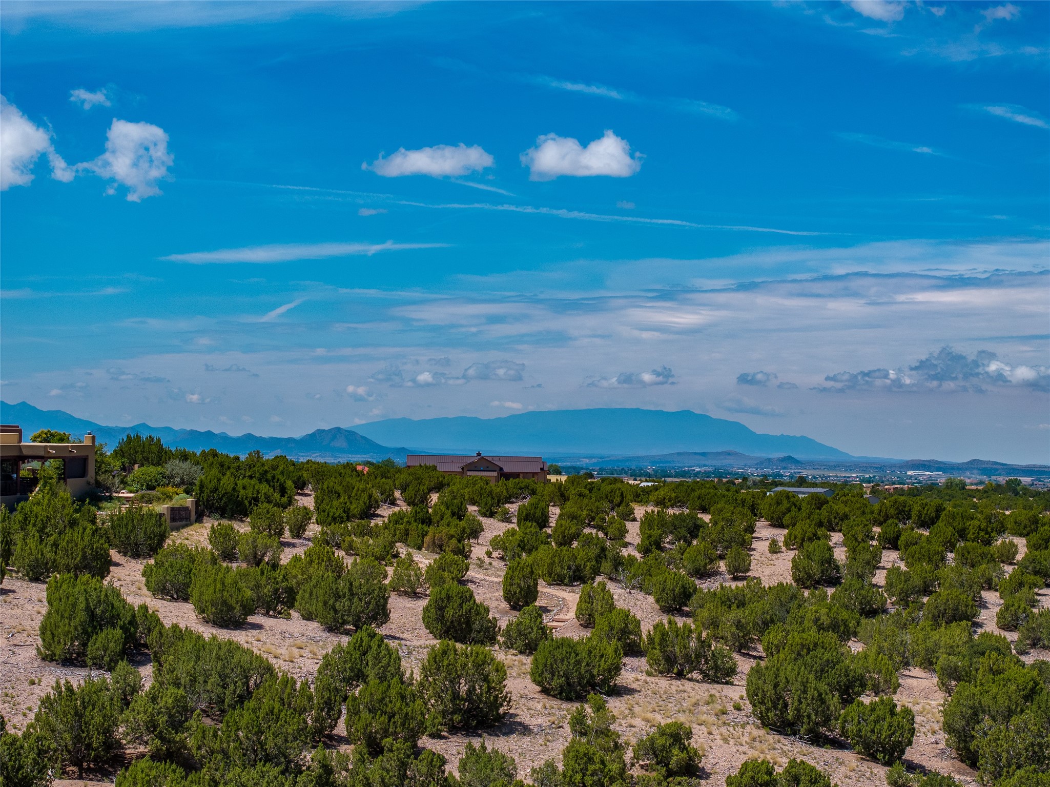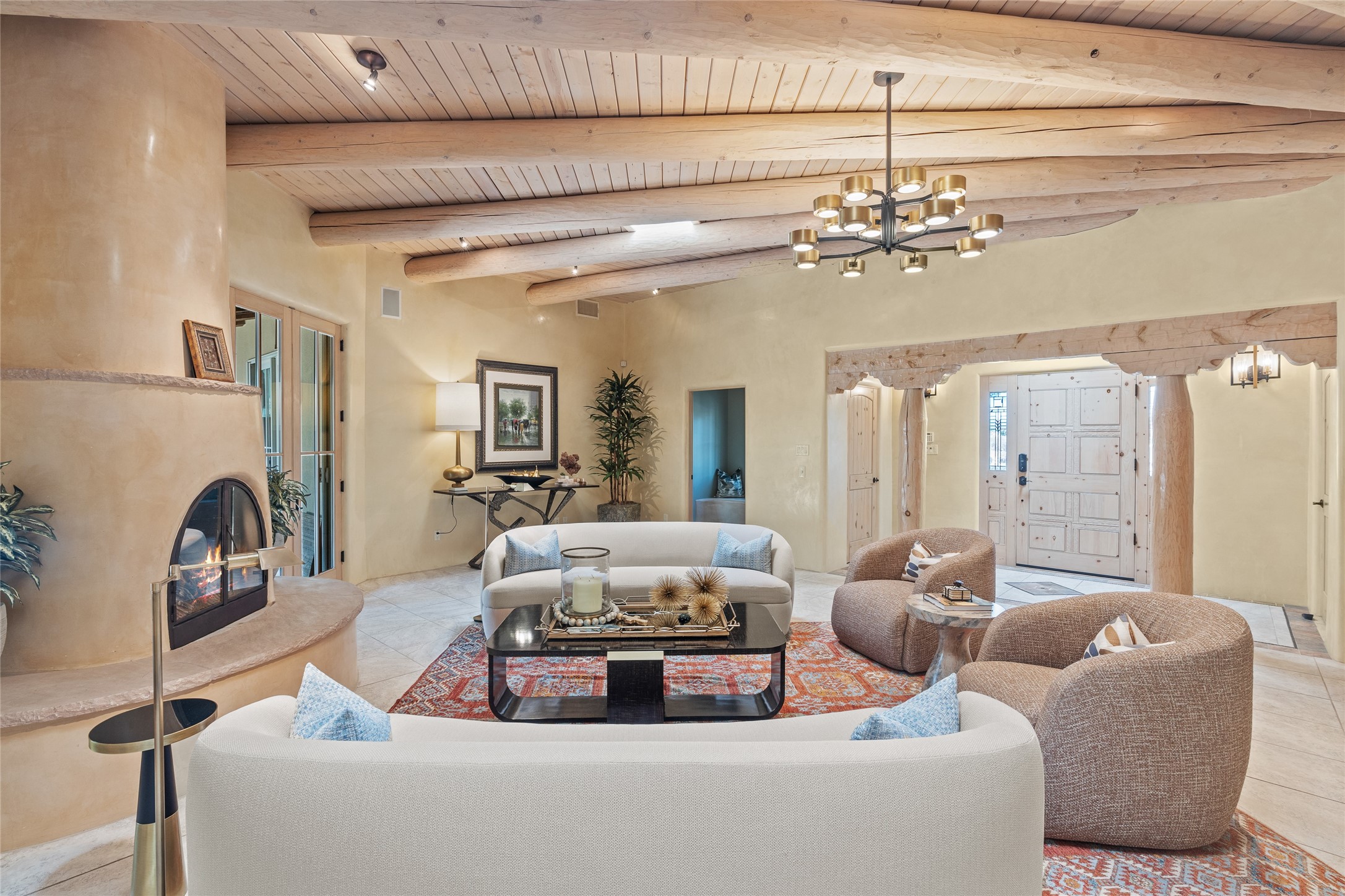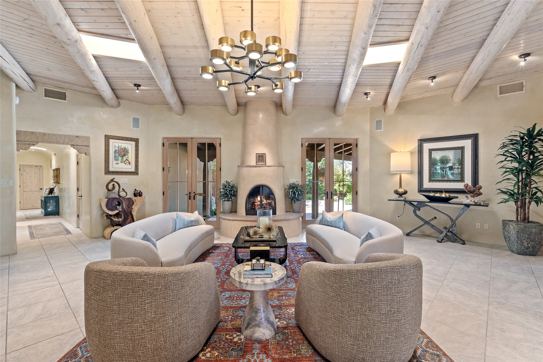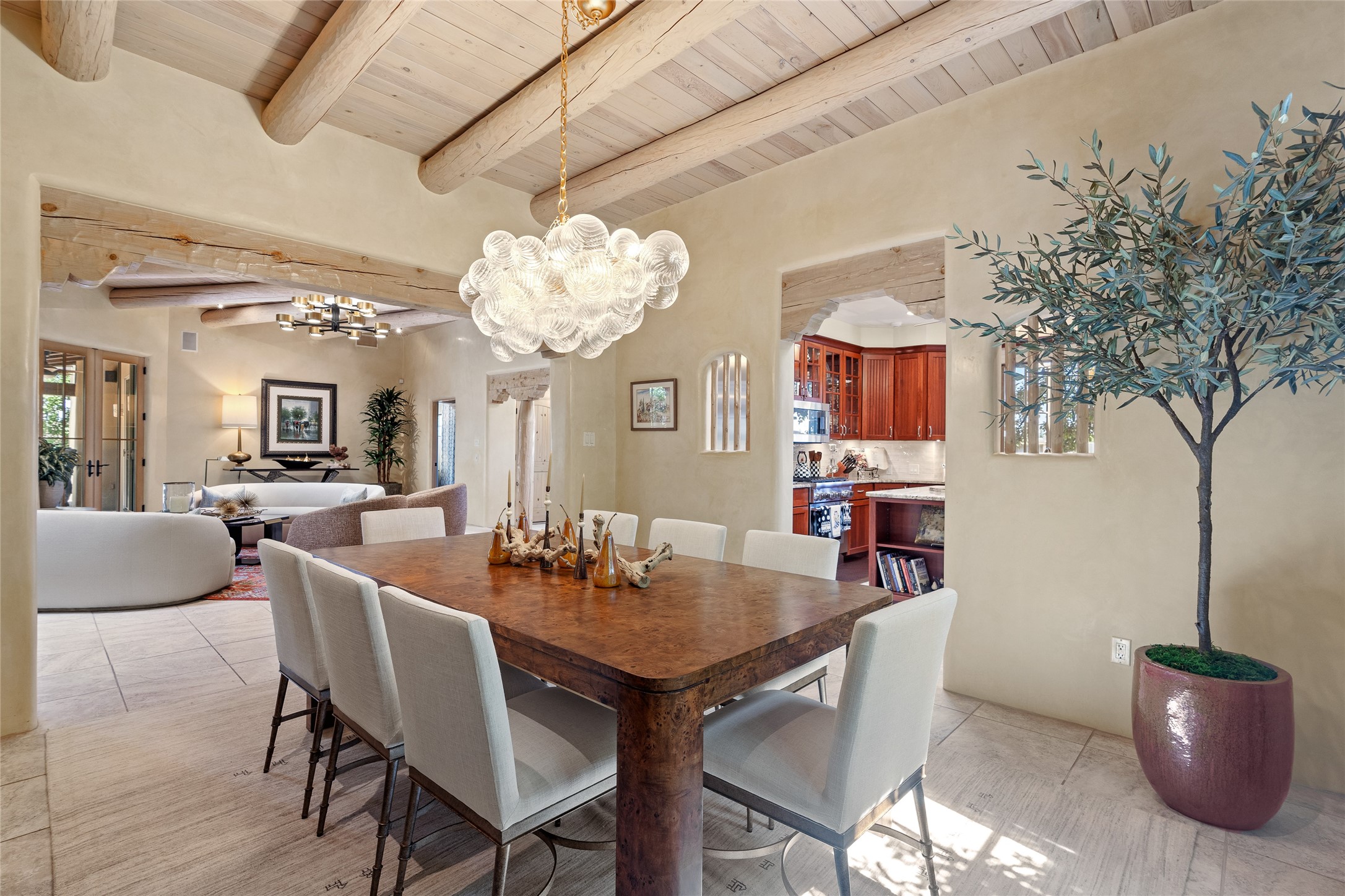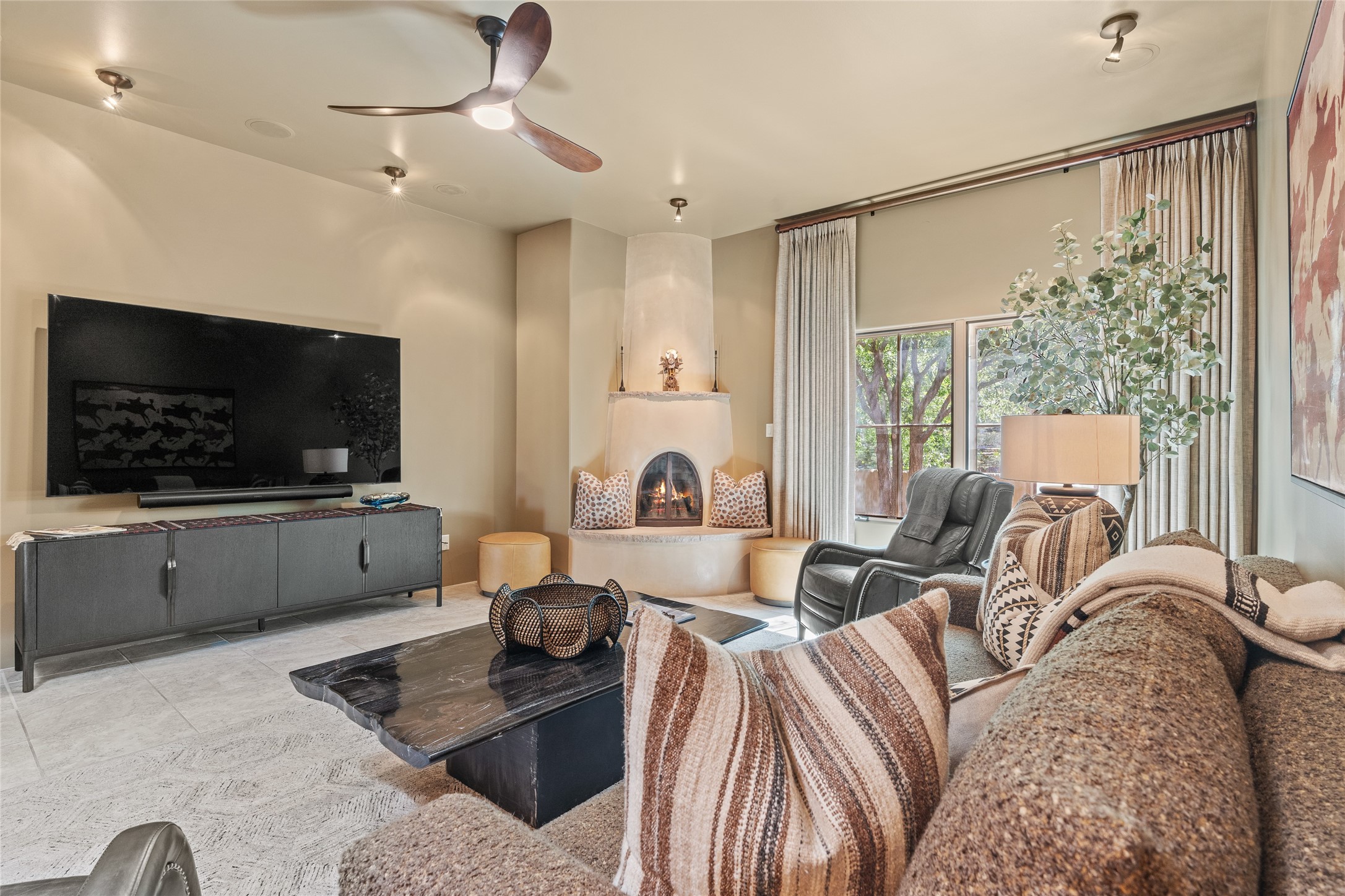 Elegance meets versatility in Santa Fe's much desired Aldea community. This refined, single-level home with a guest-ready casita truly delivers. Traditional Santa Fe-style architecture perfectly complements the artfully designed interior, offering a seamless fusion of style, comfort, and flexibility. The main house feature 3,284 +/- sqft of living space and includes three bedrooms plus a bonus media room or den, perfect for entertainment, lounging, studio or work from home needs. The chef's kitchen is polished and offers incredible functionality with recently installed Thermador appliances, a spacious informal dining nook and pantry storage. The primary suite is luxurious and only one of several tasteful retreats offered by this thoughtful floorplan. Two guest bedrooms, a large laundry/mudroom, and oversized two-car garage balance form with function. The one bedroom casita is accessed from the central courtyard and is equipped with a comfortable living space, gas burning fireplace and private kitchen area-the perfect space to host friends and family. Up an exterior flight of stairs is the rooftop deck which features 360-degree views of the Sangre de Cristo, Jemez, and Sandia mountain ranges. Outside living areas are well manicured, yet low-maintenance, and are watered by a 4-zone irrigation system. Aldea is a vibrant, active community with miles of walking trails, a community center, and other amenities-all just 15 minutes from downtown Santa Fe. ***A comprehensive list of recent improvements and complete furniture package is available upon request. ***