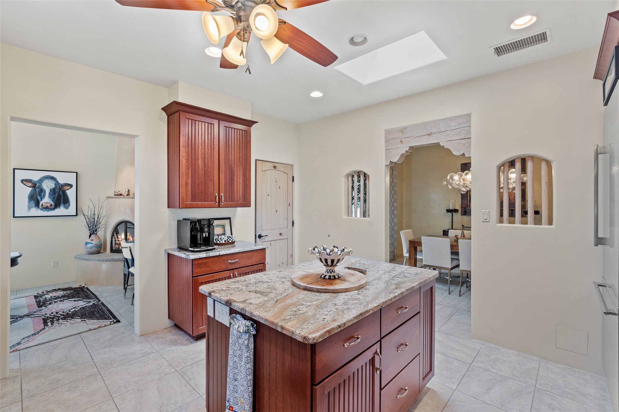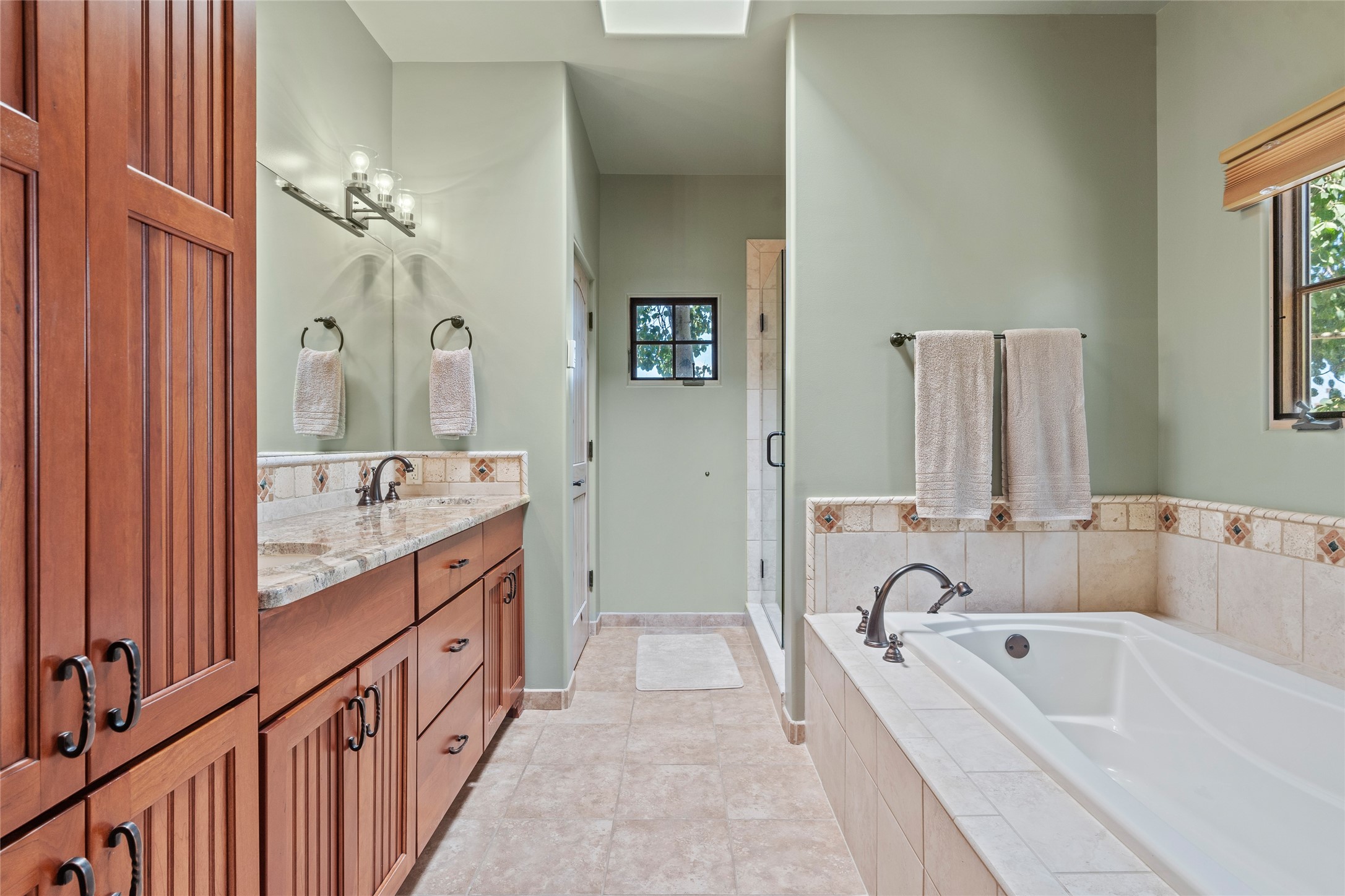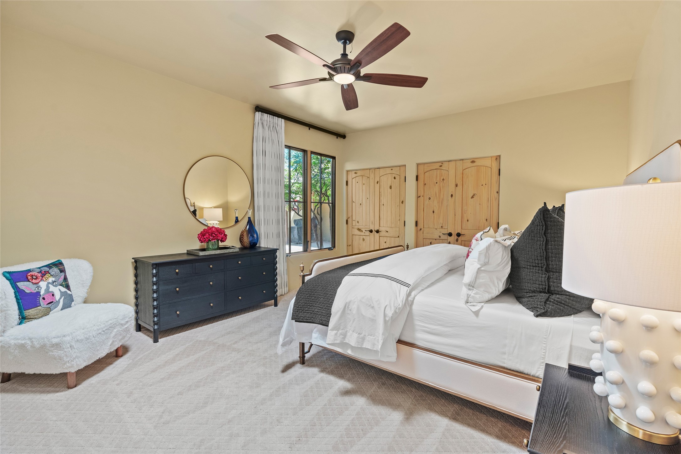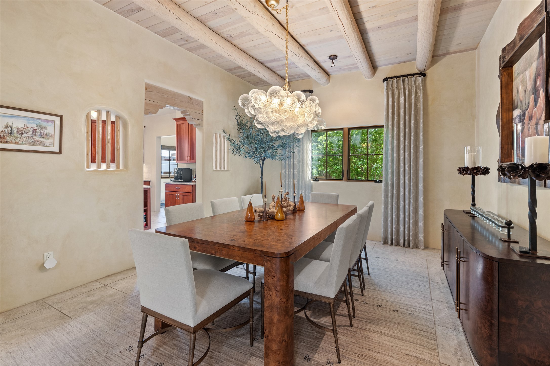 Elegance meets versatility in Santa Fe's much desired Aldea community. This refined, single-level home with a guest-ready casita truly delivers. Traditional Santa Fe-style architecture perfectly complements the artfully designed interior, offering a seamless fusion of style, comfort, and flexibility. The main house feature 3,284 +/- sqft of living space and includes three bedrooms plus a bonus media room or den, perfect for entertainment, lounging, studio or work from home needs. The chef's kitchen is polished and offers incredible functionality with recently installed Thermador appliances, a spacious informal dining nook and pantry storage. The primary suite is luxurious and only one of several tasteful retreats offered by this thoughtful floorplan. Two guest bedrooms, a large laundry/mudroom, and oversized two-car garage balance form with function. The one bedroom casita is accessed from the central courtyard and is equipped with a comfortable living space, gas burning fireplace and private kitchen area-the perfect space to host friends and family. Up an exterior flight of stairs is the rooftop deck which features 360-degree views of the Sangre de Cristo, Jemez, and Sandia mountain ranges. Outside living areas are well manicured, yet low-maintenance, and are watered by a 4-zone irrigation system. Aldea is a vibrant, active community with miles of walking trails, a community center, and other amenities-all just 15 minutes from downtown Santa Fe. ***A comprehensive list of recent improvements and complete furniture package is available upon request. ***