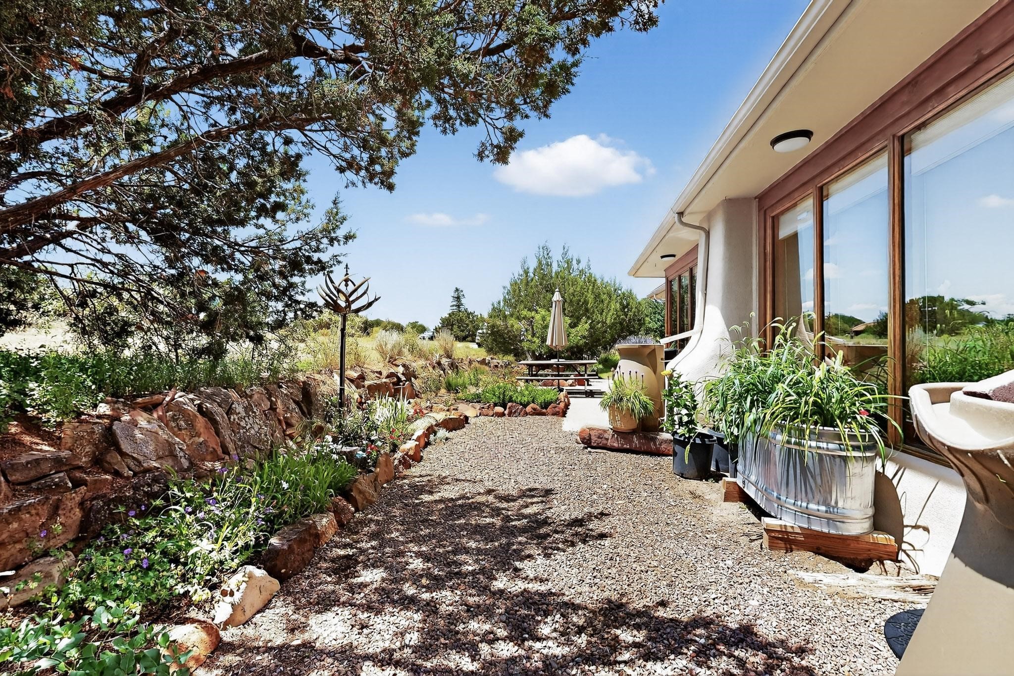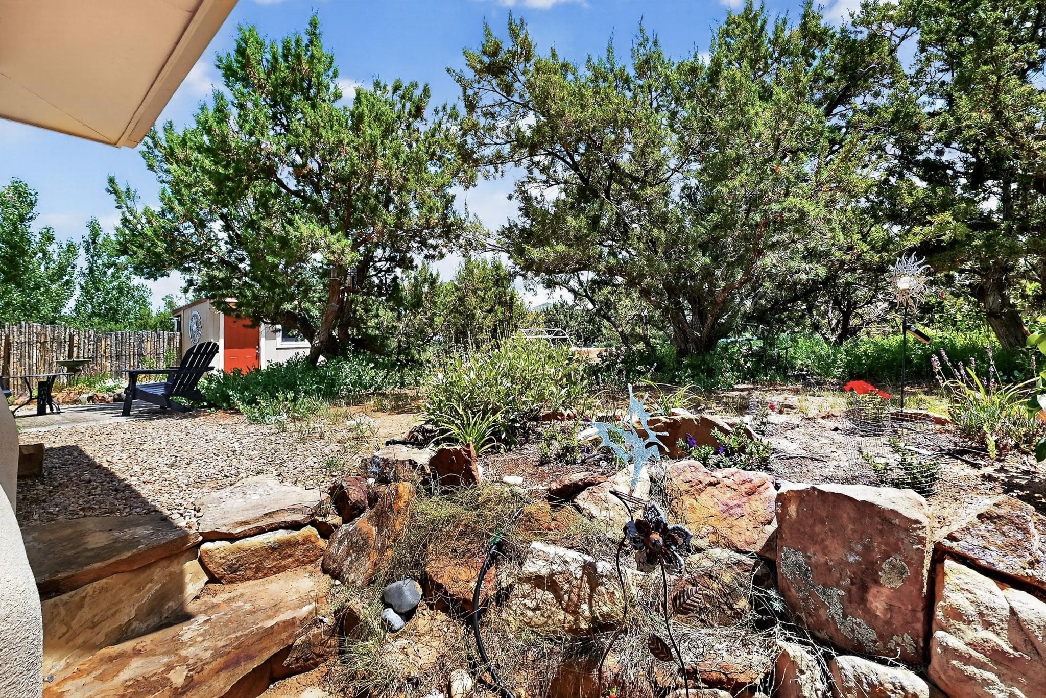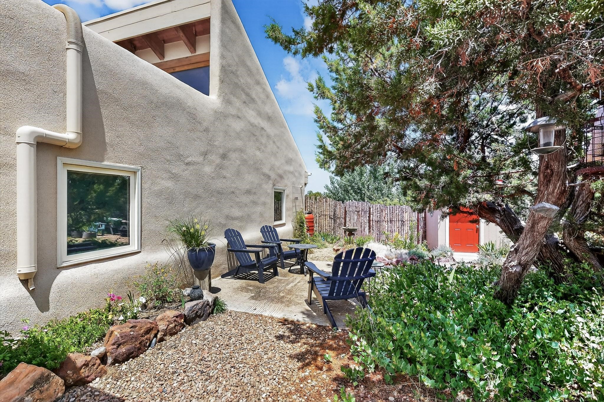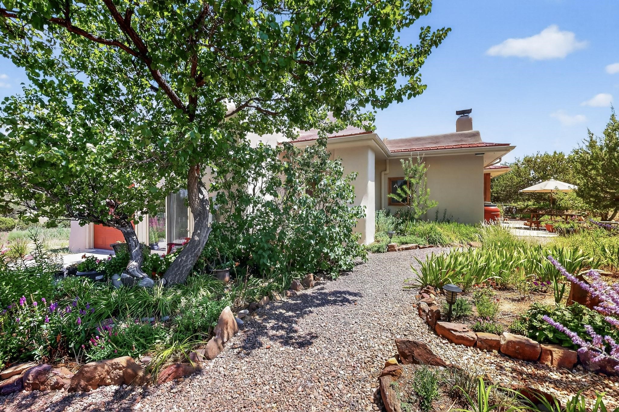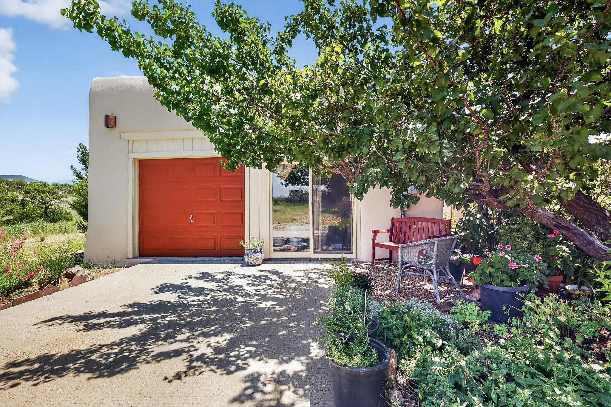 Surrounded by lush perennial gardens, sitting back from the road this lovely traditional pueblo home built by R.J. McMillan in 1984 provides a private oasis. Many upgrades have enhanced it including a new roof in 2015 maintained annually, electric baseboard heating with Daikin mini splits in 2022, reroofed the pitched area with propanel in 2021, reroofed the overhangs with new rain gutters, mostly new windows, upgraded kitchen and appliances in 2023 and new stucco in 2024. Delightful Santa Fe style details creating an ambient charm throughout, even vigas in the garage. The garage currently has a glass door not a garage door on one side, as it was used as a studio. A garden shed, plus productive raised beds, and on the greenbelt, this lovingly maintained home and gardens is special. Close to Eldorado amenities, local shopping, schools, library and senior center, it is only minutes into Santa Fe.