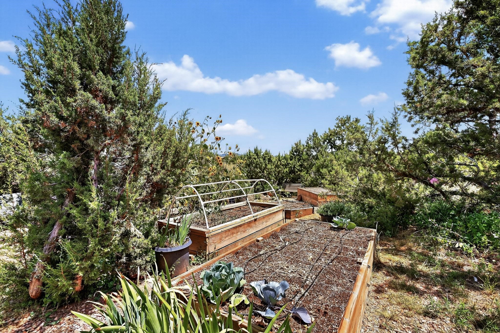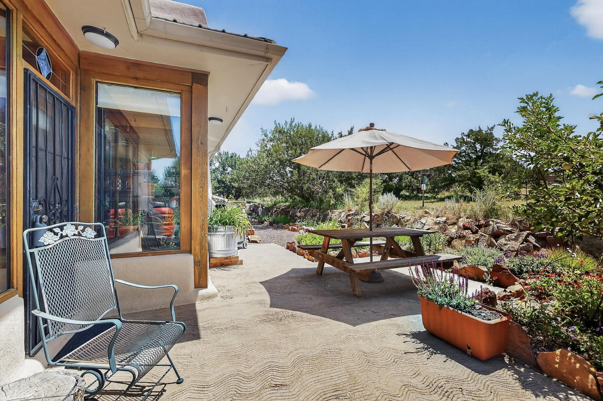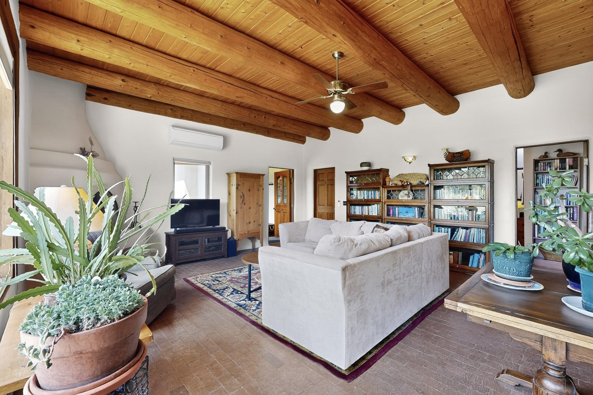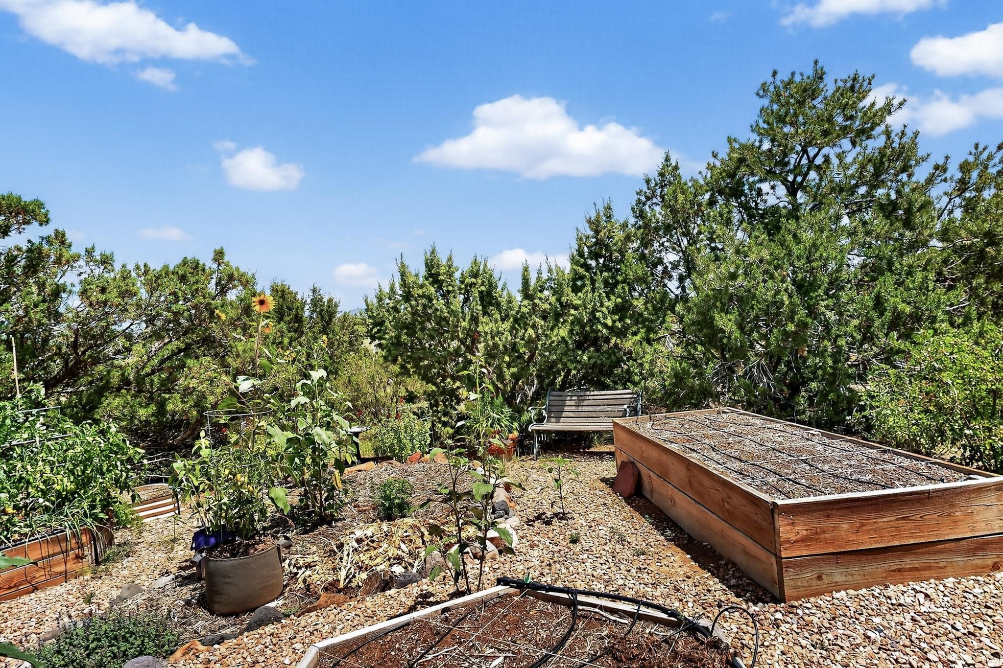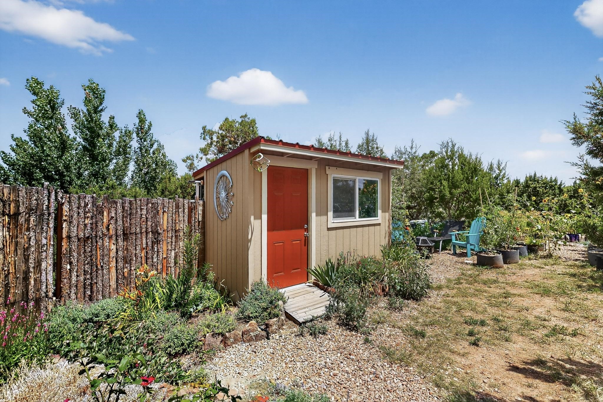 Surrounded by lush perennial gardens, sitting back from the road this lovely traditional pueblo home built by R.J. McMillan in 1984 provides a private oasis. Many upgrades have enhanced it including a new roof in 2015 maintained annually, electric baseboard heating with Daikin mini splits in 2022, reroofed the pitched area with propanel in 2021, reroofed the overhangs with new rain gutters, mostly new windows, upgraded kitchen and appliances in 2023 and new stucco in 2024. Delightful Santa Fe style details creating an ambient charm throughout, even vigas in the garage. The garage currently has a glass door not a garage door on one side, as it was used as a studio. A garden shed, plus productive raised beds, and on the greenbelt, this lovingly maintained home and gardens is special. Close to Eldorado amenities, local shopping, schools, library and senior center, it is only minutes into Santa Fe.