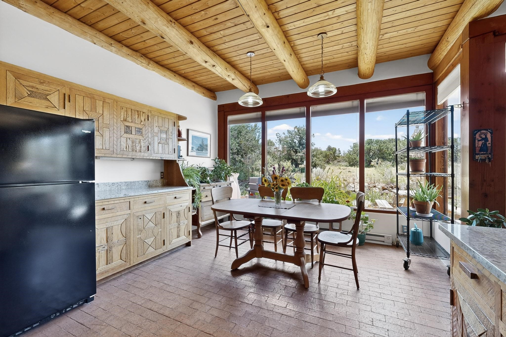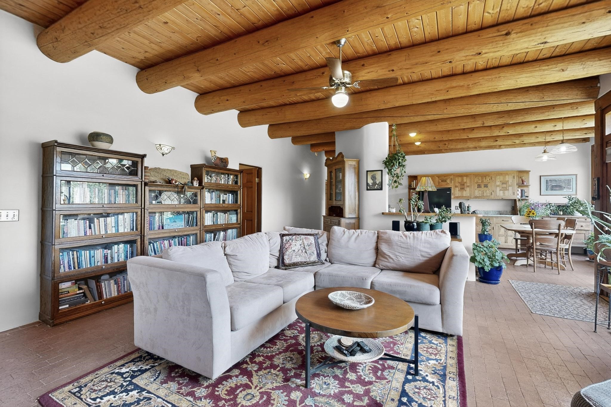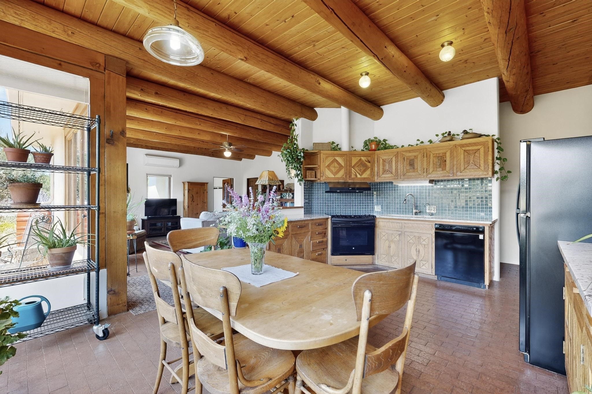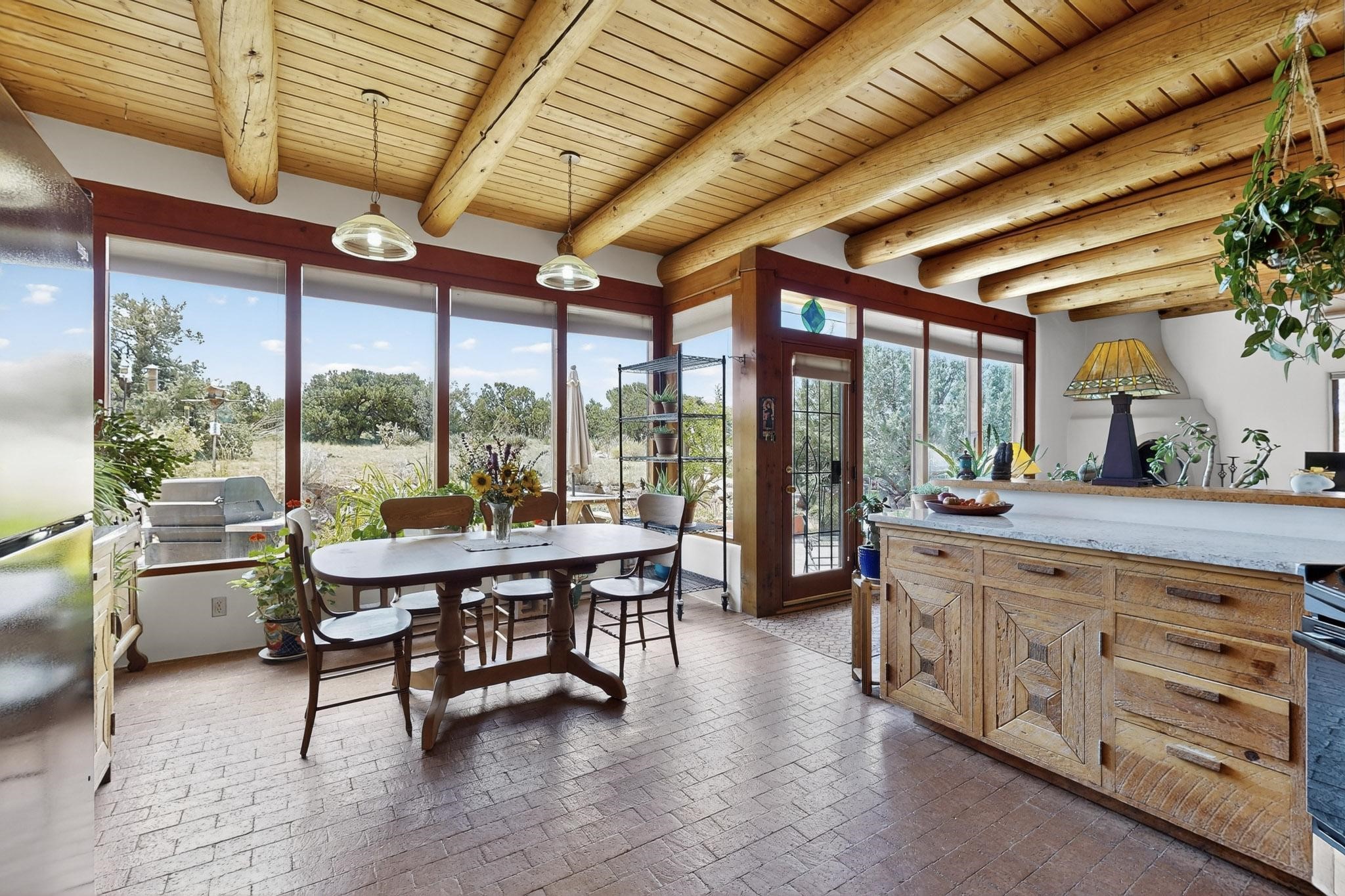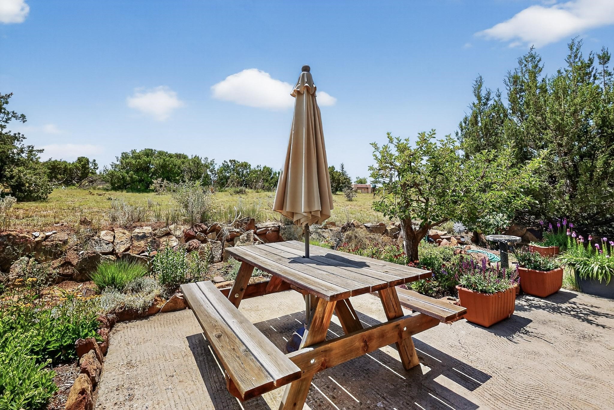 Surrounded by lush perennial gardens, sitting back from the road this lovely traditional pueblo home built by R.J. McMillan in 1984 provides a private oasis. Many upgrades have enhanced it including a new roof in 2015 maintained annually, electric baseboard heating with Daikin mini splits in 2022, reroofed the pitched area with propanel in 2021, reroofed the overhangs with new rain gutters, mostly new windows, upgraded kitchen and appliances in 2023 and new stucco in 2024. Delightful Santa Fe style details creating an ambient charm throughout, even vigas in the garage. The garage currently has a glass door not a garage door on one side, as it was used as a studio. A garden shed, plus productive raised beds, and on the greenbelt, this lovingly maintained home and gardens is special. Close to Eldorado amenities, local shopping, schools, library and senior center, it is only minutes into Santa Fe.