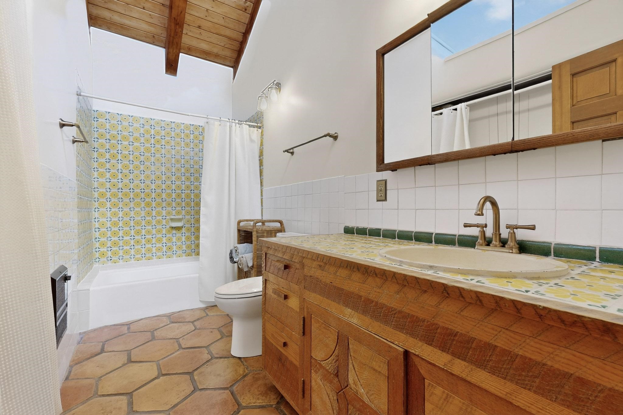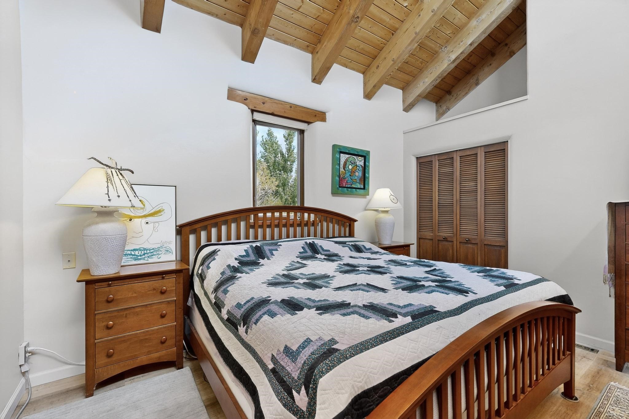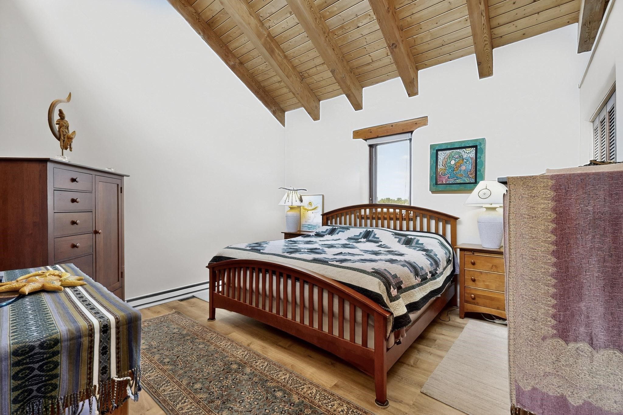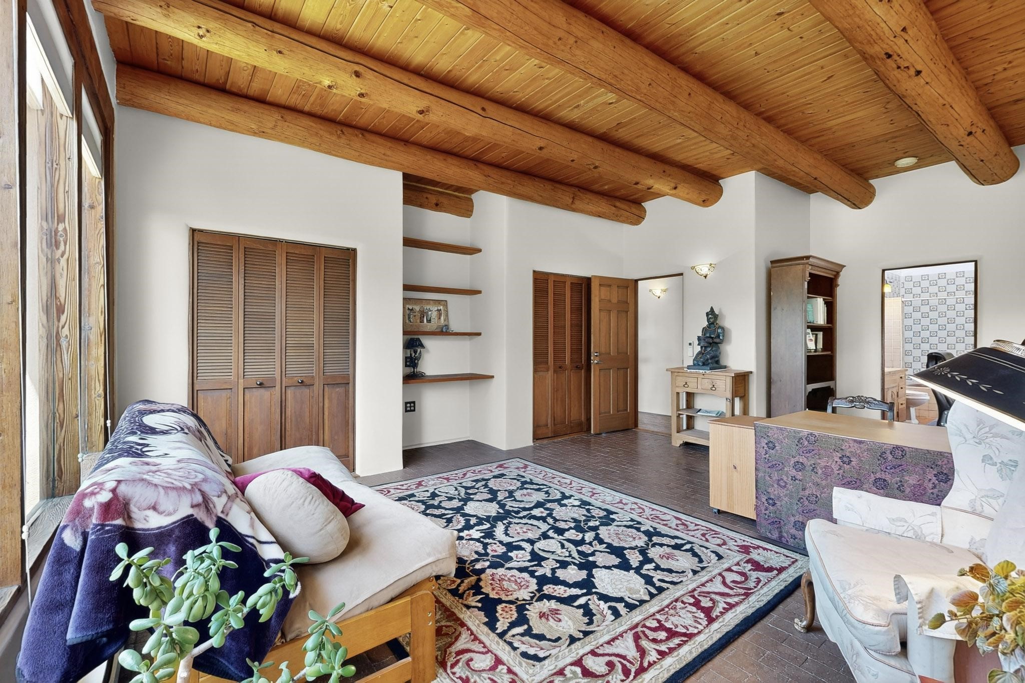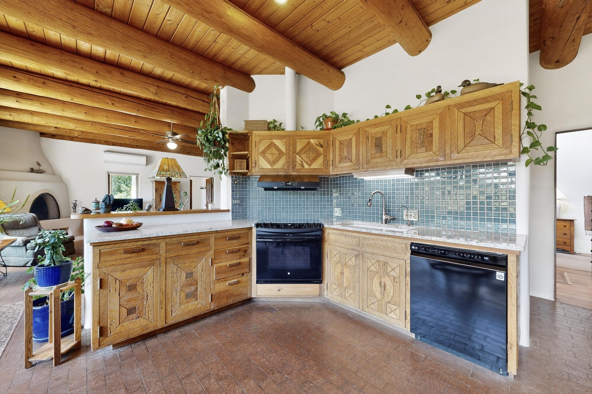 Surrounded by lush perennial gardens, sitting back from the road this lovely traditional pueblo home built by R.J. McMillan in 1984 provides a private oasis. Many upgrades have enhanced it including a new roof in 2015 maintained annually, electric baseboard heating with Daikin mini splits in 2022, reroofed the pitched area with propanel in 2021, reroofed the overhangs with new rain gutters, mostly new windows, upgraded kitchen and appliances in 2023 and new stucco in 2024. Delightful Santa Fe style details creating an ambient charm throughout, even vigas in the garage. The garage currently has a glass door not a garage door on one side, as it was used as a studio. A garden shed, plus productive raised beds, and on the greenbelt, this lovingly maintained home and gardens is special. Close to Eldorado amenities, local shopping, schools, library and senior center, it is only minutes into Santa Fe.