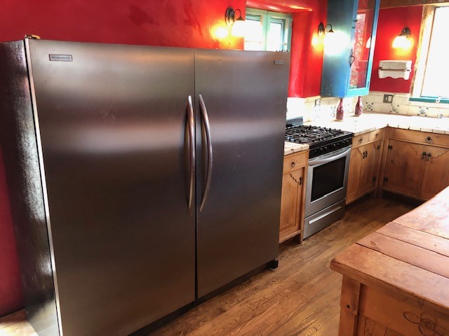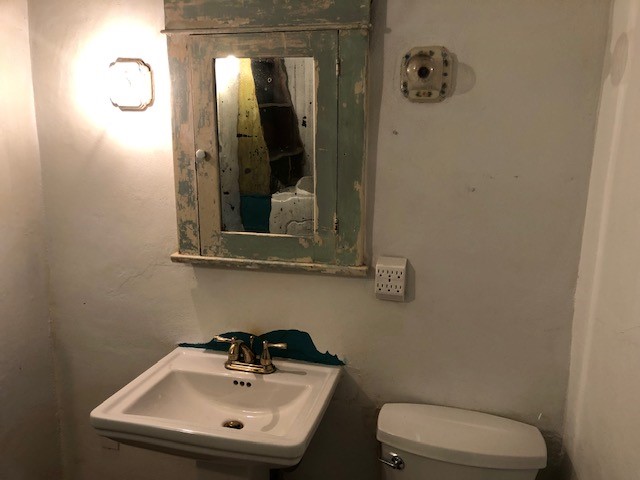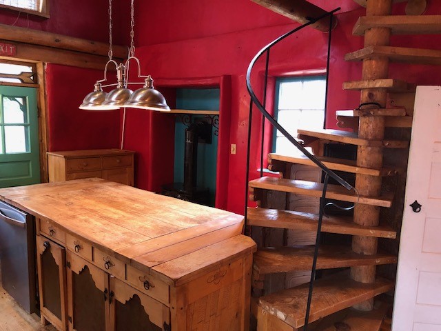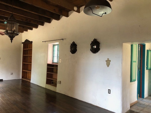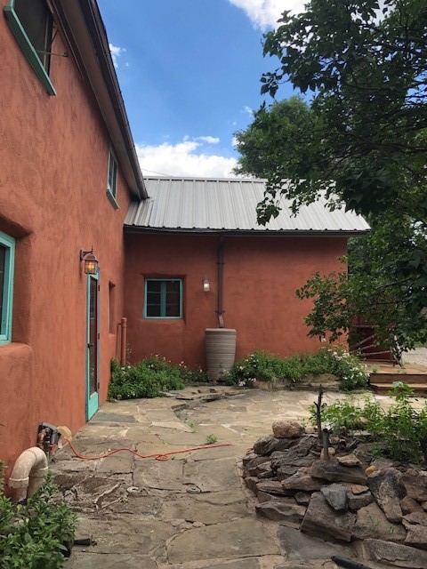 This one-of-a-kind adobe house has a fascinating history. It was built as a "bounty house" after the Civil War: soldiers could have a piece of land for free if they built a certain minimum size house on it. The bounty house is the living room of this house - a large room with wood floor and high ceiling made of vigas and latillas. With a red enamel gas stove at the far end, a built-in bookcase near the front door, and Mexican light fixtures, it is a charming entry to the house. The rest of the house was built onto this structure later and includes a bathroom with walk-in tub, a laundry area, and a large homey kitchen downstairs. The kitchen has a large 5-burner gas stove and large matching refrigerator and freezer. A spiral staircase leads upstairs to the bedroom, which has bathroom facilities in it (sink, toilet, and claw-foot tub), and a walk-in closet. The lot is 0.29 acres, green and lush and graced with large old trees. There is a large storage shed with slab floor and a couple of patios off the house. The whole property is walled or fenced, and there is an electric gate. Truly a special property.