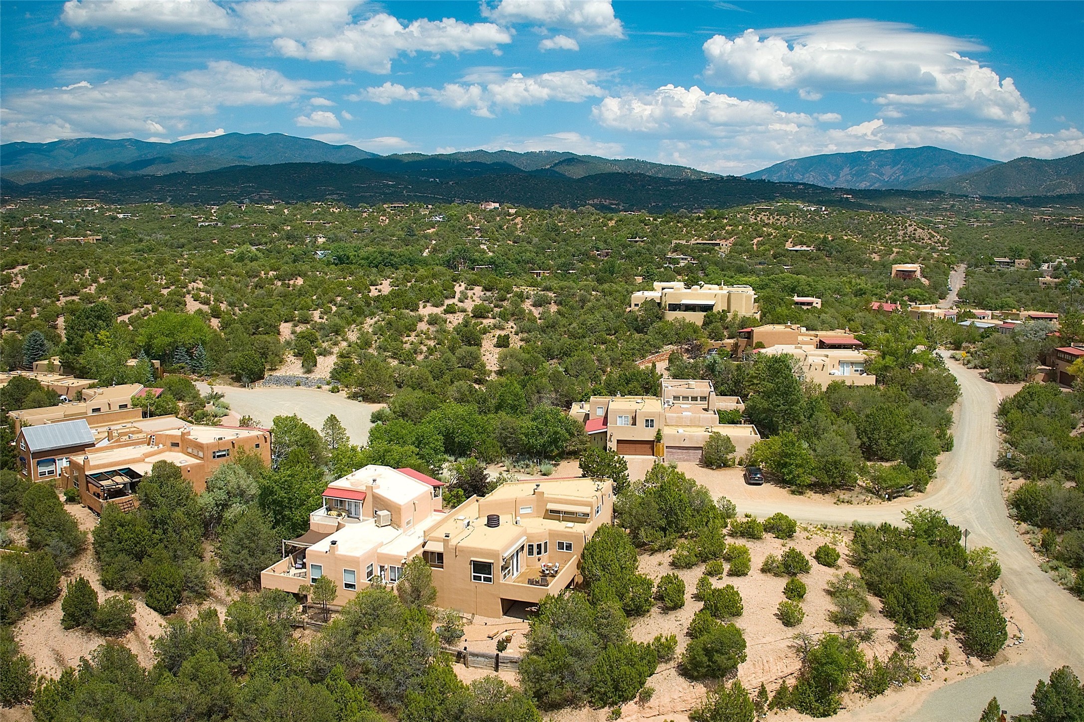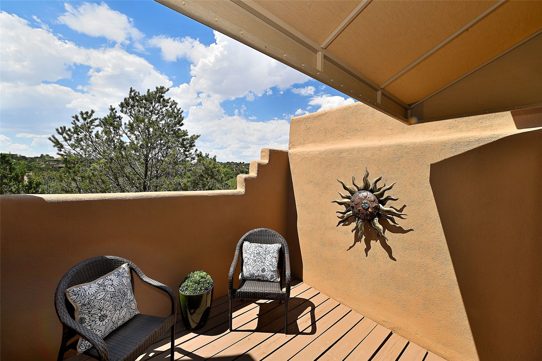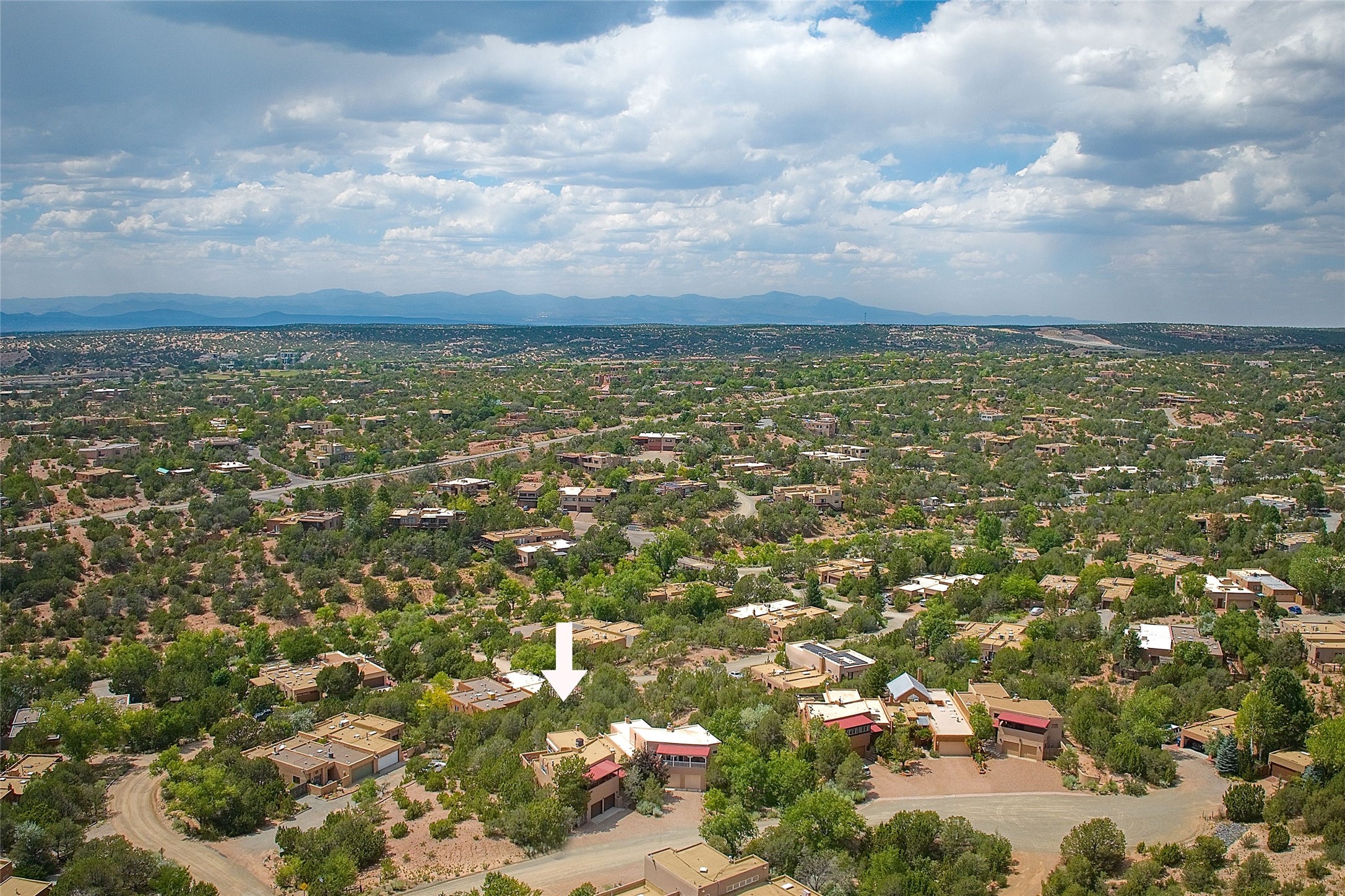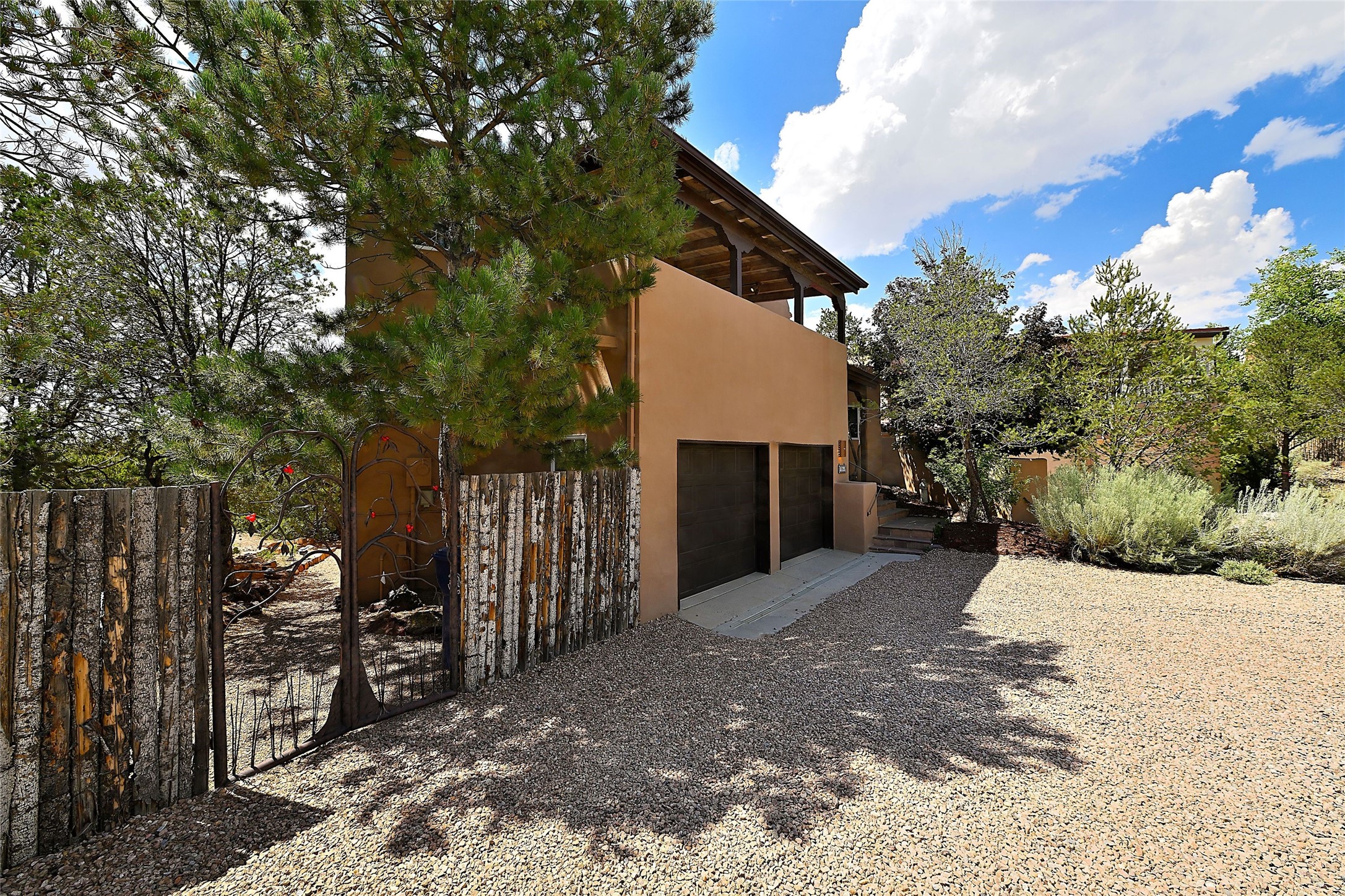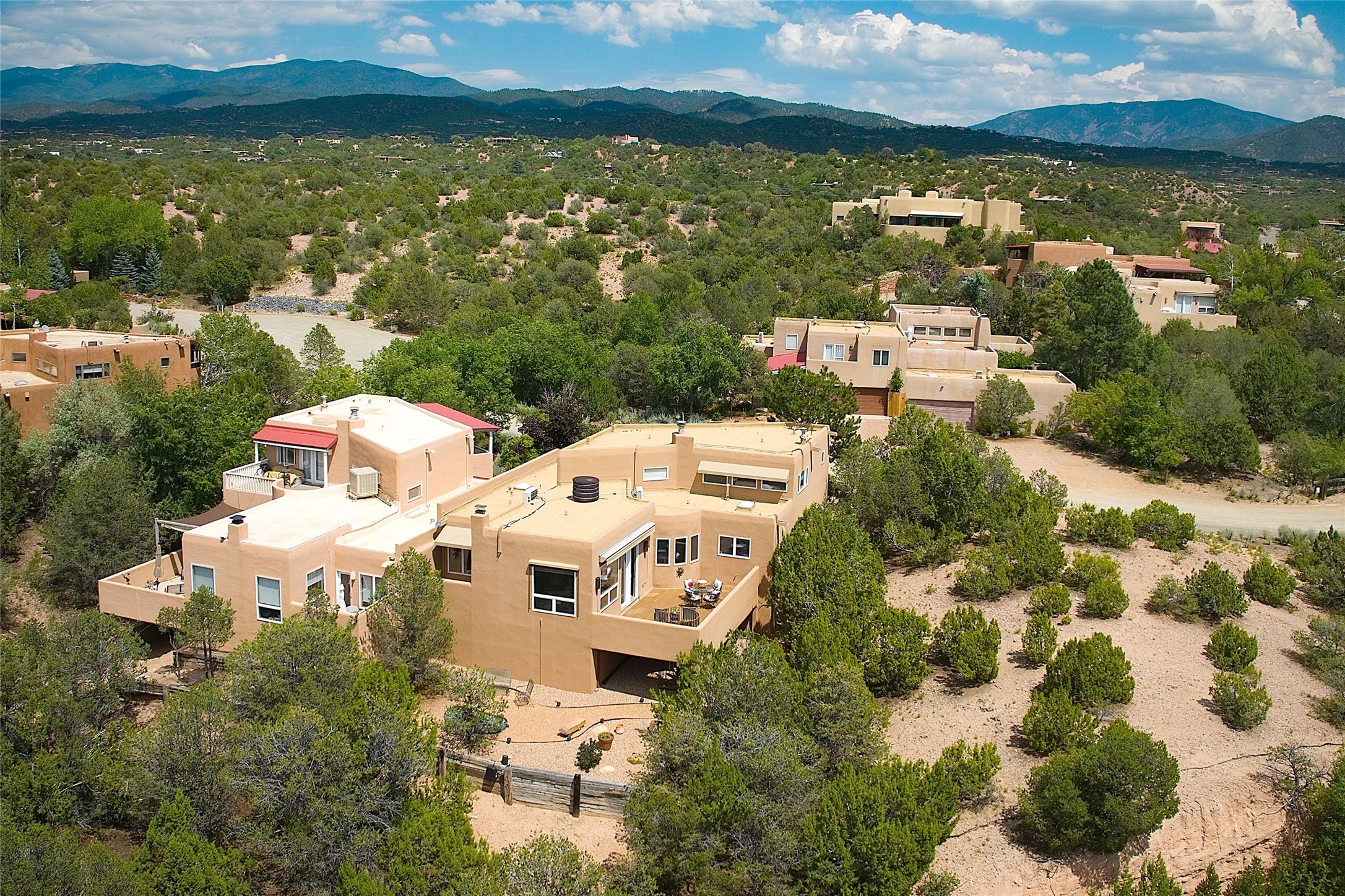 Welcome to this modern Santa Fe style townhome, with elegant upgrades, and outstanding mountain views.Ideally situated only five minutes from Santa Fe Plaza and close to Ft. Marcy Park with its recreation center,dog park and pickle ball courts, this residence combines comfort, style and an unbeatable location in thedesirable Valle del Sol neighborhood. Step through a beautifully carved wood front door into a bright entrywith clerestory windows. The open floor plan features a spacious, light-filled great room, boasting largepicture windows that frame dramatic foothill views, ceiling beams, and a wood-burning kiva fireplace. Theliving room opens conveniently to a generous deck with views to the Sandia and Ortiz Mountains, andfeatures a spiral staircase down to the back gardens and fountain. These spaces are perfect for entertainingand enjoying stunning sunsets. On the main floor, are a second bedroom with a remodeled CaliforniaCloset, which opens to its own private deck, and a third bedroom, featuring built-in bookcases, which couldalso be used as an office, studio or guest space. The fully remodeled kitchen features a skylight, quartzitecountertops, Bosch appliances and custom cabinetry. There is a large adjacent breakfast nook with bancoseating and views. On its own private level, the primary suite is a true retreat with a wood-burning kivafireplace, custom California Closet, and comfortable sitting area, which opens to its own shaded and tranquildeck overlooking the Sangre de Cristo Mountains. This home has many upgrades including a new roof, waterheater, Fibron deck, exterior paint, garage doors, Hunter Douglas blackout blinds, and more. Enjoy ease ofliving with a separate laundry room, pantry, large storage closet and oversized 2-car garage. Home includesclimate control with mini-splits and forced air heat. This is an exceptional find for those seeking views,privacy, and proximity to downtown Santa Fe and all it has to offer!
