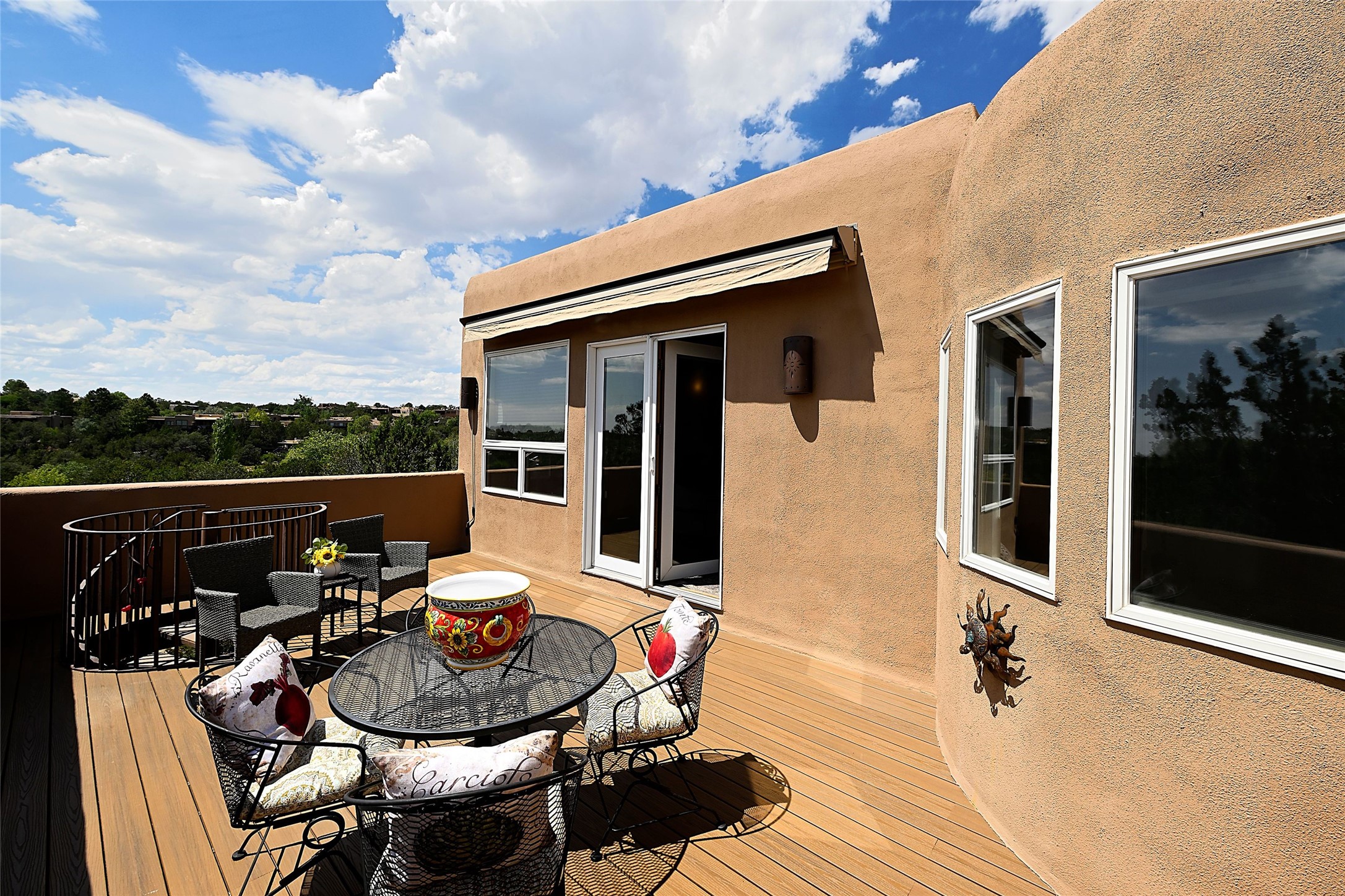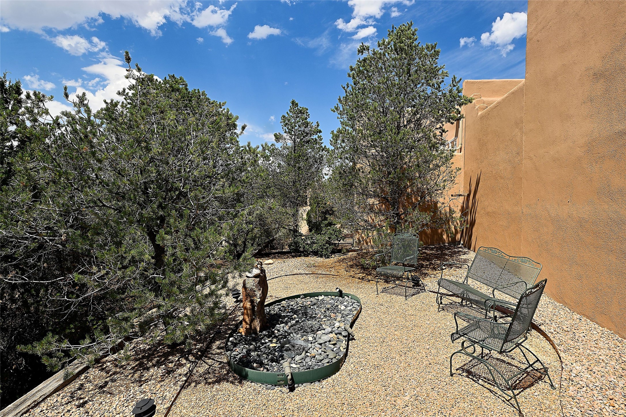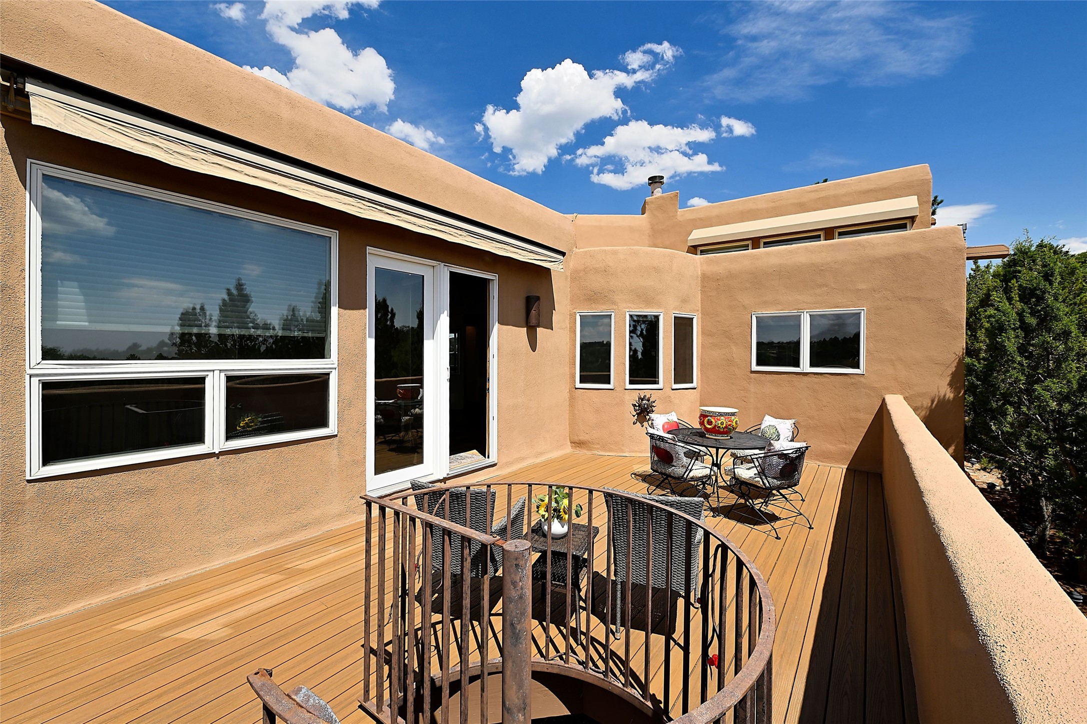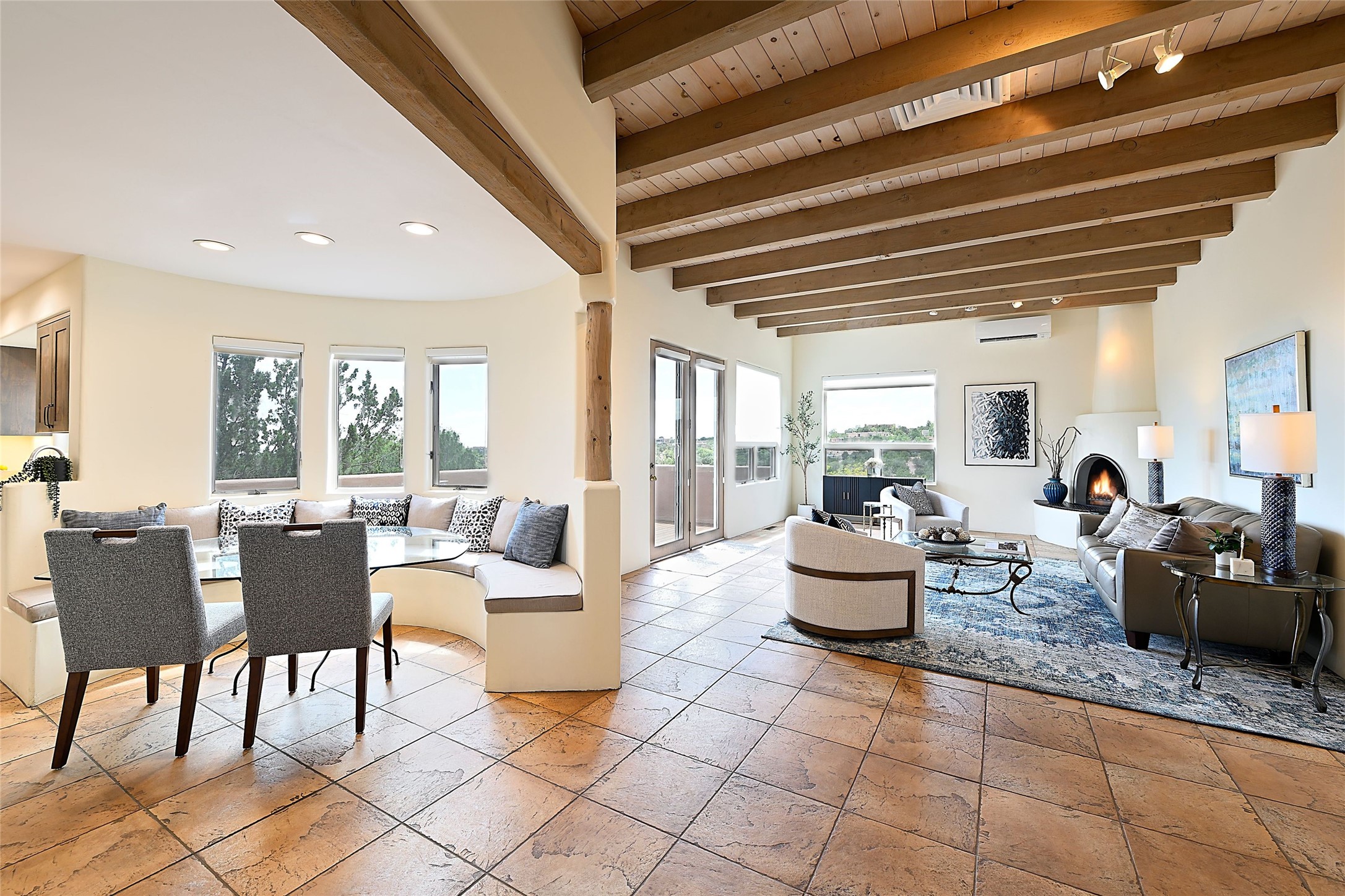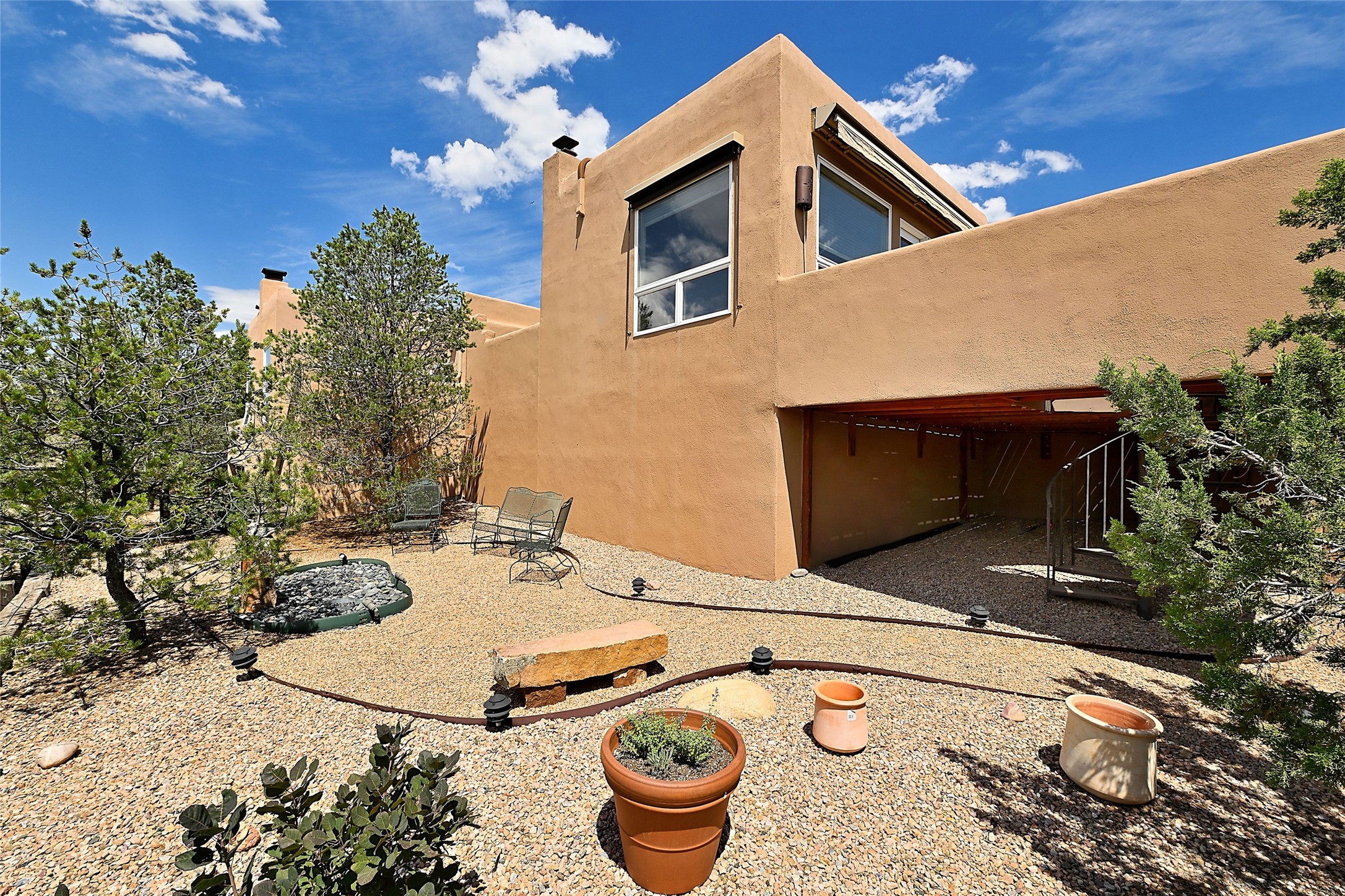 Welcome to this modern Santa Fe style townhome, with elegant upgrades, and outstanding mountain views.Ideally situated only five minutes from Santa Fe Plaza and close to Ft. Marcy Park with its recreation center,dog park and pickle ball courts, this residence combines comfort, style and an unbeatable location in thedesirable Valle del Sol neighborhood. Step through a beautifully carved wood front door into a bright entrywith clerestory windows. The open floor plan features a spacious, light-filled great room, boasting largepicture windows that frame dramatic foothill views, ceiling beams, and a wood-burning kiva fireplace. Theliving room opens conveniently to a generous deck with views to the Sandia and Ortiz Mountains, andfeatures a spiral staircase down to the back gardens and fountain. These spaces are perfect for entertainingand enjoying stunning sunsets. On the main floor, are a second bedroom with a remodeled CaliforniaCloset, which opens to its own private deck, and a third bedroom, featuring built-in bookcases, which couldalso be used as an office, studio or guest space. The fully remodeled kitchen features a skylight, quartzitecountertops, Bosch appliances and custom cabinetry. There is a large adjacent breakfast nook with bancoseating and views. On its own private level, the primary suite is a true retreat with a wood-burning kivafireplace, custom California Closet, and comfortable sitting area, which opens to its own shaded and tranquildeck overlooking the Sangre de Cristo Mountains. This home has many upgrades including a new roof, waterheater, Fibron deck, exterior paint, garage doors, Hunter Douglas blackout blinds, and more. Enjoy ease ofliving with a separate laundry room, pantry, large storage closet and oversized 2-car garage. Home includesclimate control with mini-splits and forced air heat. This is an exceptional find for those seeking views,privacy, and proximity to downtown Santa Fe and all it has to offer!