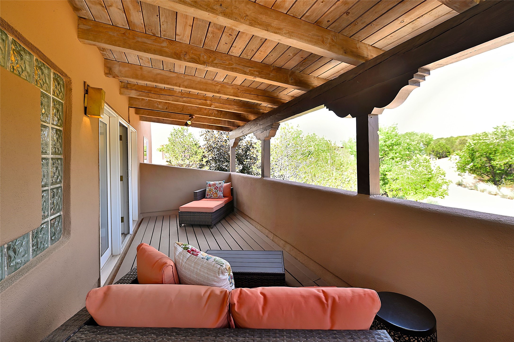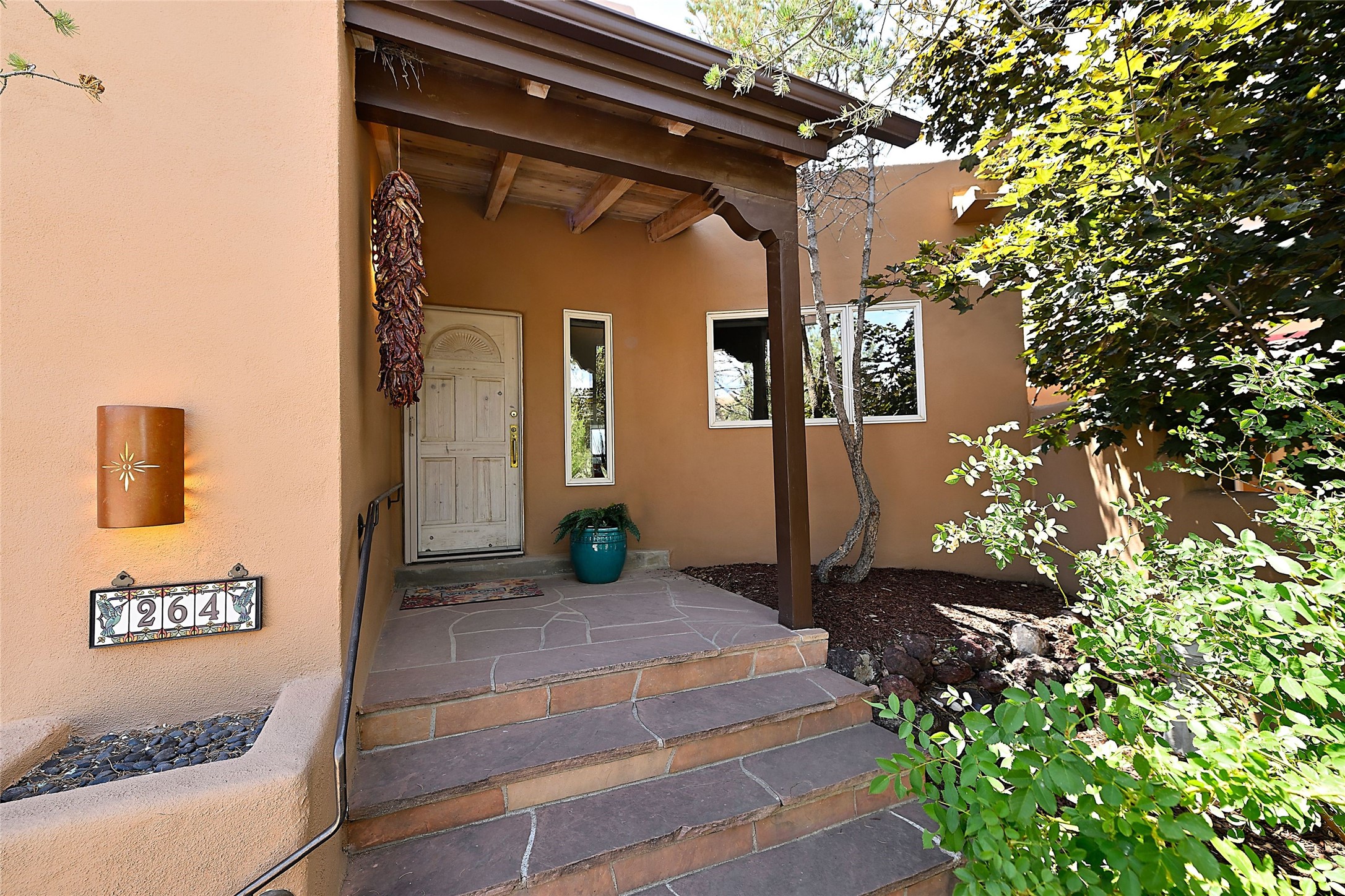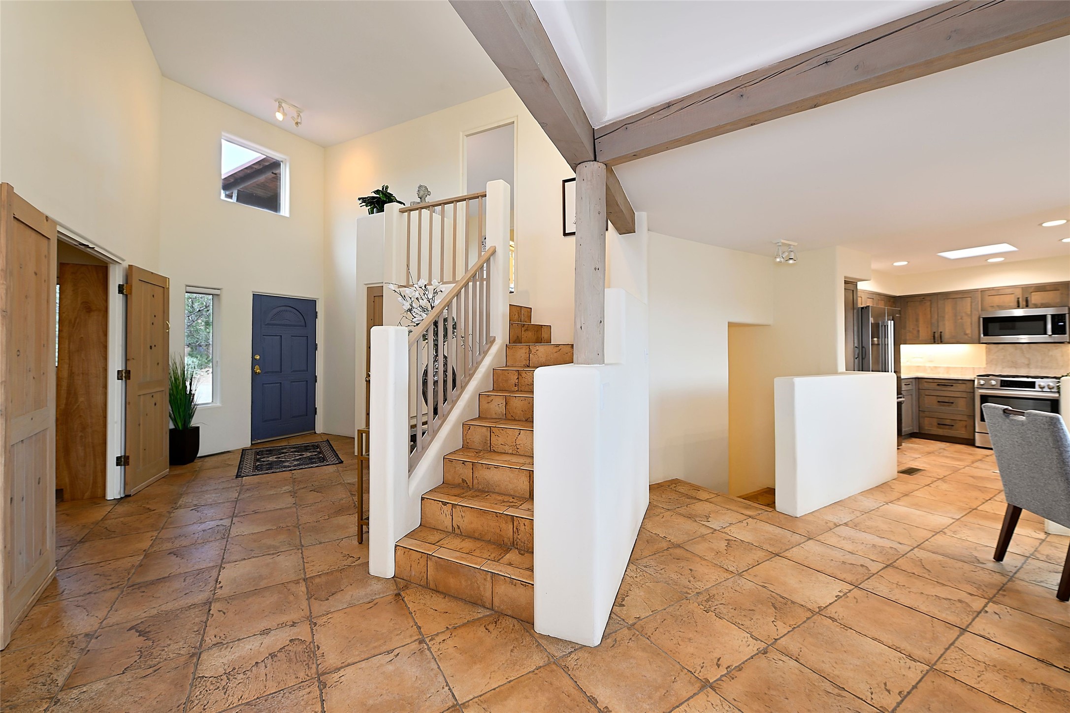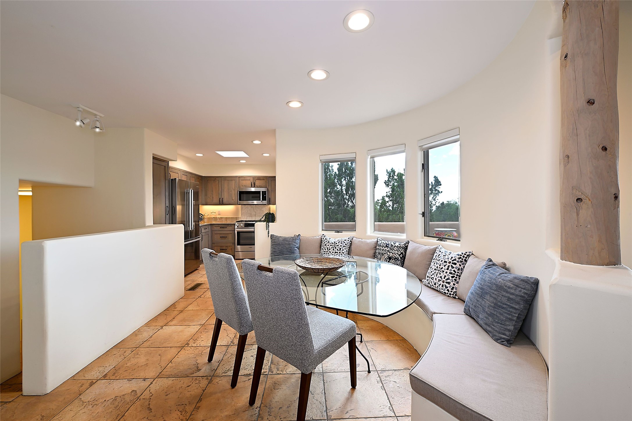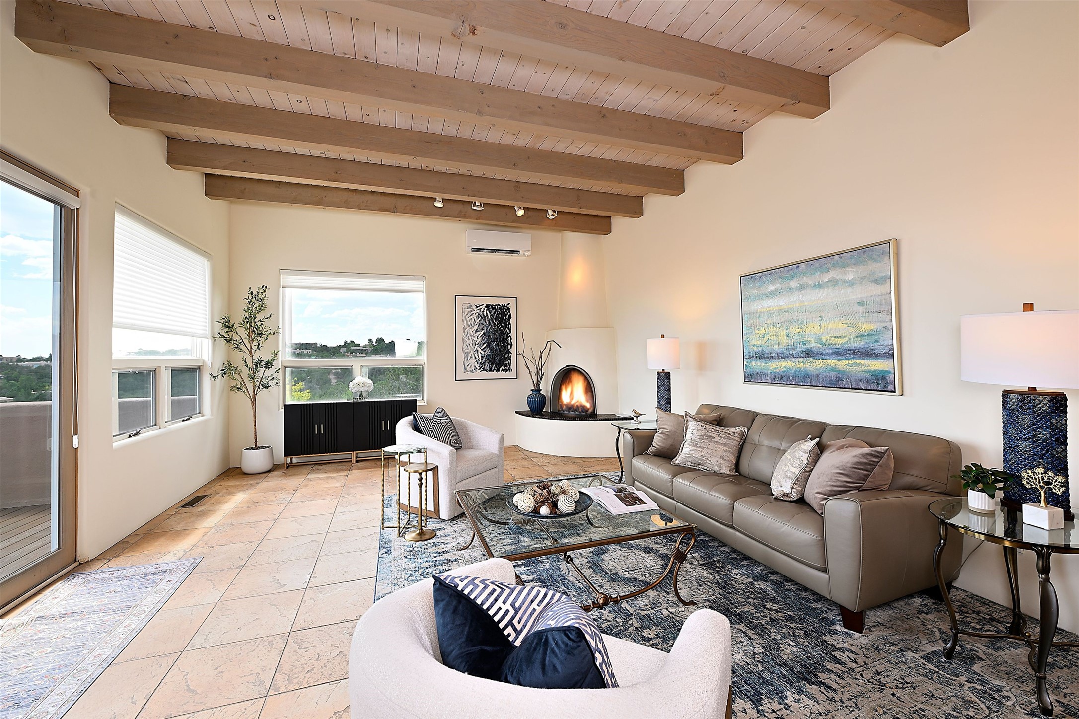 Welcome to this modern Santa Fe style townhome, with elegant upgrades, and outstanding mountain views.Ideally situated only five minutes from Santa Fe Plaza and close to Ft. Marcy Park with its recreation center,dog park and pickle ball courts, this residence combines comfort, style and an unbeatable location in thedesirable Valle del Sol neighborhood. Step through a beautifully carved wood front door into a bright entrywith clerestory windows. The open floor plan features a spacious, light-filled great room, boasting largepicture windows that frame dramatic foothill views, ceiling beams, and a wood-burning kiva fireplace. Theliving room opens conveniently to a generous deck with views to the Sandia and Ortiz Mountains, andfeatures a spiral staircase down to the back gardens and fountain. These spaces are perfect for entertainingand enjoying stunning sunsets. On the main floor, are a second bedroom with a remodeled CaliforniaCloset, which opens to its own private deck, and a third bedroom, featuring built-in bookcases, which couldalso be used as an office, studio or guest space. The fully remodeled kitchen features a skylight, quartzitecountertops, Bosch appliances and custom cabinetry. There is a large adjacent breakfast nook with bancoseating and views. On its own private level, the primary suite is a true retreat with a wood-burning kivafireplace, custom California Closet, and comfortable sitting area, which opens to its own shaded and tranquildeck overlooking the Sangre de Cristo Mountains. This home has many upgrades including a new roof, waterheater, Fibron deck, exterior paint, garage doors, Hunter Douglas blackout blinds, and more. Enjoy ease ofliving with a separate laundry room, pantry, large storage closet and oversized 2-car garage. Home includesclimate control with mini-splits and forced air heat. This is an exceptional find for those seeking views,privacy, and proximity to downtown Santa Fe and all it has to offer!