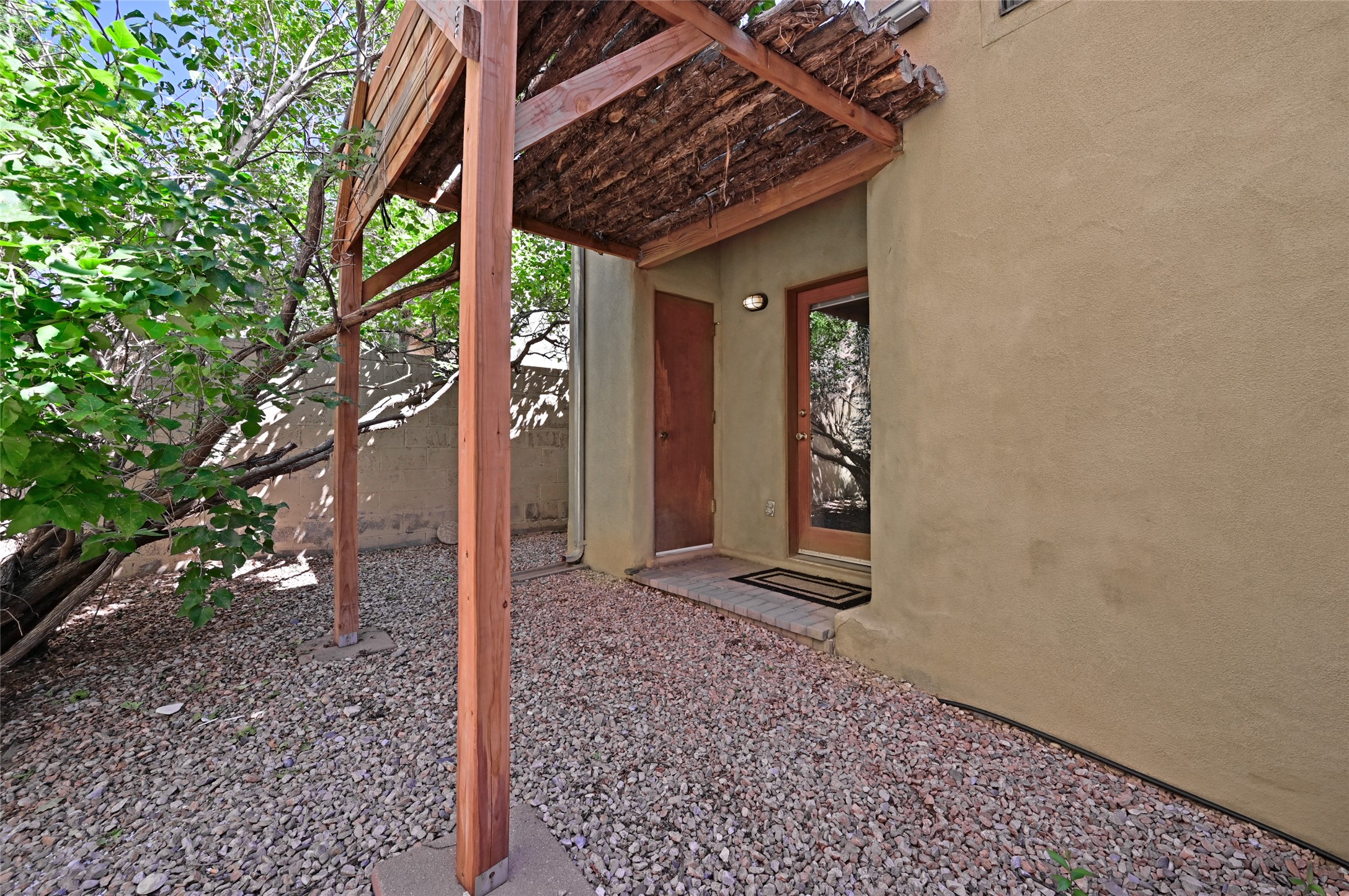 A charming townhome in the Las Americas development, located in the heart of Santa Fe. This inviting open-concept layout flows seamlessly from the living room to the kitchen. The living area features a cozy kiva fireplace, built-in bookshelves, and soaring vaulted ceilings. Upstairs, you'll find a spacious studio with a private balcony offering scenic views, while the primary bedroom is conveniently located on the main level along with a full bath for easy accessibility. The property also includes a fenced backyard with mature landscaping, perfect for relaxing or entertaining. Centrally located, this townhome offers close access to Santa Fe's vibrant shops, restaurants, and beautiful natural spaces. With several nearby trails, it provides the ideal balance of urban living and outdoor adventure.
