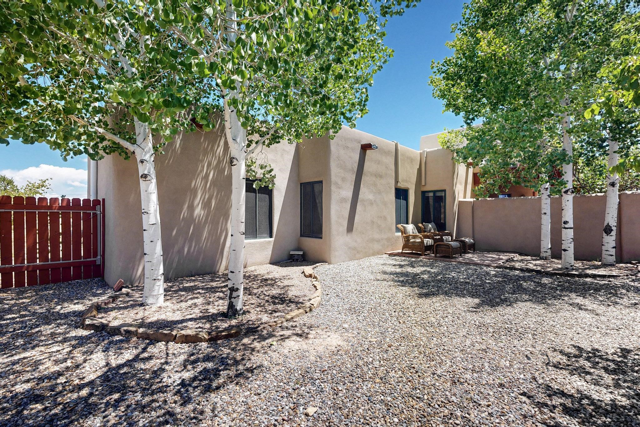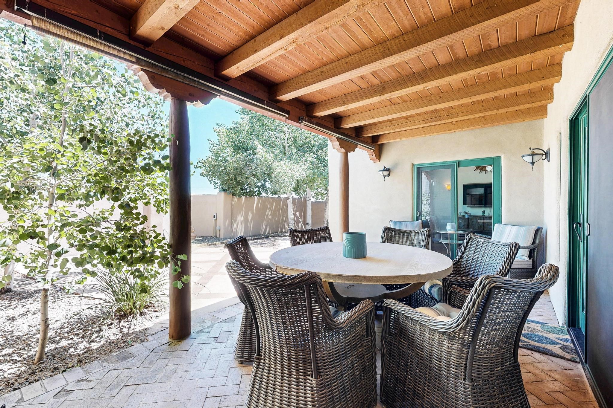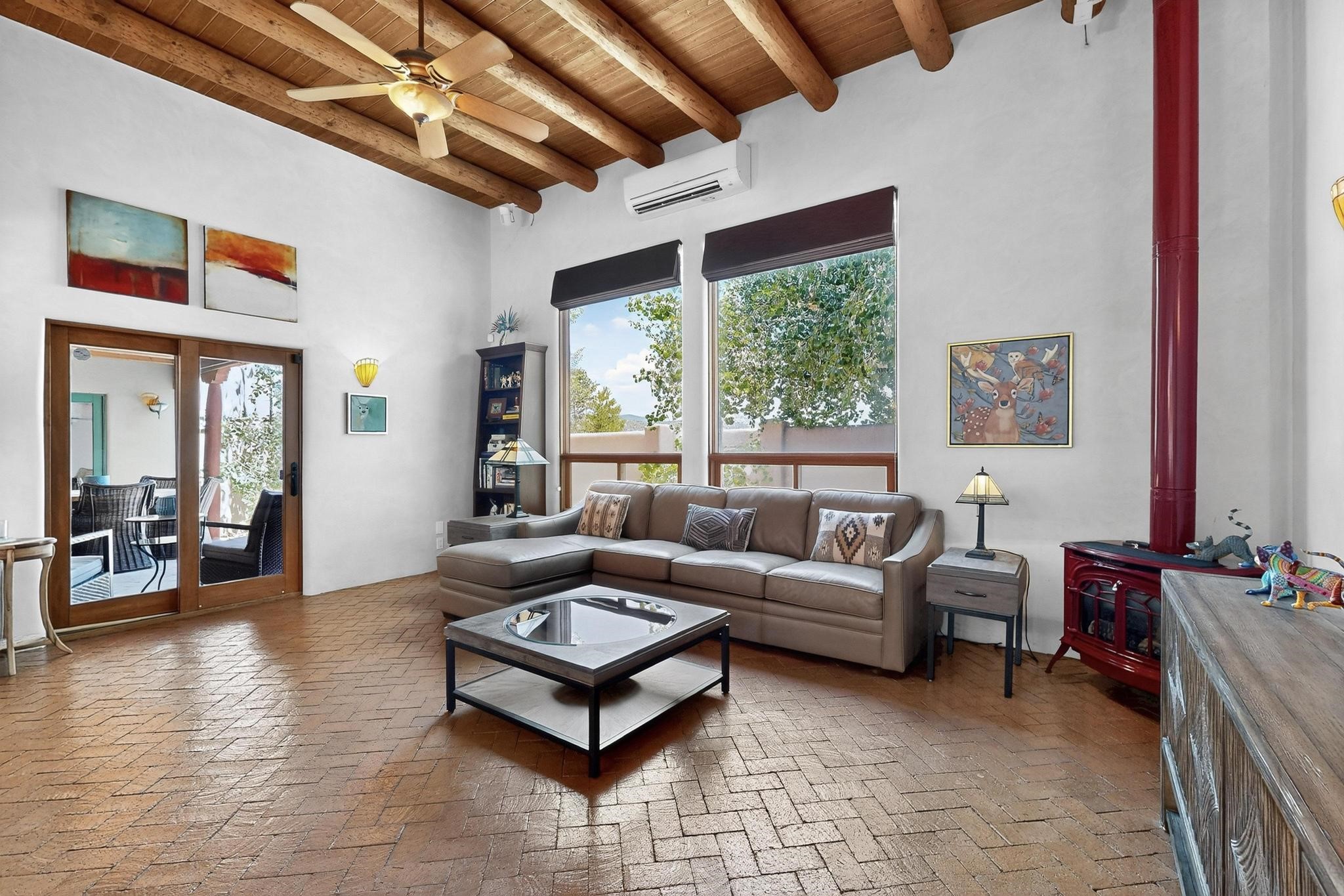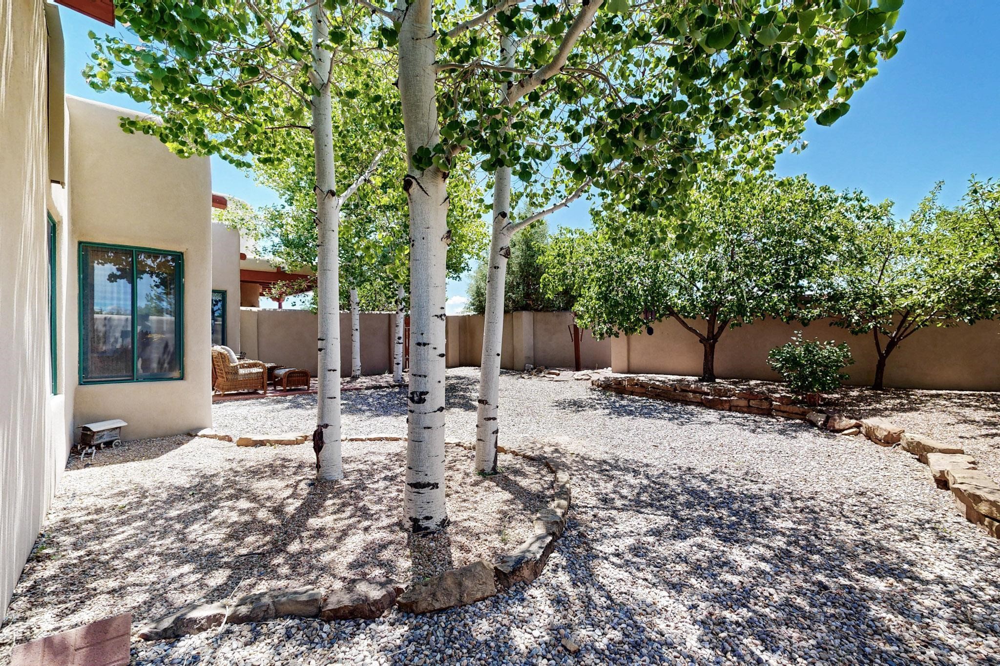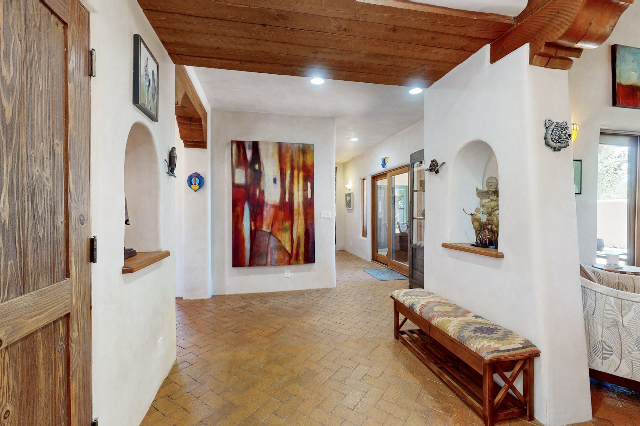 -Set on an expansive 2.73-acre lot in the highly coveted La Paz neighborhood, this exceptional Santa Fe residence offers refined living with timeless Southwestern style. Surrounded by mature aspens and beautifully landscaped grounds, the property welcomes you with a circular driveway and a sense of tranquil privacy.Inside, rich plaster walls, gorgeous brick flooring, and hand-hewn vigas reflect the region's architectural heritage, while soaring high ceilings and tall windows fill the home with light and airiness. The open-concept living, dining, and kitchen space is perfect for entertaining, featuring a custom chef's kitchen with high-end finishes and creative storage solutions.Multiple outdoor living spaces invite you to enjoy Santa Fe's famous skies--ideal for relaxing, dining, or gathering with friends and family. A flexible studio/gym/bonus room with heating and cooling offers even more room to create, work, or unwind.Additional highlights include a new water softener with reverse osmosis, a spacious two-car garage with epoxy floors, and a covered breezeway connecting to the main home. The home comes with a 1-year transferrable warranty.This is truly a rare offering--where luxury meets comfort in one of Santa Fe's most desirable communities.