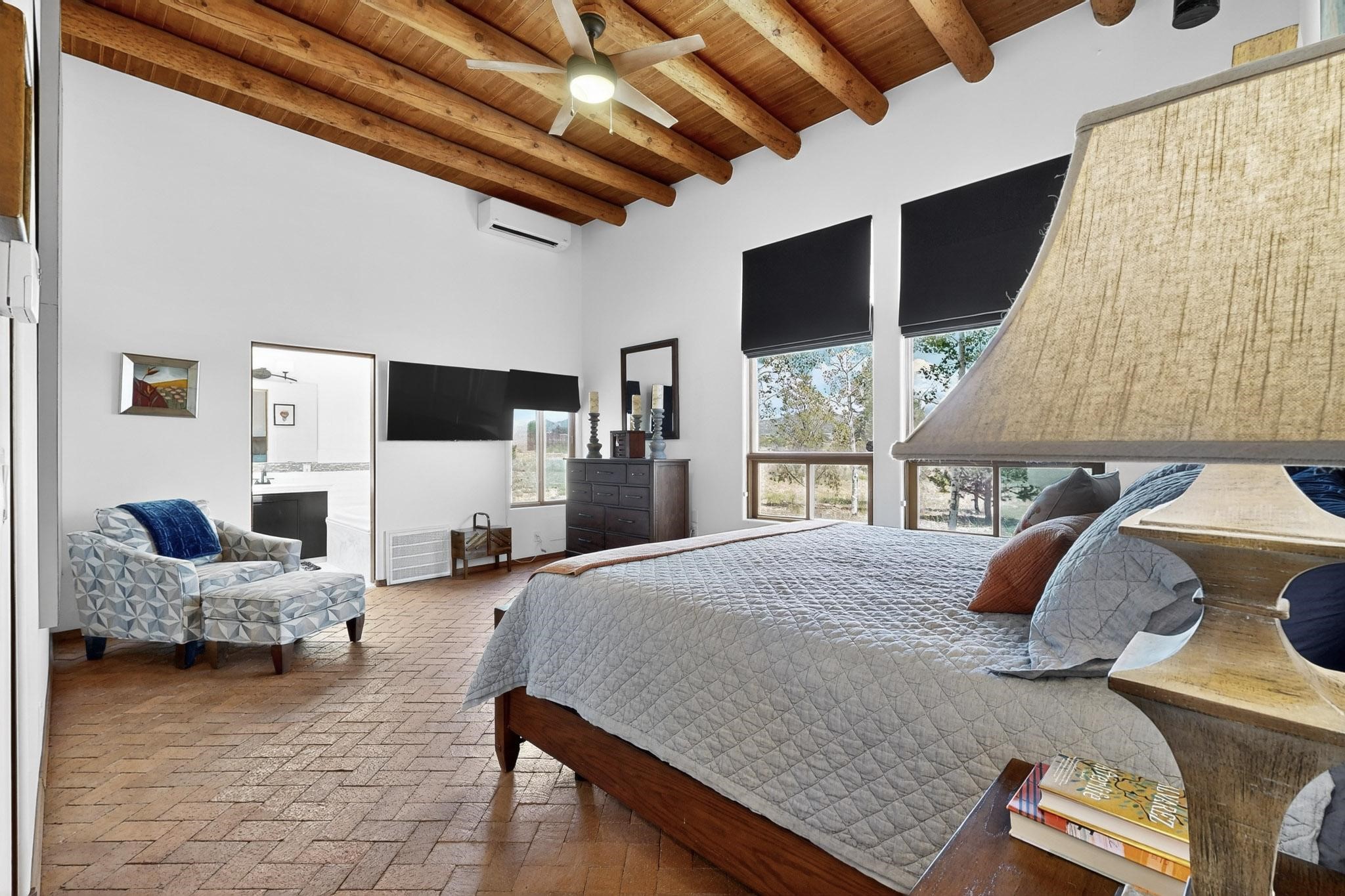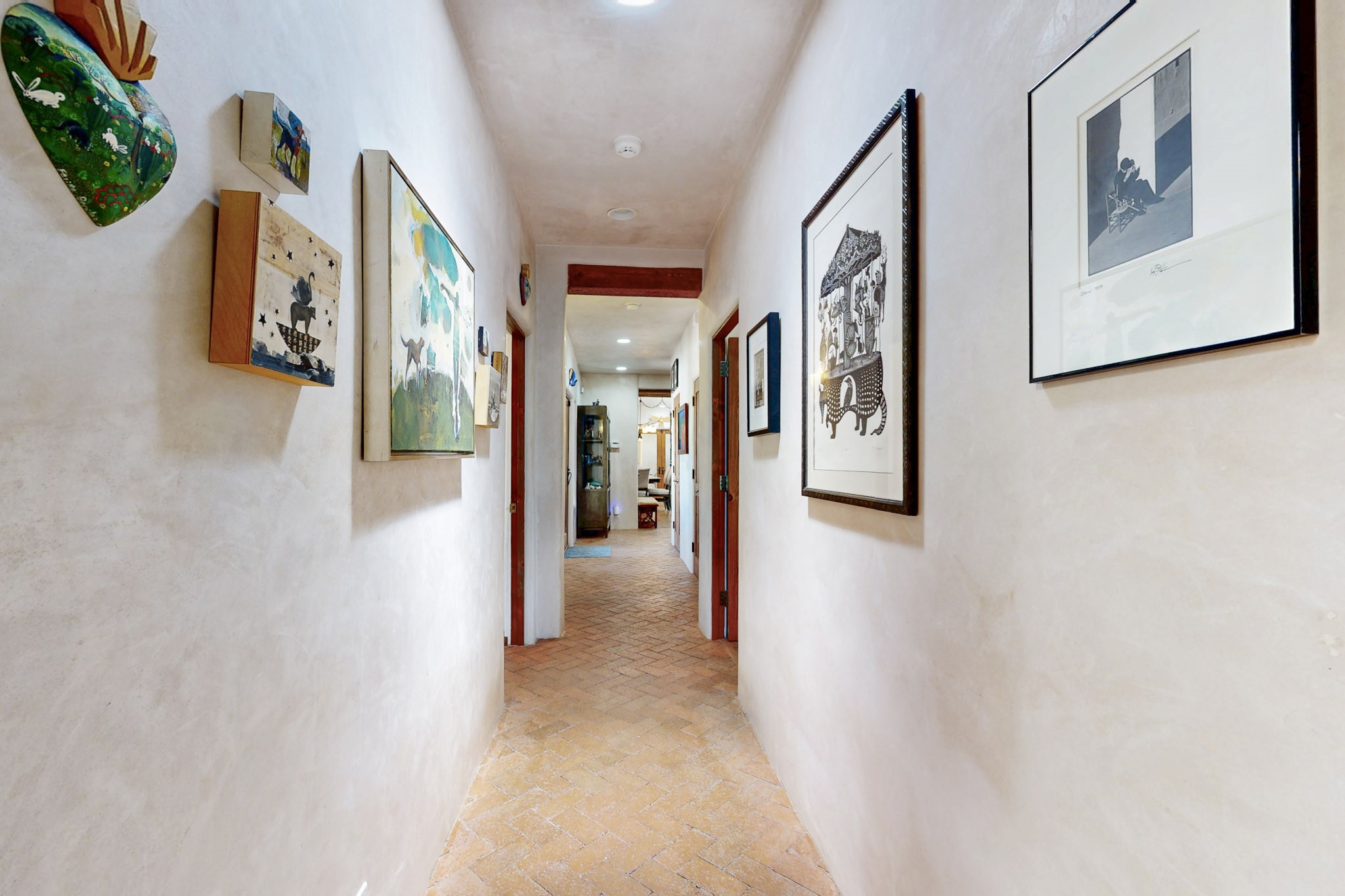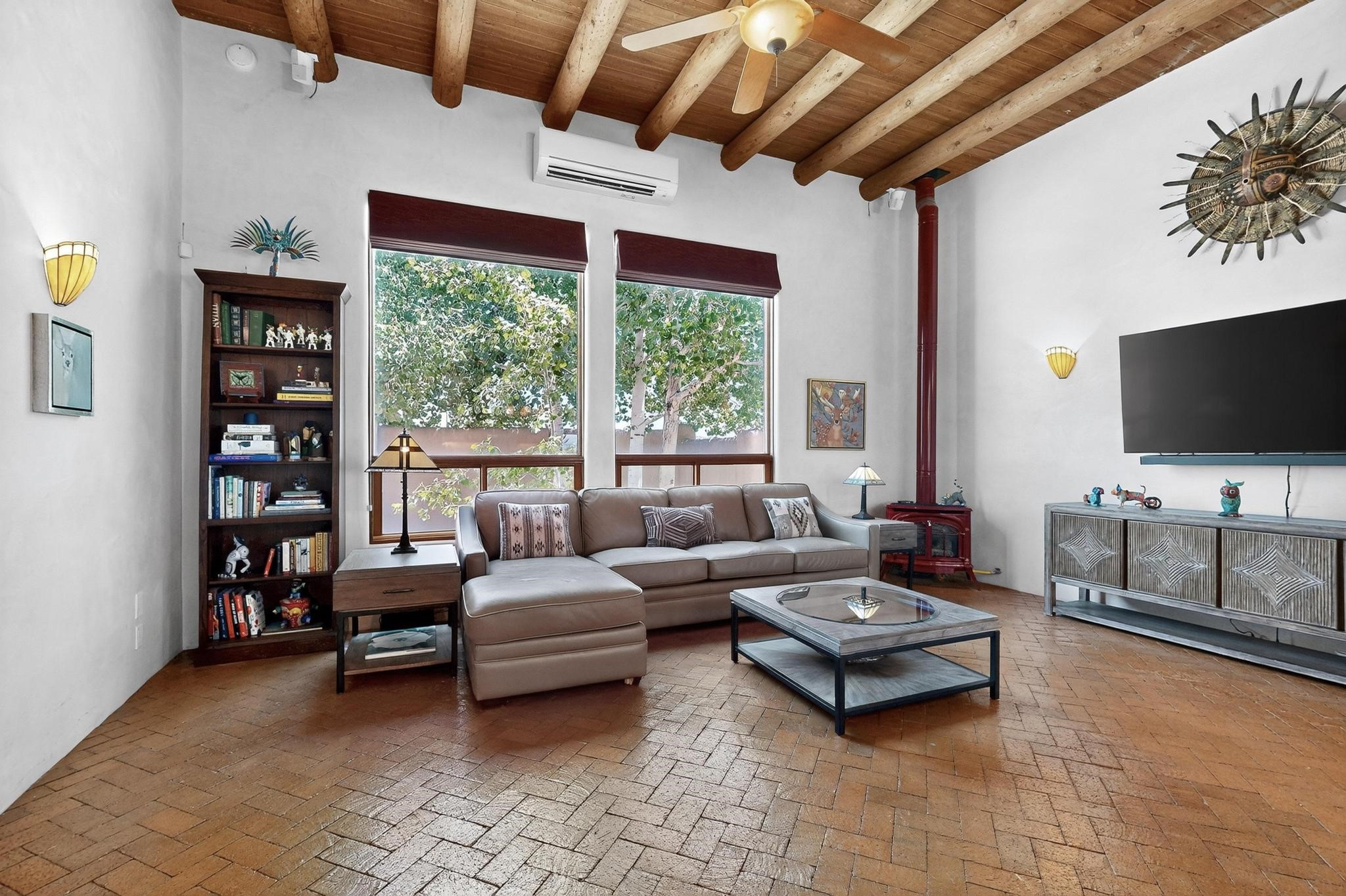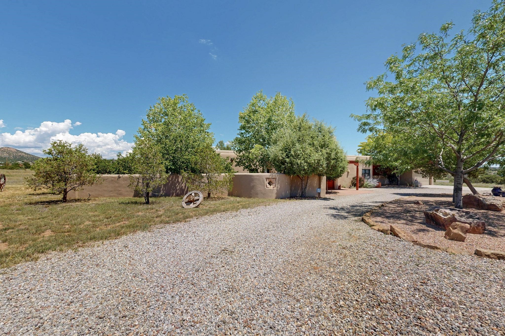 -Set on an expansive 2.73-acre lot in the highly coveted La Paz neighborhood, this exceptional Santa Fe residence offers refined living with timeless Southwestern style. Surrounded by mature aspens and beautifully landscaped grounds, the property welcomes you with a circular driveway and a sense of tranquil privacy.Inside, rich plaster walls, gorgeous brick flooring, and hand-hewn vigas reflect the region's architectural heritage, while soaring high ceilings and tall windows fill the home with light and airiness. The open-concept living, dining, and kitchen space is perfect for entertaining, featuring a custom chef's kitchen with high-end finishes and creative storage solutions.Multiple outdoor living spaces invite you to enjoy Santa Fe's famous skies--ideal for relaxing, dining, or gathering with friends and family. A flexible studio/gym/bonus room with heating and cooling offers even more room to create, work, or unwind.Additional highlights include a new water softener with reverse osmosis, a spacious two-car garage with epoxy floors, and a covered breezeway connecting to the main home. The home comes with a 1-year transferrable warranty.This is truly a rare offering--where luxury meets comfort in one of Santa Fe's most desirable communities.