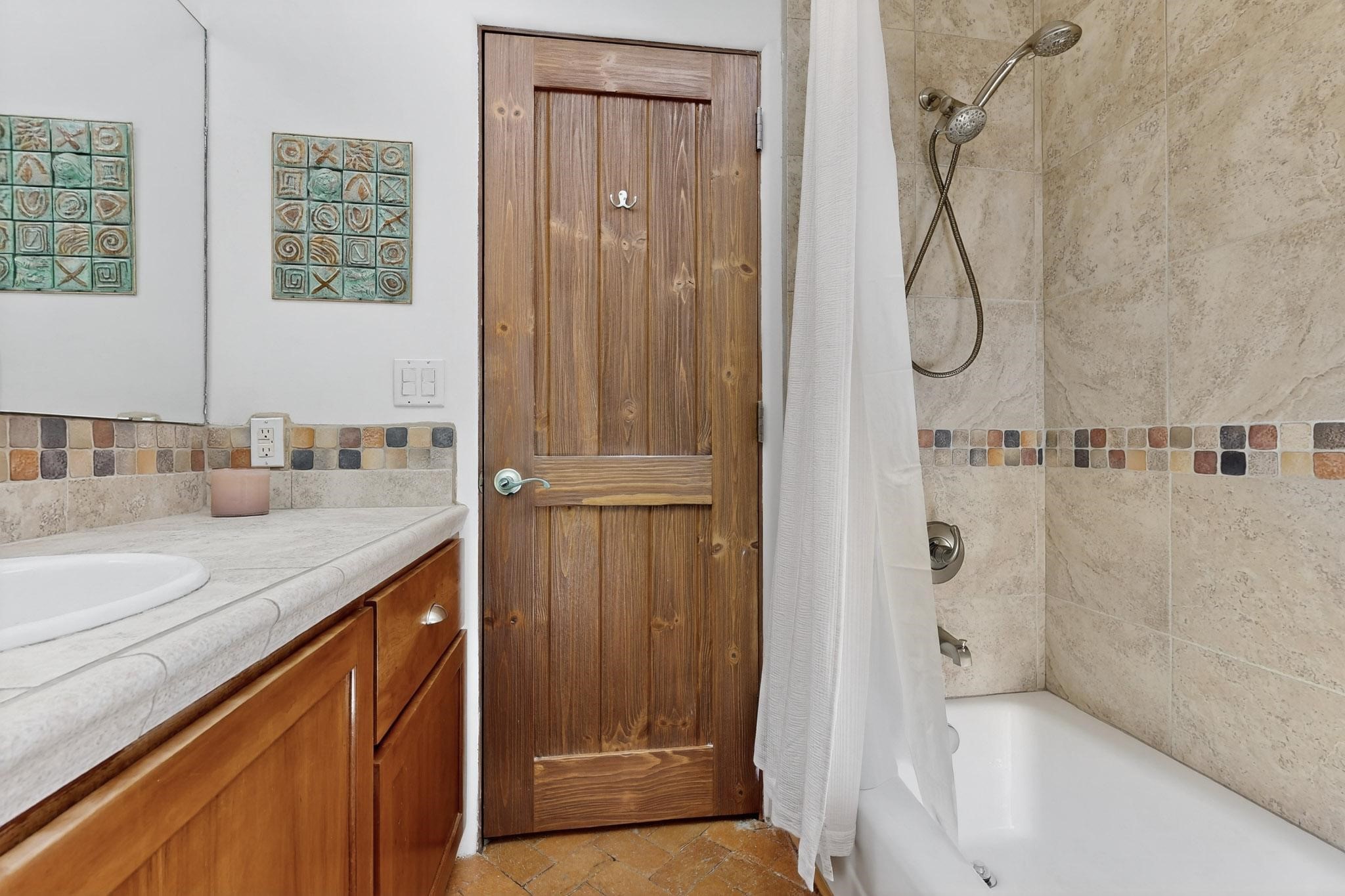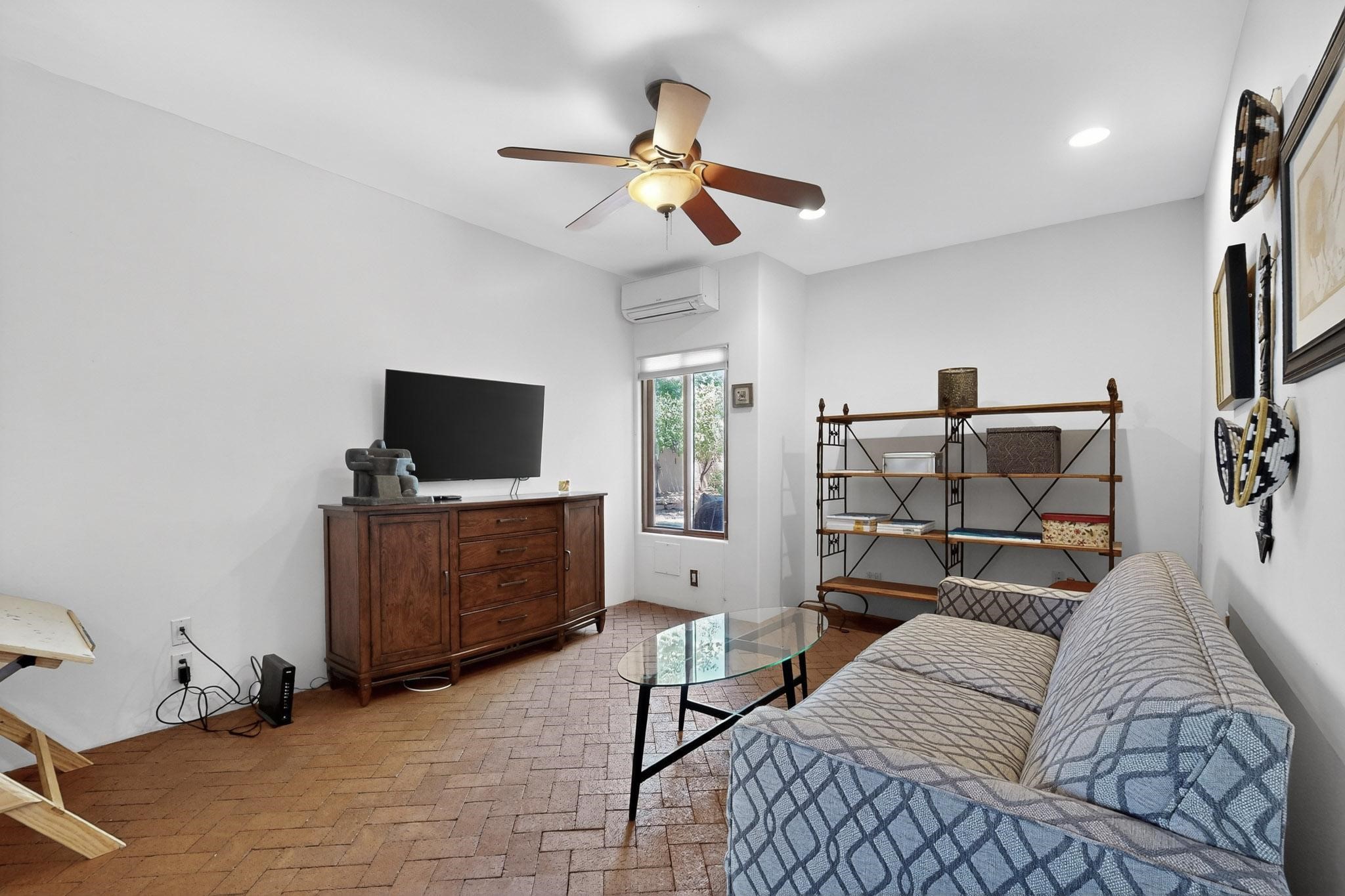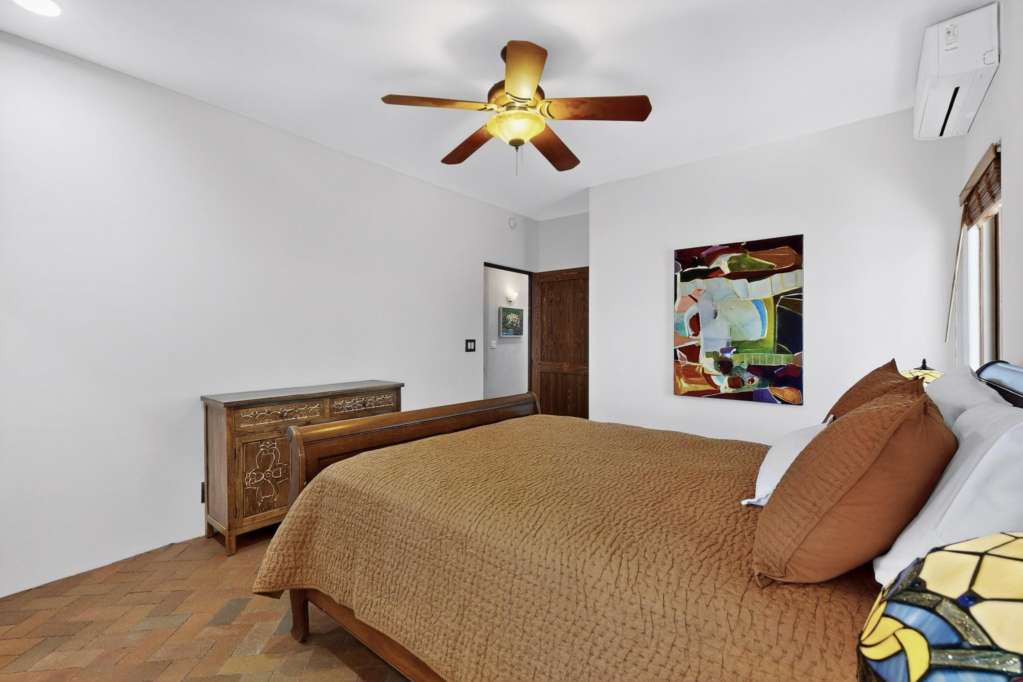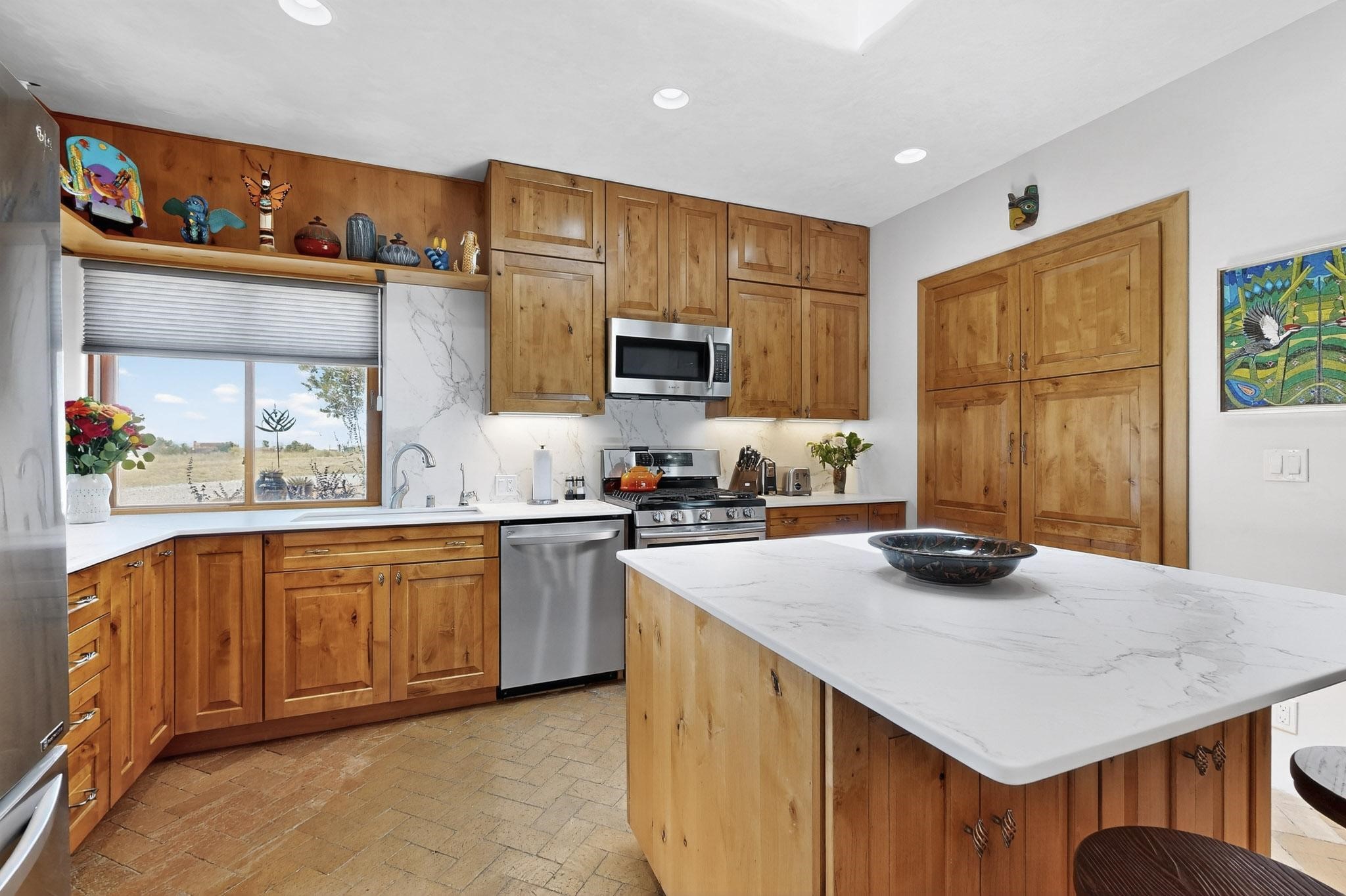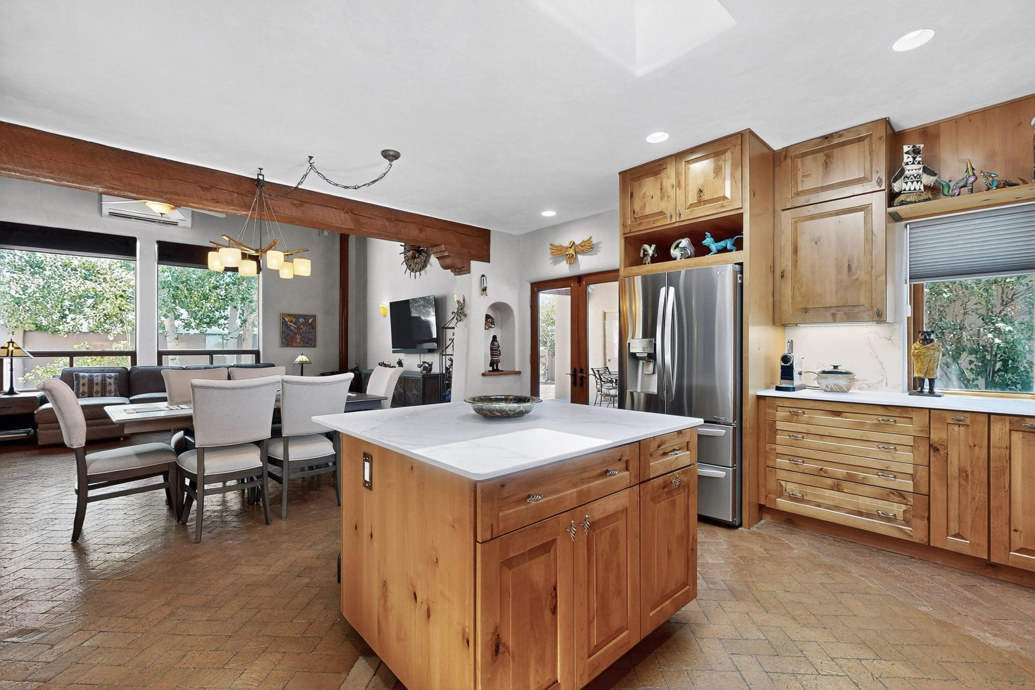 -Set on an expansive 2.73-acre lot in the highly coveted La Paz neighborhood, this exceptional Santa Fe residence offers refined living with timeless Southwestern style. Surrounded by mature aspens and beautifully landscaped grounds, the property welcomes you with a circular driveway and a sense of tranquil privacy.Inside, rich plaster walls, gorgeous brick flooring, and hand-hewn vigas reflect the region's architectural heritage, while soaring high ceilings and tall windows fill the home with light and airiness. The open-concept living, dining, and kitchen space is perfect for entertaining, featuring a custom chef's kitchen with high-end finishes and creative storage solutions.Multiple outdoor living spaces invite you to enjoy Santa Fe's famous skies--ideal for relaxing, dining, or gathering with friends and family. A flexible studio/gym/bonus room with heating and cooling offers even more room to create, work, or unwind.Additional highlights include a new water softener with reverse osmosis, a spacious two-car garage with epoxy floors, and a covered breezeway connecting to the main home. The home comes with a 1-year transferrable warranty.This is truly a rare offering--where luxury meets comfort in one of Santa Fe's most desirable communities.