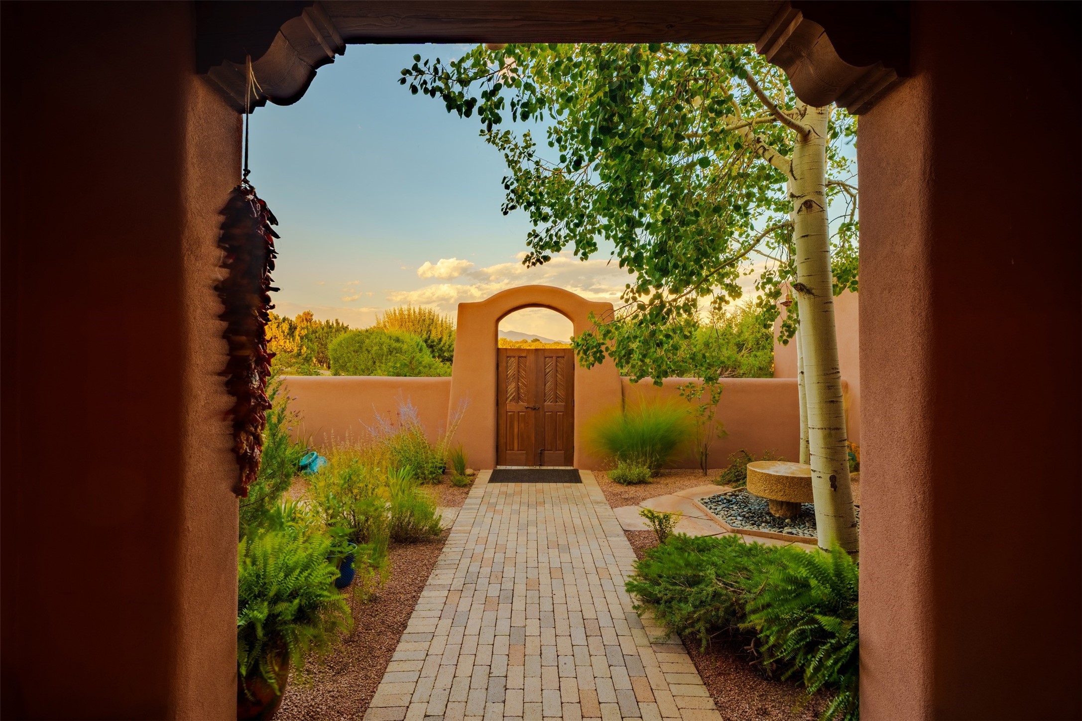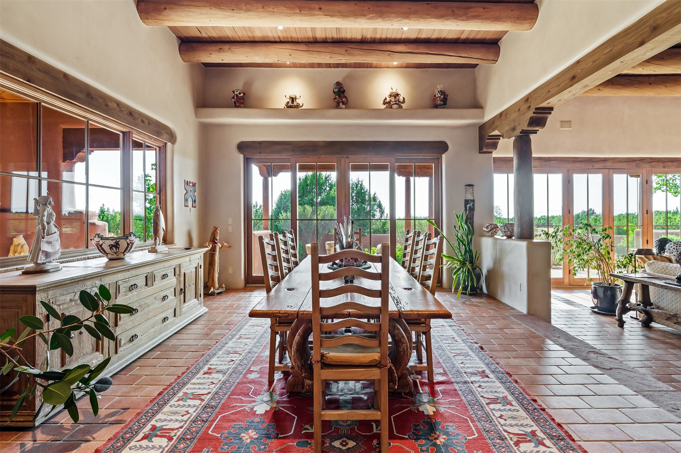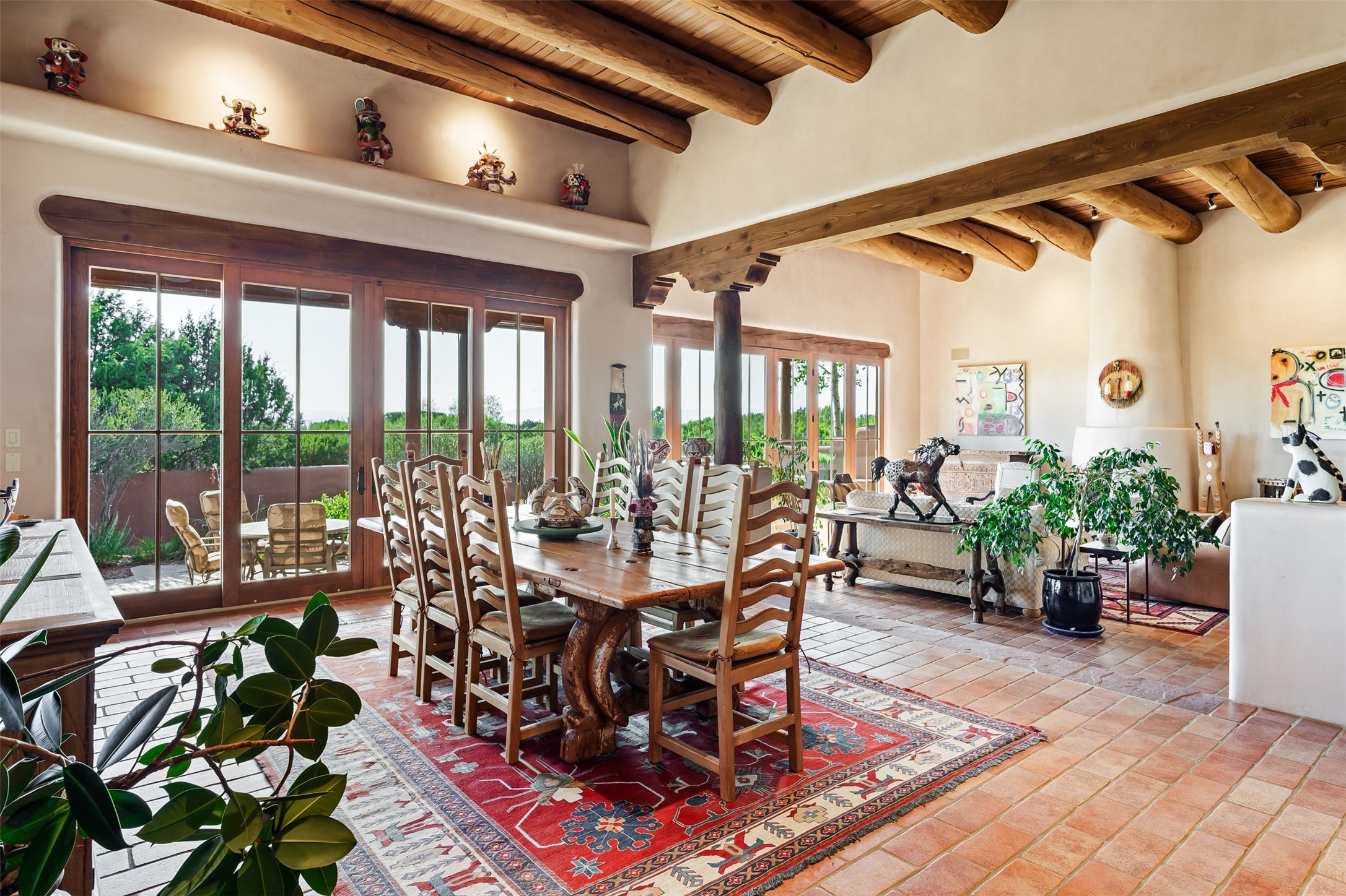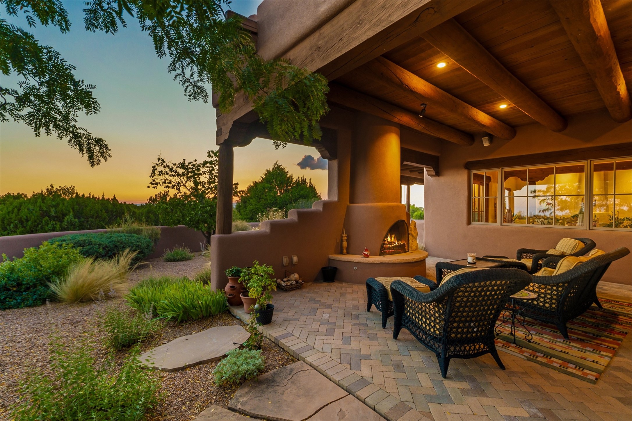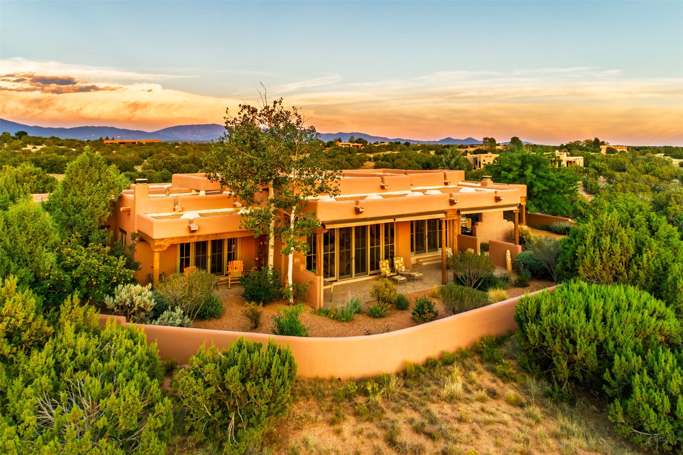 Experience Timeless Santa Fe Elegance in Las Campanas. Approach this exceptional Las Campanas residence through a walled courtyard shaded by mature aspens and graced with fruit trees. Step through the grand rustic wood double doors into a spacious, light-filled central living area that seamlessly unites the living room, dining space, gourmet kitchen, and breakfast nook. The home's layout offers perfect privacy: the primary suite and office are thoughtfully situated in one wing, while two guest suites occupy the opposite side. Throughout, traditional Santa Fe craftsmanship shines--diamond plaster walls, vigas, carved corbels, and built-in shelving and nichos that invite you to showcase art and treasured objects. The living room centers around a large kiva fireplace and frames views of the Jemez Mountains. Glass doors open to an expansive portale, ideal for entertaining or simply savoring the views. The gourmet kitchen features a six-burner Wolf range, wine cooler, granite countertops, center island, and connects to a charming breakfast nook with its own kiva fireplace. The primary suite is a serene retreat with a kiva fireplace, two large walk-in California Closets with built-in storage, and a luxurious bathroom featuring a bidet toilet, steam shower, and jetted tub. Step directly from the suite onto a private portale for morning coffee or evening stargazing. A spacious office with a built-in double desk completes this private wing. Each guest suite offers an en-suite bathroom, and access to a shaded portale; one bathroom includes a double vanity and jetted tub. Outdoor living is enhanced by large, shaded portales with high viga ceilings. The main portale features a built-in gas grill and automated shades. Mature aspens, fruit trees, and lush landscaping create a peaceful, private sanctuary. This home blends the soul of traditional Santa Fe design with the comfort and functionality of modern luxury--all in the heart of Las Campanas.