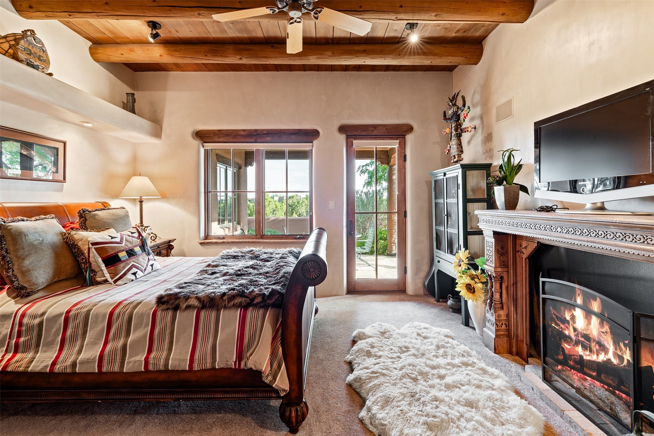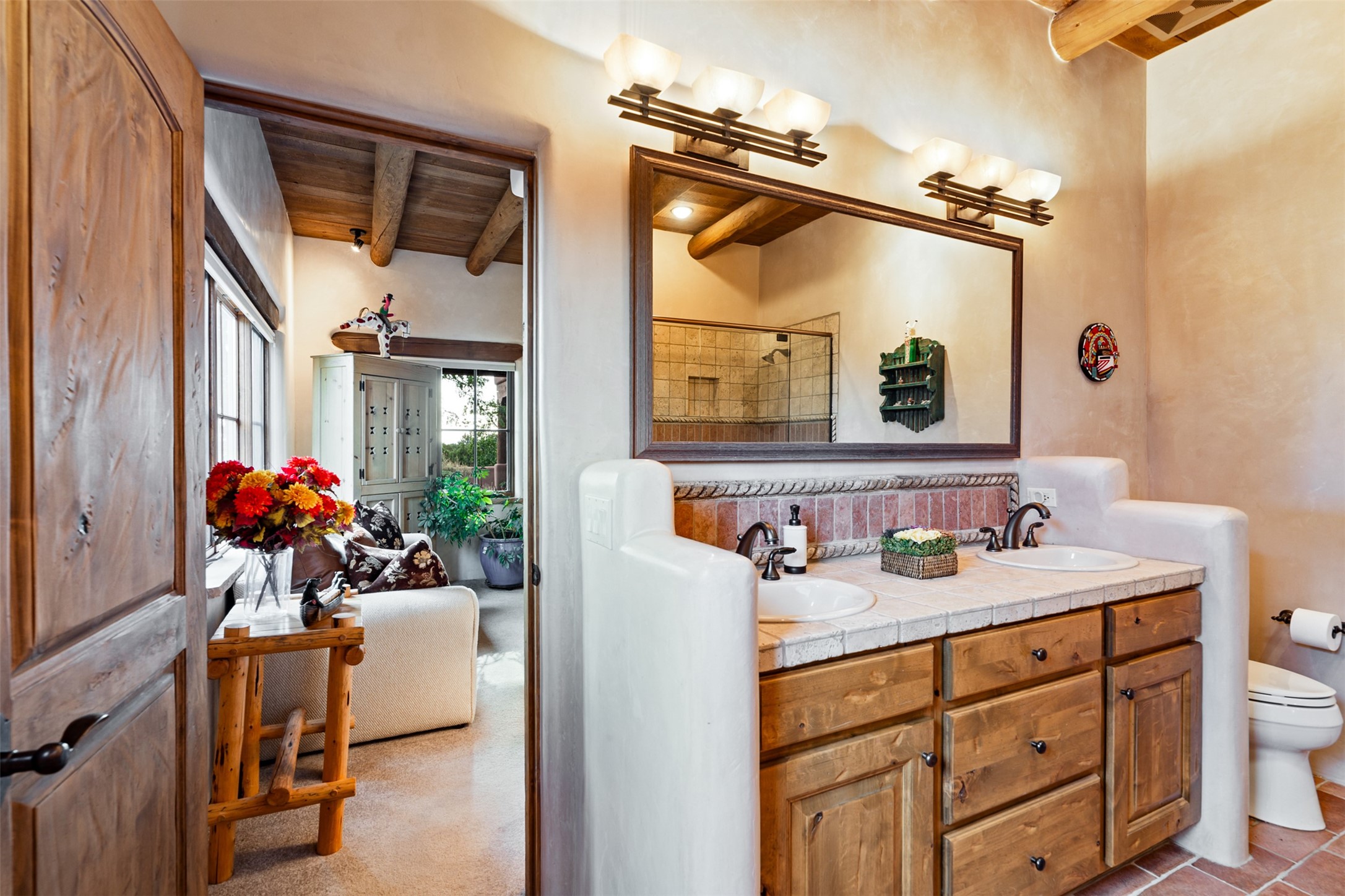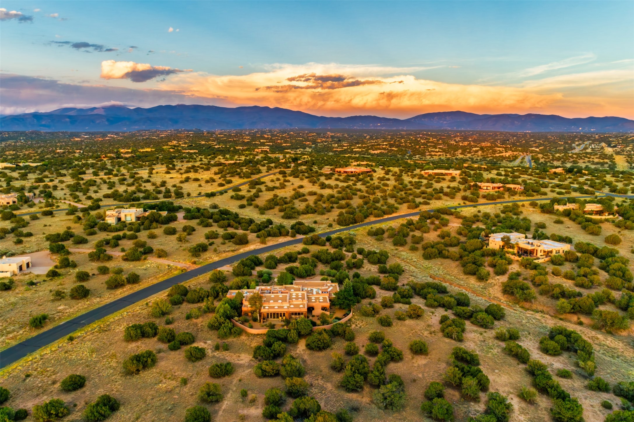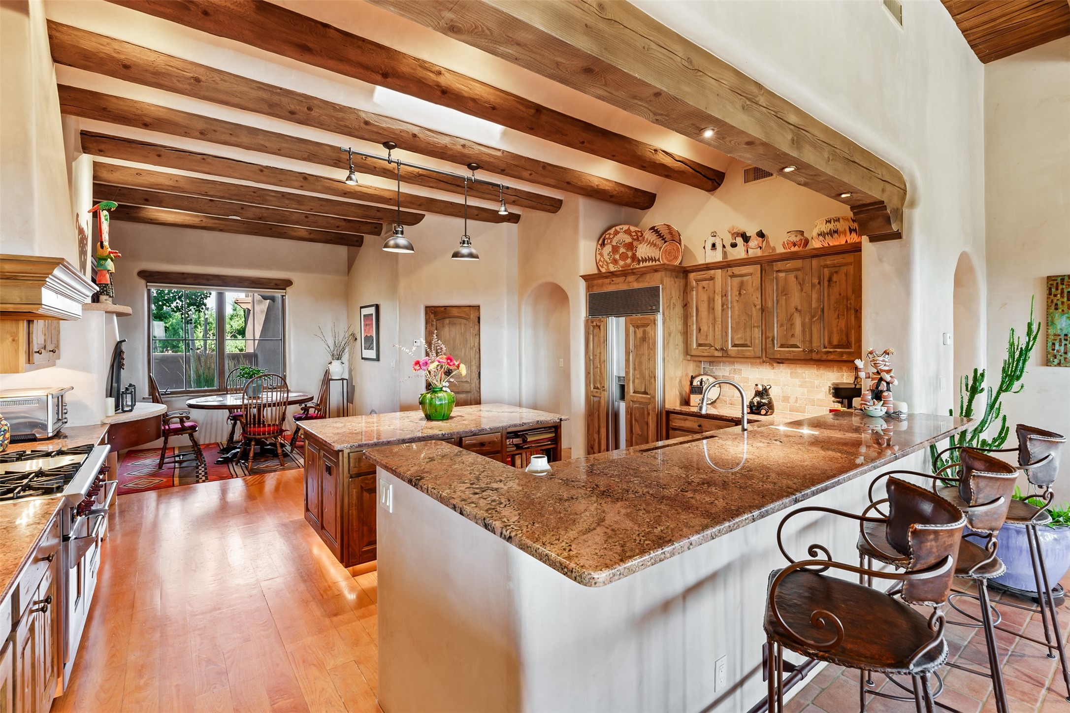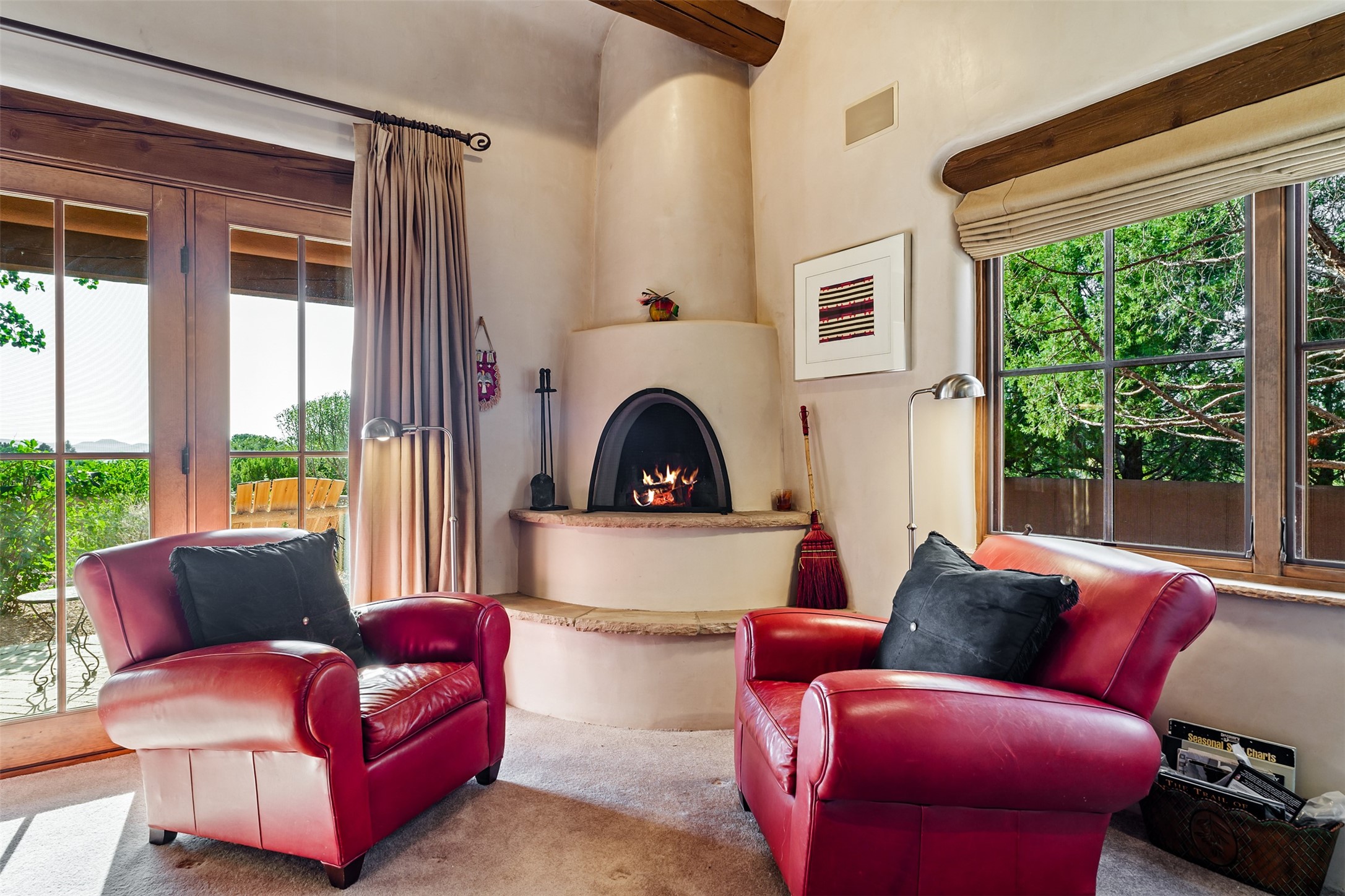 Experience Timeless Santa Fe Elegance in Las Campanas. Approach this exceptional Las Campanas residence through a walled courtyard shaded by mature aspens and graced with fruit trees. Step through the grand rustic wood double doors into a spacious, light-filled central living area that seamlessly unites the living room, dining space, gourmet kitchen, and breakfast nook. The home's layout offers perfect privacy: the primary suite and office are thoughtfully situated in one wing, while two guest suites occupy the opposite side. Throughout, traditional Santa Fe craftsmanship shines--diamond plaster walls, vigas, carved corbels, and built-in shelving and nichos that invite you to showcase art and treasured objects. The living room centers around a large kiva fireplace and frames views of the Jemez Mountains. Glass doors open to an expansive portale, ideal for entertaining or simply savoring the views. The gourmet kitchen features a six-burner Wolf range, wine cooler, granite countertops, center island, and connects to a charming breakfast nook with its own kiva fireplace. The primary suite is a serene retreat with a kiva fireplace, two large walk-in California Closets with built-in storage, and a luxurious bathroom featuring a bidet toilet, steam shower, and jetted tub. Step directly from the suite onto a private portale for morning coffee or evening stargazing. A spacious office with a built-in double desk completes this private wing. Each guest suite offers an en-suite bathroom, and access to a shaded portale; one bathroom includes a double vanity and jetted tub. Outdoor living is enhanced by large, shaded portales with high viga ceilings. The main portale features a built-in gas grill and automated shades. Mature aspens, fruit trees, and lush landscaping create a peaceful, private sanctuary. This home blends the soul of traditional Santa Fe design with the comfort and functionality of modern luxury--all in the heart of Las Campanas.