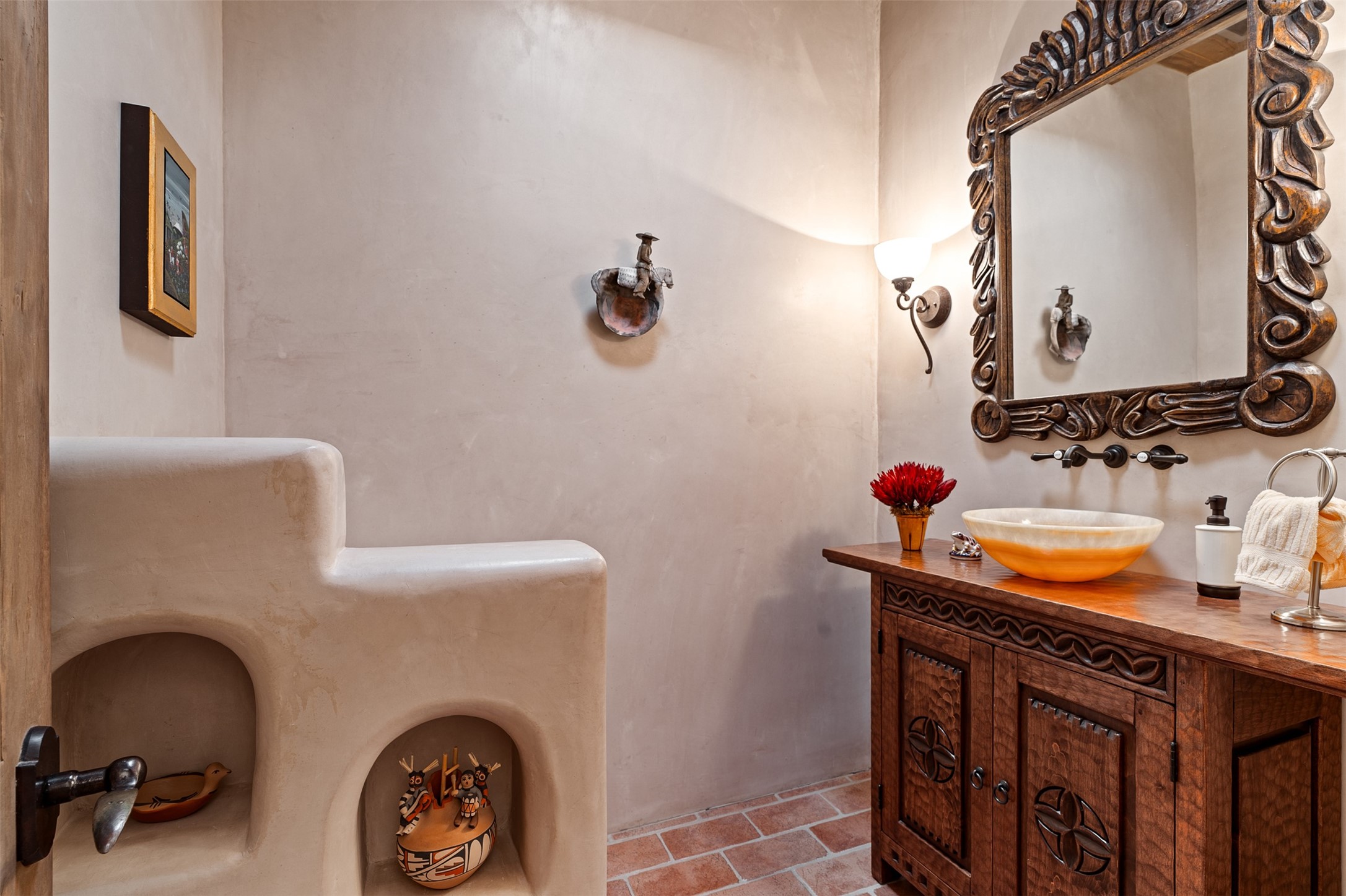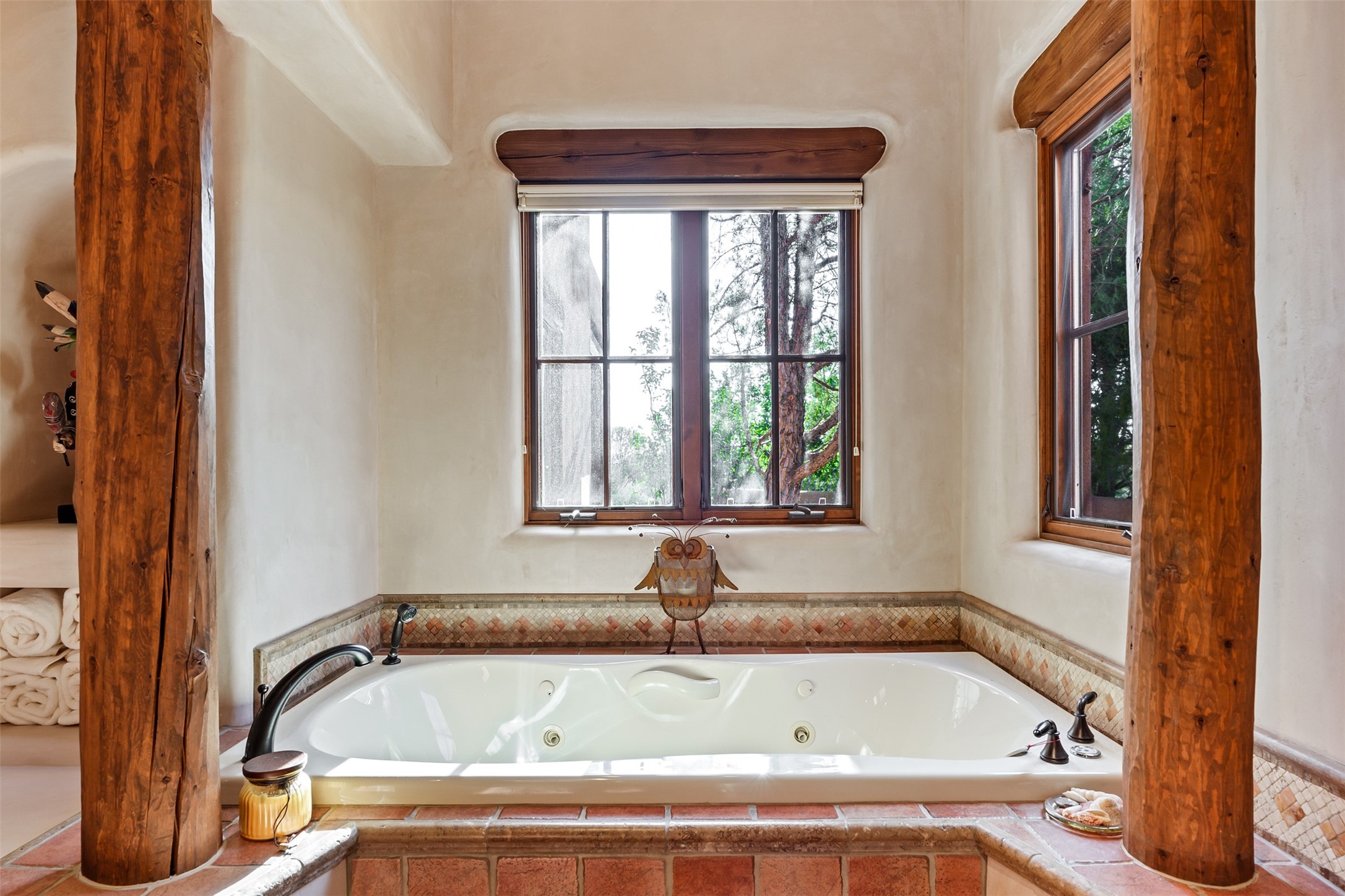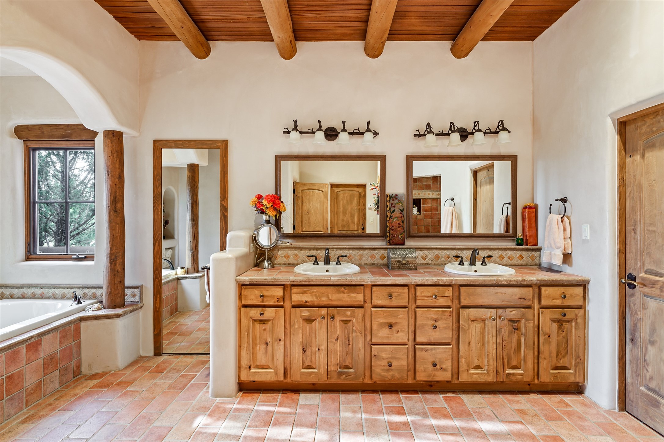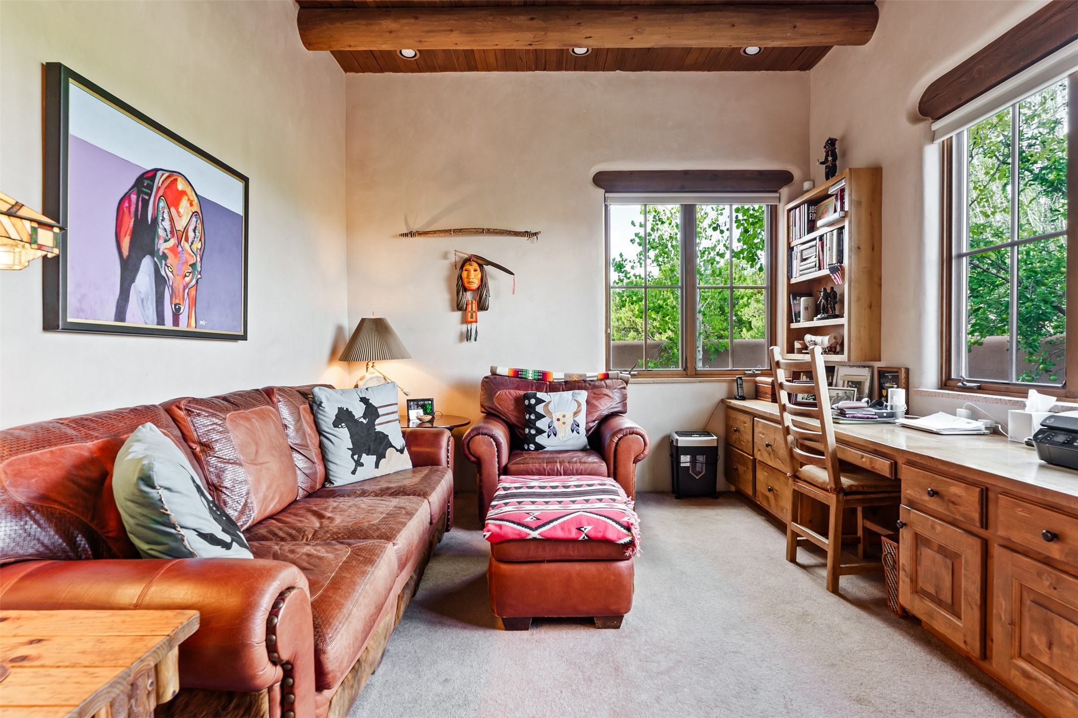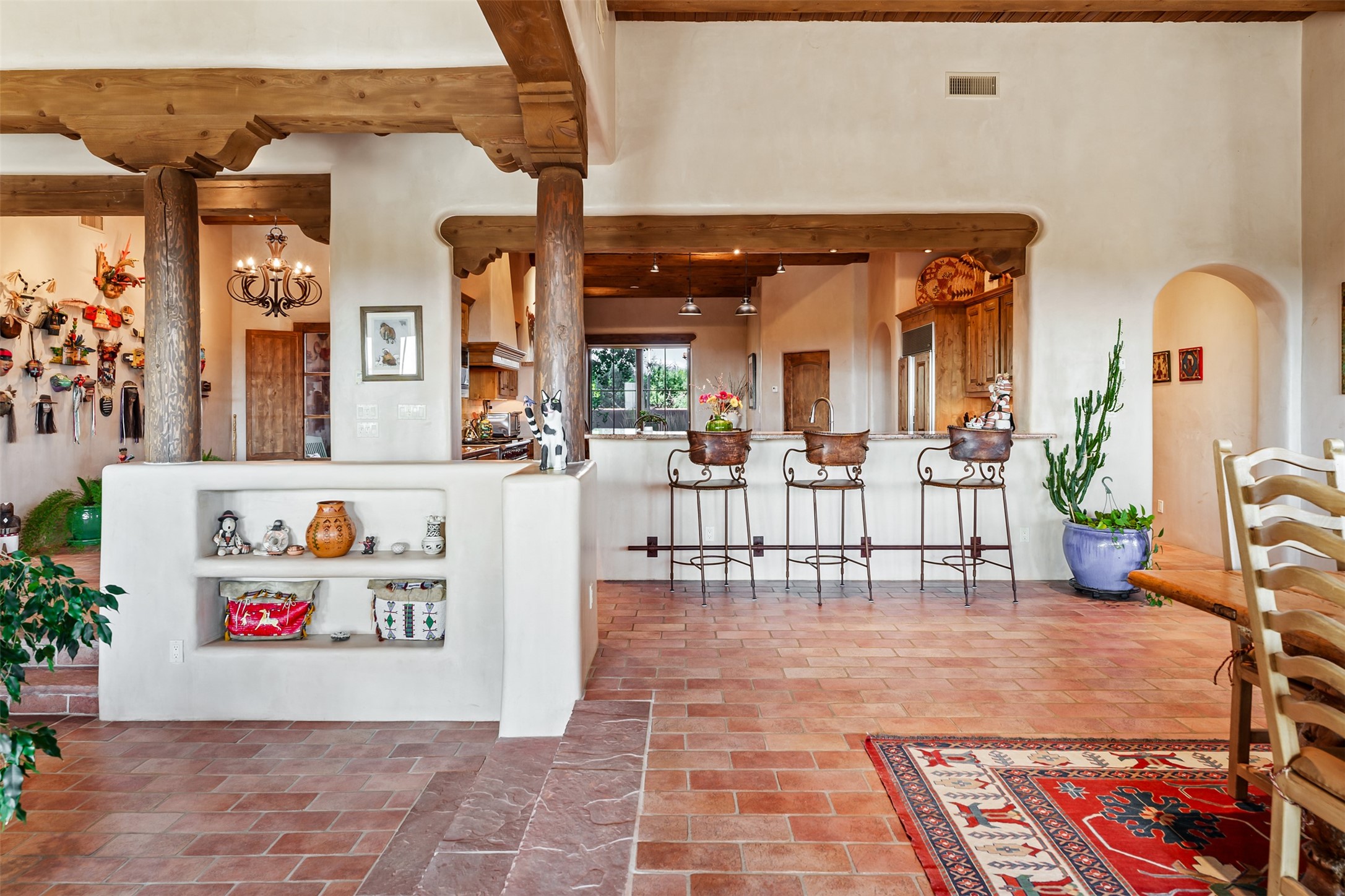 Experience Timeless Santa Fe Elegance in Las Campanas. Approach this exceptional Las Campanas residence through a walled courtyard shaded by mature aspens and graced with fruit trees. Step through the grand rustic wood double doors into a spacious, light-filled central living area that seamlessly unites the living room, dining space, gourmet kitchen, and breakfast nook. The home's layout offers perfect privacy: the primary suite and office are thoughtfully situated in one wing, while two guest suites occupy the opposite side. Throughout, traditional Santa Fe craftsmanship shines--diamond plaster walls, vigas, carved corbels, and built-in shelving and nichos that invite you to showcase art and treasured objects. The living room centers around a large kiva fireplace and frames views of the Jemez Mountains. Glass doors open to an expansive portale, ideal for entertaining or simply savoring the views. The gourmet kitchen features a six-burner Wolf range, wine cooler, granite countertops, center island, and connects to a charming breakfast nook with its own kiva fireplace. The primary suite is a serene retreat with a kiva fireplace, two large walk-in California Closets with built-in storage, and a luxurious bathroom featuring a bidet toilet, steam shower, and jetted tub. Step directly from the suite onto a private portale for morning coffee or evening stargazing. A spacious office with a built-in double desk completes this private wing. Each guest suite offers an en-suite bathroom, and access to a shaded portale; one bathroom includes a double vanity and jetted tub. Outdoor living is enhanced by large, shaded portales with high viga ceilings. The main portale features a built-in gas grill and automated shades. Mature aspens, fruit trees, and lush landscaping create a peaceful, private sanctuary. This home blends the soul of traditional Santa Fe design with the comfort and functionality of modern luxury--all in the heart of Las Campanas.