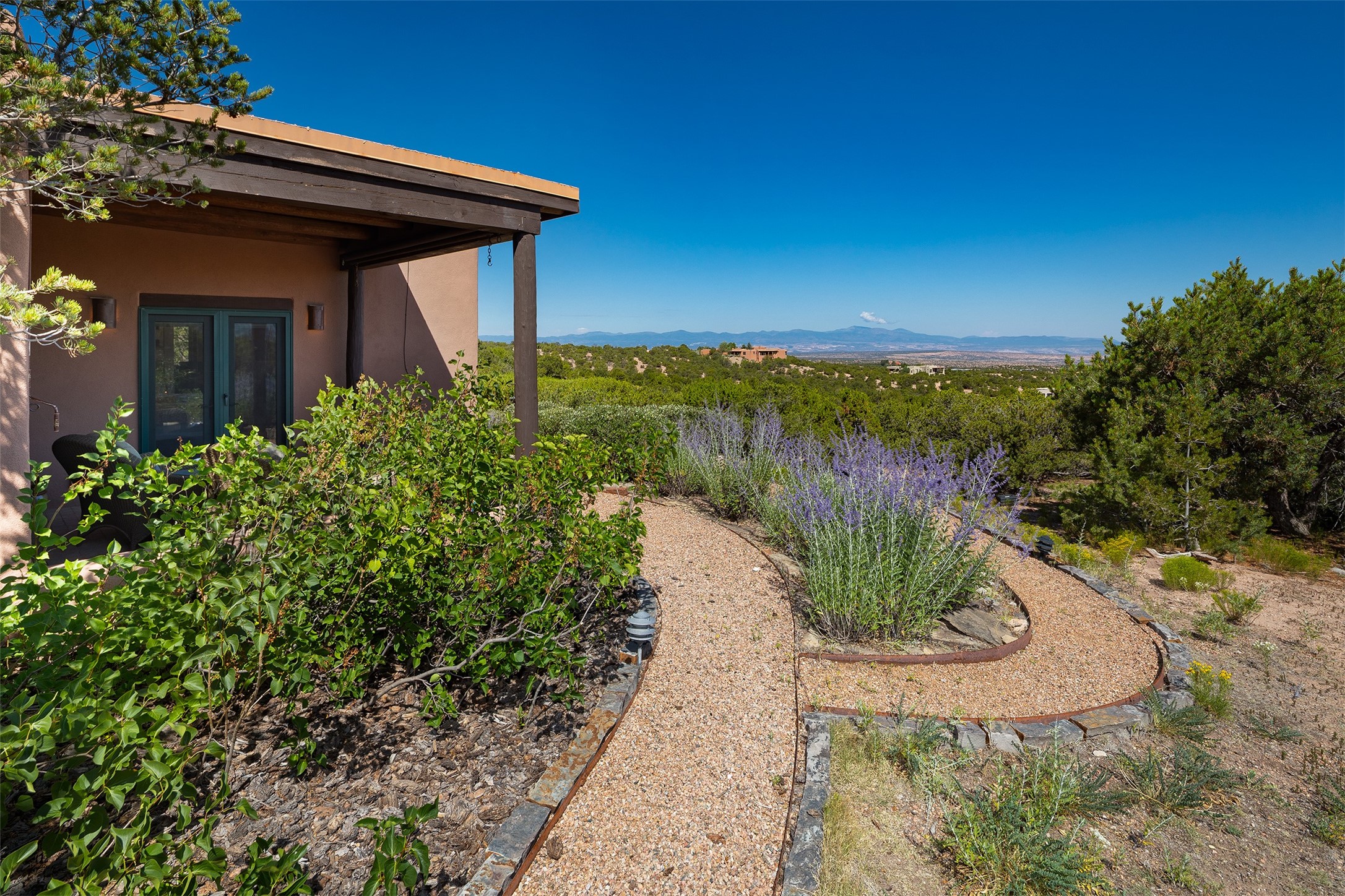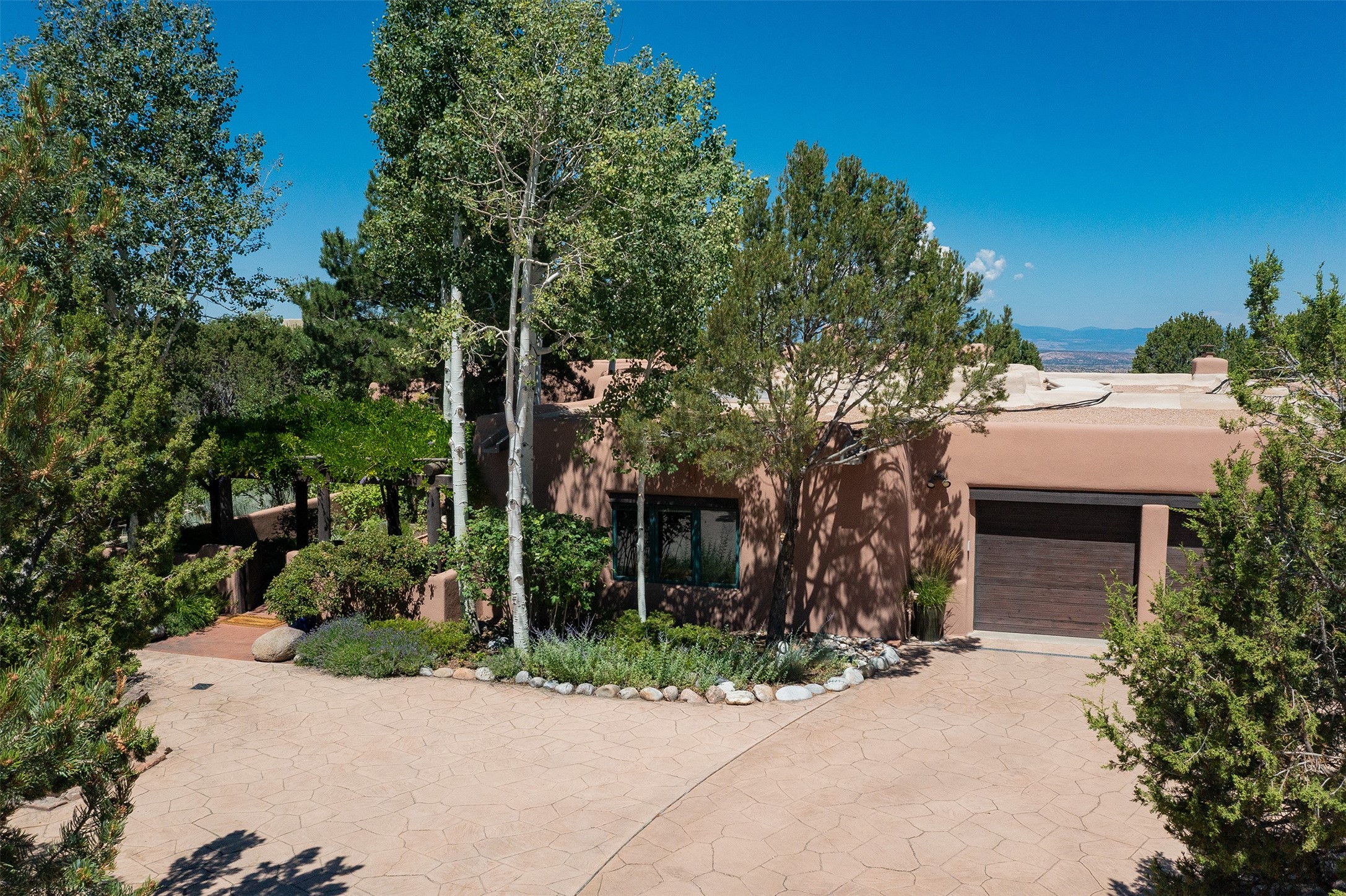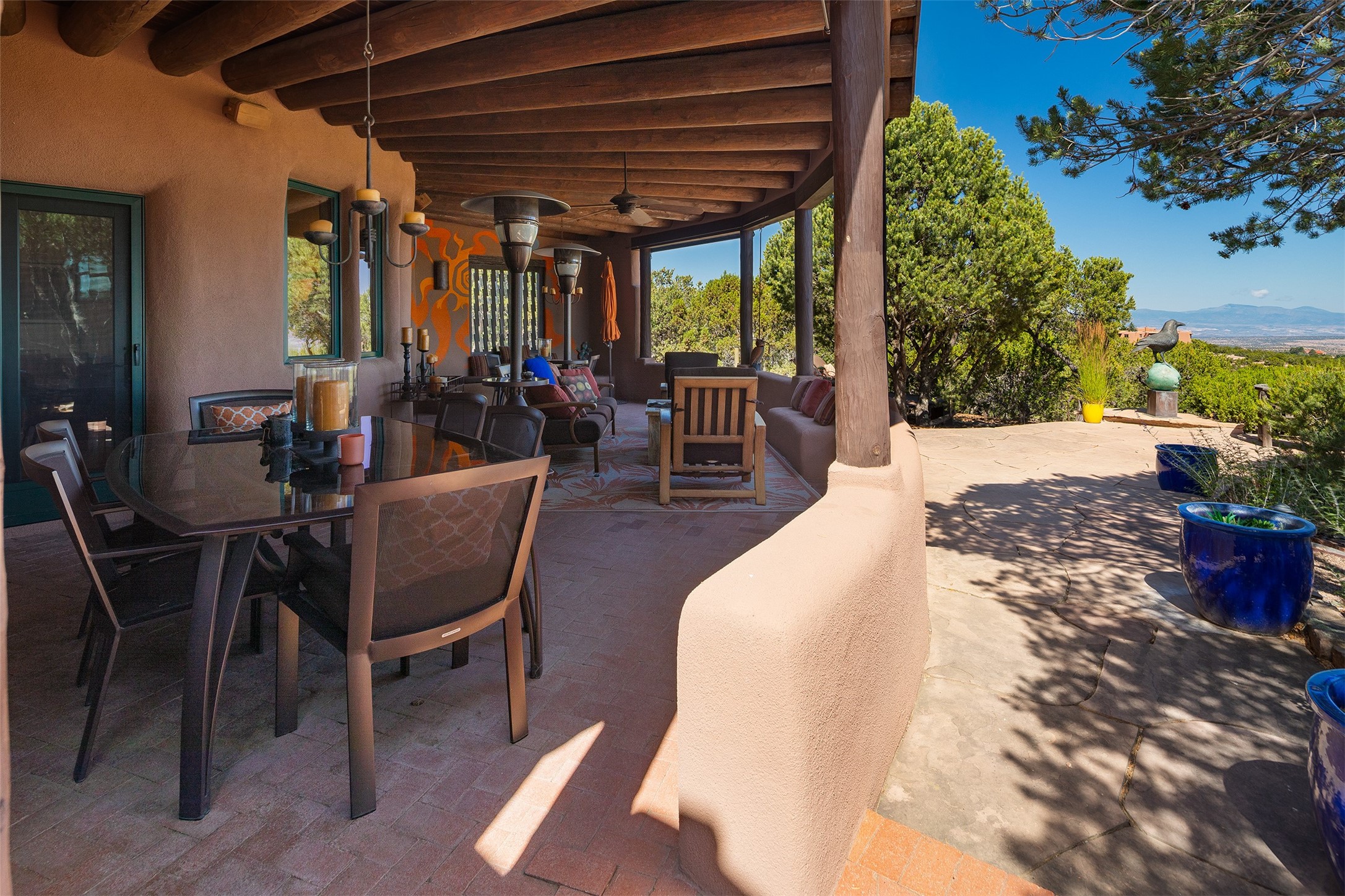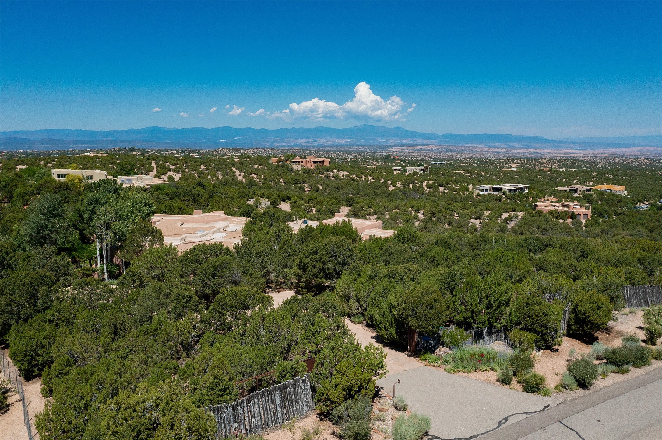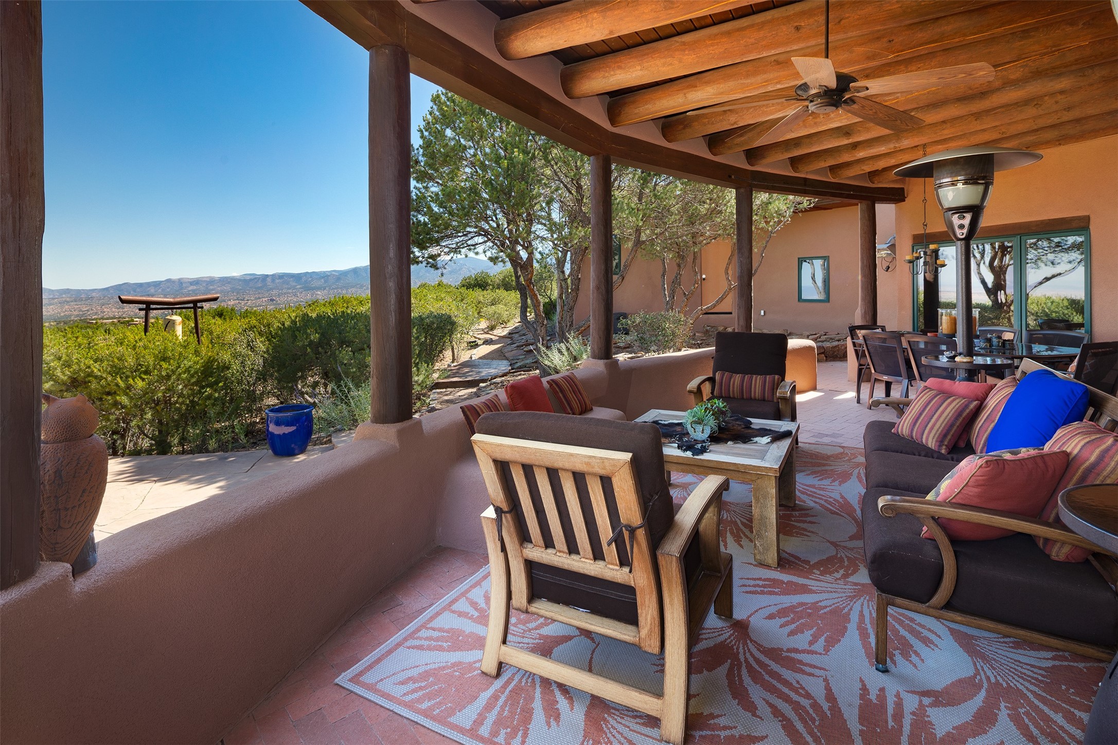 Your spirit will soar as you take in the view and mountains from this beautiful and inviting Santa Fe hacienda! Tucked in on 3.194 acres, so private with forever views, yet only 5 minutes to Market Street and Jinga Restaurant. Well- constructed with plastered walls, 5 wood-burning fireplaces, brick floors, traditional ceiling treatments, spacious main outdoor portal with Jemez views plus a private portal off the primary suite with Sangre & Jemez views. The original part of the house is adobe, built in the mid-1980's & the house was enlarged in 1999 with famed architect Richard Martinez at the helm, designing a stunning primary suite with a small library, separate office with built-ins (& the mesmerizing views), an ample gathering room for TV & music, and a casual dining room. Richard returned in Nov 2012 to design a small guest house, which was not built, but the site is shown on the plat for information only. The wonderful flow of this home includes approx. 5317 square feet: 4 bedrooms, 4 baths (2 Full, two ), formal dining & casual dining, two living areas, office. Radiant heat (the good kind) in the floor, 3 mini-splits for AC. NO HOA. This home offers grace, warmth & sophistication in a location that gives an elevated Santa Fe experience with views sunrise to sunset. Enjoy the video!