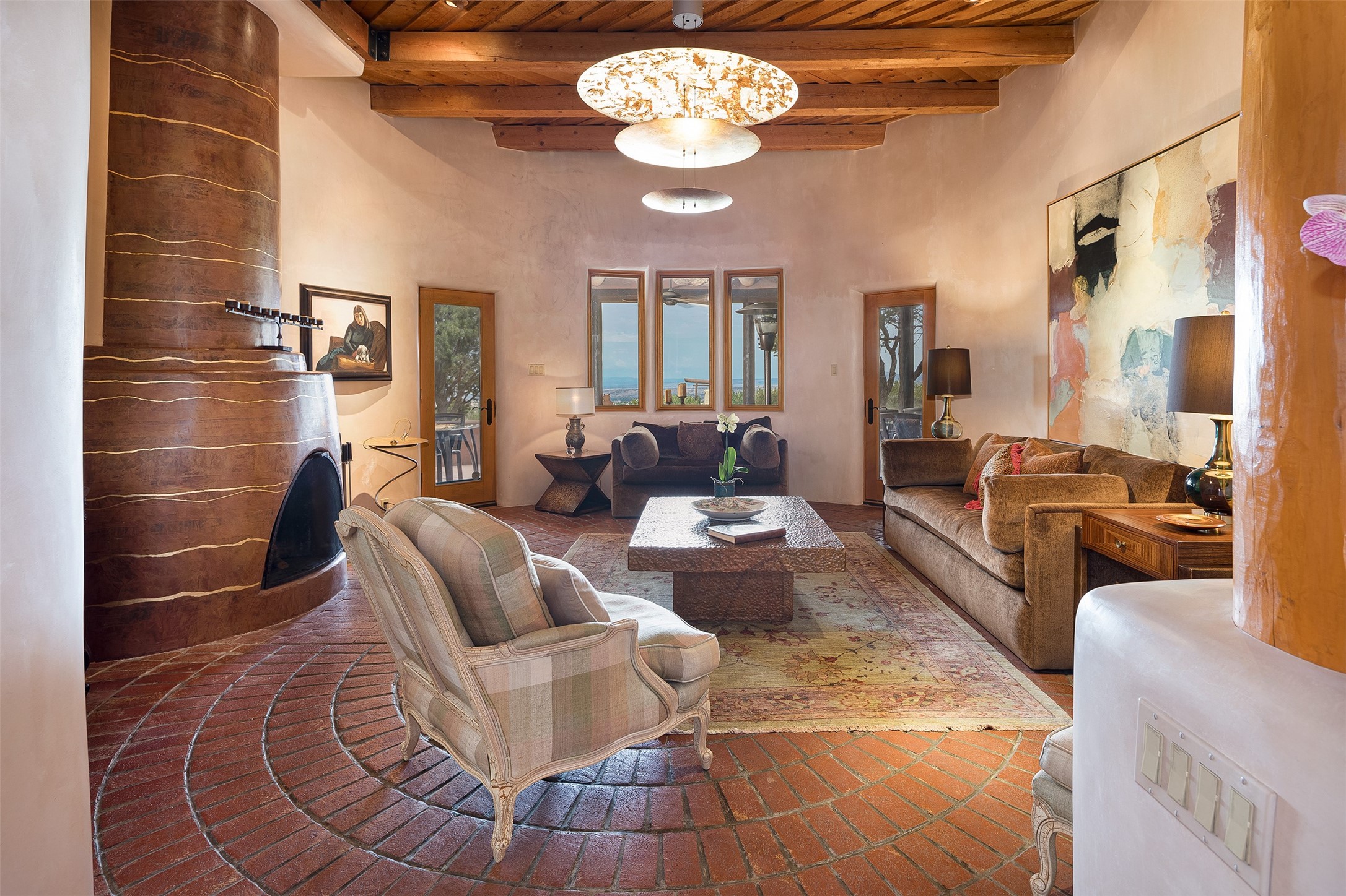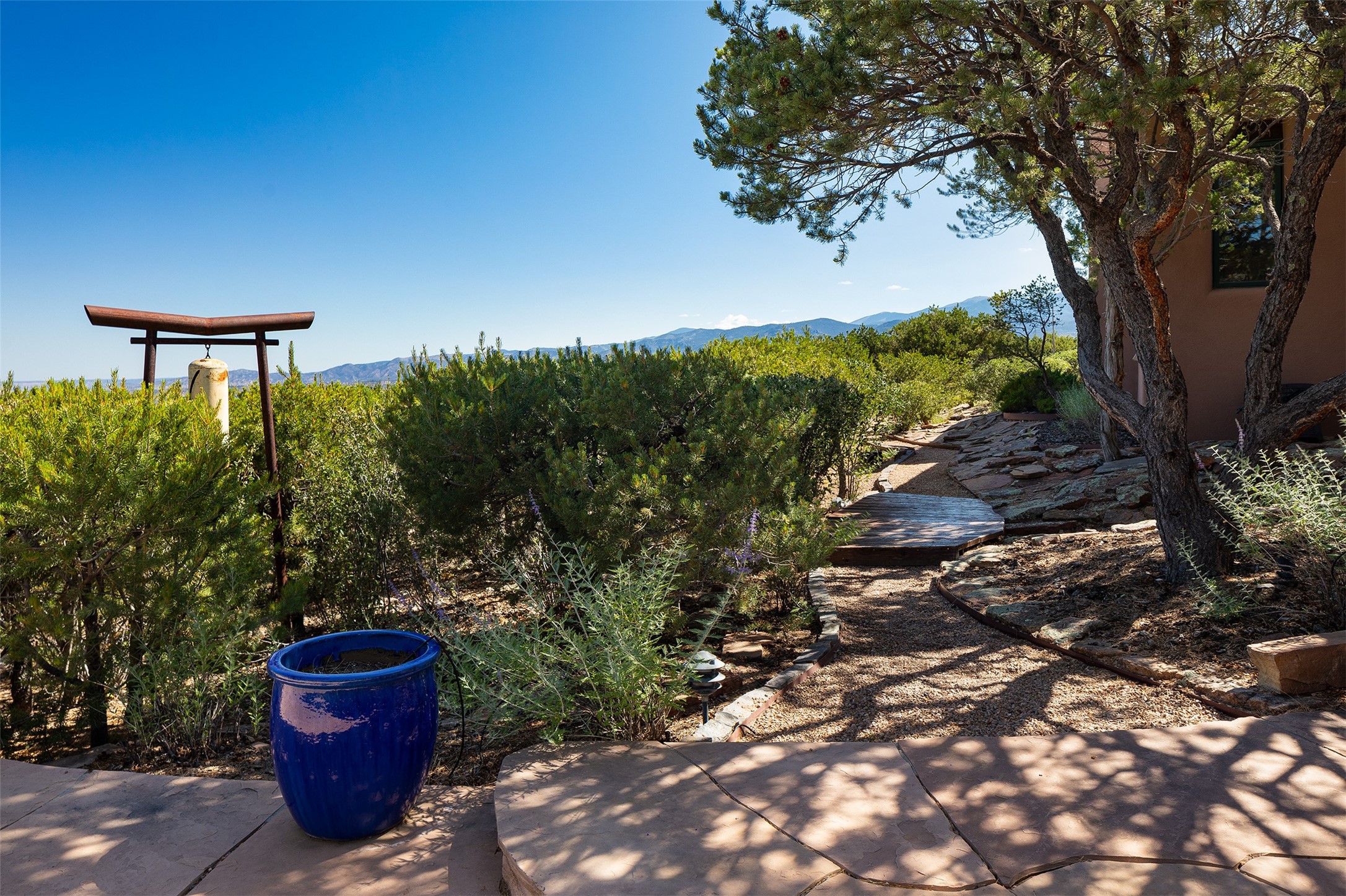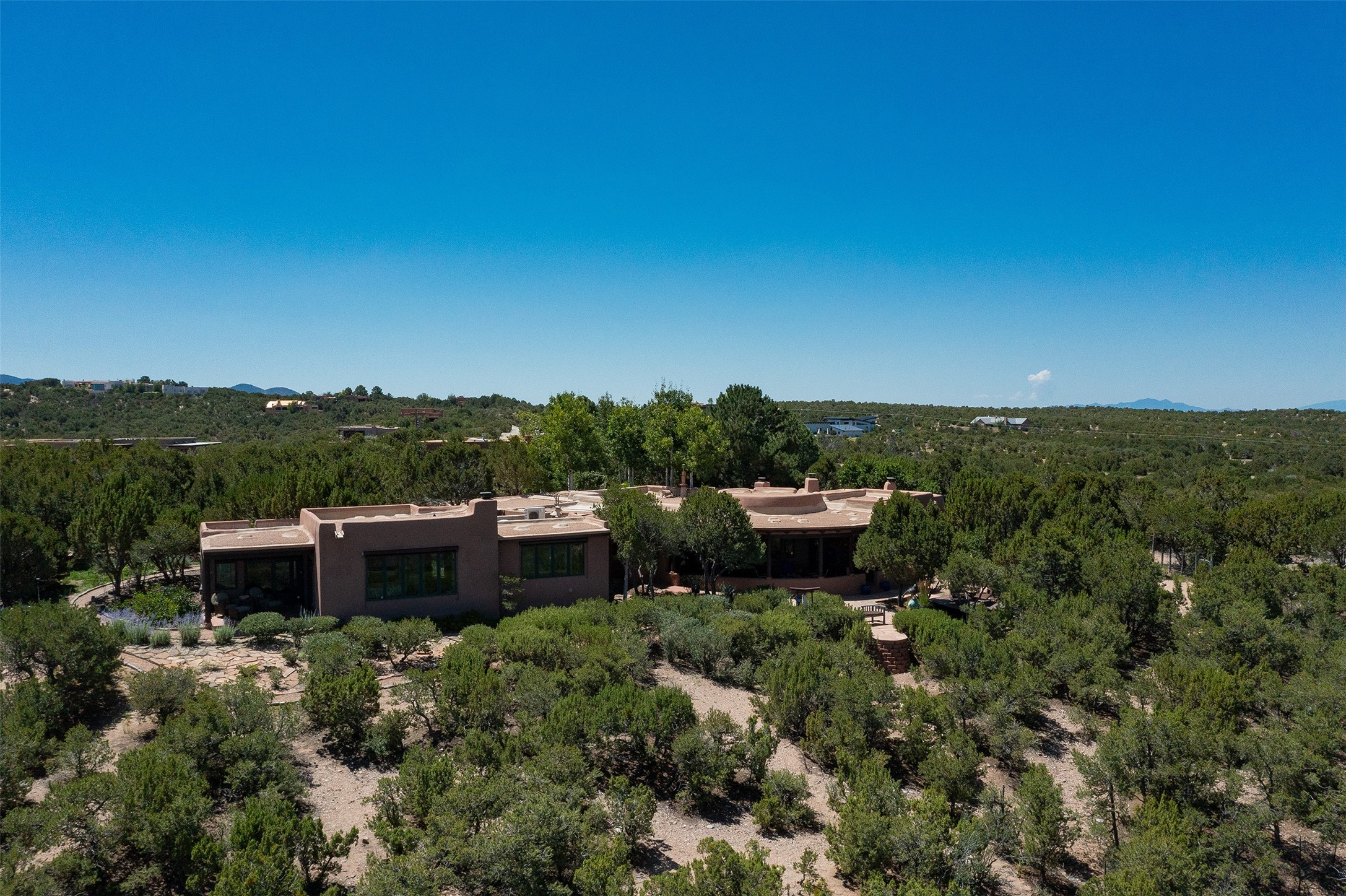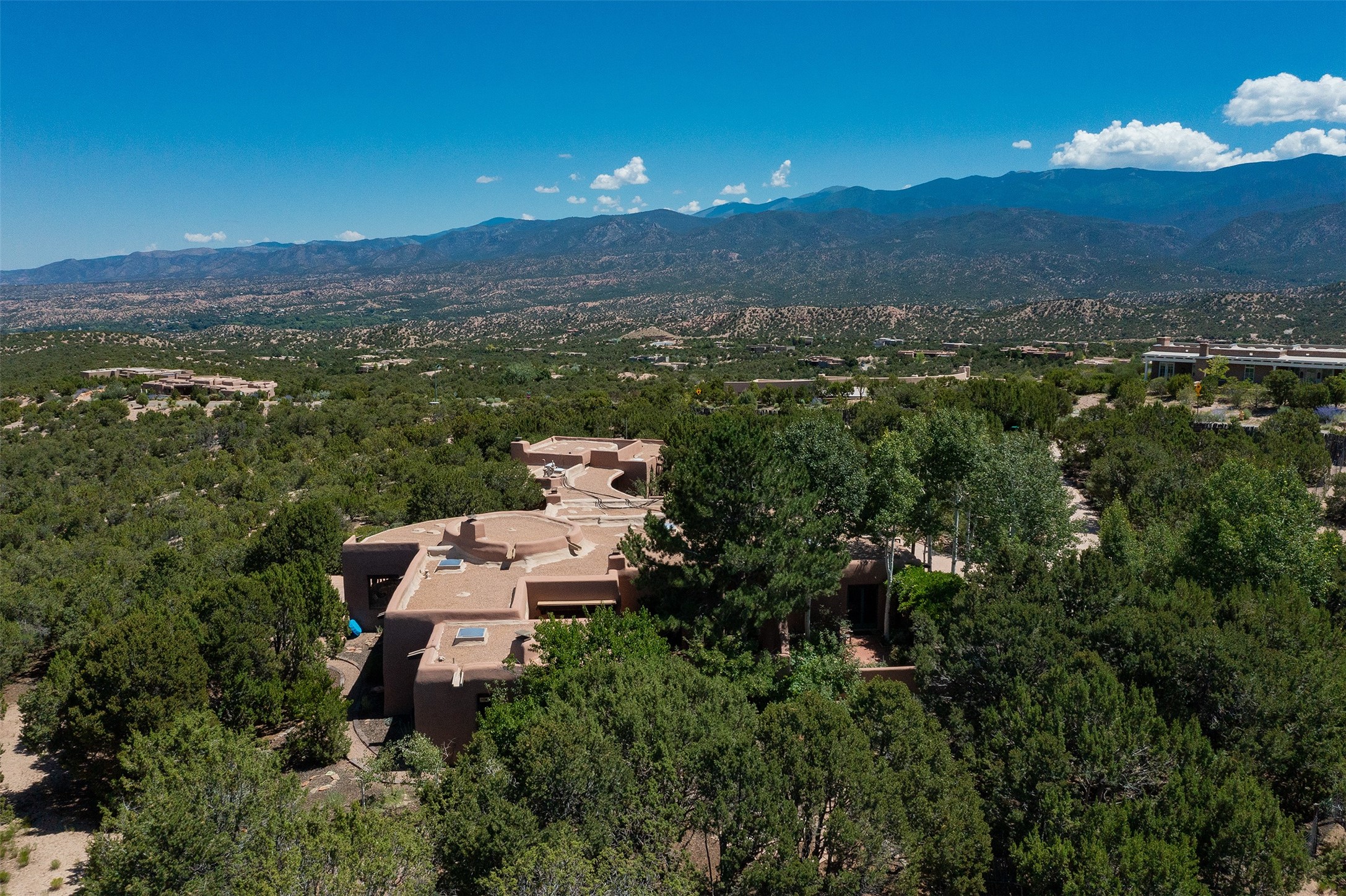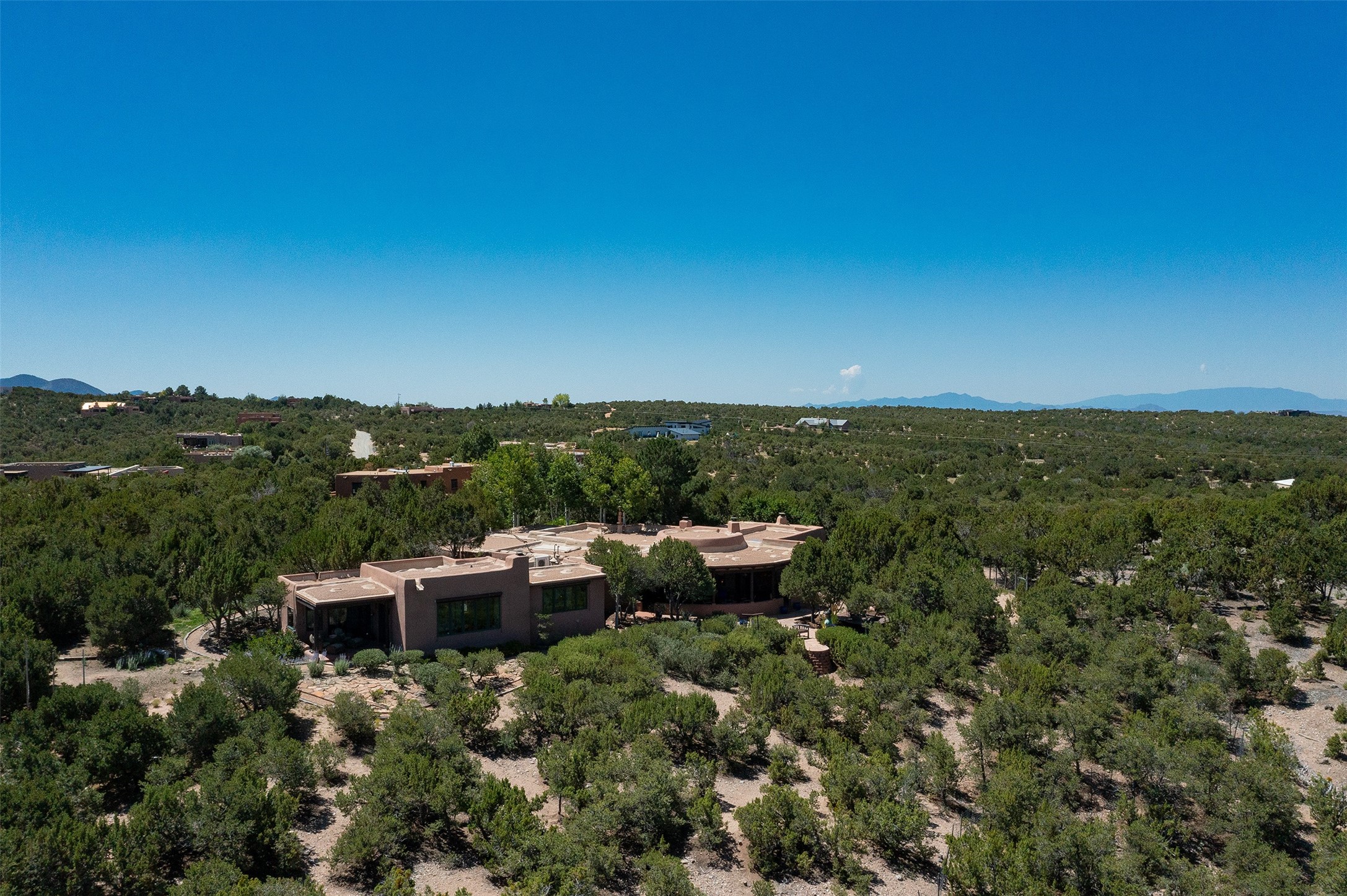 Your spirit will soar as you take in the view and mountains from this beautiful and inviting Santa Fe hacienda! Tucked in on 3.194 acres, so private with forever views, yet only 5 minutes to Market Street and Jinga Restaurant. Well- constructed with plastered walls, 5 wood-burning fireplaces, brick floors, traditional ceiling treatments, spacious main outdoor portal with Jemez views plus a private portal off the primary suite with Sangre & Jemez views. The original part of the house is adobe, built in the mid-1980's & the house was enlarged in 1999 with famed architect Richard Martinez at the helm, designing a stunning primary suite with a small library, separate office with built-ins (& the mesmerizing views), an ample gathering room for TV & music, and a casual dining room. Richard returned in Nov 2012 to design a small guest house, which was not built, but the site is shown on the plat for information only. The wonderful flow of this home includes approx. 5317 square feet: 4 bedrooms, 4 baths (2 Full, two ), formal dining & casual dining, two living areas, office. Radiant heat (the good kind) in the floor, 3 mini-splits for AC. NO HOA. This home offers grace, warmth & sophistication in a location that gives an elevated Santa Fe experience with views sunrise to sunset. Enjoy the video!