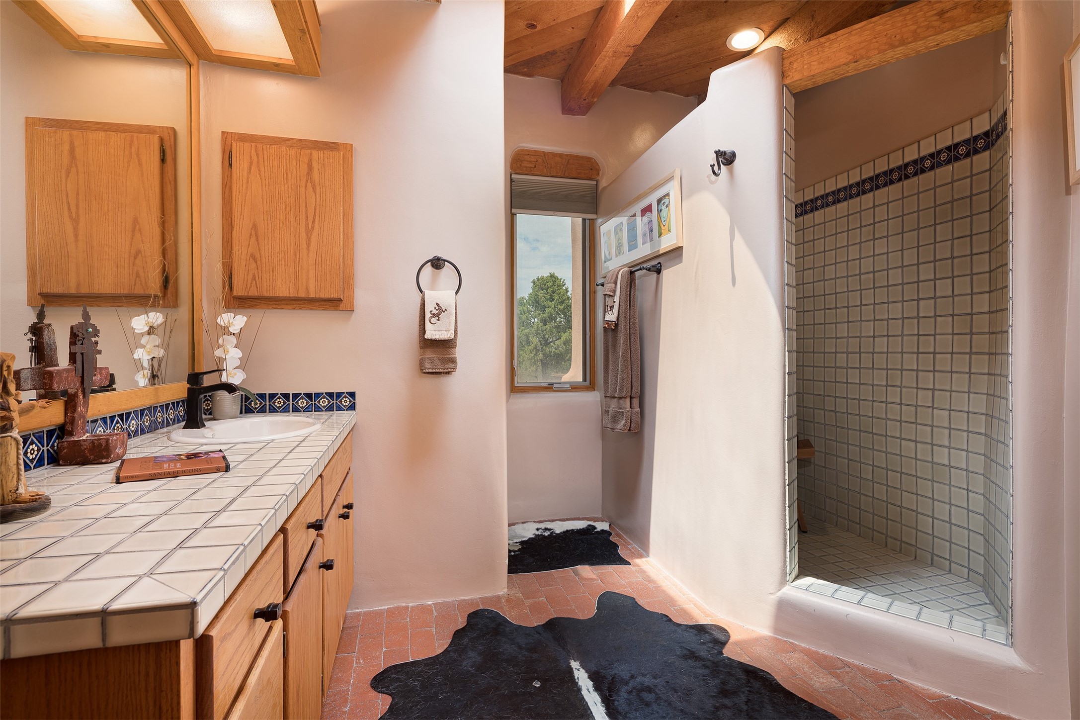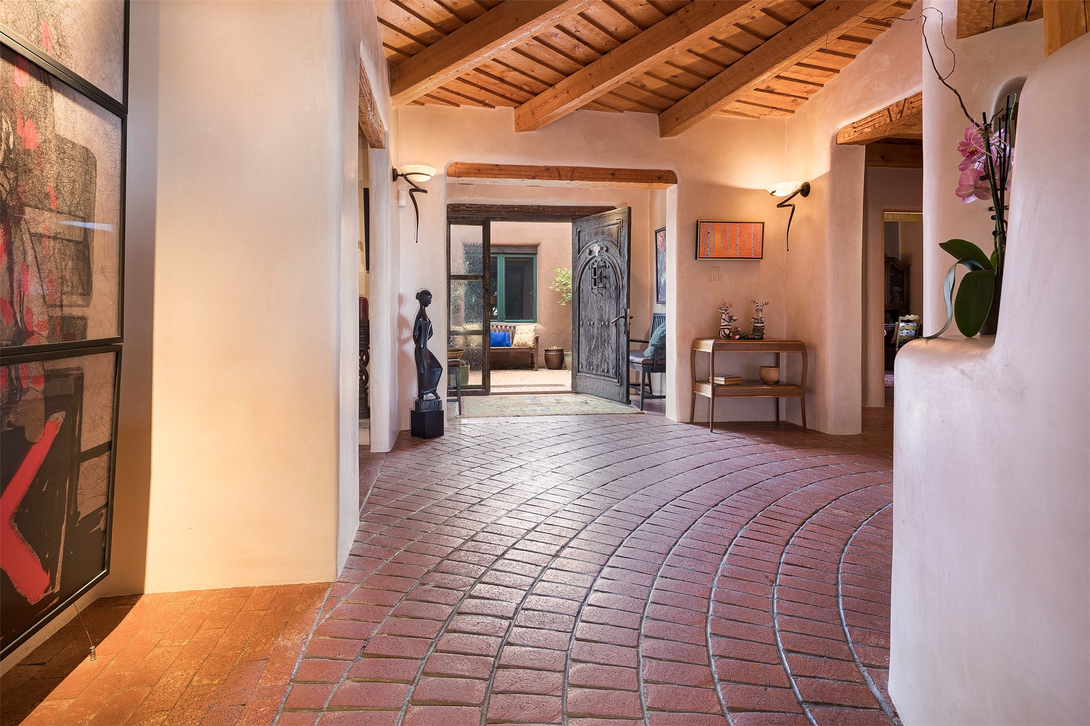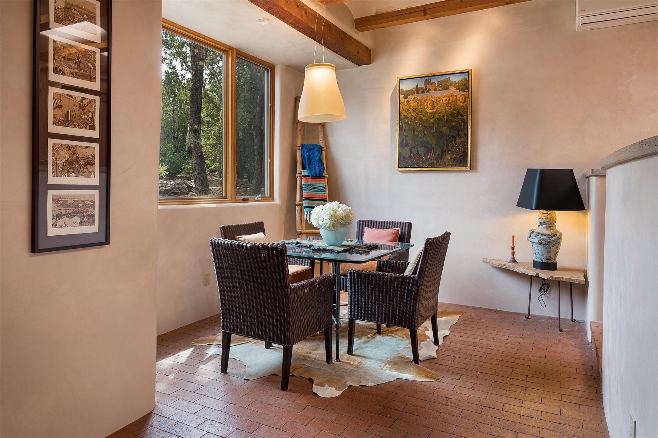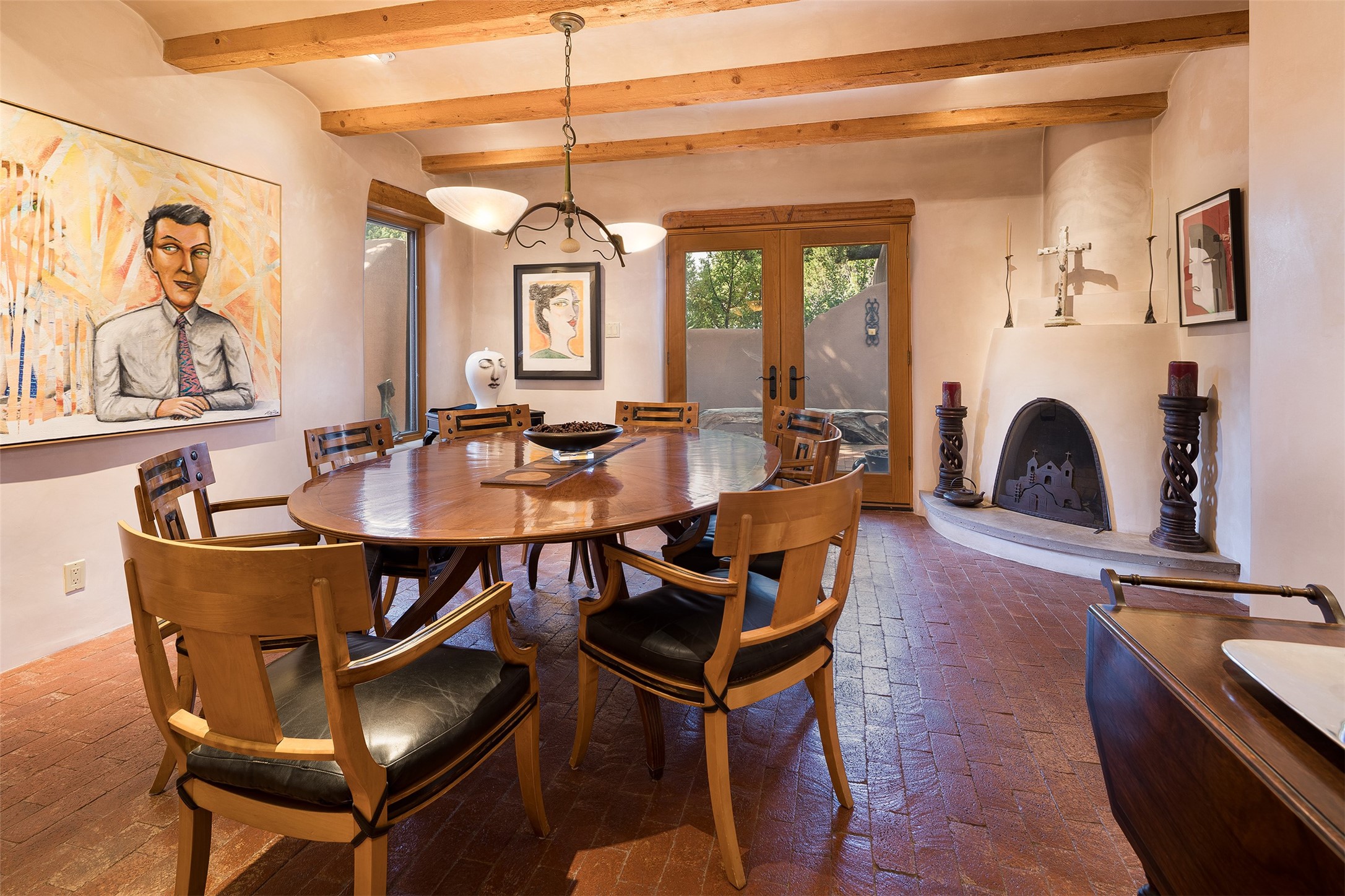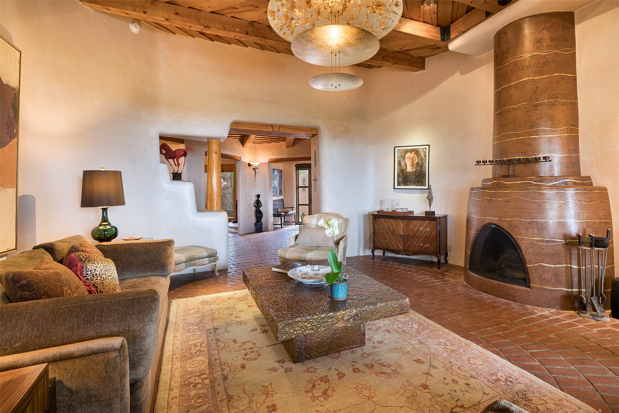 Your spirit will soar as you take in the view and mountains from this beautiful and inviting Santa Fe hacienda! Tucked in on 3.194 acres, so private with forever views, yet only 5 minutes to Market Street and Jinga Restaurant. Well- constructed with plastered walls, 5 wood-burning fireplaces, brick floors, traditional ceiling treatments, spacious main outdoor portal with Jemez views plus a private portal off the primary suite with Sangre & Jemez views. The original part of the house is adobe, built in the mid-1980's & the house was enlarged in 1999 with famed architect Richard Martinez at the helm, designing a stunning primary suite with a small library, separate office with built-ins (& the mesmerizing views), an ample gathering room for TV & music, and a casual dining room. Richard returned in Nov 2012 to design a small guest house, which was not built, but the site is shown on the plat for information only. The wonderful flow of this home includes approx. 5317 square feet: 4 bedrooms, 4 baths (2 Full, two ), formal dining & casual dining, two living areas, office. Radiant heat (the good kind) in the floor, 3 mini-splits for AC. NO HOA. This home offers grace, warmth & sophistication in a location that gives an elevated Santa Fe experience with views sunrise to sunset. Enjoy the video!