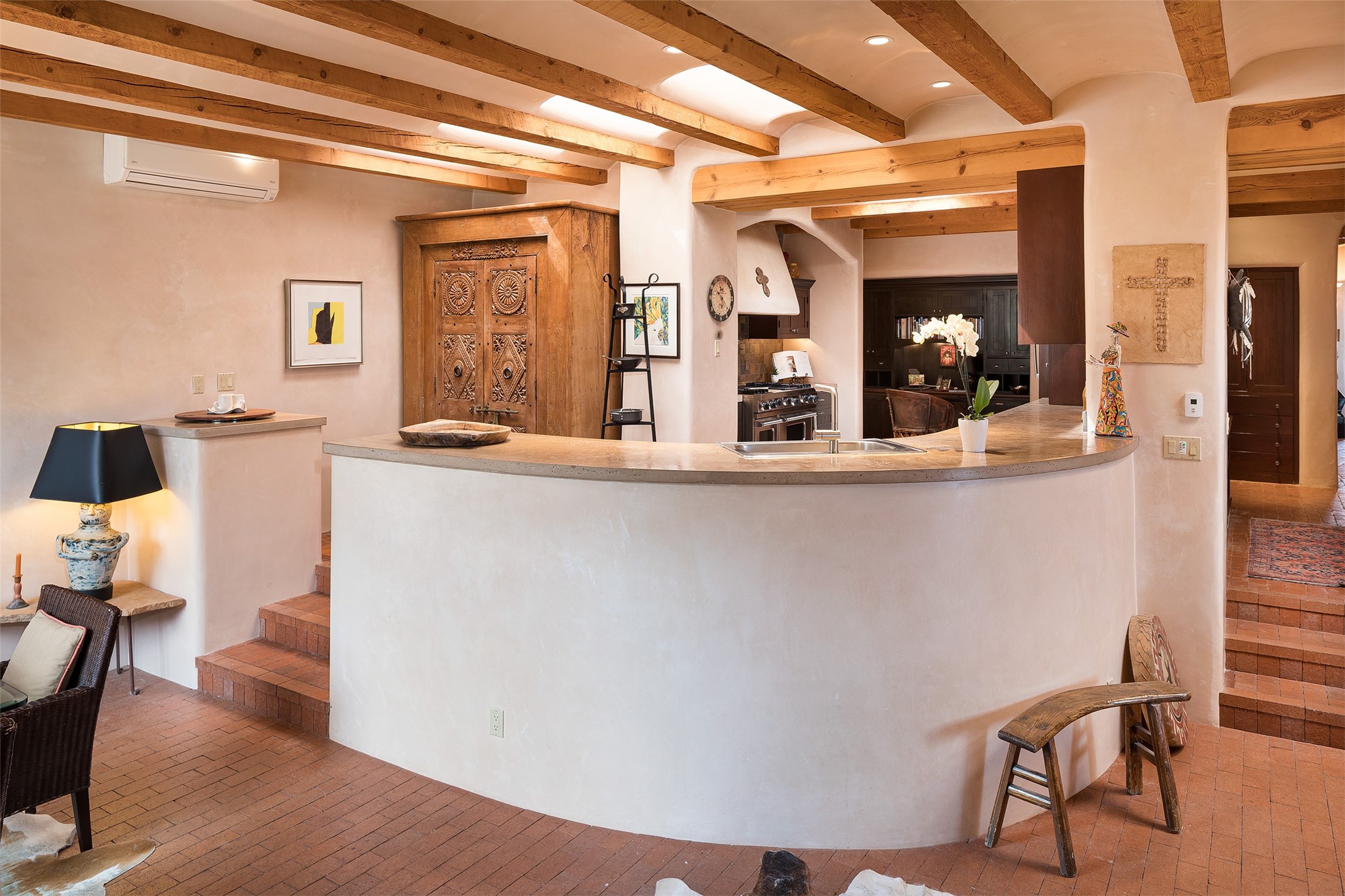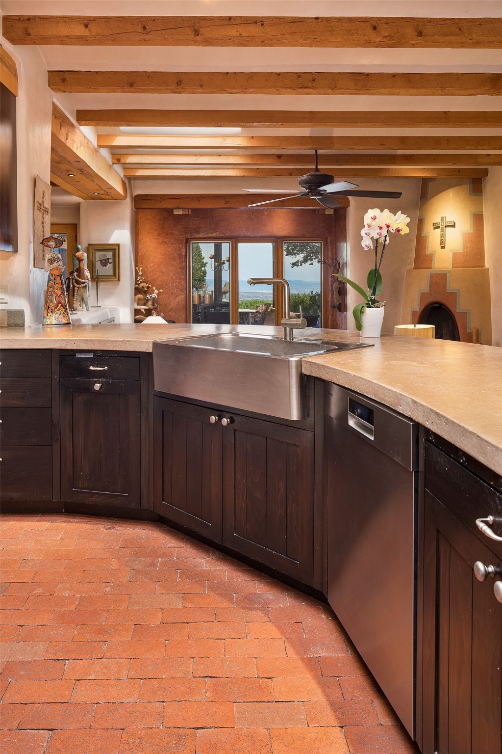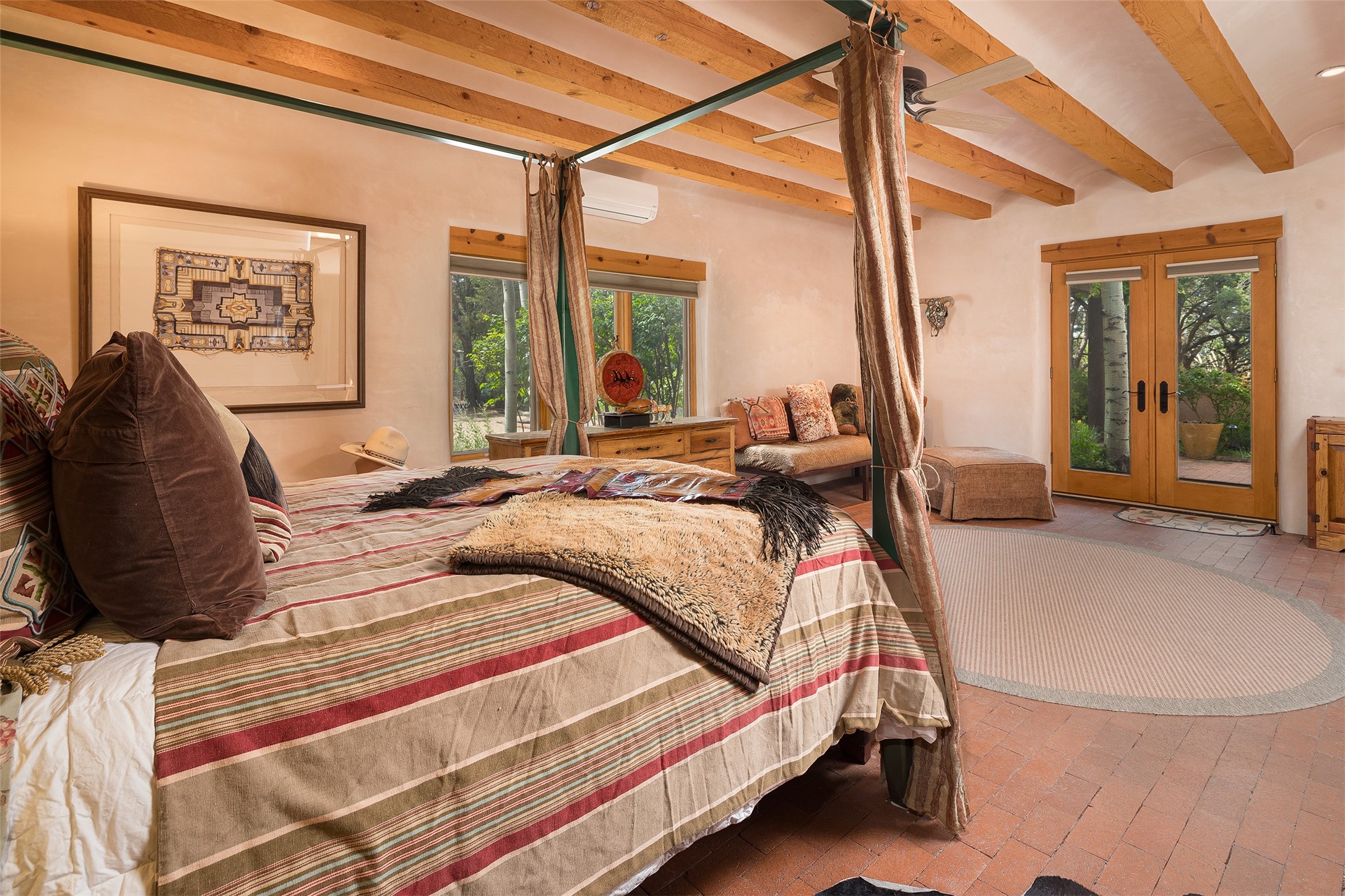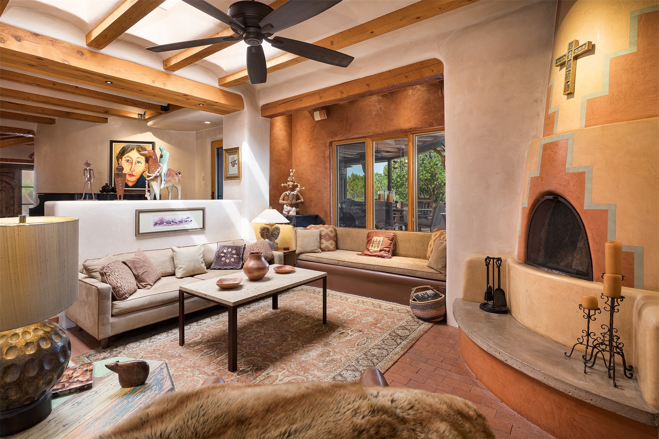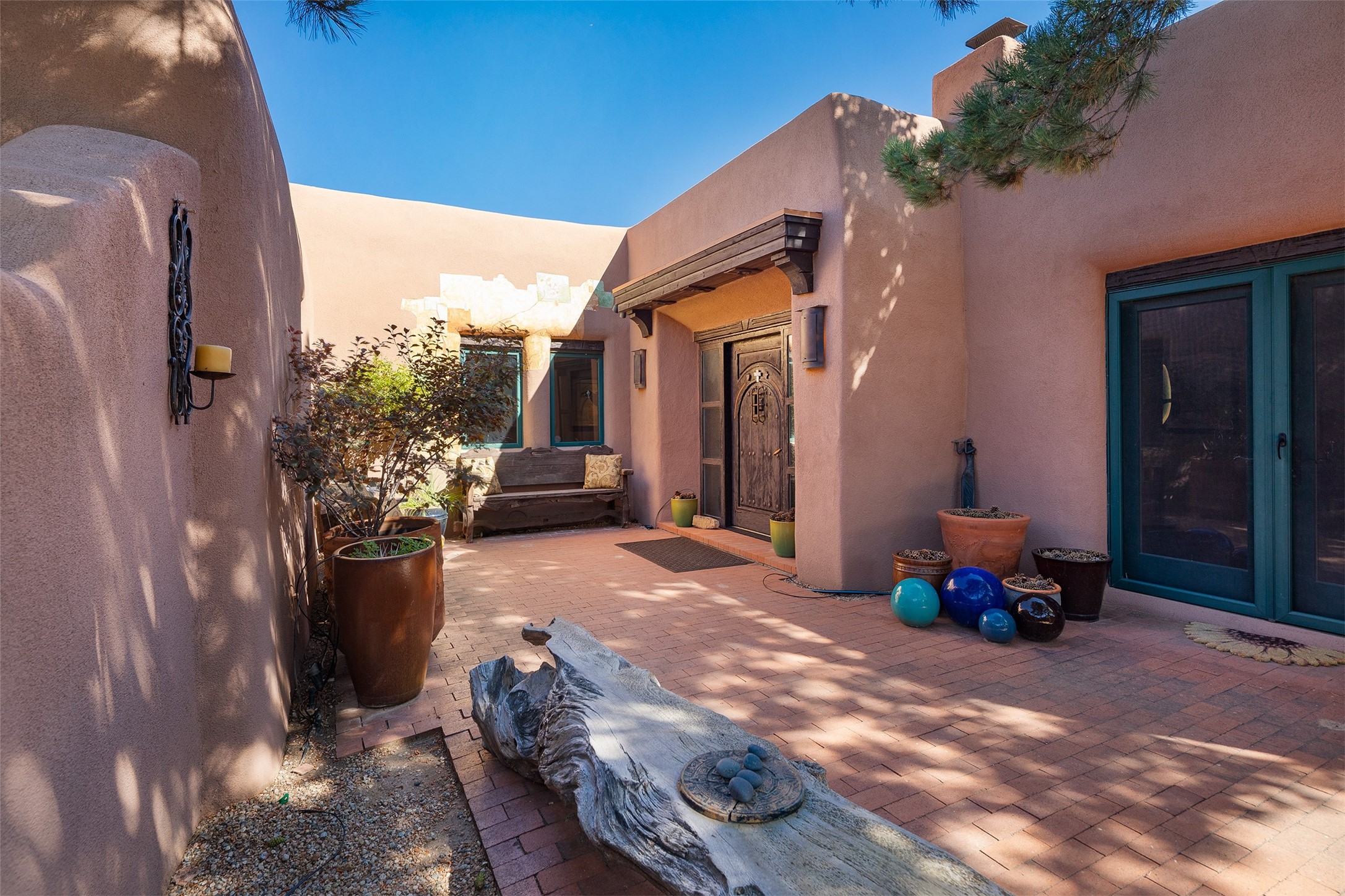 Your spirit will soar as you take in the view and mountains from this beautiful and inviting Santa Fe hacienda! Tucked in on 3.194 acres, so private with forever views, yet only 5 minutes to Market Street and Jinga Restaurant. Well- constructed with plastered walls, 5 wood-burning fireplaces, brick floors, traditional ceiling treatments, spacious main outdoor portal with Jemez views plus a private portal off the primary suite with Sangre & Jemez views. The original part of the house is adobe, built in the mid-1980's & the house was enlarged in 1999 with famed architect Richard Martinez at the helm, designing a stunning primary suite with a small library, separate office with built-ins (& the mesmerizing views), an ample gathering room for TV & music, and a casual dining room. Richard returned in Nov 2012 to design a small guest house, which was not built, but the site is shown on the plat for information only. The wonderful flow of this home includes approx. 5317 square feet: 4 bedrooms, 4 baths (2 Full, two ), formal dining & casual dining, two living areas, office. Radiant heat (the good kind) in the floor, 3 mini-splits for AC. NO HOA. This home offers grace, warmth & sophistication in a location that gives an elevated Santa Fe experience with views sunrise to sunset. Enjoy the video!