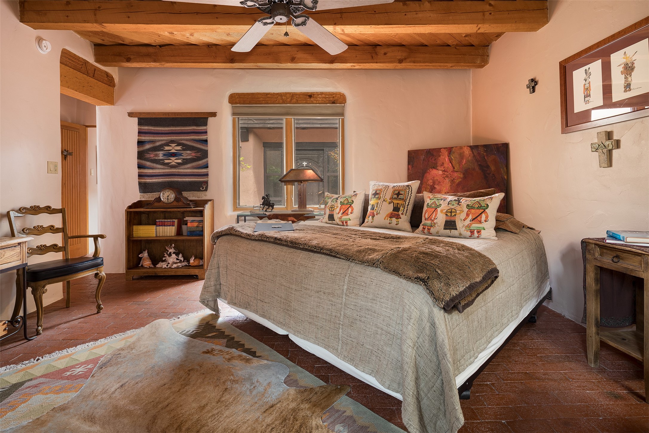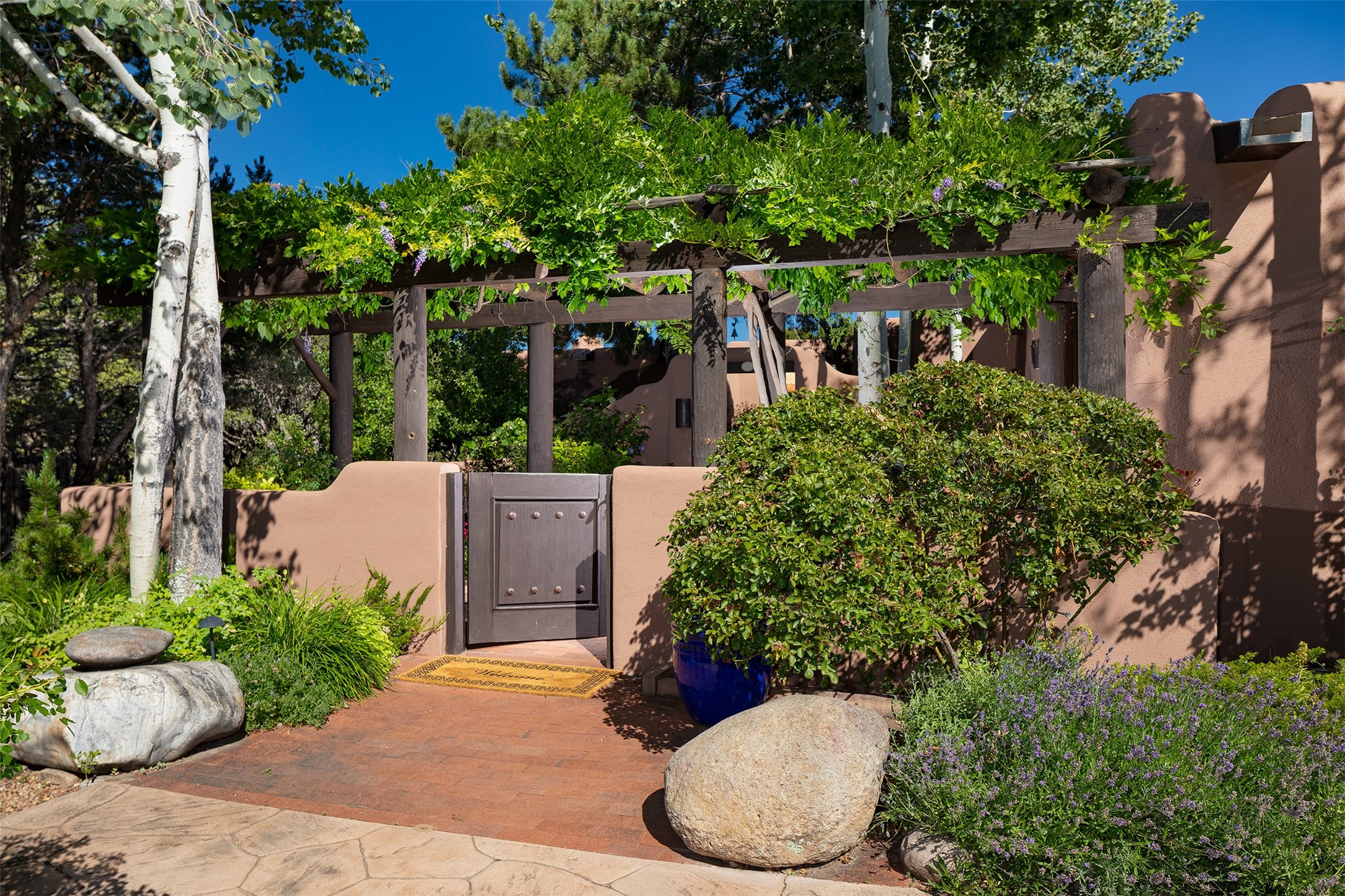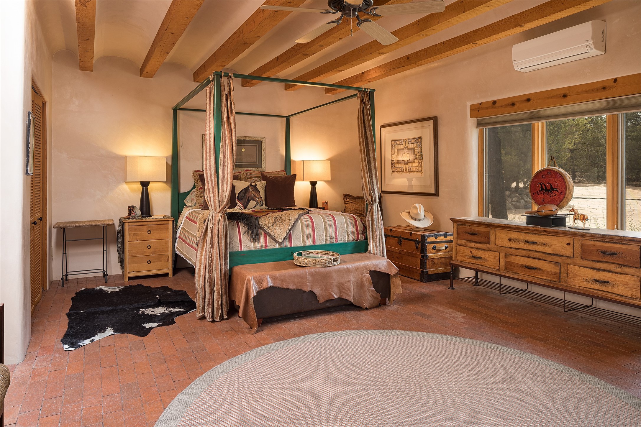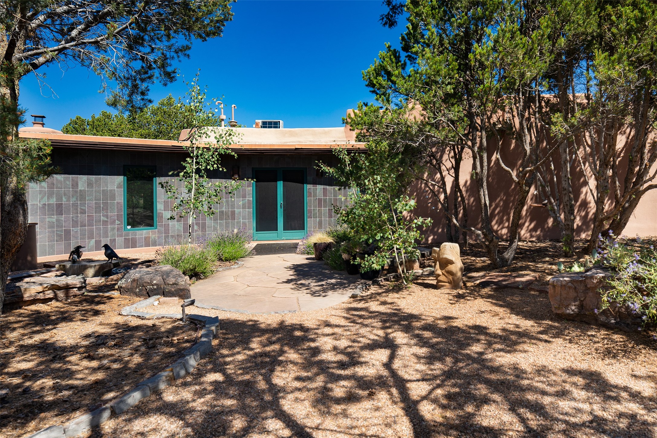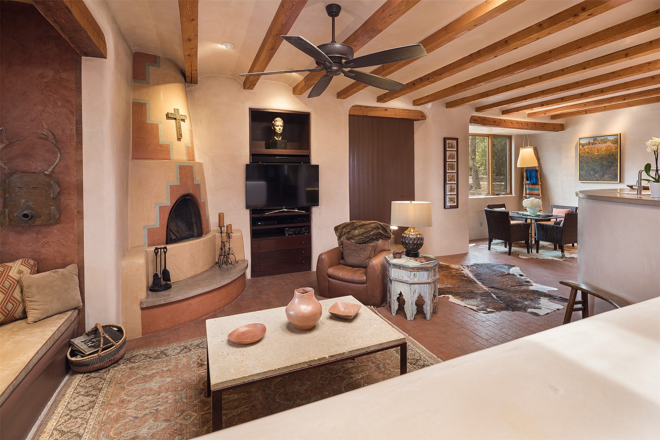 Your spirit will soar as you take in the view and mountains from this beautiful and inviting Santa Fe hacienda! Tucked in on 3.194 acres, so private with forever views, yet only 5 minutes to Market Street and Jinga Restaurant. Well- constructed with plastered walls, 5 wood-burning fireplaces, brick floors, traditional ceiling treatments, spacious main outdoor portal with Jemez views plus a private portal off the primary suite with Sangre & Jemez views. The original part of the house is adobe, built in the mid-1980's & the house was enlarged in 1999 with famed architect Richard Martinez at the helm, designing a stunning primary suite with a small library, separate office with built-ins (& the mesmerizing views), an ample gathering room for TV & music, and a casual dining room. Richard returned in Nov 2012 to design a small guest house, which was not built, but the site is shown on the plat for information only. The wonderful flow of this home includes approx. 5317 square feet: 4 bedrooms, 4 baths (2 Full, two ), formal dining & casual dining, two living areas, office. Radiant heat (the good kind) in the floor, 3 mini-splits for AC. NO HOA. This home offers grace, warmth & sophistication in a location that gives an elevated Santa Fe experience with views sunrise to sunset. Enjoy the video!