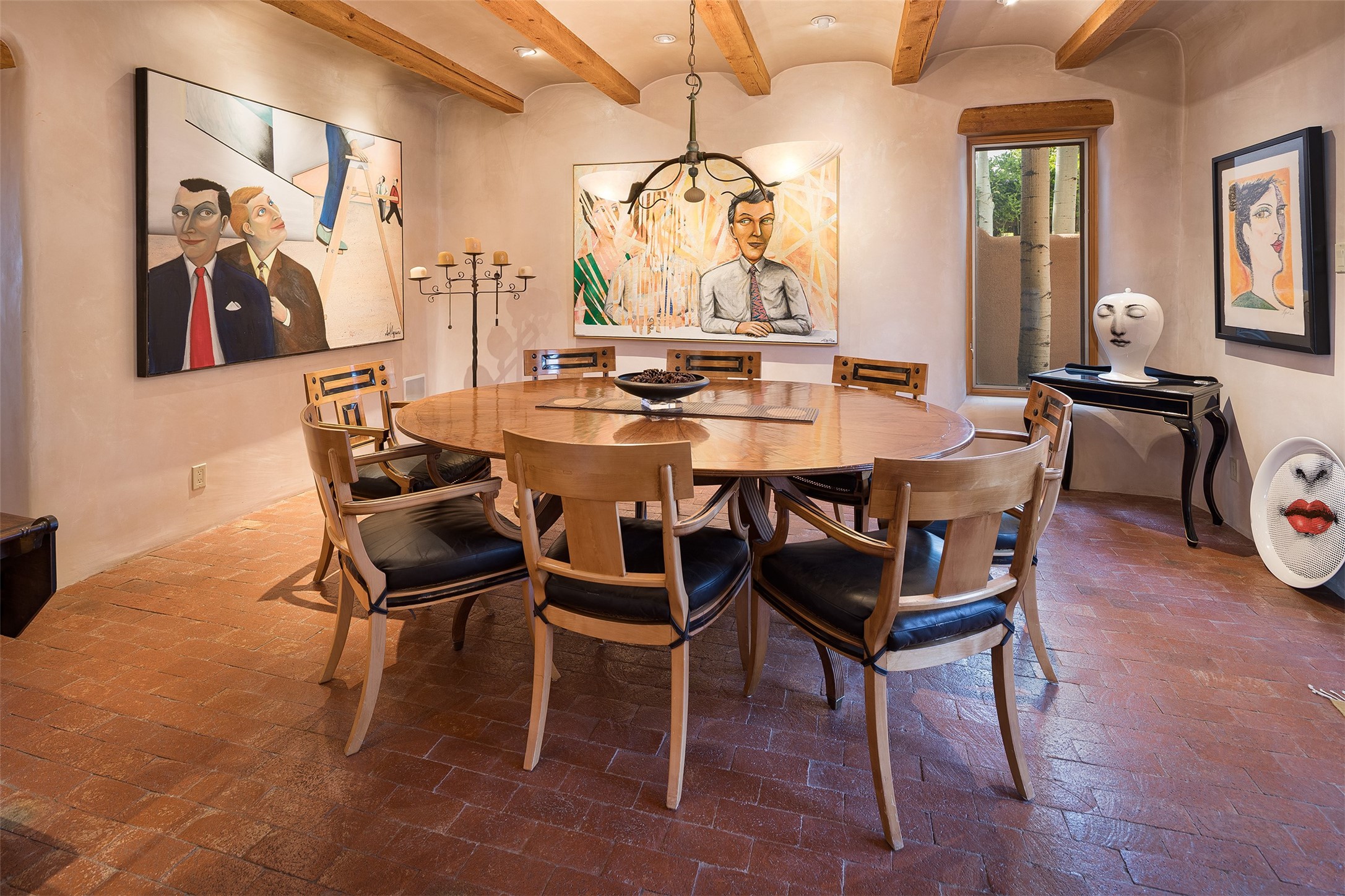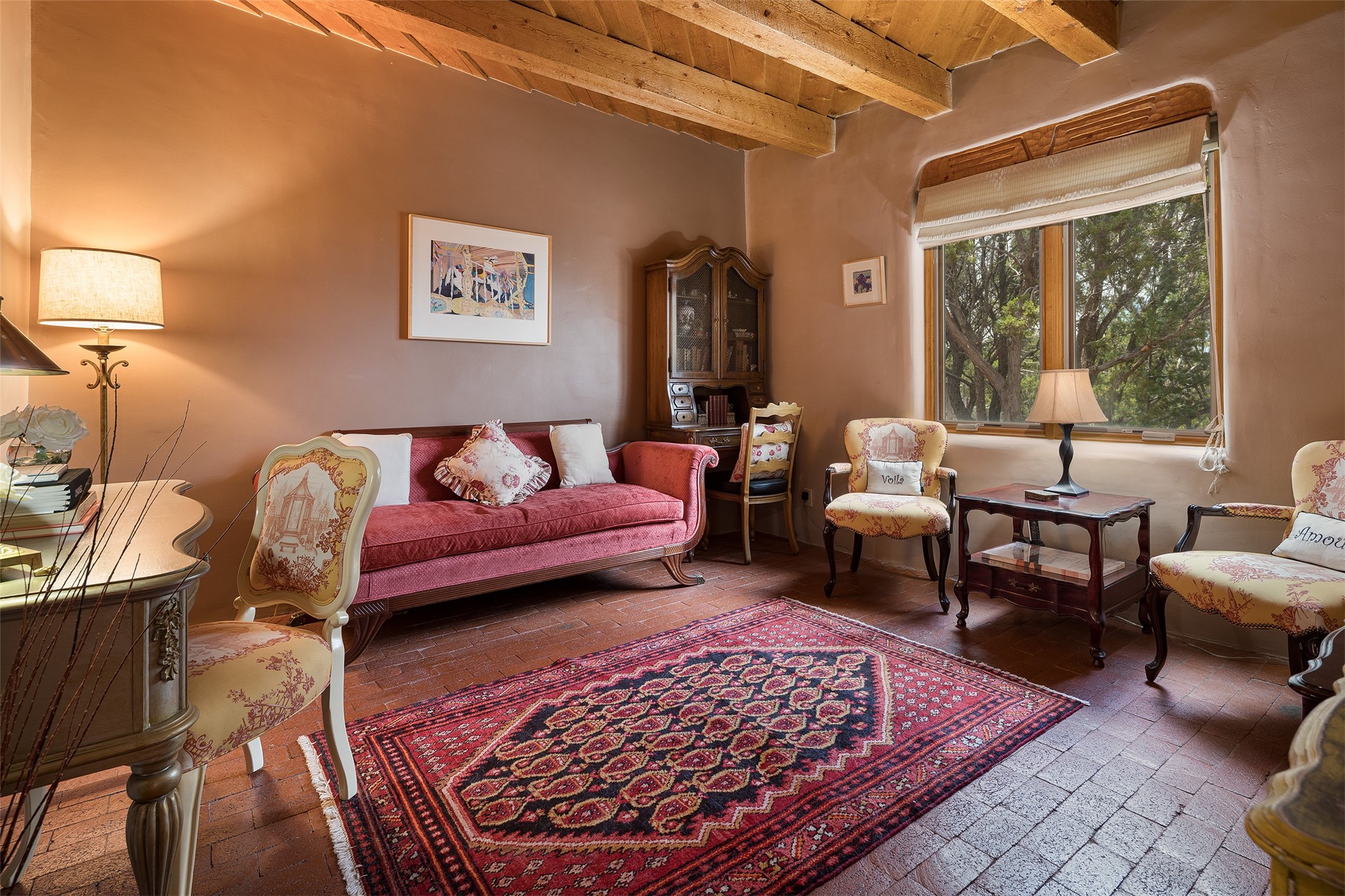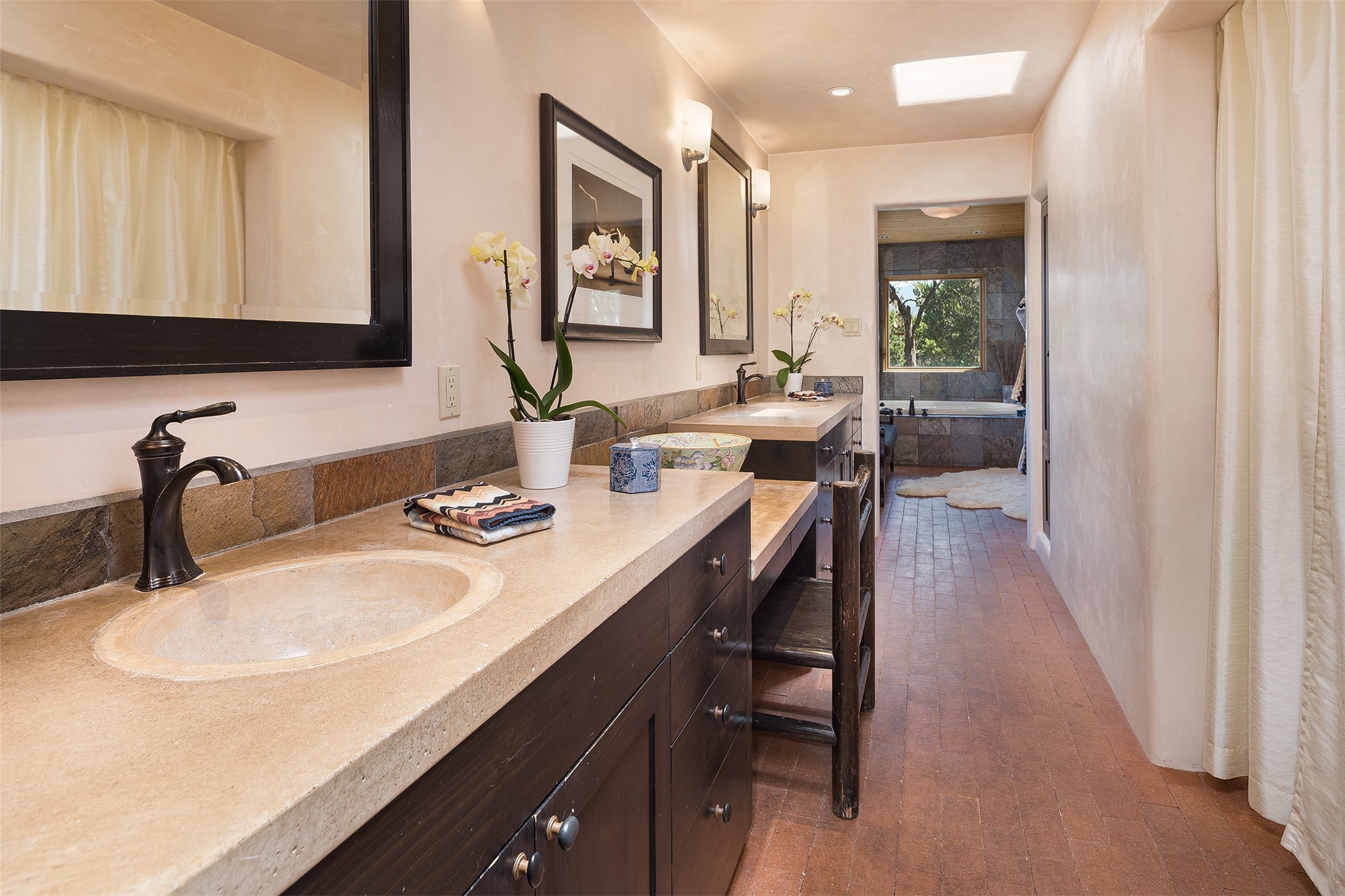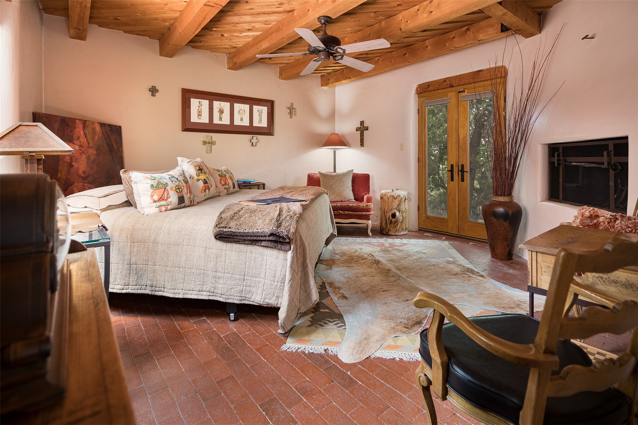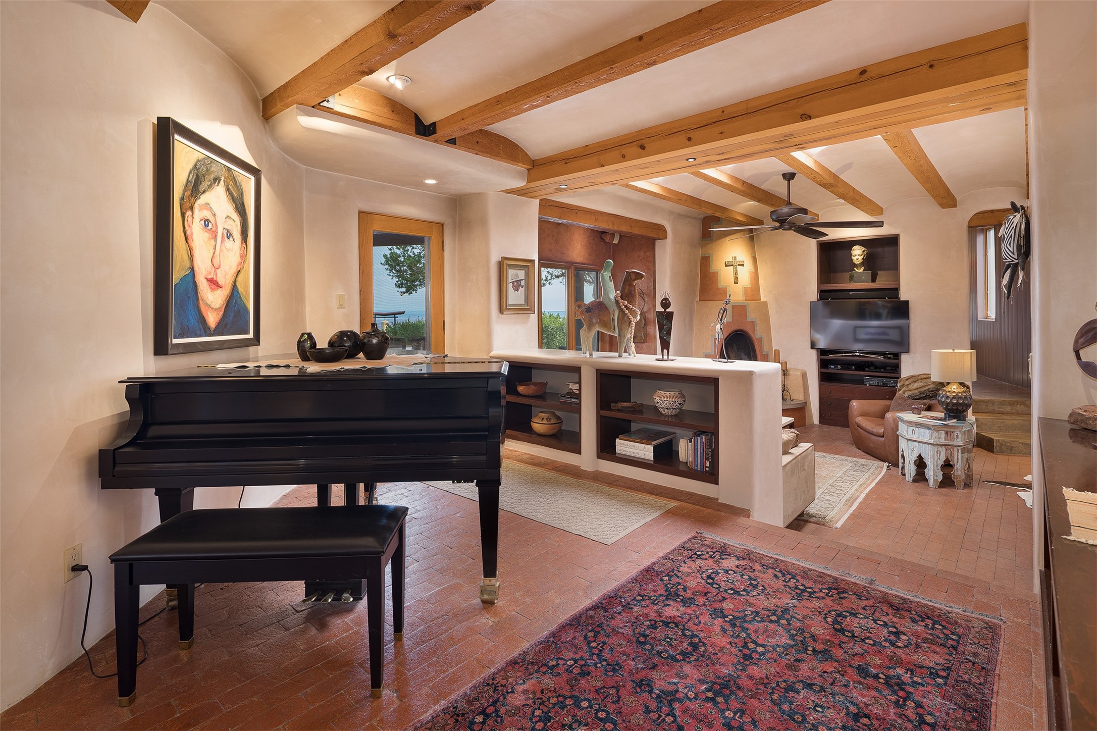 Your spirit will soar as you take in the view and mountains from this beautiful and inviting Santa Fe hacienda! Tucked in on 3.194 acres, so private with forever views, yet only 5 minutes to Market Street and Jinga Restaurant. Well- constructed with plastered walls, 5 wood-burning fireplaces, brick floors, traditional ceiling treatments, spacious main outdoor portal with Jemez views plus a private portal off the primary suite with Sangre & Jemez views. The original part of the house is adobe, built in the mid-1980's & the house was enlarged in 1999 with famed architect Richard Martinez at the helm, designing a stunning primary suite with a small library, separate office with built-ins (& the mesmerizing views), an ample gathering room for TV & music, and a casual dining room. Richard returned in Nov 2012 to design a small guest house, which was not built, but the site is shown on the plat for information only. The wonderful flow of this home includes approx. 5317 square feet: 4 bedrooms, 4 baths (2 Full, two ), formal dining & casual dining, two living areas, office. Radiant heat (the good kind) in the floor, 3 mini-splits for AC. NO HOA. This home offers grace, warmth & sophistication in a location that gives an elevated Santa Fe experience with views sunrise to sunset. Enjoy the video!