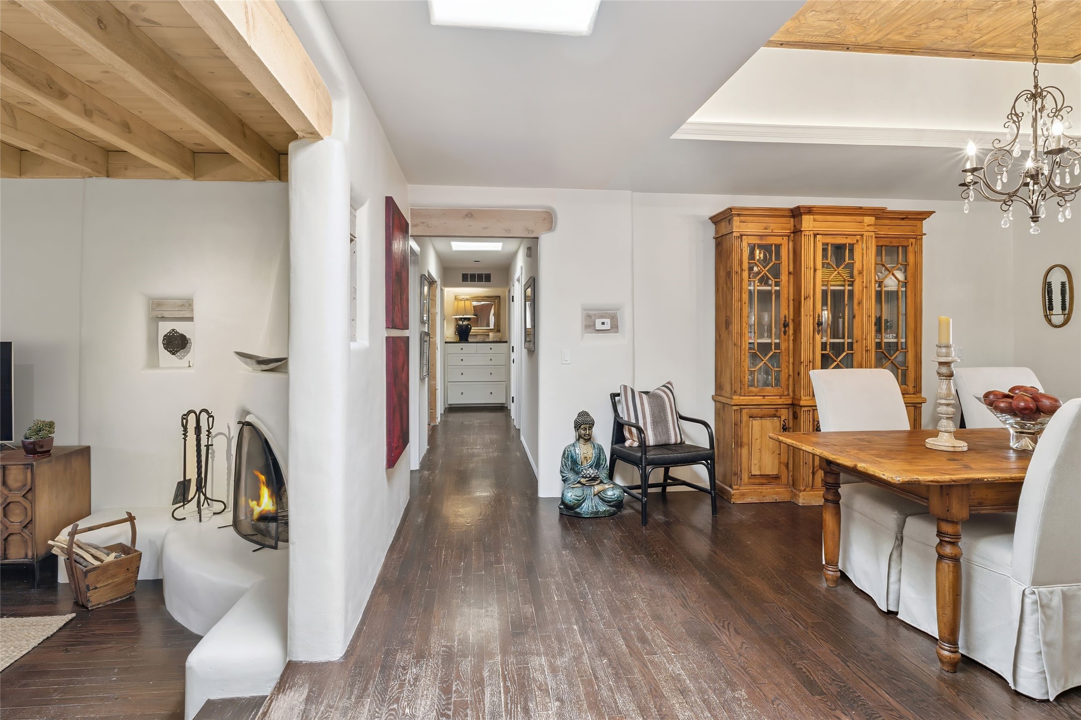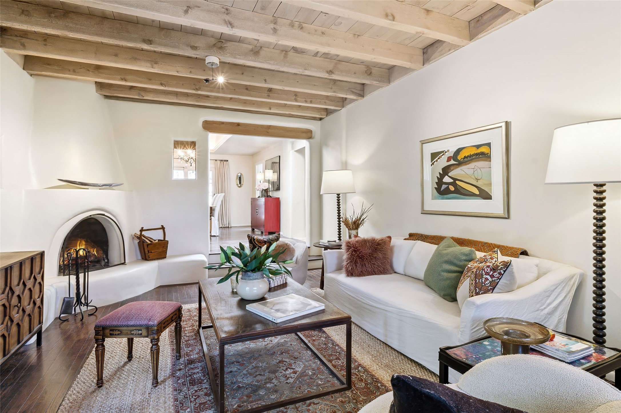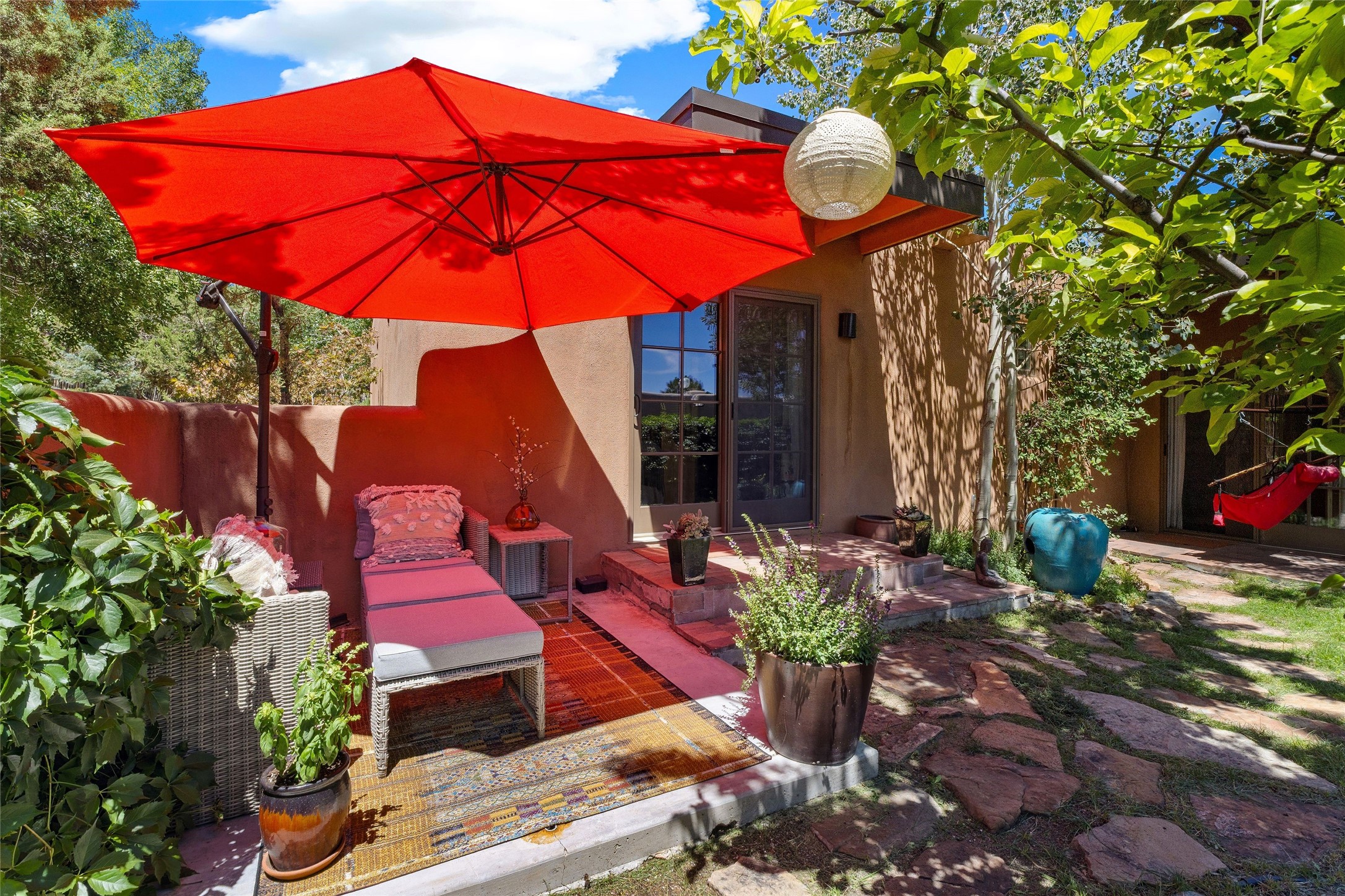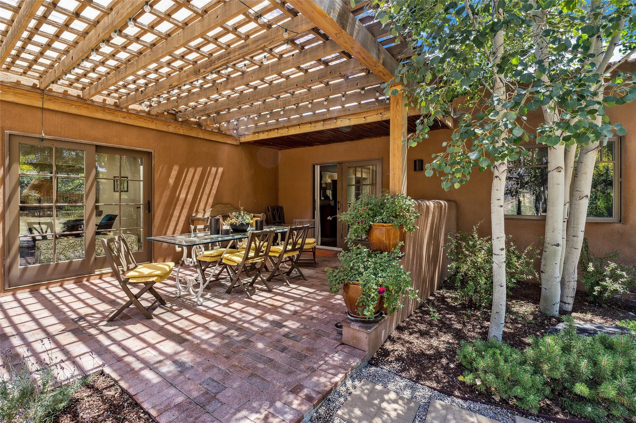 Nestled behind a private stucco-walled garden bursting with seasonal flowers, this single-level Santa Fe-style home reflects almost two decades of thoughtful design by its creative owners. Every detail tells a story--authentic, warm, and perfectly tailored for modern living. The convenient in town location is only blocks from the storied South Capital neighborhood. Step inside to discover sunlit interiors with rich hardwood floors, wood beamed ceilings, skylights, and an open flow that connects the heart of the home. The island kitchen, crowned with raised ceilings and Kitchen Aid appliances offers generous counter space and seamlessly opens to a cozy den anchored by a traditional kiva fireplace. The center hall floor plan offers a dining room with coved ceilings and views of an outdoor grilling patio with arbor. The sunken living room with corner kiva fireplace has access to the side courtyard with Aspen trees and fountain. The spacious bedrooms share an updated dual vanity bathroom with shower. The primary opens to the connecting side fountain courtyard. A luxurious laundry room, abundant storage, oversized attached two car garage and secondary gated driveway completes this home. Many updates over the years since ownership include adding landscaping, adding a front portal, replacing the windows/doors, updating the roof and stucco. Multiple outdoor living spaces invite you to savor Santa Fe's magical light--from mountain views from the front garden, morning coffee in the courtyard to evening gatherings under the stars. The landscaped grounds are a private sanctuary, with vibrant flowers and native plantings creating year-round beauty. This is more than a home--it's a carefully curated work of art, blending classic Southwestern architecture with the comfort and style of a designer's vision.