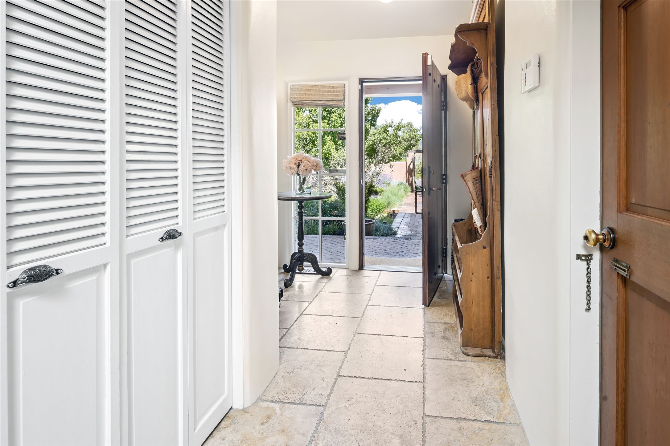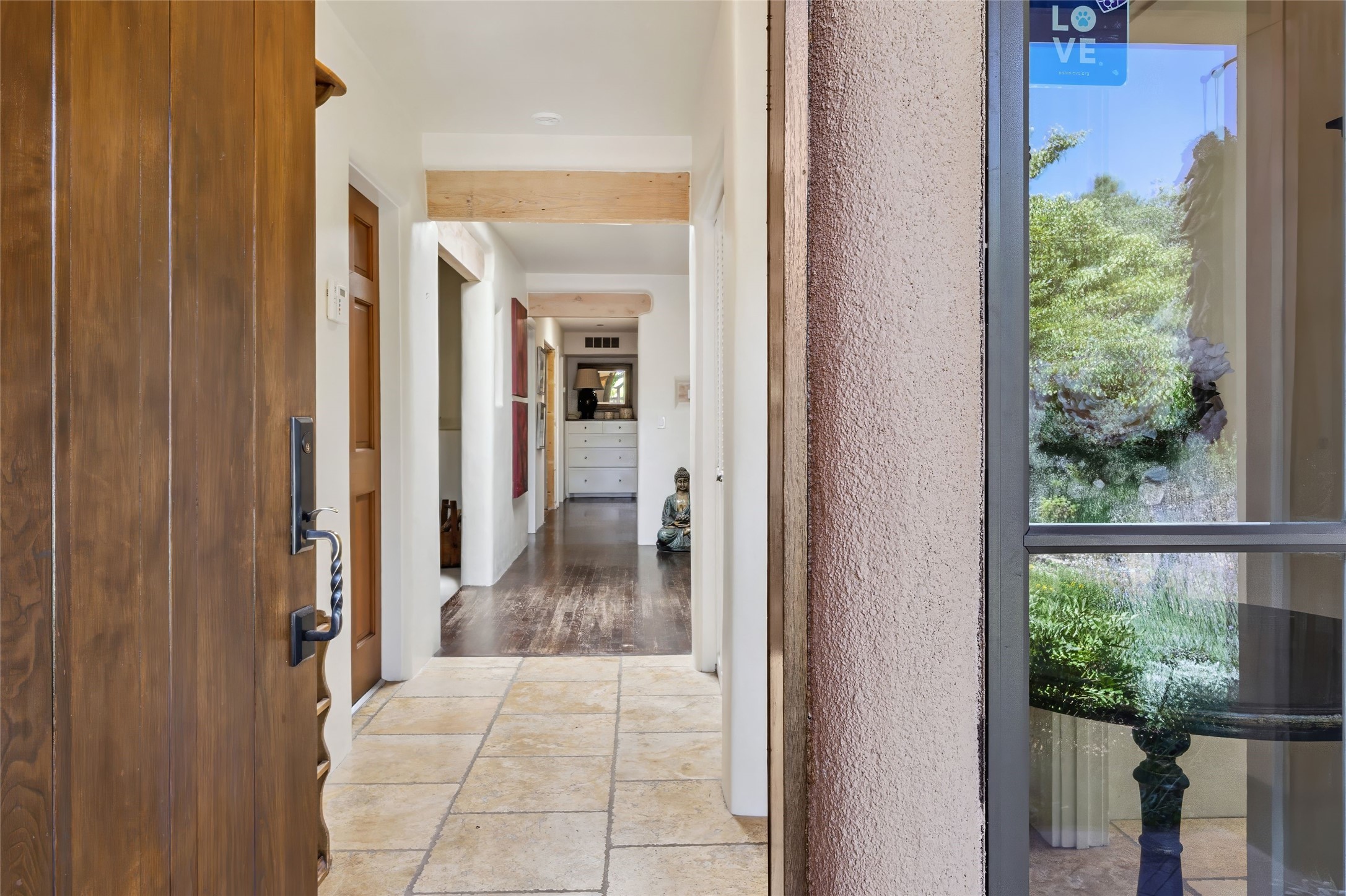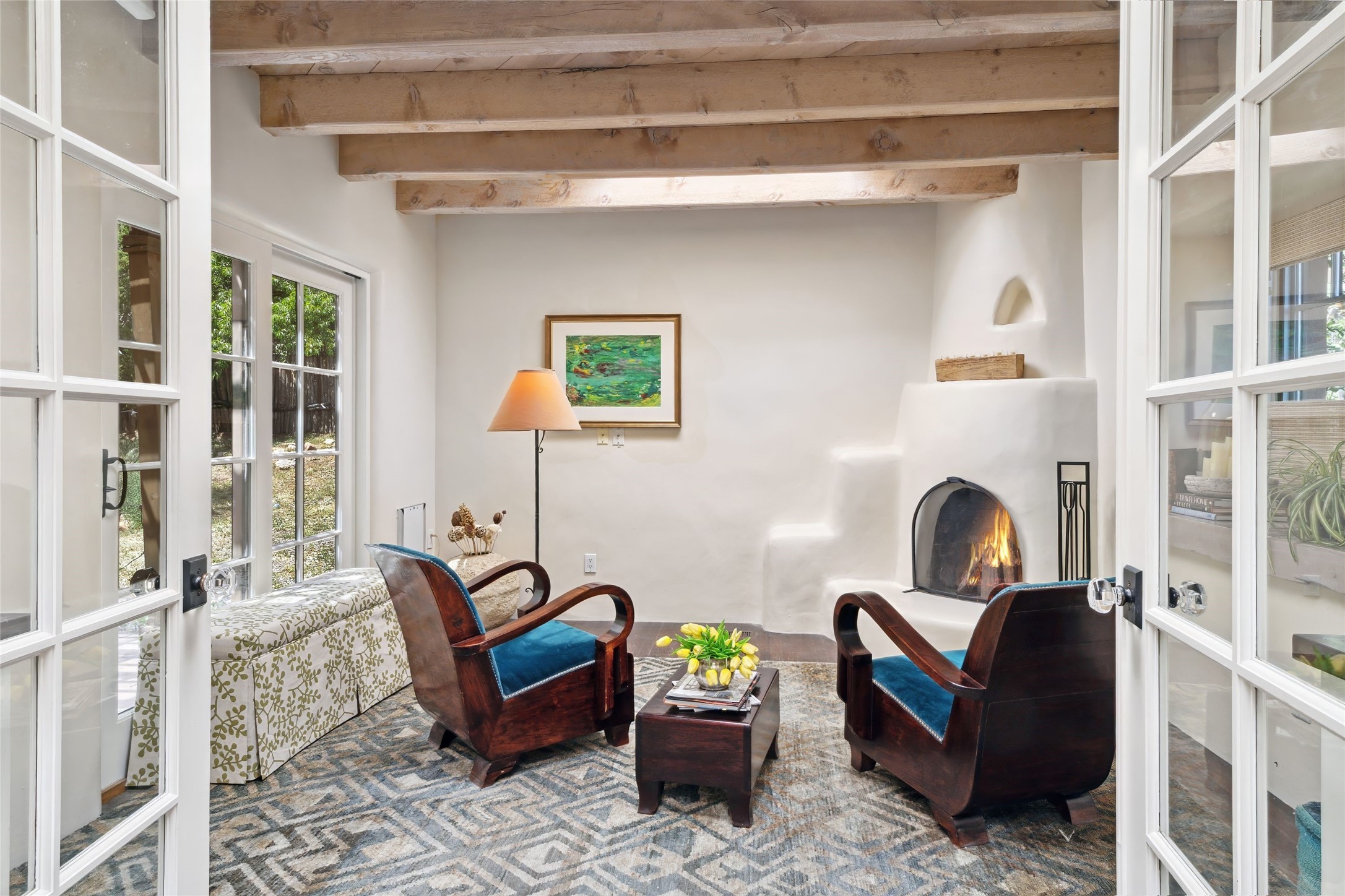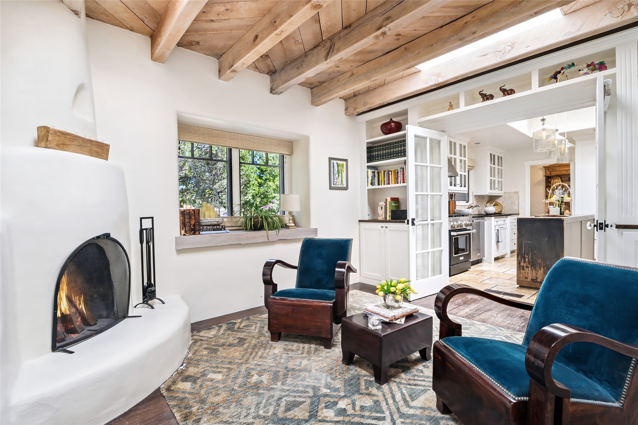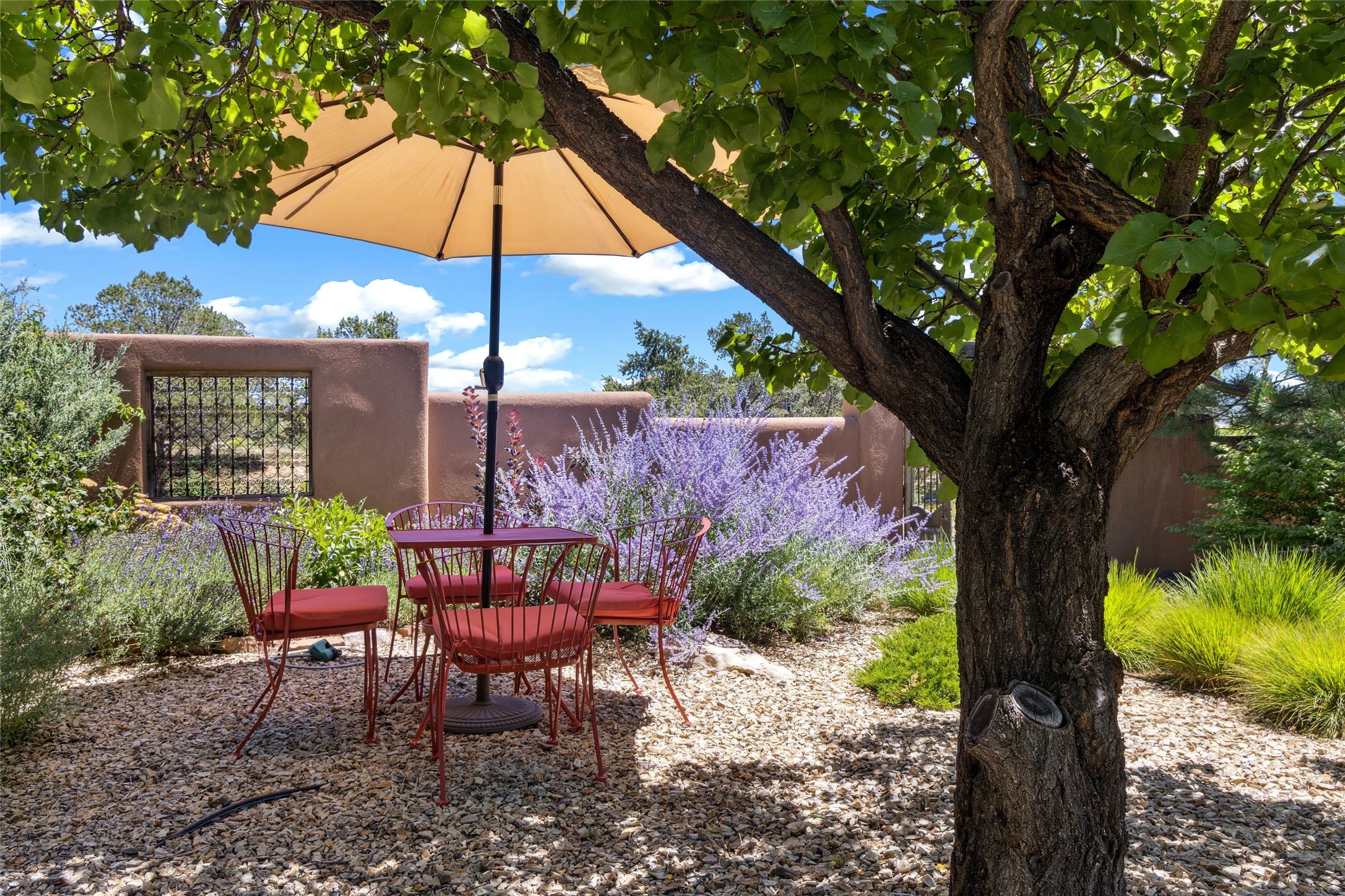 Nestled behind a private stucco-walled garden bursting with seasonal flowers, this single-level Santa Fe-style home reflects almost two decades of thoughtful design by its creative owners. Every detail tells a story--authentic, warm, and perfectly tailored for modern living. The convenient in town location is only blocks from the storied South Capital neighborhood. Step inside to discover sunlit interiors with rich hardwood floors, wood beamed ceilings, skylights, and an open flow that connects the heart of the home. The island kitchen, crowned with raised ceilings and Kitchen Aid appliances offers generous counter space and seamlessly opens to a cozy den anchored by a traditional kiva fireplace. The center hall floor plan offers a dining room with coved ceilings and views of an outdoor grilling patio with arbor. The sunken living room with corner kiva fireplace has access to the side courtyard with Aspen trees and fountain. The spacious bedrooms share an updated dual vanity bathroom with shower. The primary opens to the connecting side fountain courtyard. A luxurious laundry room, abundant storage, oversized attached two car garage and secondary gated driveway completes this home. Many updates over the years since ownership include adding landscaping, adding a front portal, replacing the windows/doors, updating the roof and stucco. Multiple outdoor living spaces invite you to savor Santa Fe's magical light--from mountain views from the front garden, morning coffee in the courtyard to evening gatherings under the stars. The landscaped grounds are a private sanctuary, with vibrant flowers and native plantings creating year-round beauty. This is more than a home--it's a carefully curated work of art, blending classic Southwestern architecture with the comfort and style of a designer's vision.