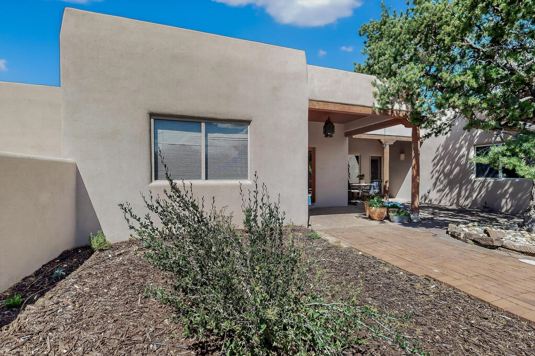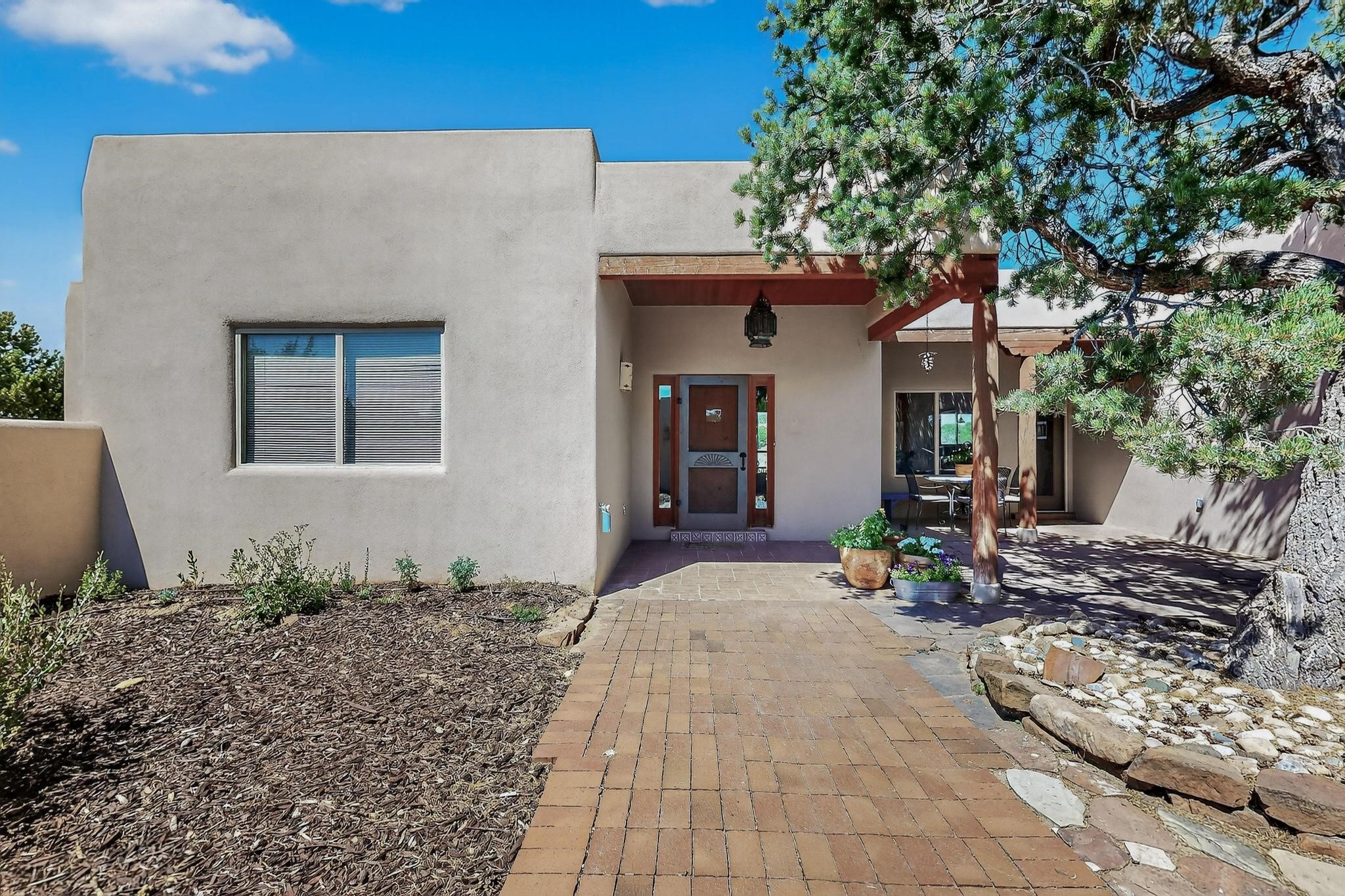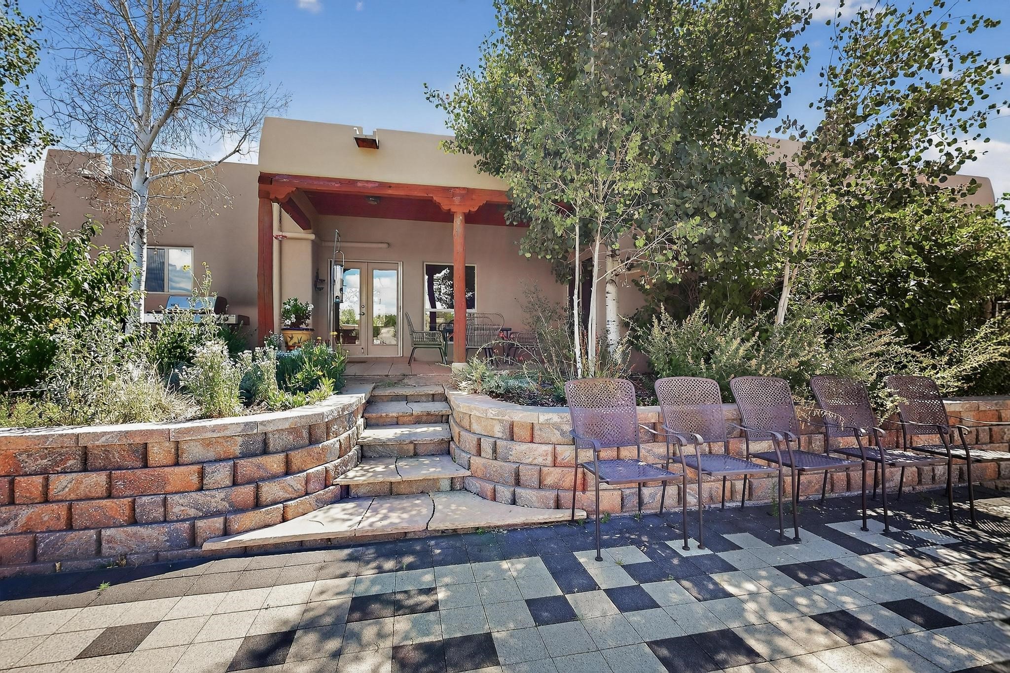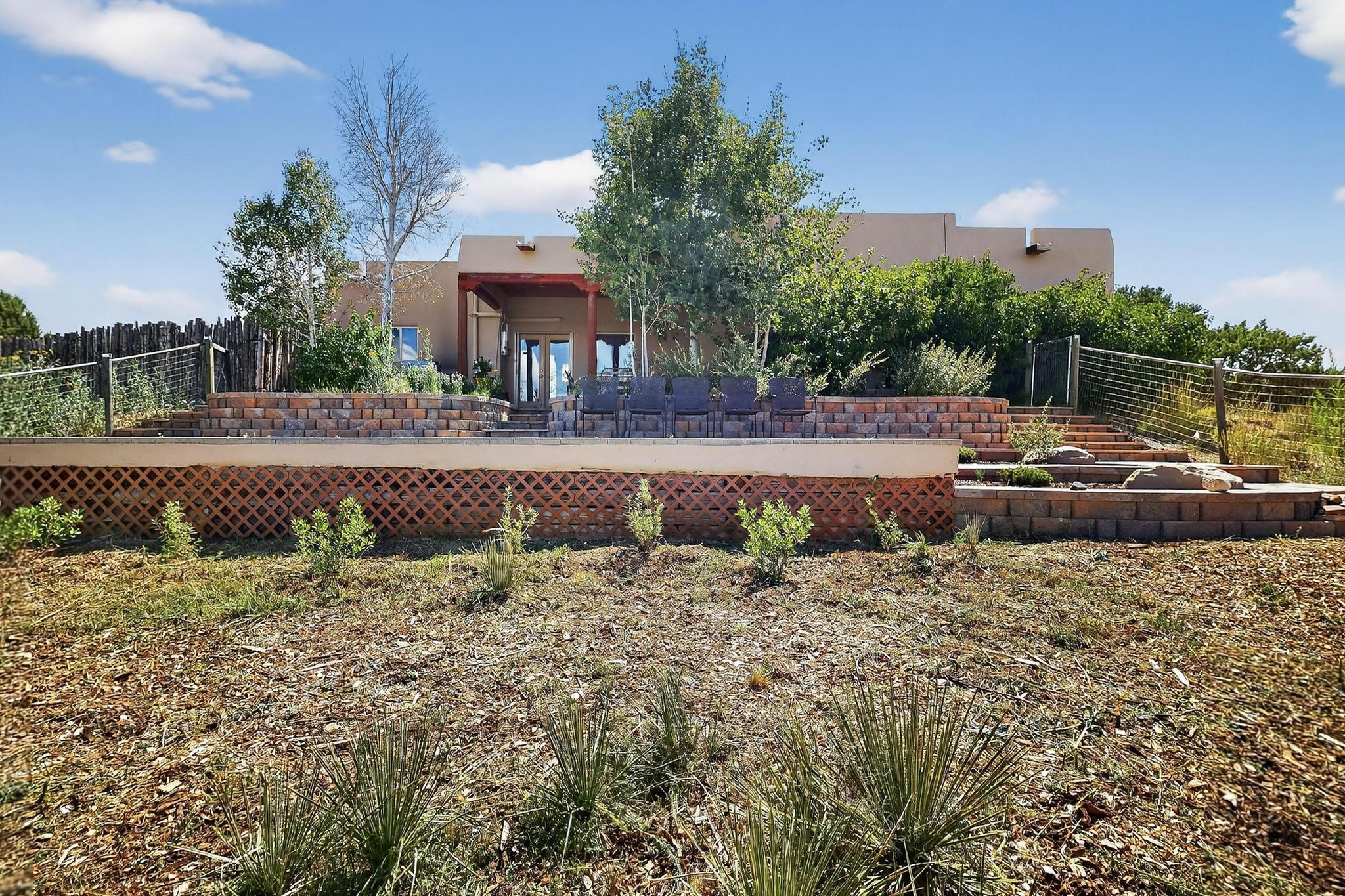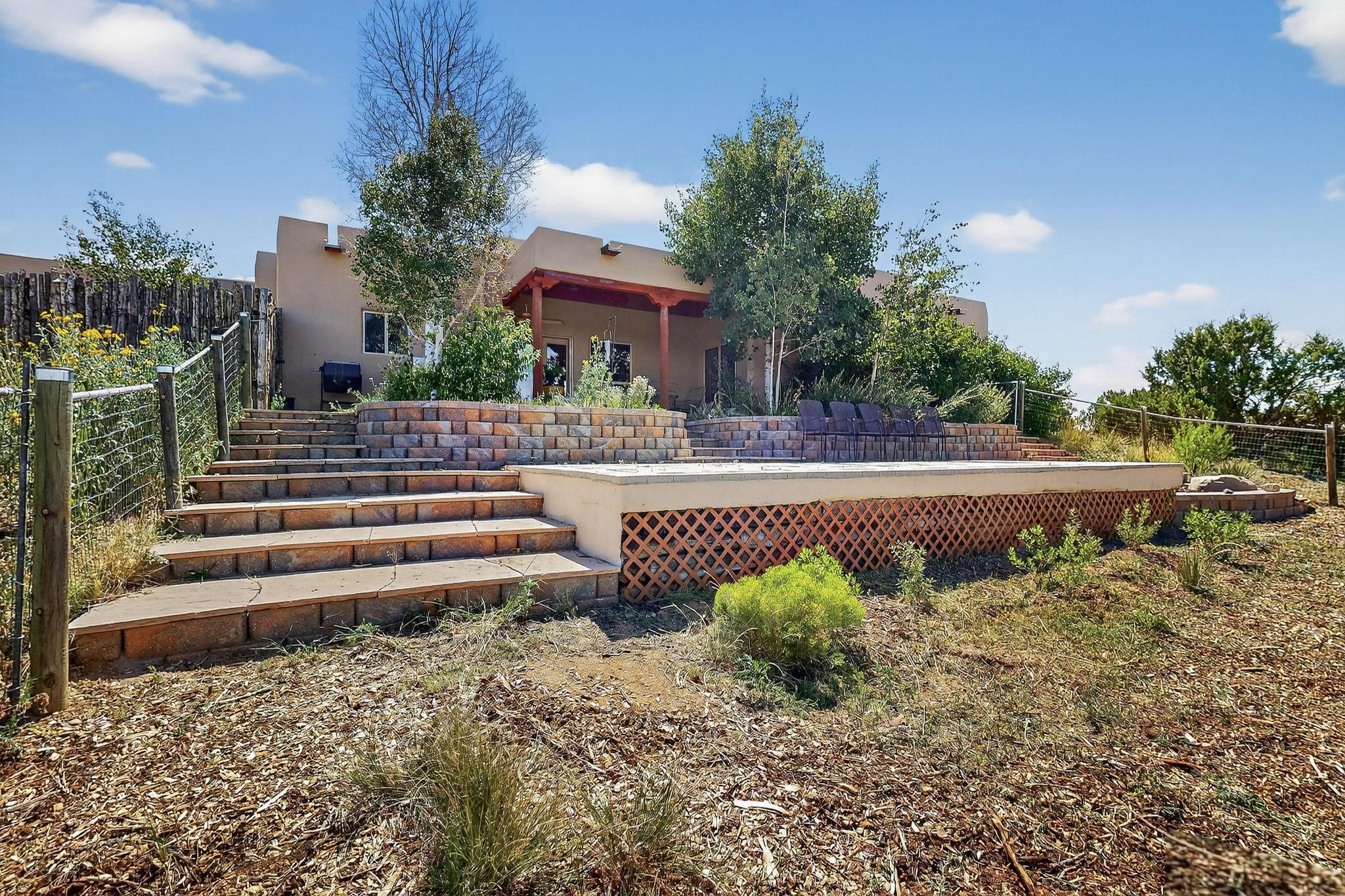 Calling all astronomers or night sky enthusiasts, this nicely maintained home located on a greenbelt includes a detached observatory. The natural gas radiant heating kitek heating is supplemented by Mitsubishi mini splits providing both heating and cooling. The plumbing has been serviced working currently. The new Gaco roof was installed in 2020 with additional foam insulation, and a 26 panel rooftop solar added. The home and wall was also stuccoed in 2020. The electrical service was upgraded to 220amps and an EV charger installed in the garage. The driveway and drainage has been improved. Landscaping has been extended to include decorative walls and fruit trees. The observatory was approved and installed in 2019-no telescope is included. All this is accessible to Eldorado amenities, easy to local shopping and services and only minutes into Santa Fe.