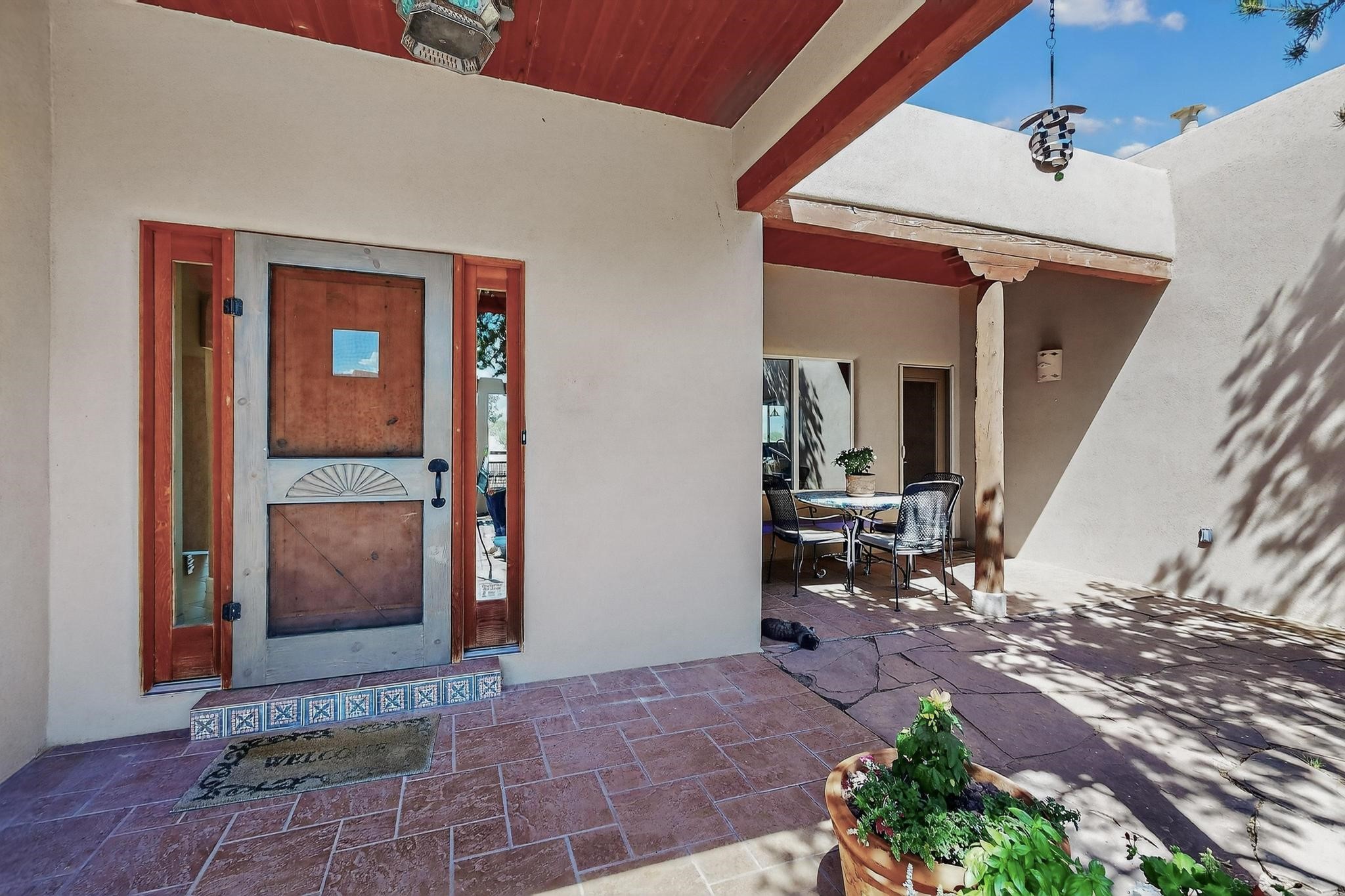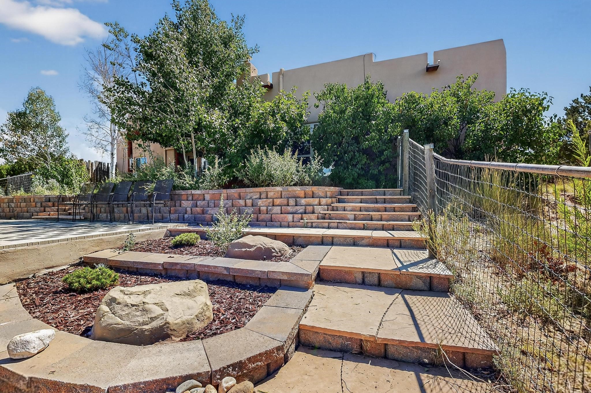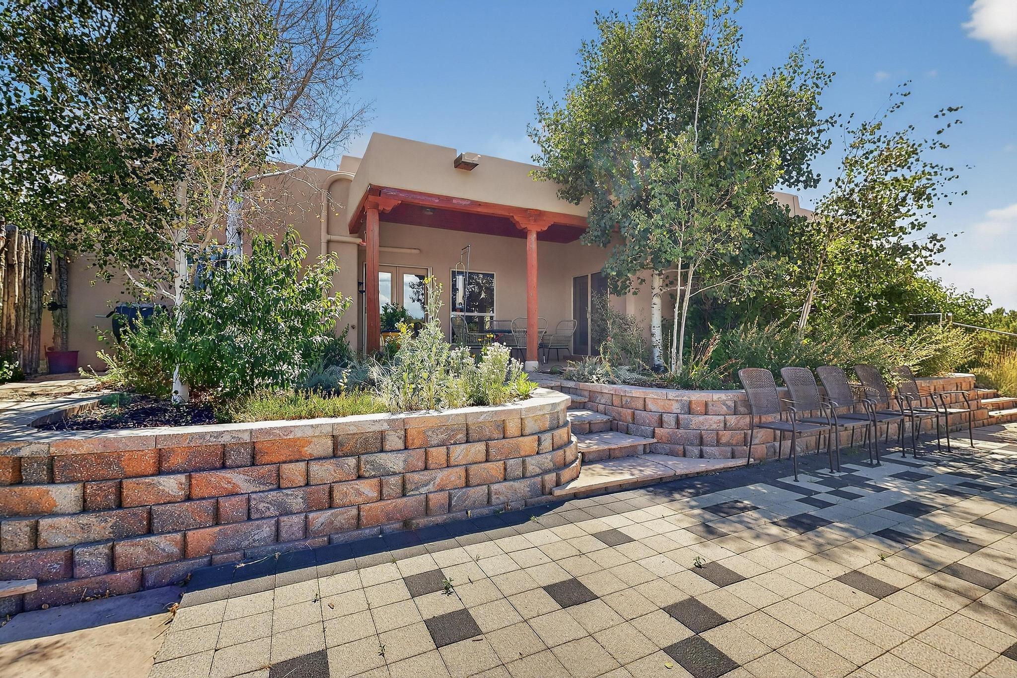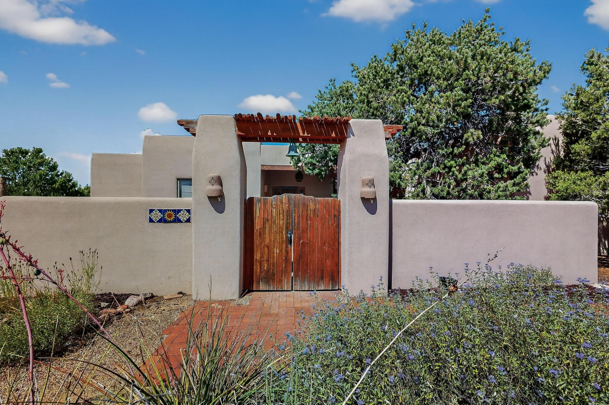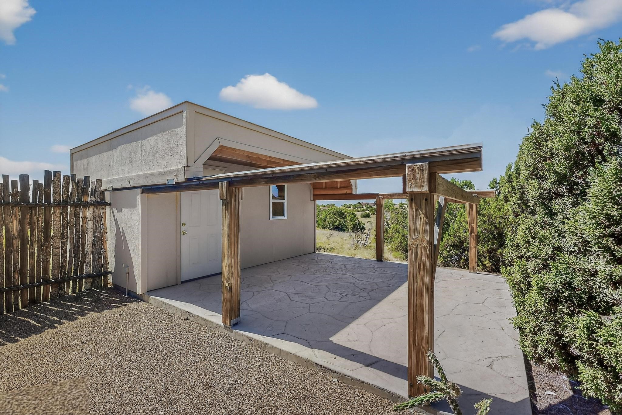 Calling all astronomers or night sky enthusiasts, this nicely maintained home located on a greenbelt includes a detached observatory. The natural gas radiant heating kitek heating is supplemented by Mitsubishi mini splits providing both heating and cooling. The plumbing has been serviced working currently. The new Gaco roof was installed in 2020 with additional foam insulation, and a 26 panel rooftop solar added. The home and wall was also stuccoed in 2020. The electrical service was upgraded to 220amps and an EV charger installed in the garage. The driveway and drainage has been improved. Landscaping has been extended to include decorative walls and fruit trees. The observatory was approved and installed in 2019-no telescope is included. All this is accessible to Eldorado amenities, easy to local shopping and services and only minutes into Santa Fe.