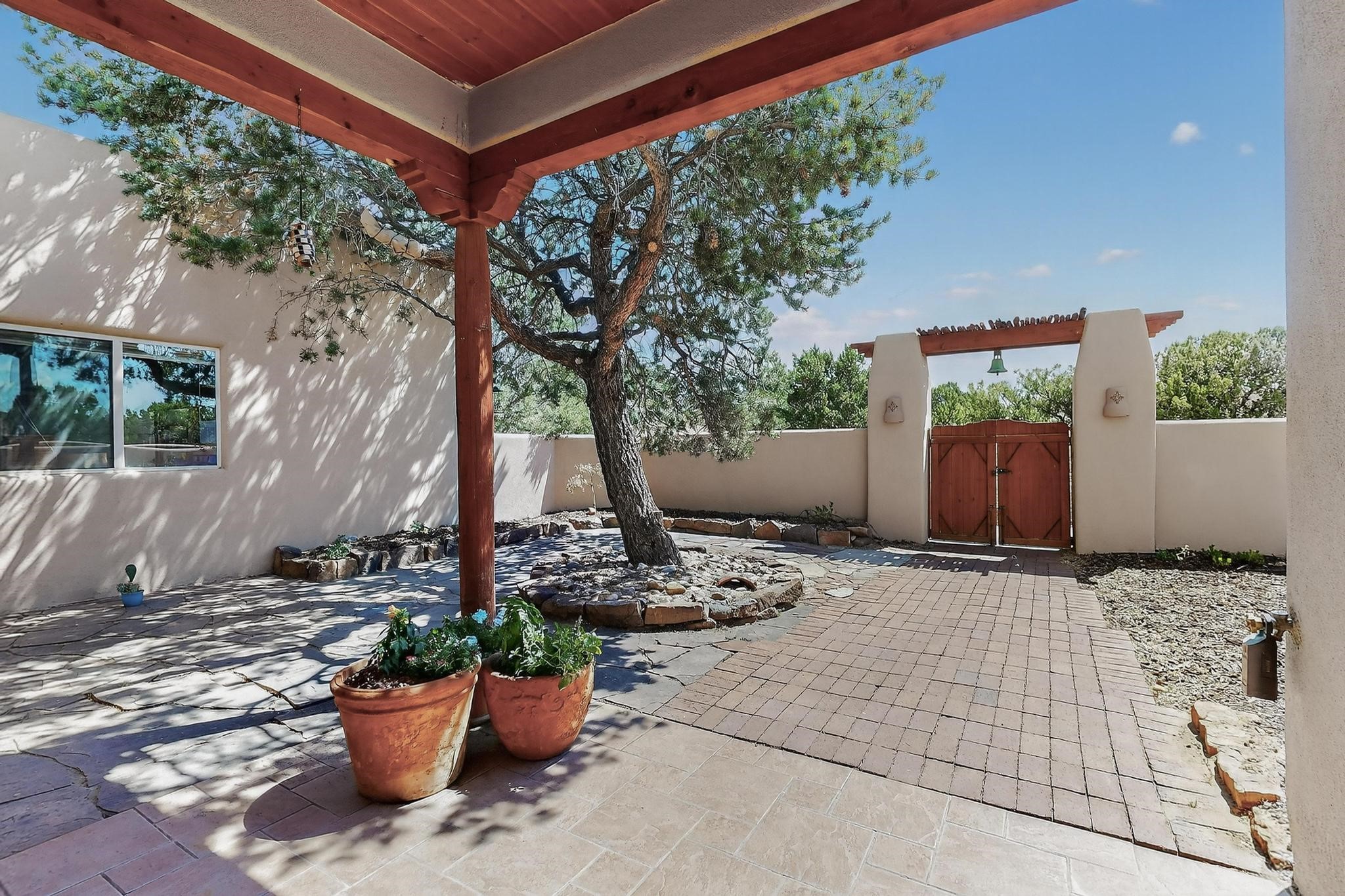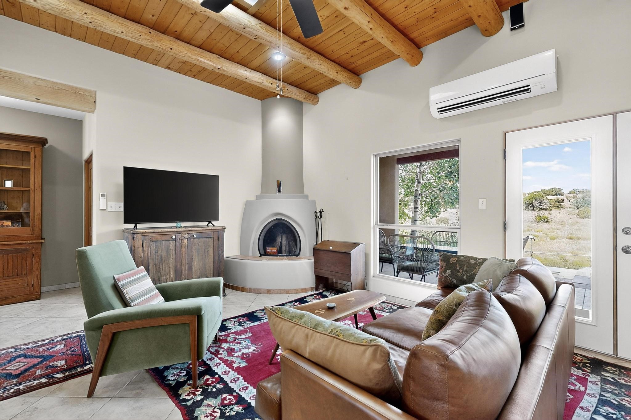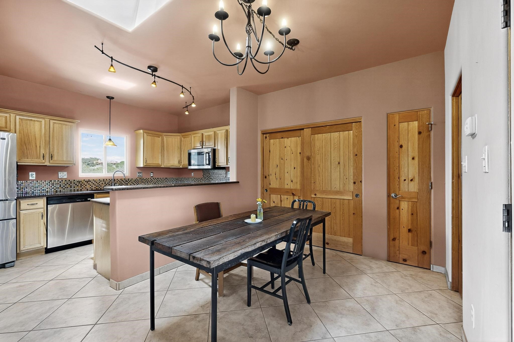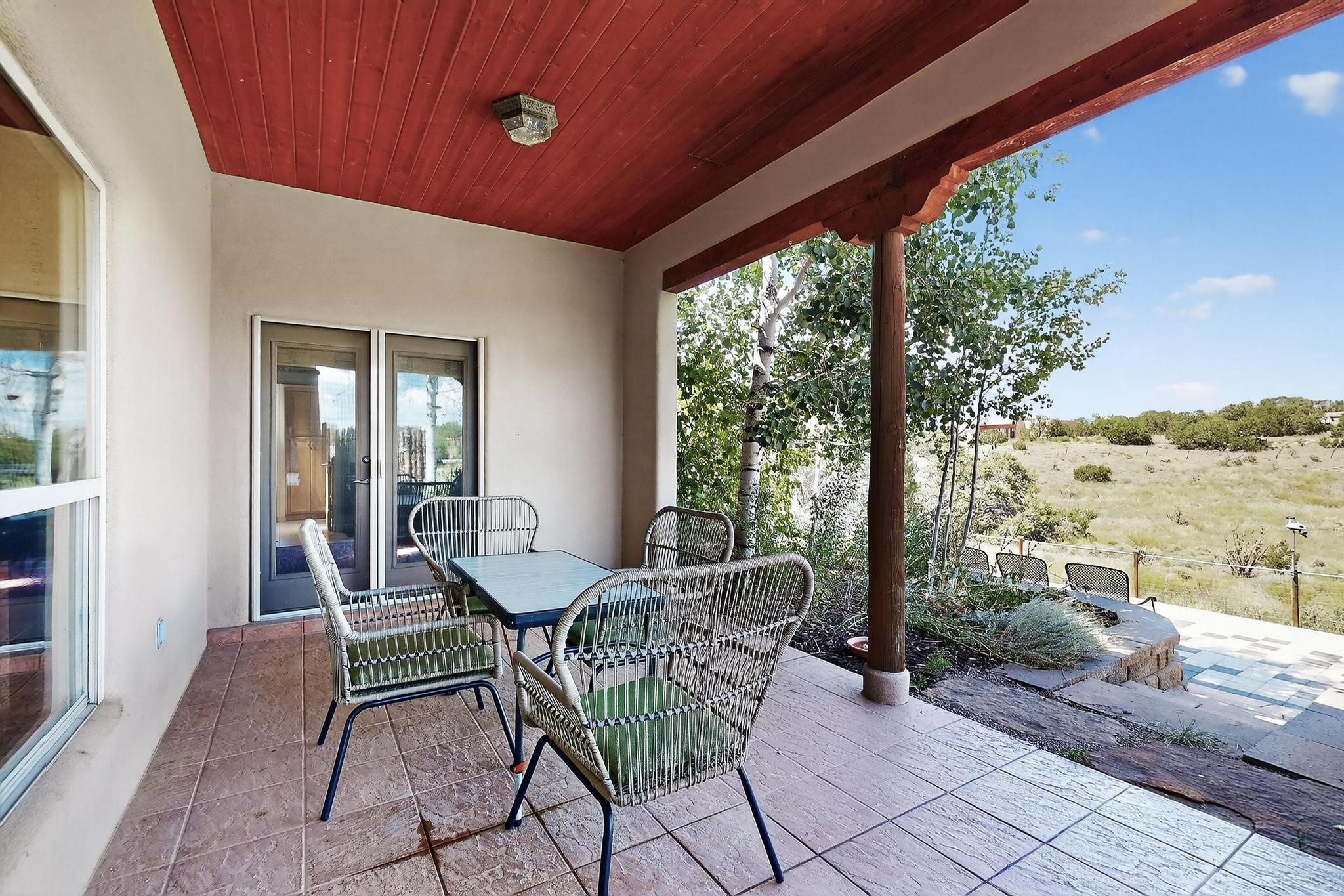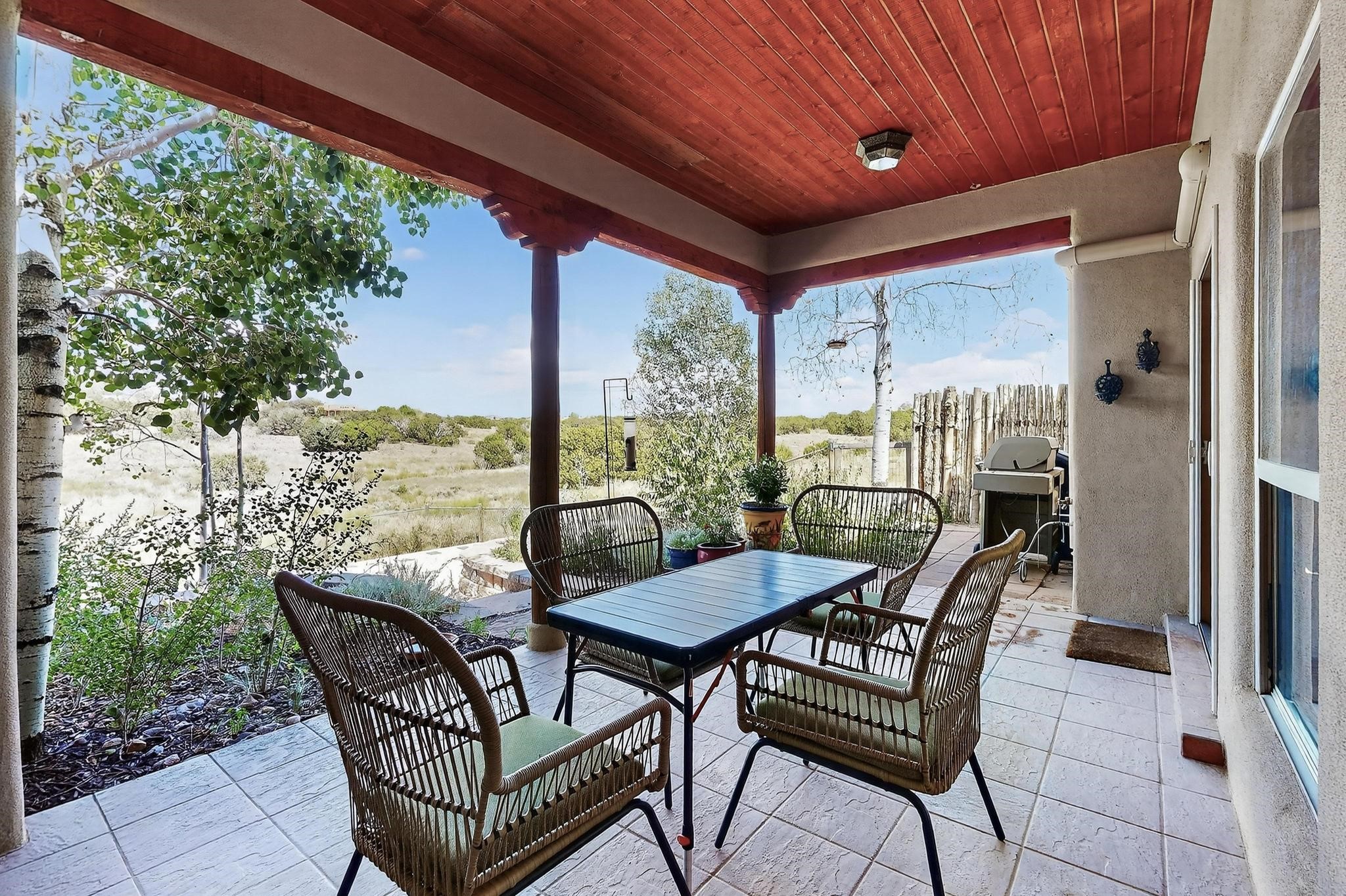 Calling all astronomers or night sky enthusiasts, this nicely maintained home located on a greenbelt includes a detached observatory. The natural gas radiant heating kitek heating is supplemented by Mitsubishi mini splits providing both heating and cooling. The plumbing has been serviced working currently. The new Gaco roof was installed in 2020 with additional foam insulation, and a 26 panel rooftop solar added. The home and wall was also stuccoed in 2020. The electrical service was upgraded to 220amps and an EV charger installed in the garage. The driveway and drainage has been improved. Landscaping has been extended to include decorative walls and fruit trees. The observatory was approved and installed in 2019-no telescope is included. All this is accessible to Eldorado amenities, easy to local shopping and services and only minutes into Santa Fe.