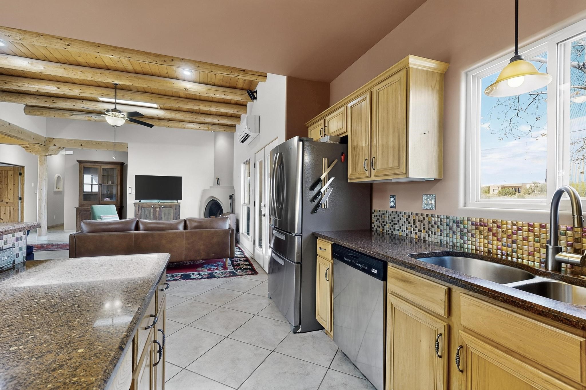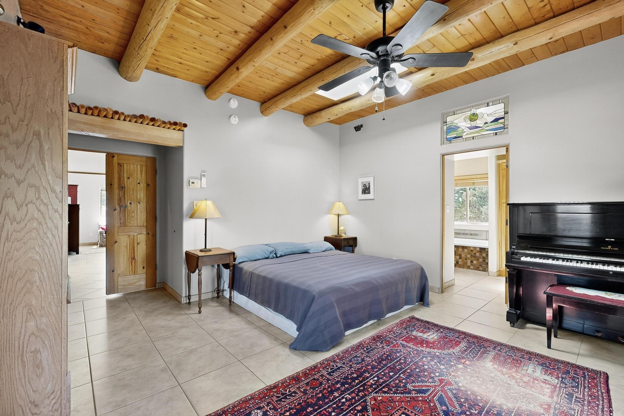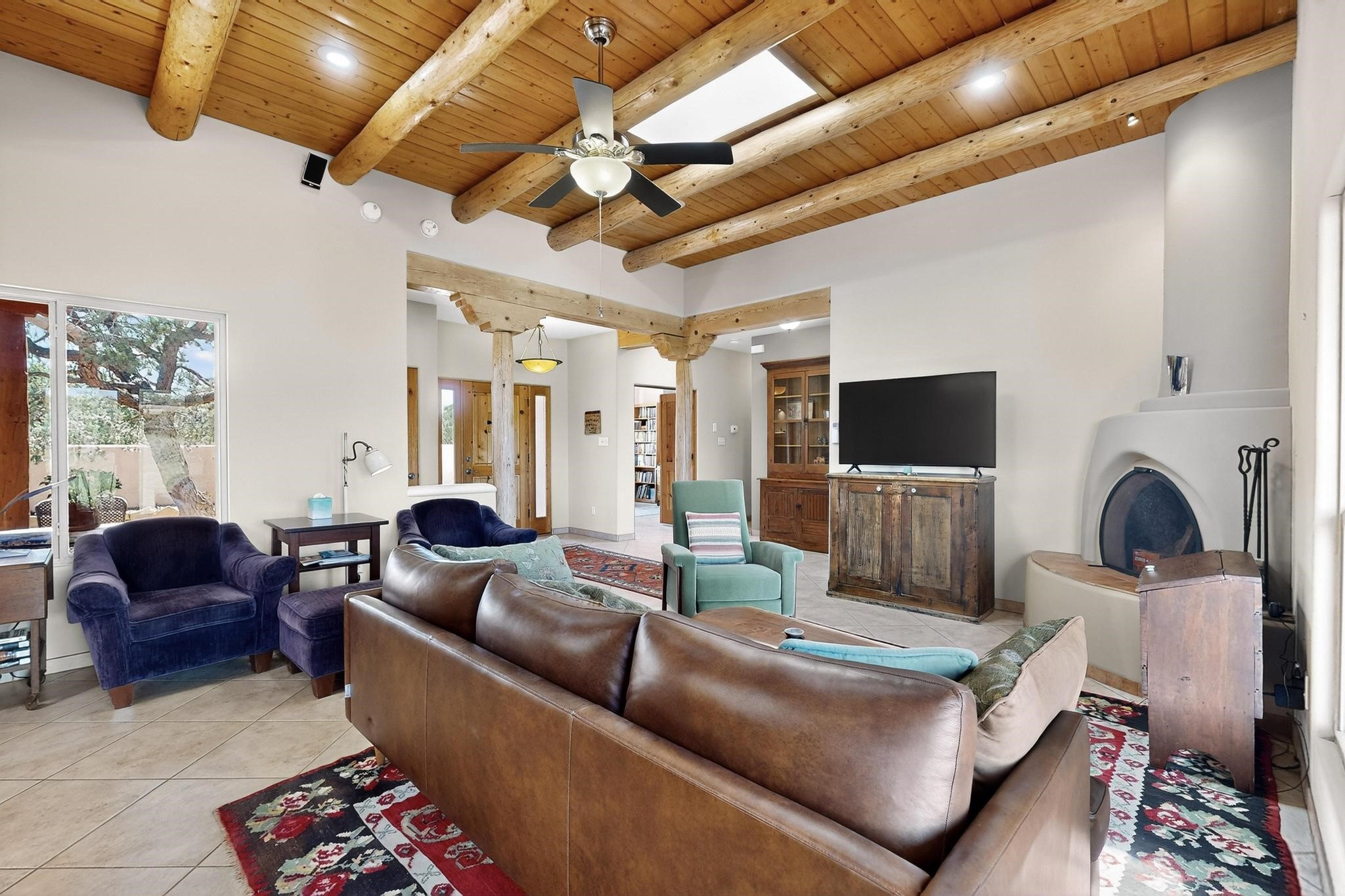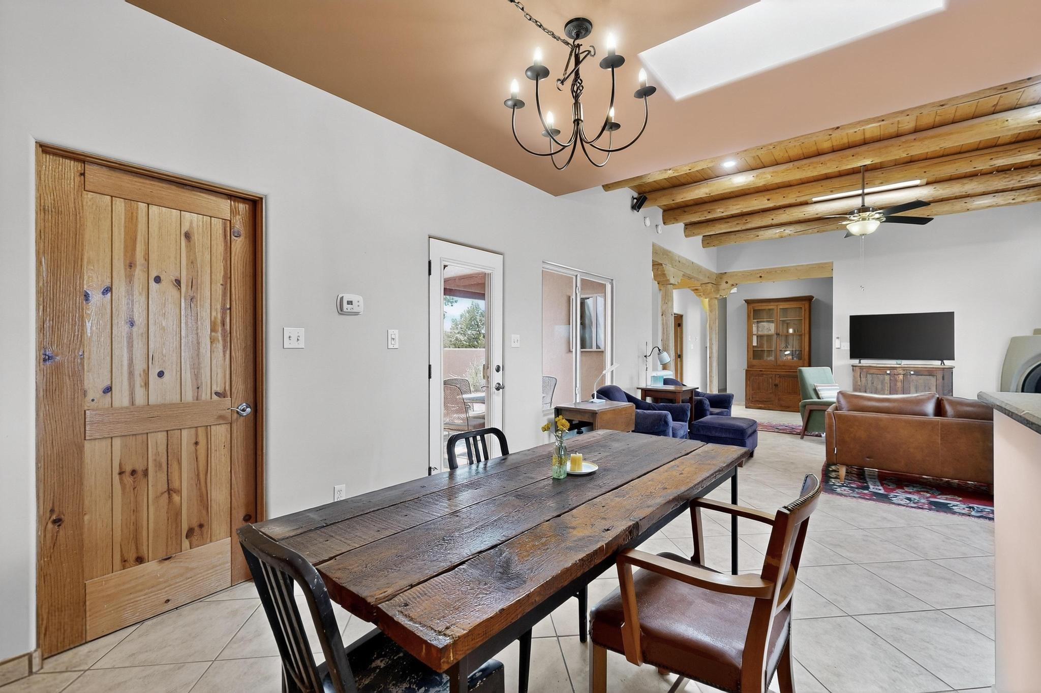 Calling all astronomers or night sky enthusiasts, this nicely maintained home located on a greenbelt includes a detached observatory. The natural gas radiant heating kitek heating is supplemented by Mitsubishi mini splits providing both heating and cooling. The plumbing has been serviced working currently. The new Gaco roof was installed in 2020 with additional foam insulation, and a 26 panel rooftop solar added. The home and wall was also stuccoed in 2020. The electrical service was upgraded to 220amps and an EV charger installed in the garage. The driveway and drainage has been improved. Landscaping has been extended to include decorative walls and fruit trees. The observatory was approved and installed in 2019-no telescope is included. All this is accessible to Eldorado amenities, easy to local shopping and services and only minutes into Santa Fe.