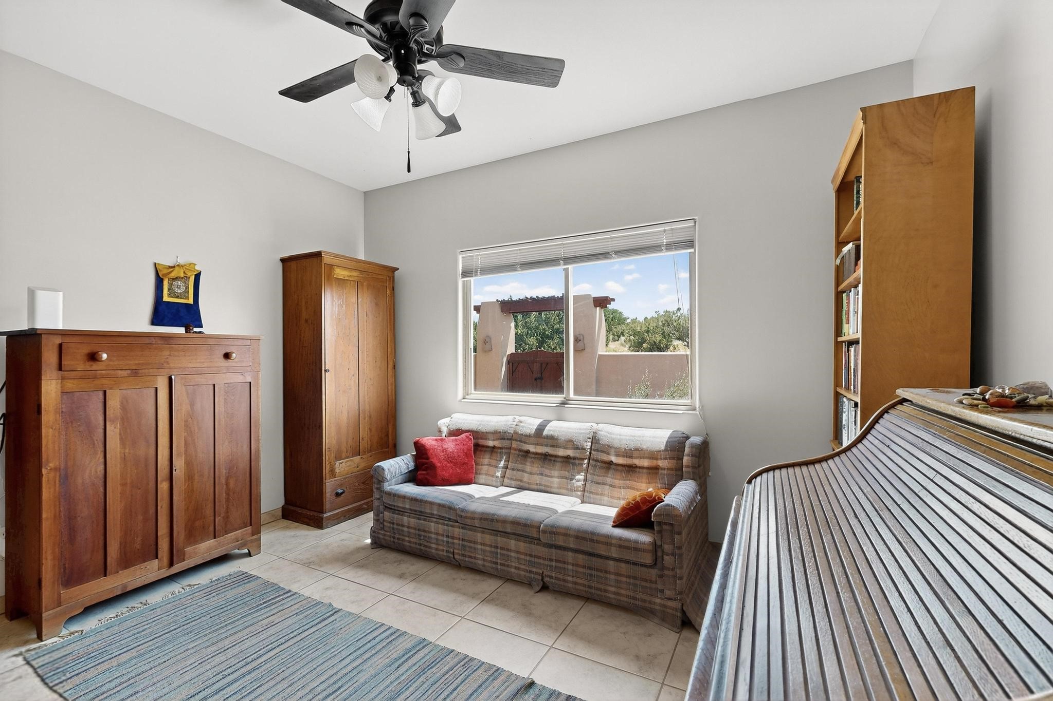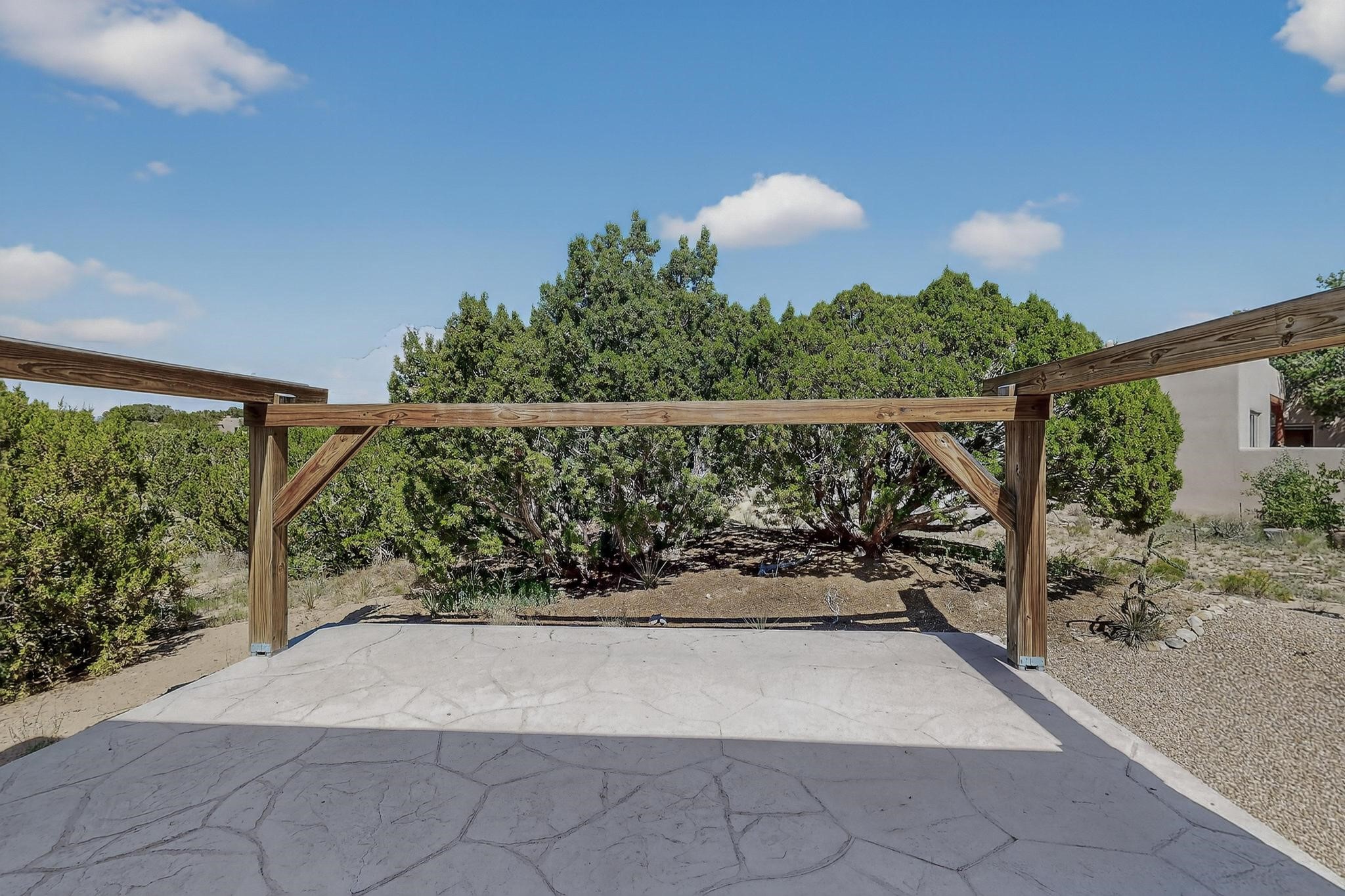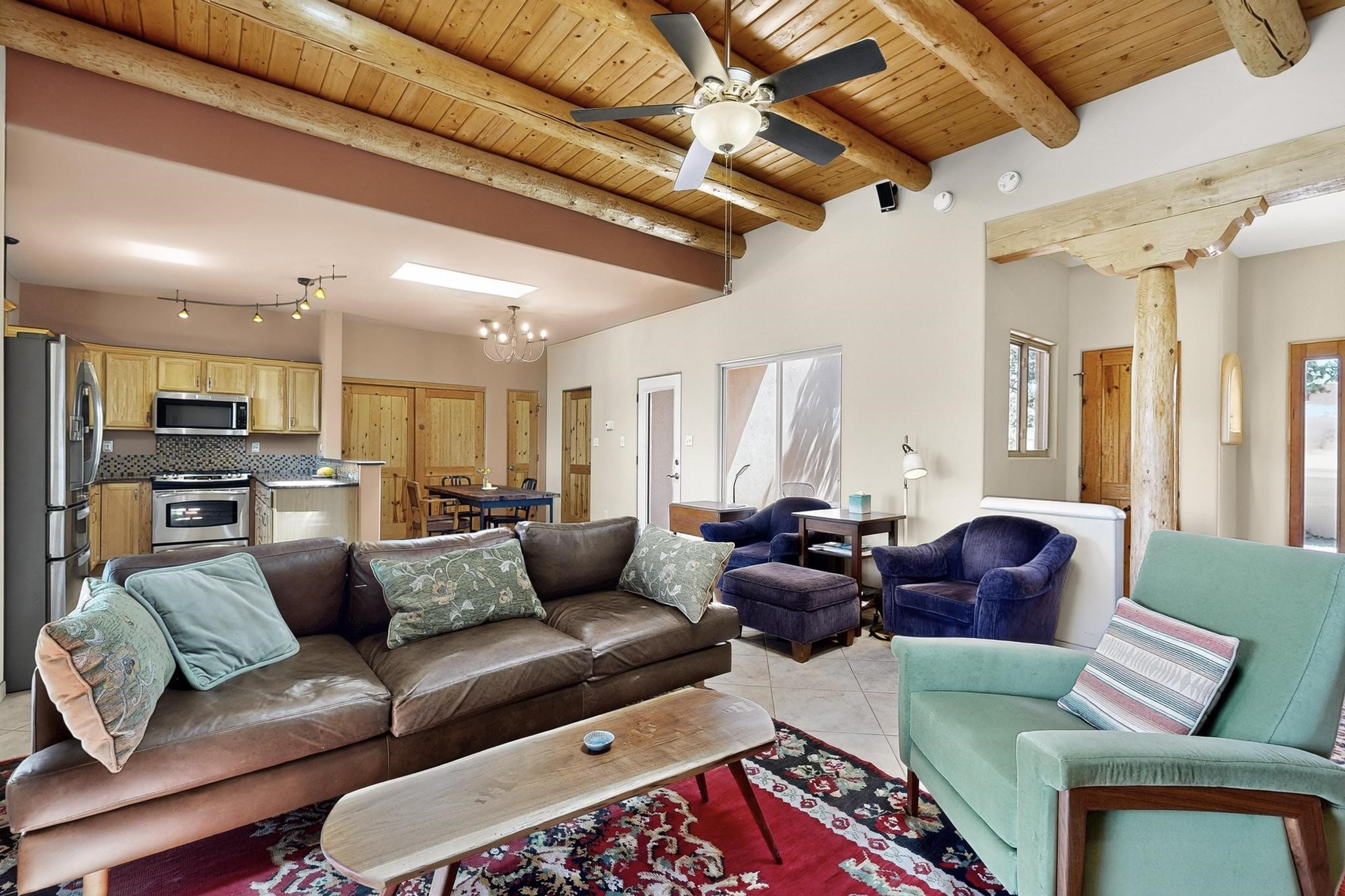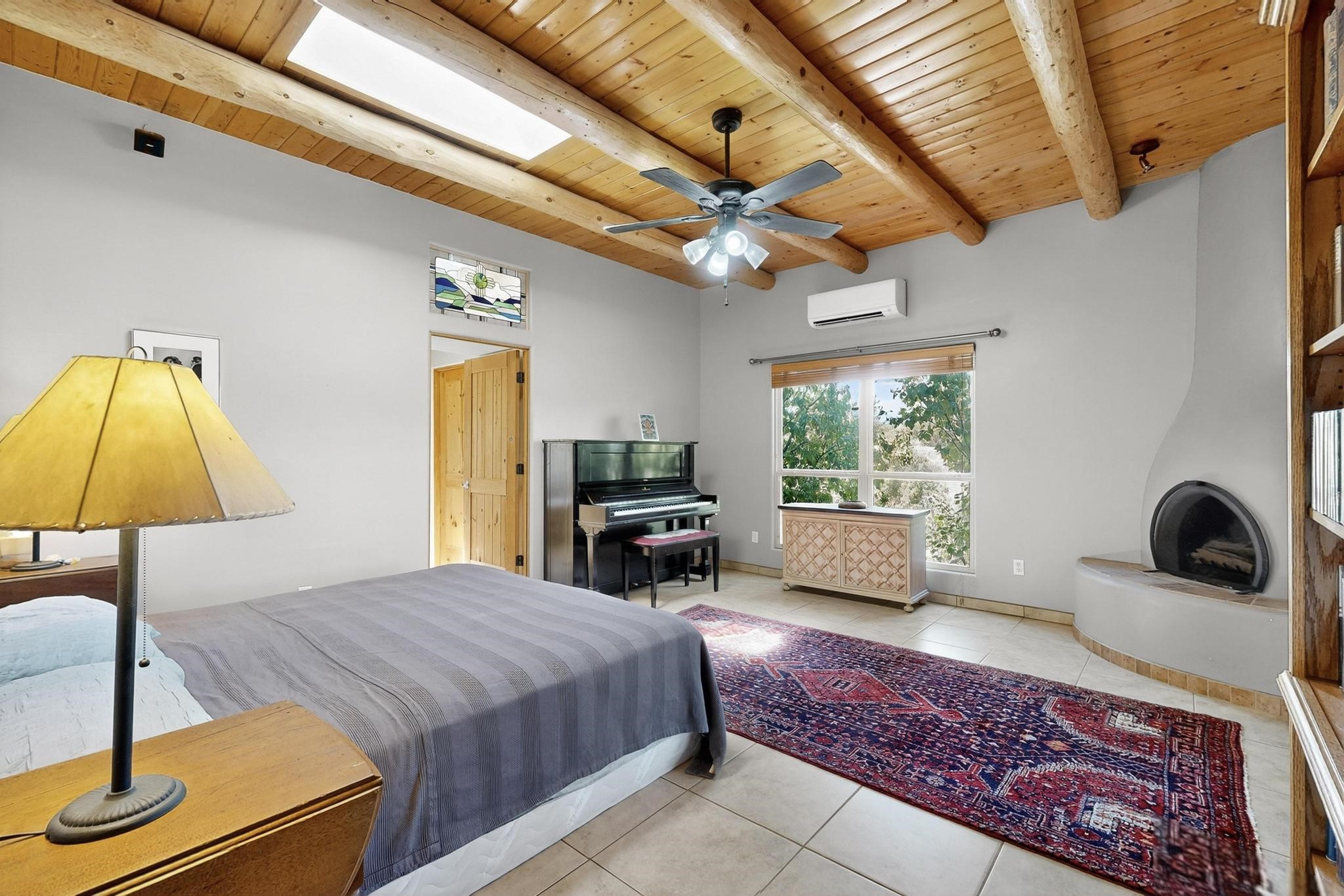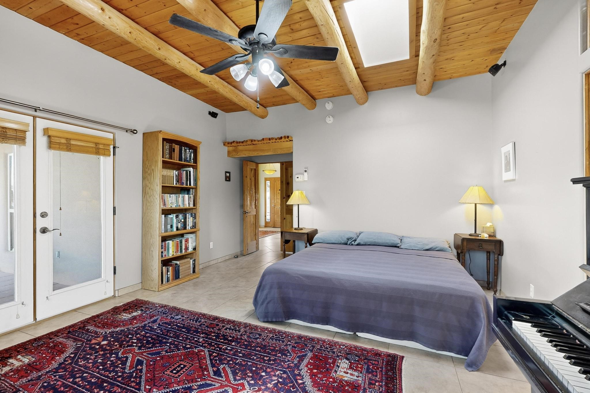 Calling all astronomers or night sky enthusiasts, this nicely maintained home located on a greenbelt includes a detached observatory. The natural gas radiant heating kitek heating is supplemented by Mitsubishi mini splits providing both heating and cooling. The plumbing has been serviced working currently. The new Gaco roof was installed in 2020 with additional foam insulation, and a 26 panel rooftop solar added. The home and wall was also stuccoed in 2020. The electrical service was upgraded to 220amps and an EV charger installed in the garage. The driveway and drainage has been improved. Landscaping has been extended to include decorative walls and fruit trees. The observatory was approved and installed in 2019-no telescope is included. All this is accessible to Eldorado amenities, easy to local shopping and services and only minutes into Santa Fe.