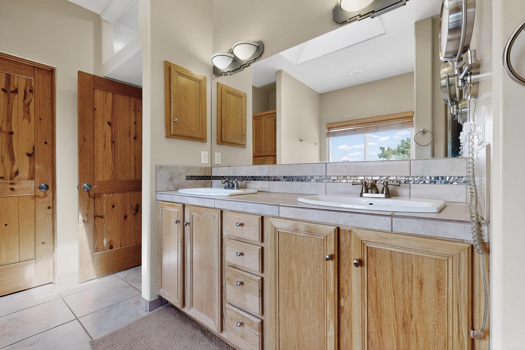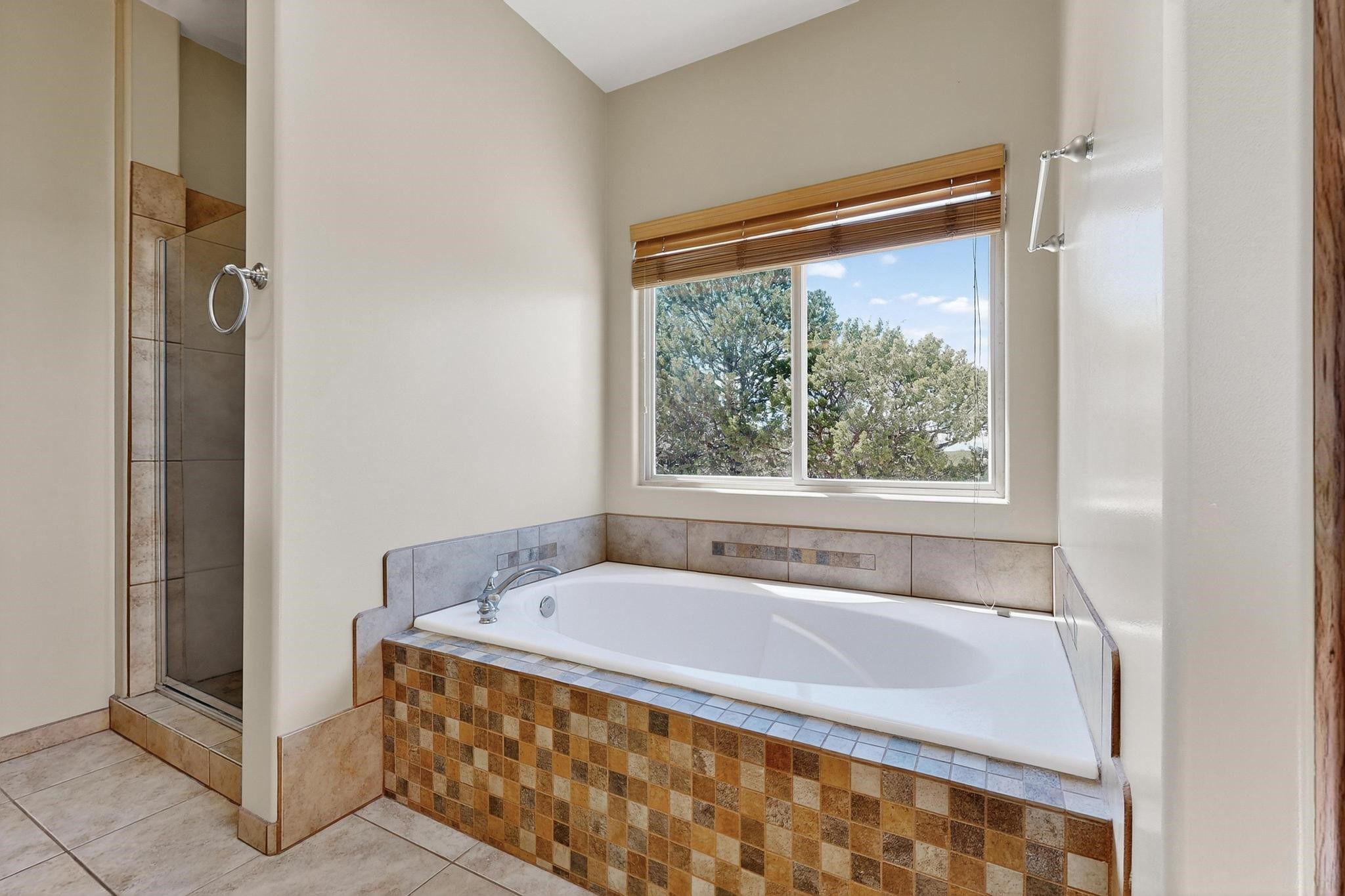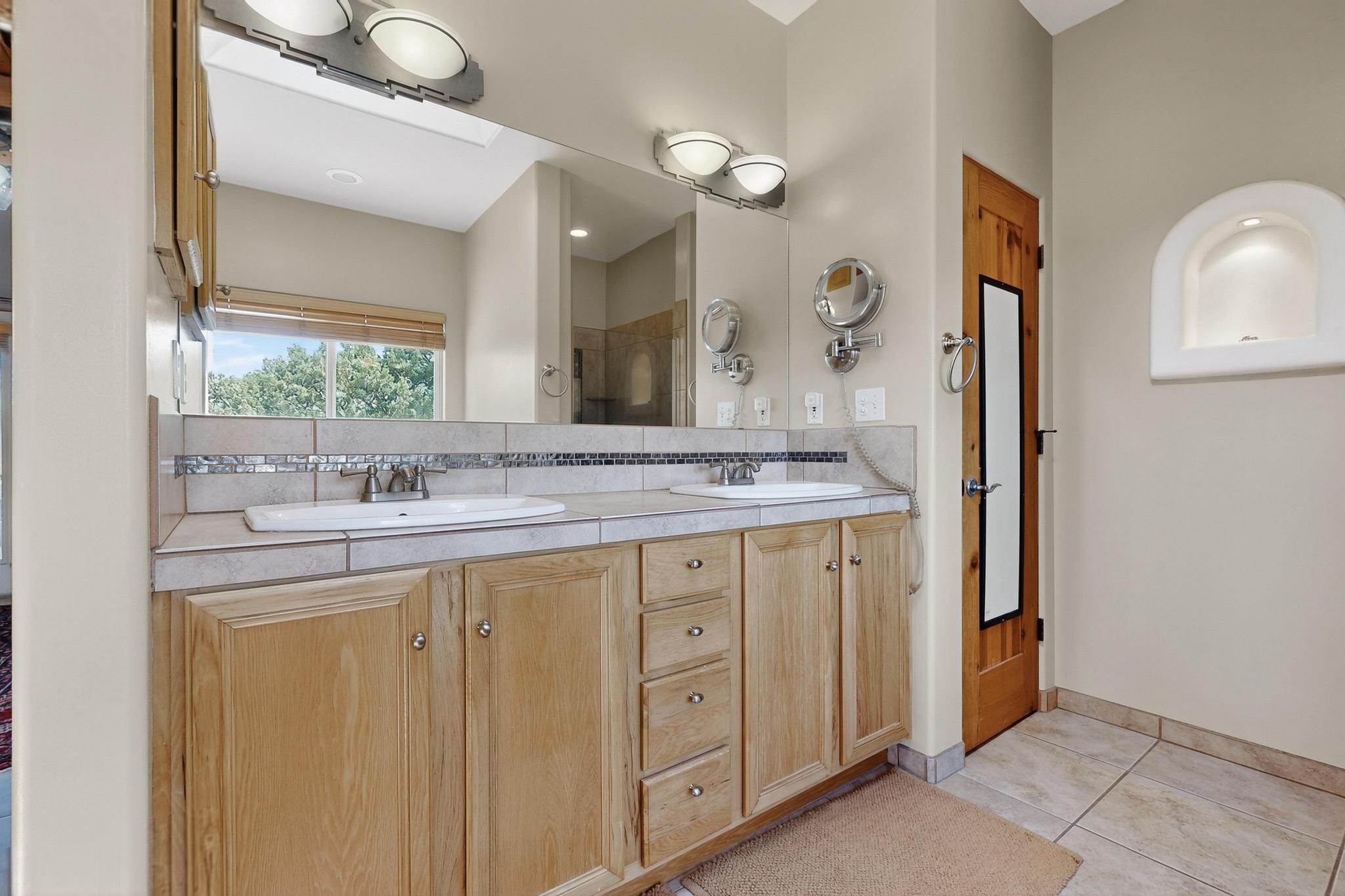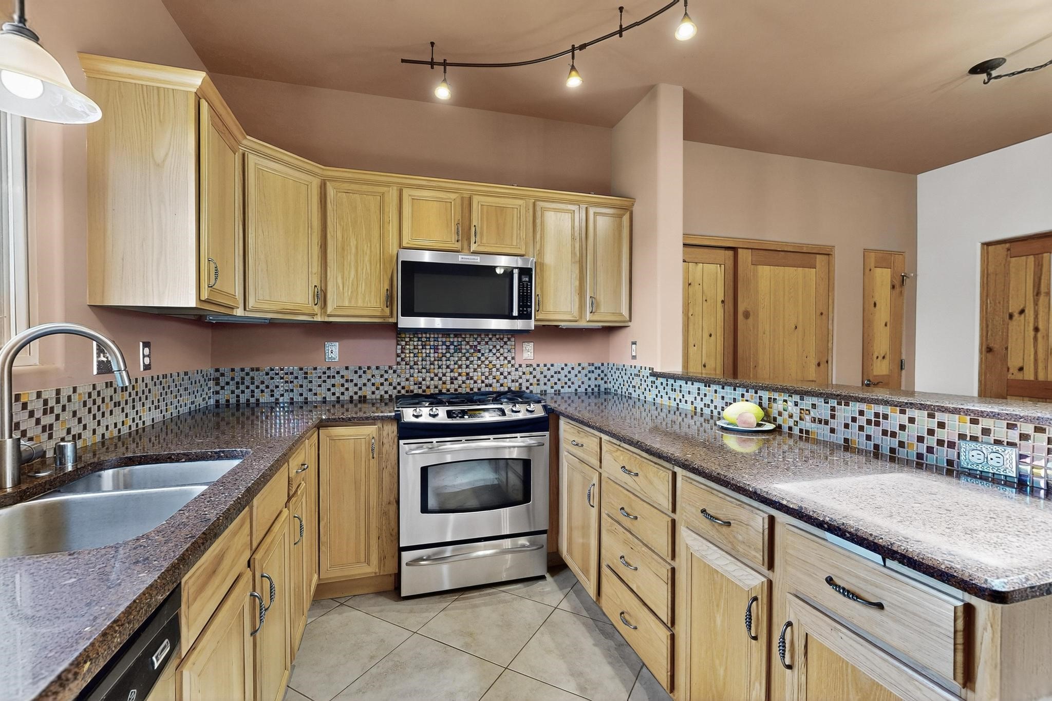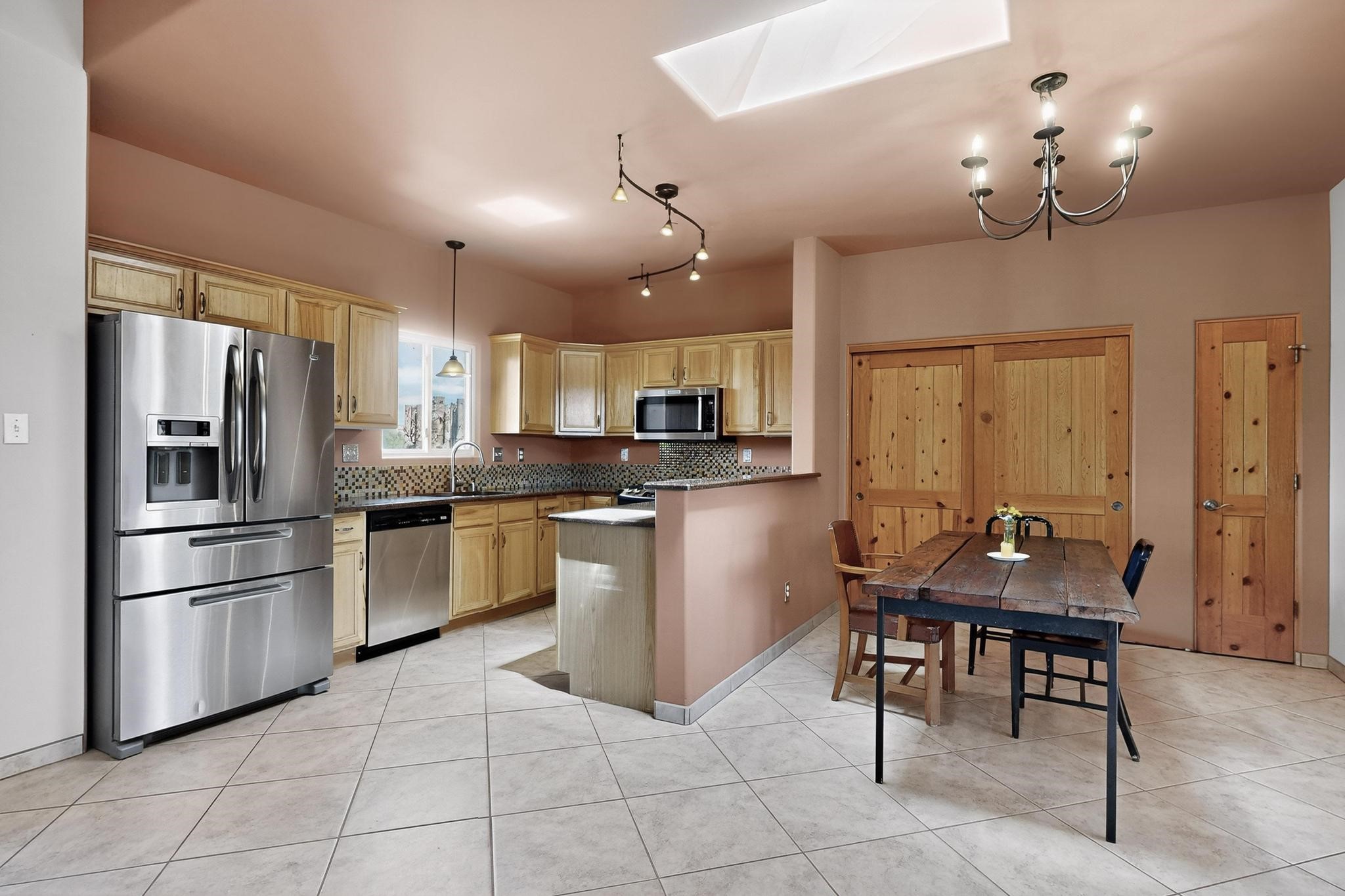 Calling all astronomers or night sky enthusiasts, this nicely maintained home located on a greenbelt includes a detached observatory. The natural gas radiant heating kitek heating is supplemented by Mitsubishi mini splits providing both heating and cooling. The plumbing has been serviced working currently. The new Gaco roof was installed in 2020 with additional foam insulation, and a 26 panel rooftop solar added. The home and wall was also stuccoed in 2020. The electrical service was upgraded to 220amps and an EV charger installed in the garage. The driveway and drainage has been improved. Landscaping has been extended to include decorative walls and fruit trees. The observatory was approved and installed in 2019-no telescope is included. All this is accessible to Eldorado amenities, easy to local shopping and services and only minutes into Santa Fe.