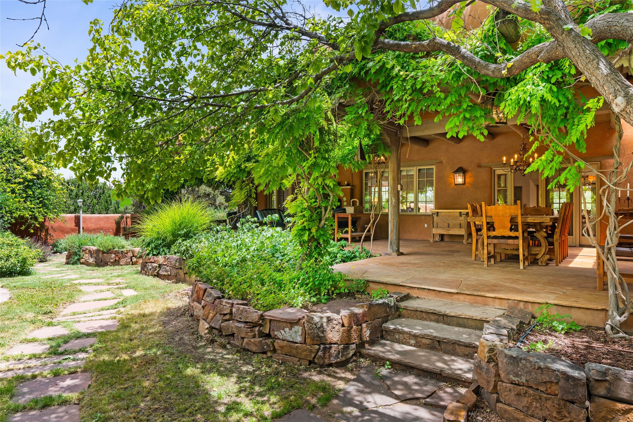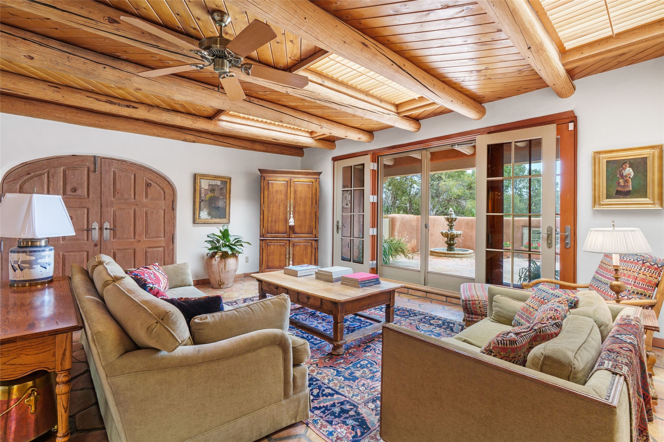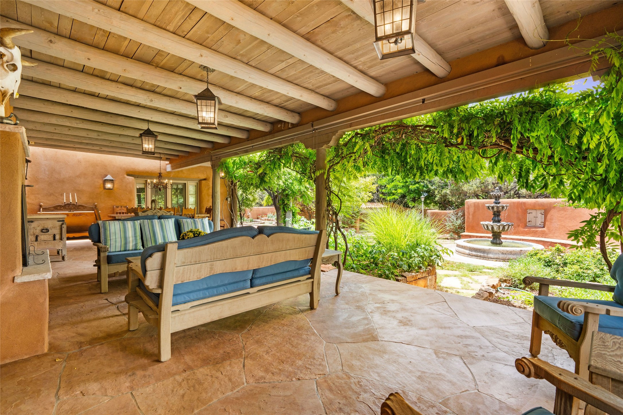 One doesn't simply just buy a Buzz Bainbridge property; one acquires an iconic aesthetic, a lifestyle, an environment of luxurious beauty to live in among his signature Santa Fe features: genuine handmade Adobe walls, some 30" thick; large open room spaces with gorgeous wraparound views and gorgeously embellished high ceilings, wonderful finishes with vigas and latillas and nichos, and kivas, and all the creature comforts of happy living. The intelligent floor plan opens onto gorgeous courtyards, portals, patios, and gardens abounding with high old trees, fountains, and established perennial flowers that embrace the property on the sprawling 7.5 acres. There is even a nurturing, part subterranean greenhouse for year-round blooms and vegetation. The double Adobe main house has three bedrooms, each with its own bath, each with a fireplace, while up the driveway sit the lovely two-bedroom guest house... privately separate, but close enough to borrow a cup of sugar! An additional art studio by the guesthouse with bathroom and fireplace can be an art space or a third bedroom on the guesthouse. There is no HOA to instruct you! The elegant location on prestigious Calle San Martin is 8 minutes to De Vargas mall and 10 to the airport! Yet you feel like you are unwinding in the country! Already pre-inspected with imperfections cured. This is opportunity knocking...!