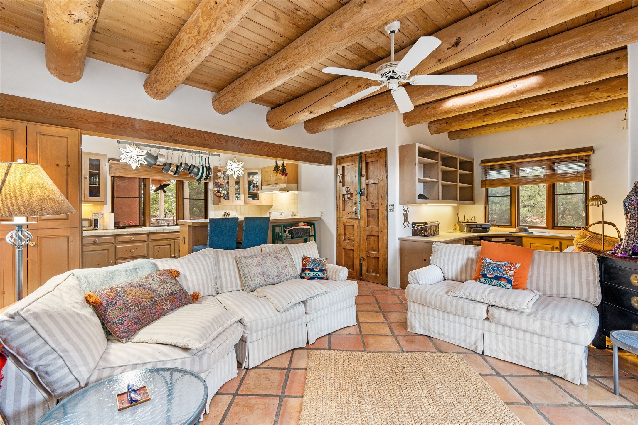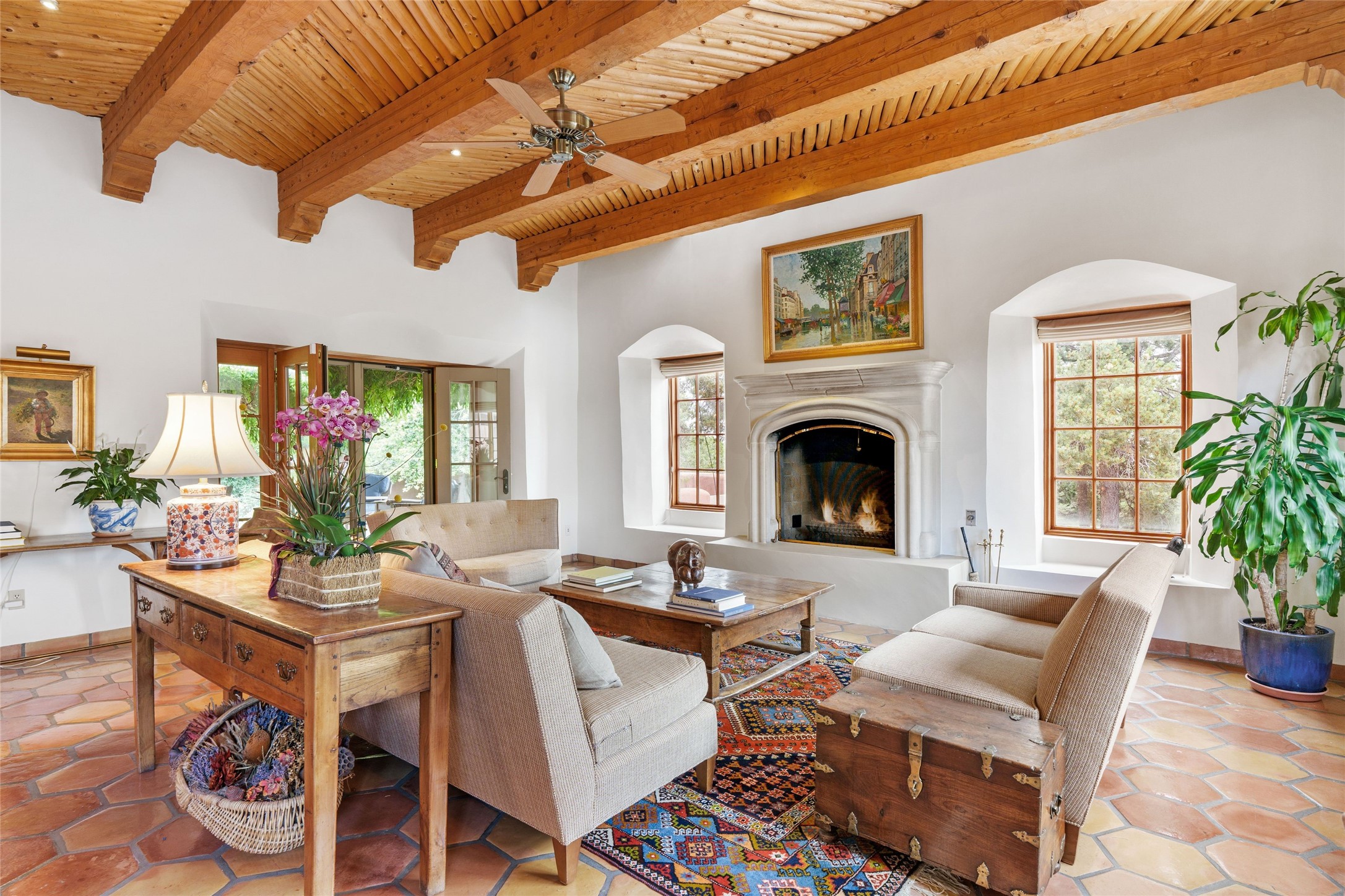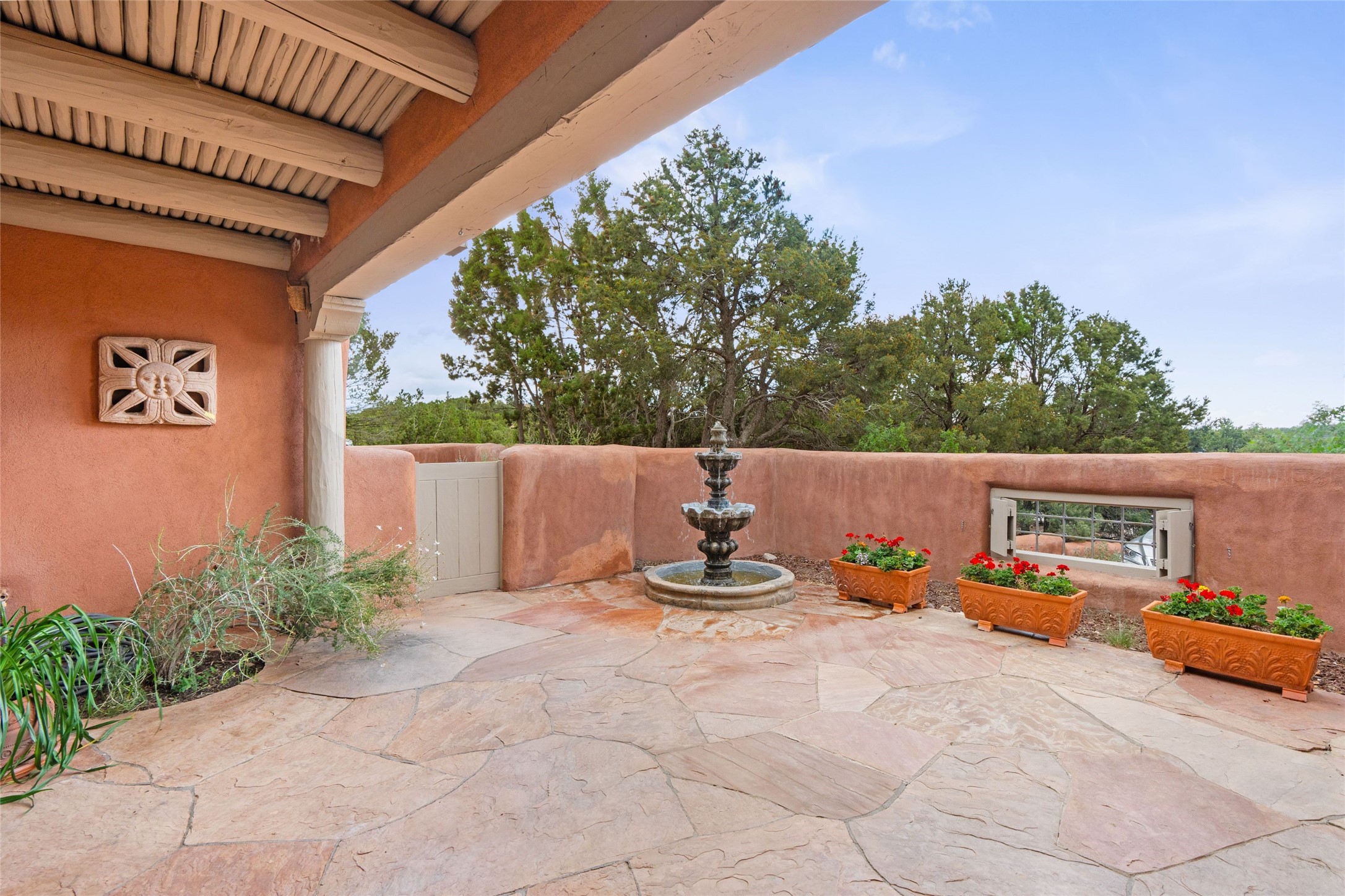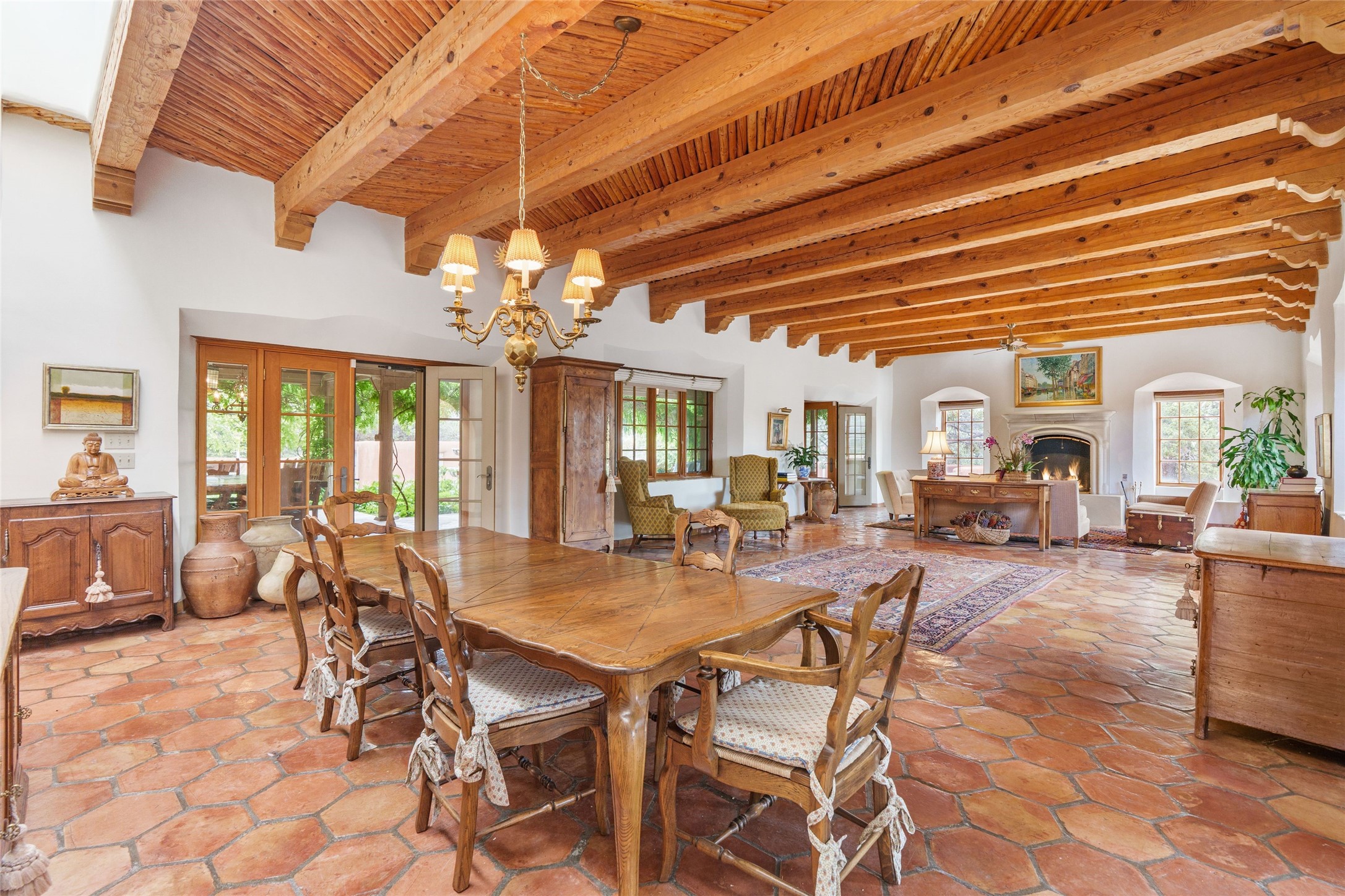 One doesn't simply just buy a Buzz Bainbridge property; one acquires an iconic aesthetic, a lifestyle, an environment of luxurious beauty to live in among his signature Santa Fe features: genuine handmade Adobe walls, some 30" thick; large open room spaces with gorgeous wraparound views and gorgeously embellished high ceilings, wonderful finishes with vigas and latillas and nichos, and kivas, and all the creature comforts of happy living. The intelligent floor plan opens onto gorgeous courtyards, portals, patios, and gardens abounding with high old trees, fountains, and established perennial flowers that embrace the property on the sprawling 7.5 acres. There is even a nurturing, part subterranean greenhouse for year-round blooms and vegetation. The double Adobe main house has three bedrooms, each with its own bath, each with a fireplace, while up the driveway sit the lovely two-bedroom guest house... privately separate, but close enough to borrow a cup of sugar! An additional art studio by the guesthouse with bathroom and fireplace can be an art space or a third bedroom on the guesthouse. There is no HOA to instruct you! The elegant location on prestigious Calle San Martin is 8 minutes to De Vargas mall and 10 to the airport! Yet you feel like you are unwinding in the country! Already pre-inspected with imperfections cured. This is opportunity knocking...!