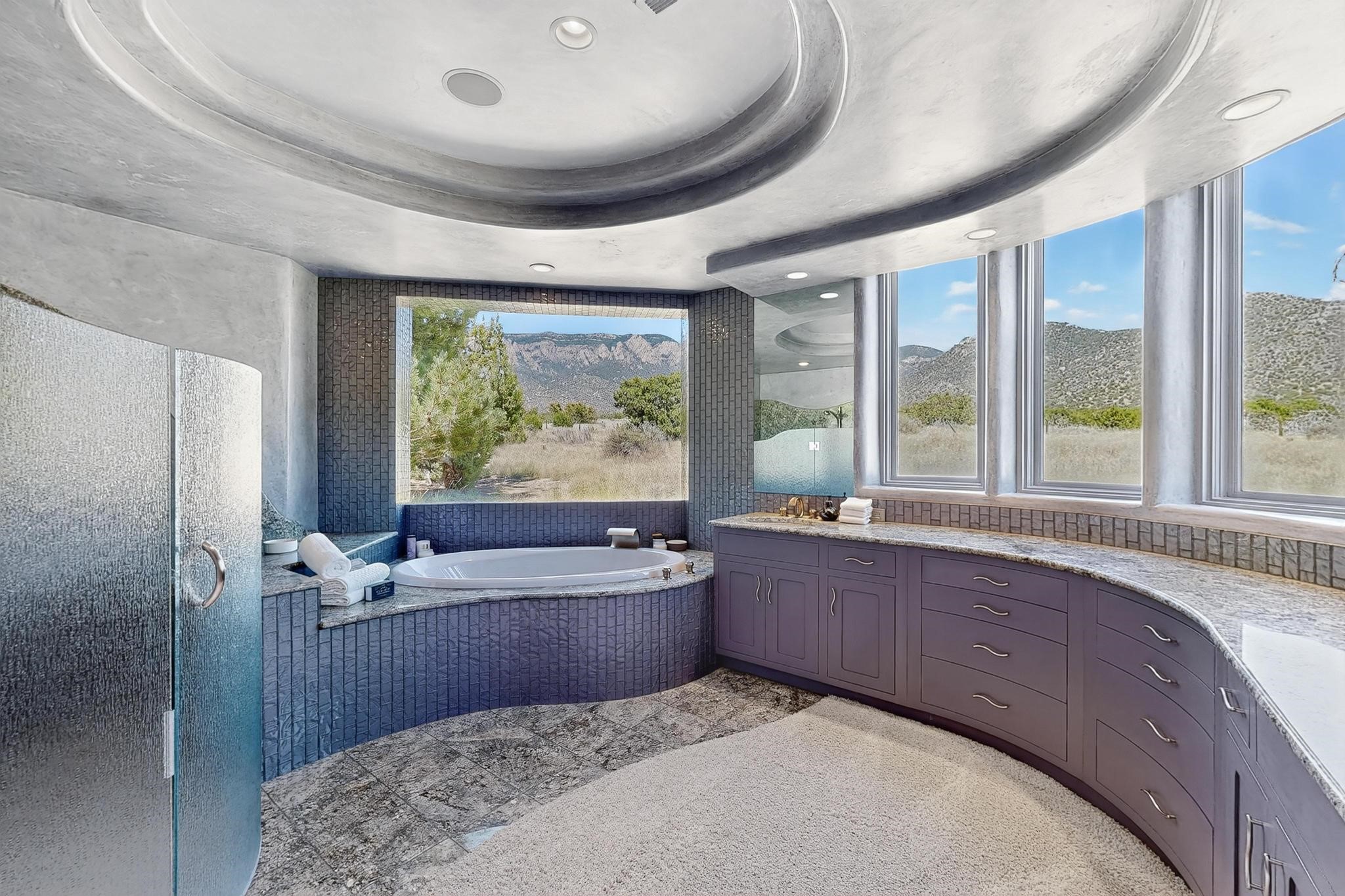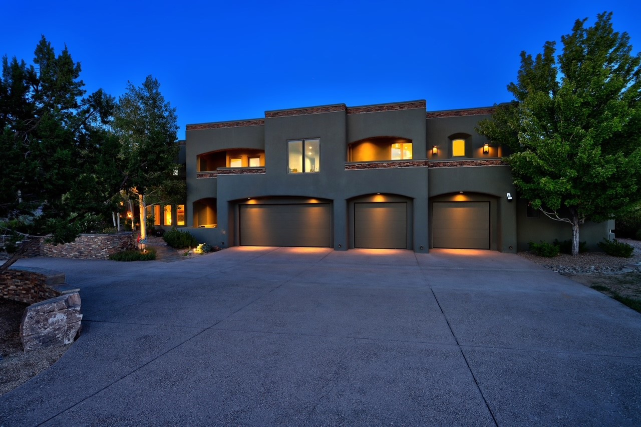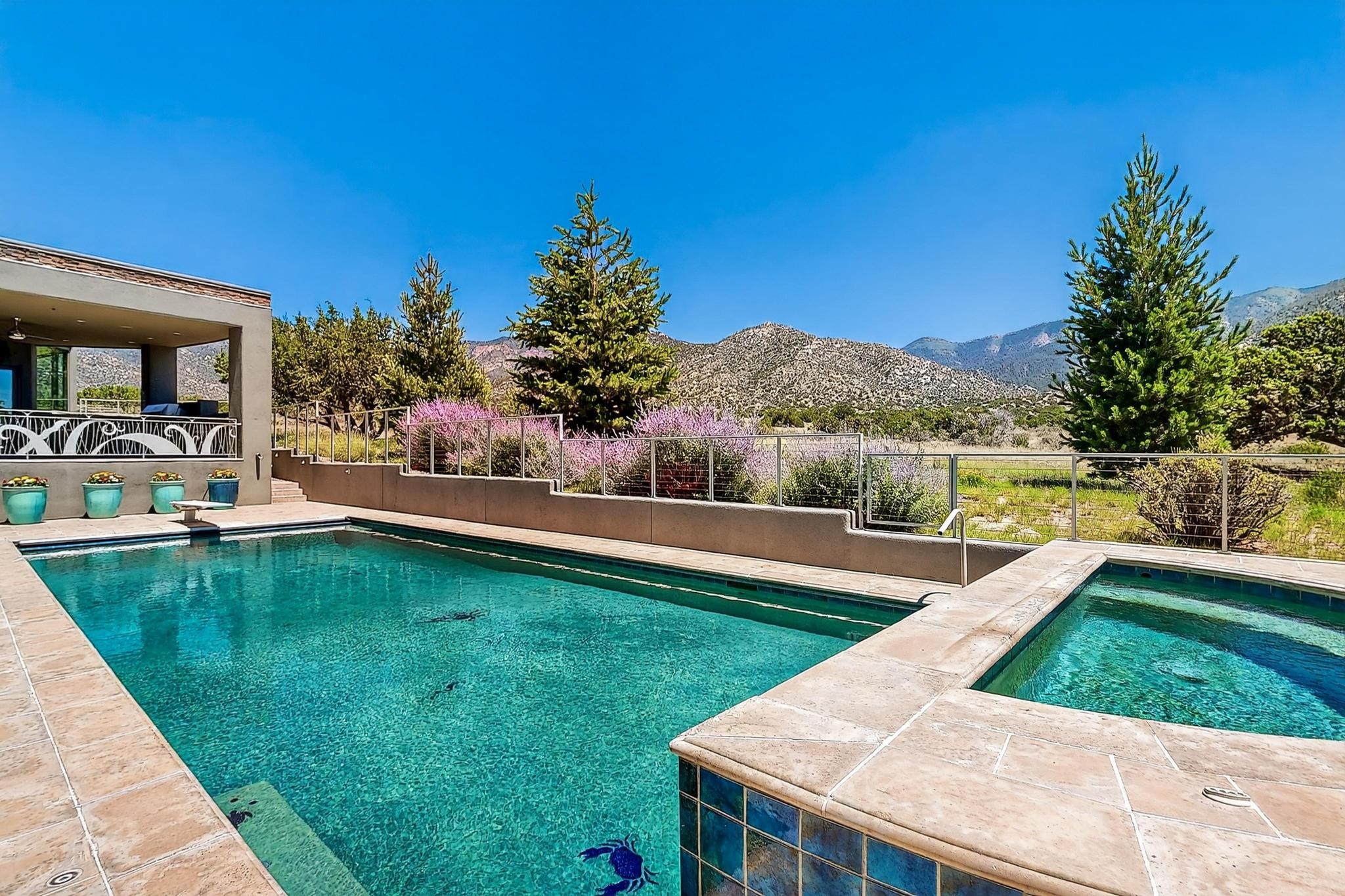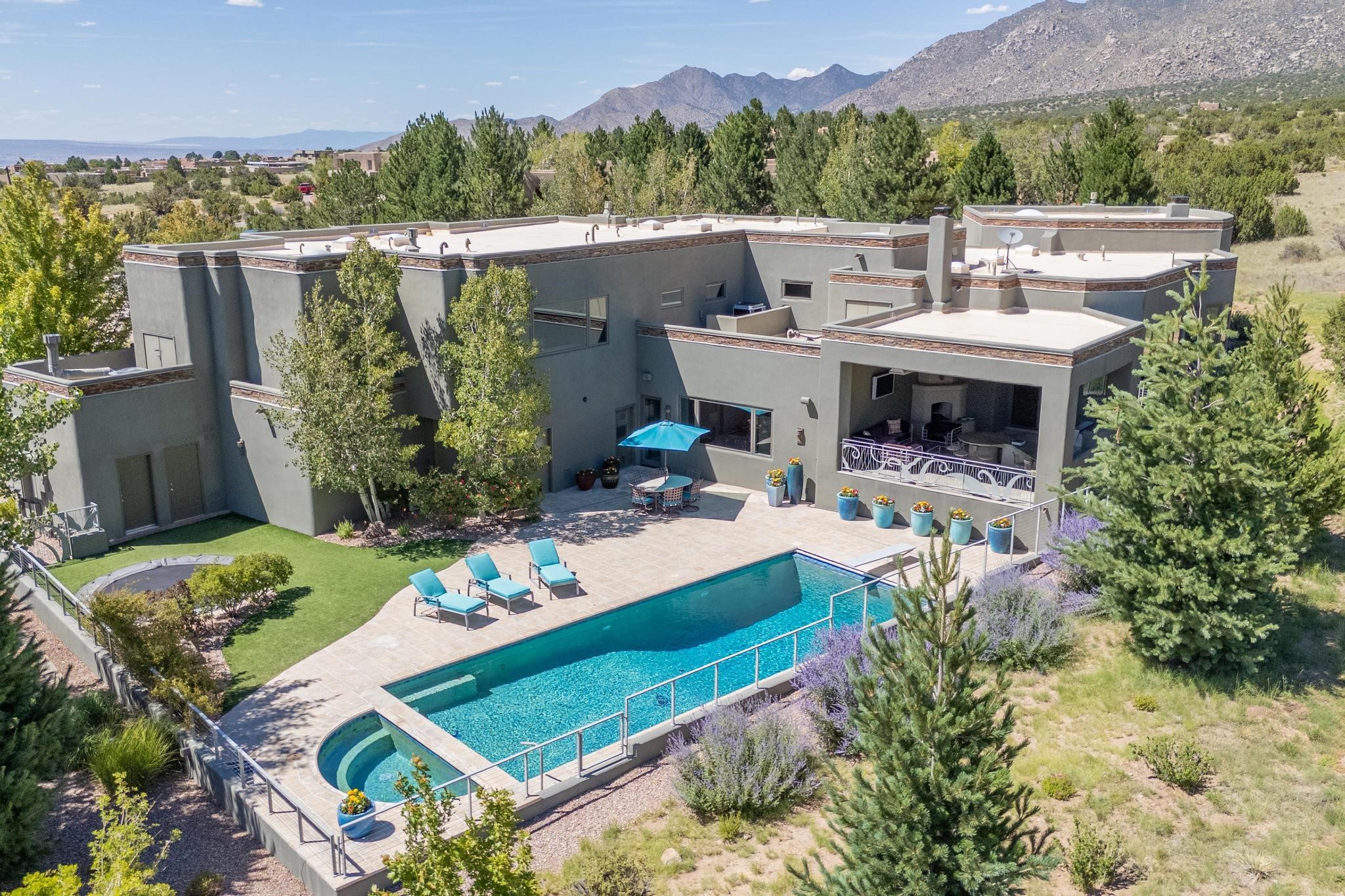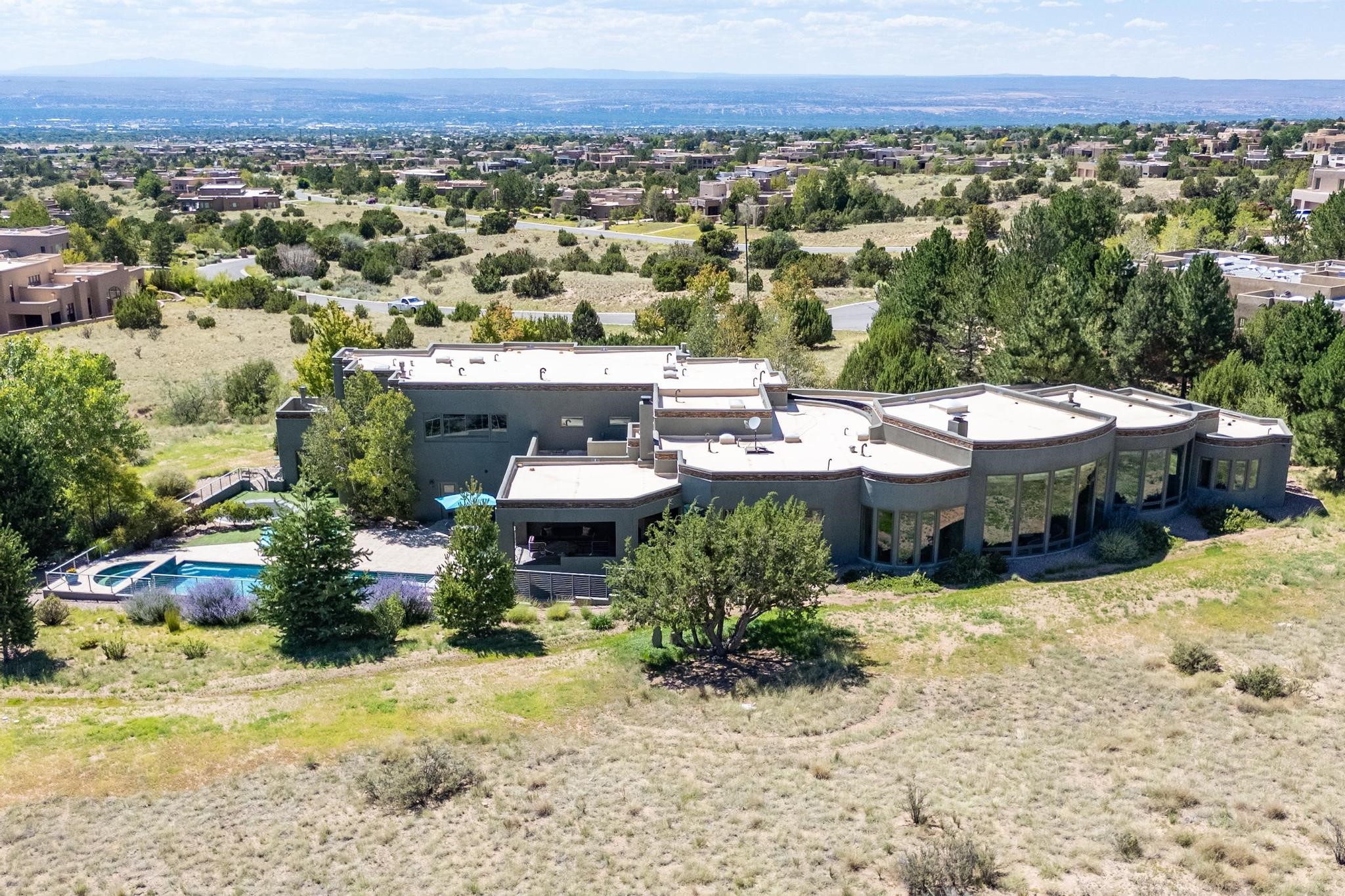 Perched at the pinnacle of High Desert, this extraordinary Custom Built luxury home sits on a private 2.37 acres lot and offers National Forest Views, unmatched privacy, and masterful design throughout. With 4 dedicated bedrooms, including a self-contained guest suite, plus two flexible rooms perfect for a home office and craft space, this home blends spacious living with thoughtful functionality. As you approach the home, you're greeted by an elegant water feature that flows beside a custom fire pit, creating a stunning and serene entry experience that sets the tone for the rest of the property. Bedrooms/Office all have window and balcony views. creating indoor-outdoor living and maximizing the incredible vistas. Designed for both elegance and practicality. Designed for both elegance and practicality, the home features 8 bathrooms (including 3 half baths and 2 three-quarter baths) and is adorned with hand-applied plaster walls by Frank D'Angelico that lend warmth and sophistication. The floor plan was thoughtfully crafted to provide ample wall space for showcasing art, ideal for collectors and design enthusiasts. Enjoy a dedicated theater room with a custom star ceiling designed to replicate a starry Albuquerque night in September, offering a truly immersive cinematic experience. Outside, a private pool serves as a tranquil escape, featuring an automatic cover and custom water features, including a bespoke downspout inspired by European spa architecture all operable at the touch of a button. Separate pool rooms provide convenient storage for pool toys and house the mechanical equipment. Comfort meets control with radiant floor heating and five refrigerated cooling units, all designed for efficiency and luxury. Each bedroom has independent climate controls, allowing for personalized heating and cooling throughout the home. A built-in, bank-grade safe offers secure storage for your most valuable possessions, while the chef's kitchen is outfitted with premium Wolf and Sub-Zero appliances, making it a culinary dream. From its elevated position with sweeping panoramic views to its impeccable craftsmanship and resort-style amenities, this is truly one of High Desert's most distinguished homes.
